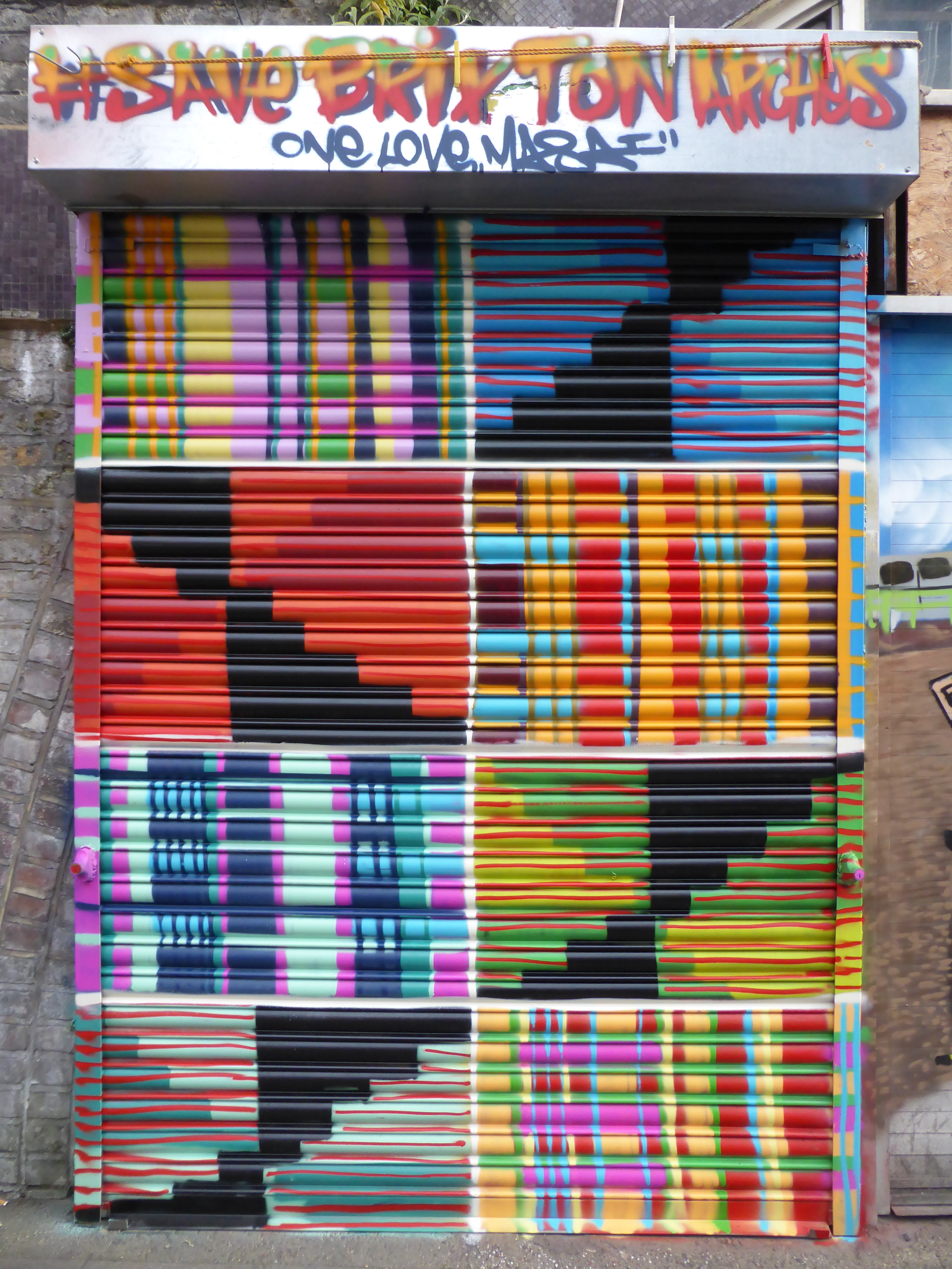 On Sunday in Brixton artist Louis Masai headed to the Station Arches and laid out not one, but two works for the Street Art project. The crux of the situation is that Network Rail intend to evict the current tenants of the shops along the railway arches spanning Station Road and Atlantic Road, in the name of redevelopments and make the new rates of rent so high, that it will be impossible for this community of non-chain store outlets to survive and continue from these spots in the future. So it was with this in mind that the project after initiation from the local tenants was set up by the fine organisation of artist and contributor PINS, who has set forth to organise a group of notable and talented artists to take a shutter each, and allow them creative licence to work their magic, and the most recent works are these fine pieces from Louis Masai.