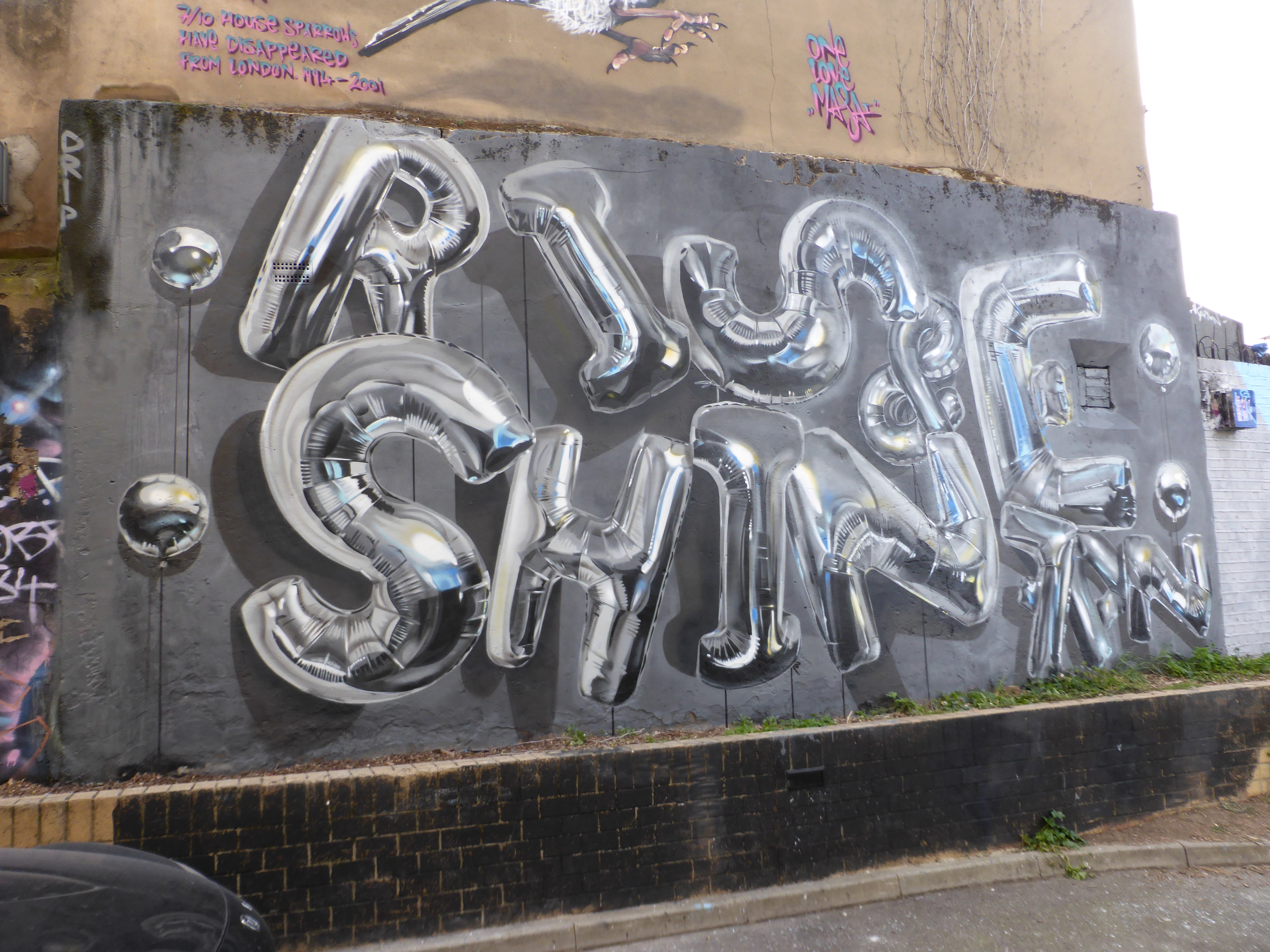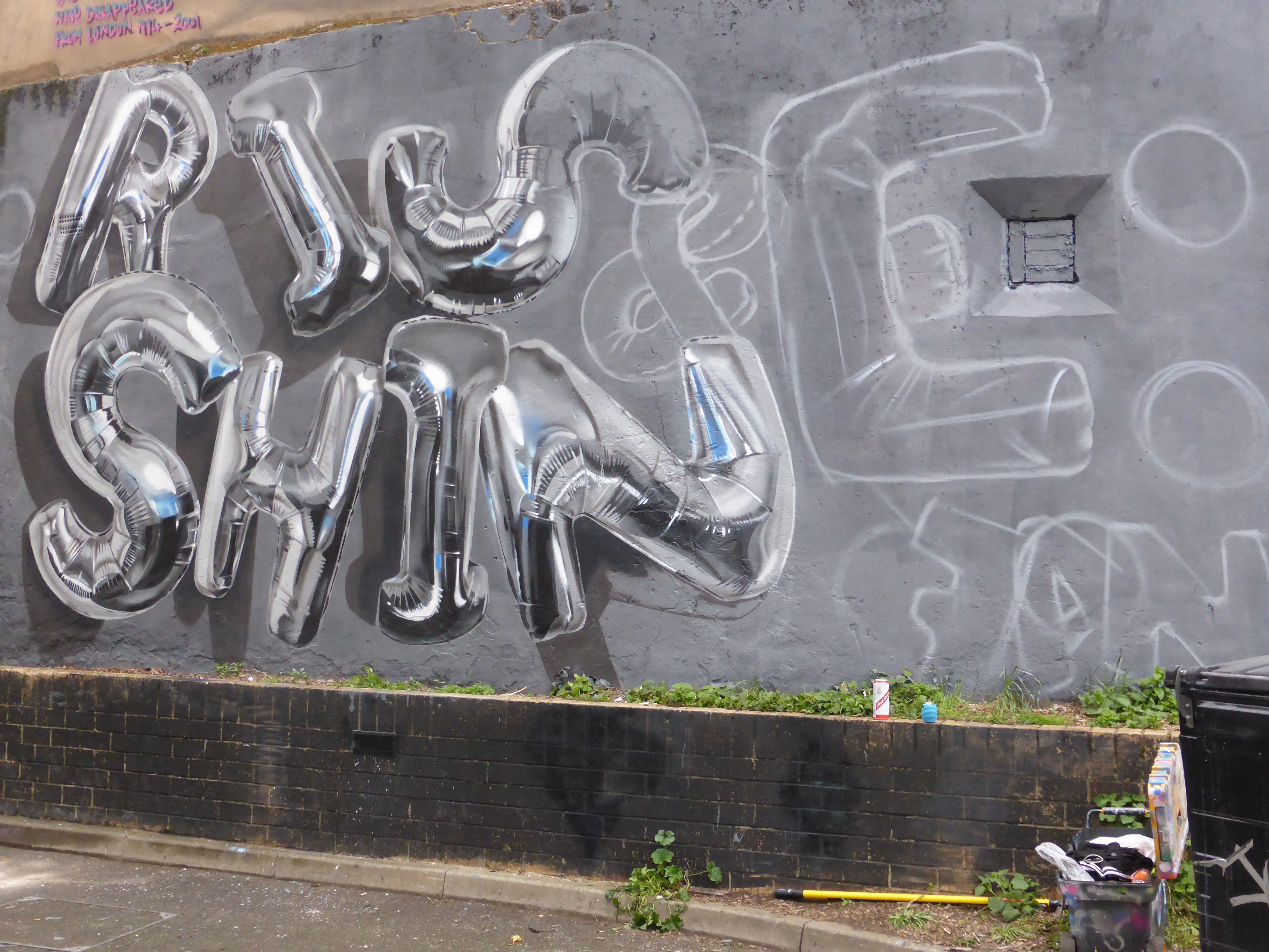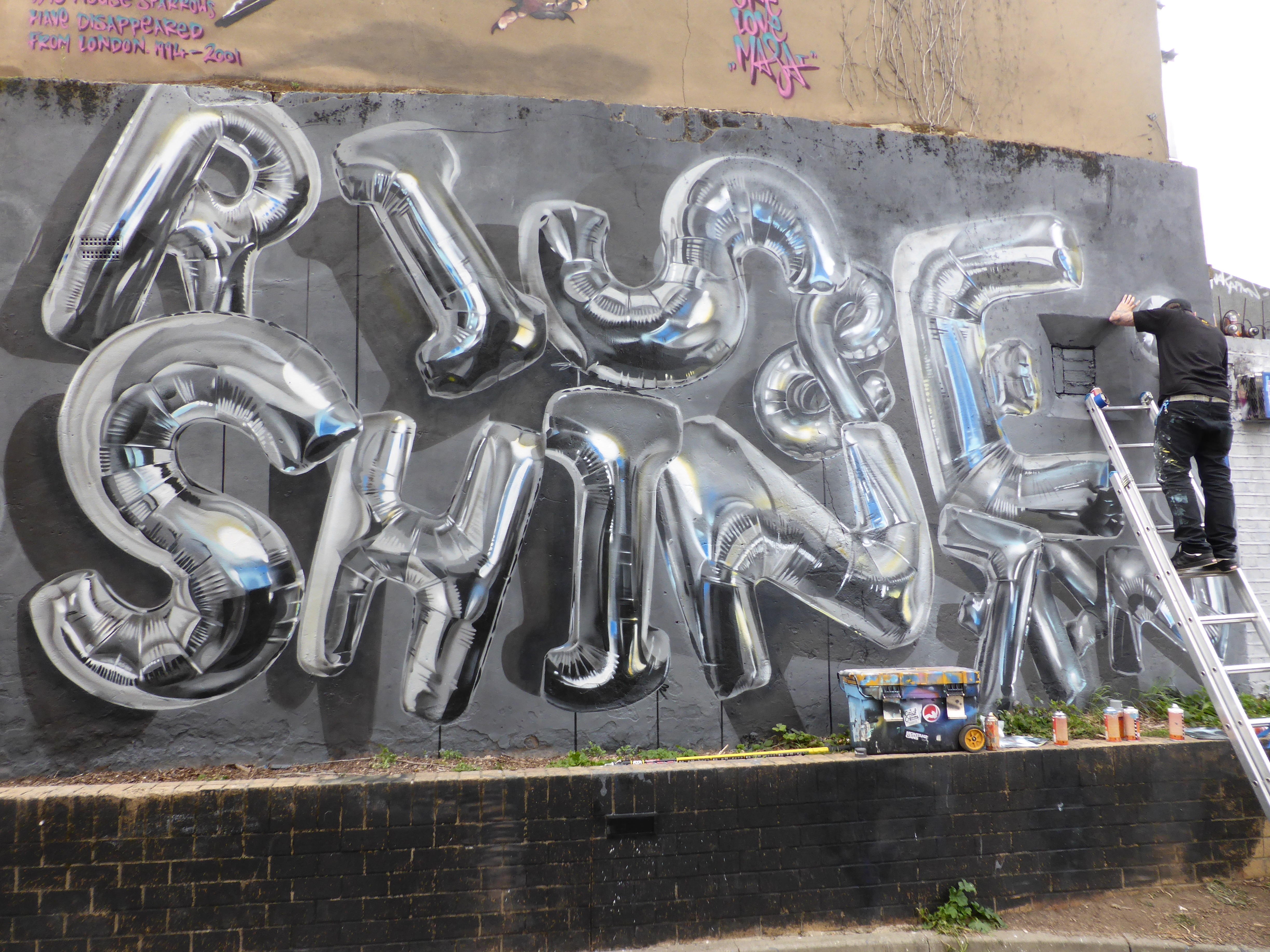 Over the weekend just off of Brick Lane the talented Fankapan was at work putting up some of his ‘Helium Graff’ lettering over a work of his that had stood in the same spot for some six months. The premise for the piece was to write out ‘Rise & Shine’ on the basis that the helium balloons Fanakapan is depicting do in fact both rise and very much shine. It’s hard to argue this point and we wouldn’t anyway, it’s been a pleasure to witness our third example of Fanakapan’s latest styling, this time on a much larger scale. It was a bigger pleasure to be able on this occasion to met Fanakapan who was more than kind in giving us some time and insight into his recent works, and to be able to witness and share the hard work that went into this piece. The first thing of note while watching Fanakapan work is that he is very meticulous in his work, despite his very casual approach to it, we know this is contradictory, but it is the case. Over the three days, with a constant flow of people stopping by to interrupt the artist and compliment him on his work, Fanakapan steadily built up his piece, making them really bounce out of the wall in the process. Marvelous 3D work indeed.