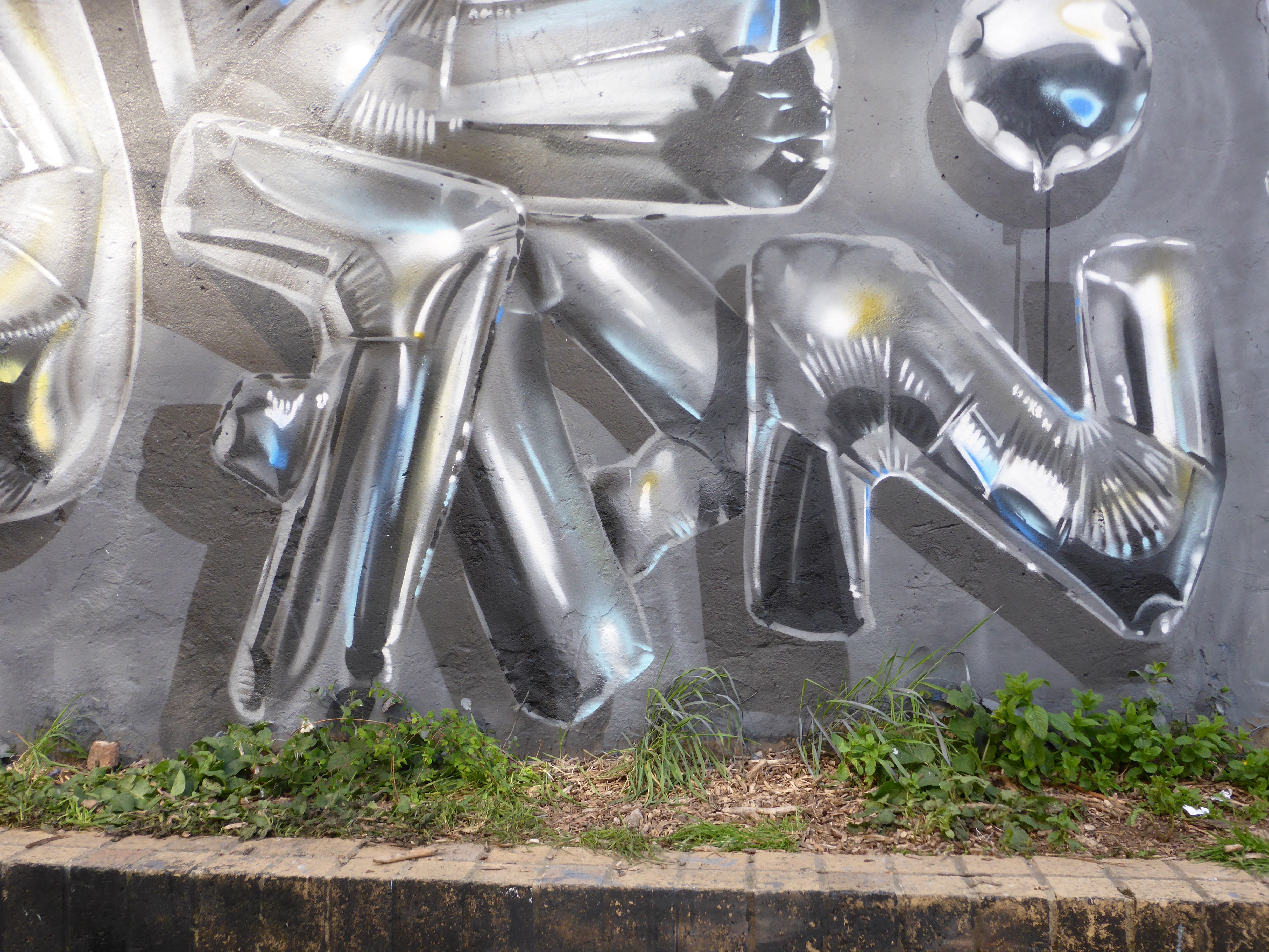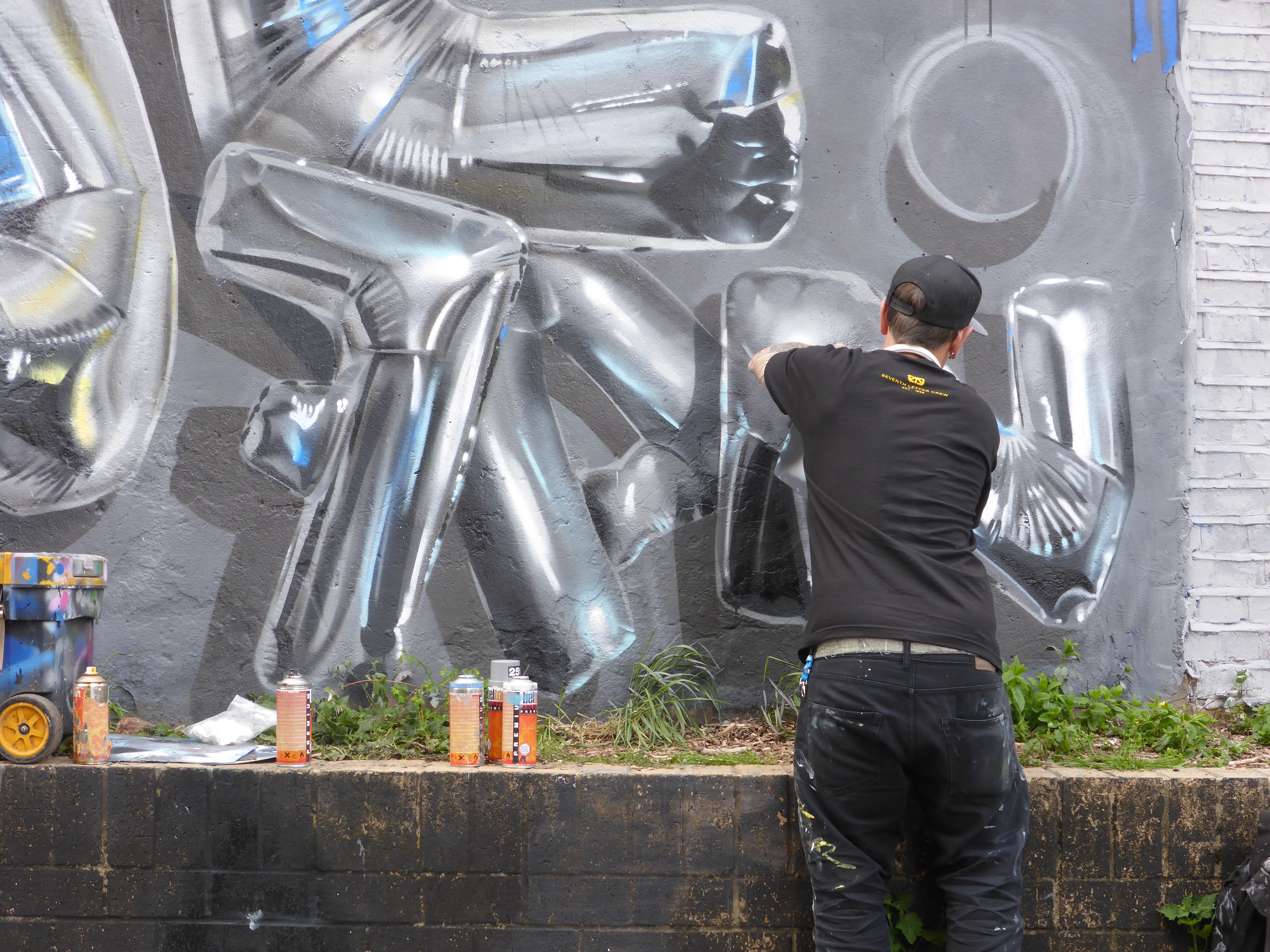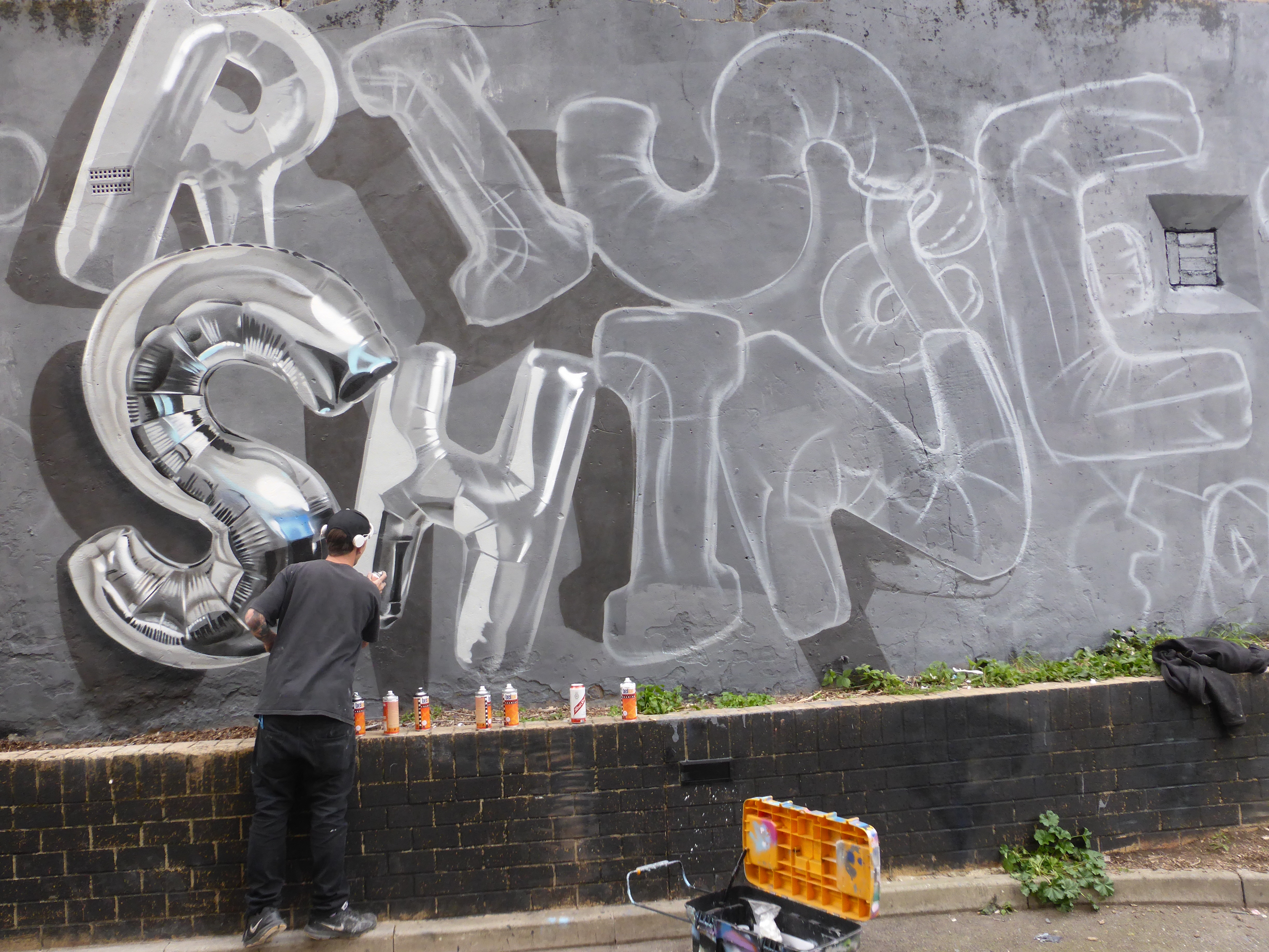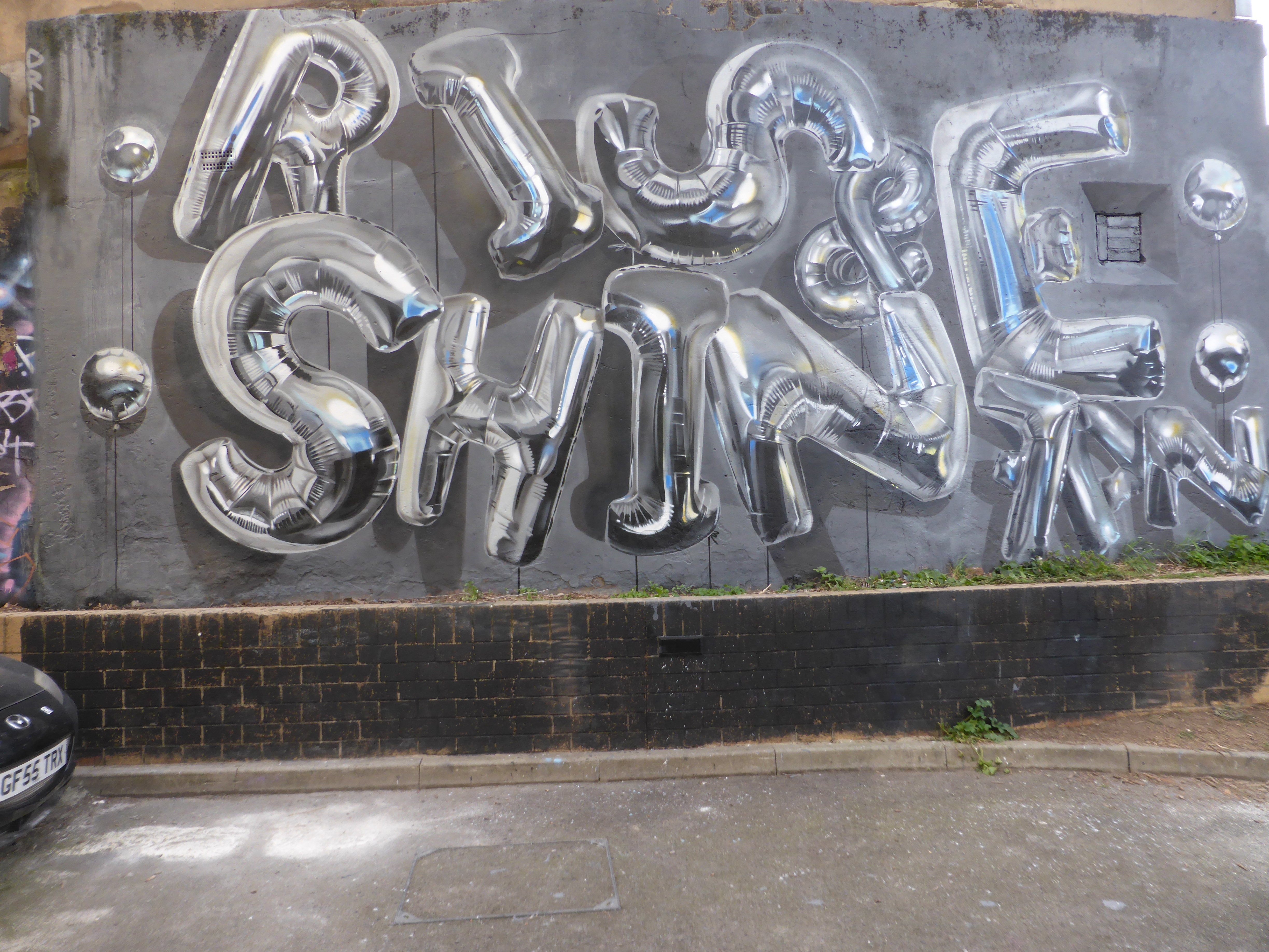 Over the weekend just off of Brick Lane the talented Fankapan was at work putting up some of his ‘Helium Graff’ lettering over a work of his that had stood in the same spot for some six months. The premise for the piece was to write out ‘Rise & Shine’ on the basis that the helium balloons Fanakapan is depicting do in fact both rise and very much shine. It’s hard to argue this point and we wouldn’t anyway, it’s been a pleasure to witness our third example of Fanakapan’s latest styling, this time on a much larger scale. It was a bigger pleasure to be able on this occasion to met Fanakapan who was more than kind in giving us some time and insight into his recent works, and to be able to witness and share the hard work that went into this piece. The first thing of note while watching Fanakapan work is that he is very meticulous in his work, despite his very casual approach to it, we know this is contradictory, but it is the case. Over the three days, with a constant flow of people stopping by to interrupt the artist and compliment him on his work, Fanakapan steadily built up his piece, making them really bounce out of the wall in the process. Marvelous 3D work indeed.
