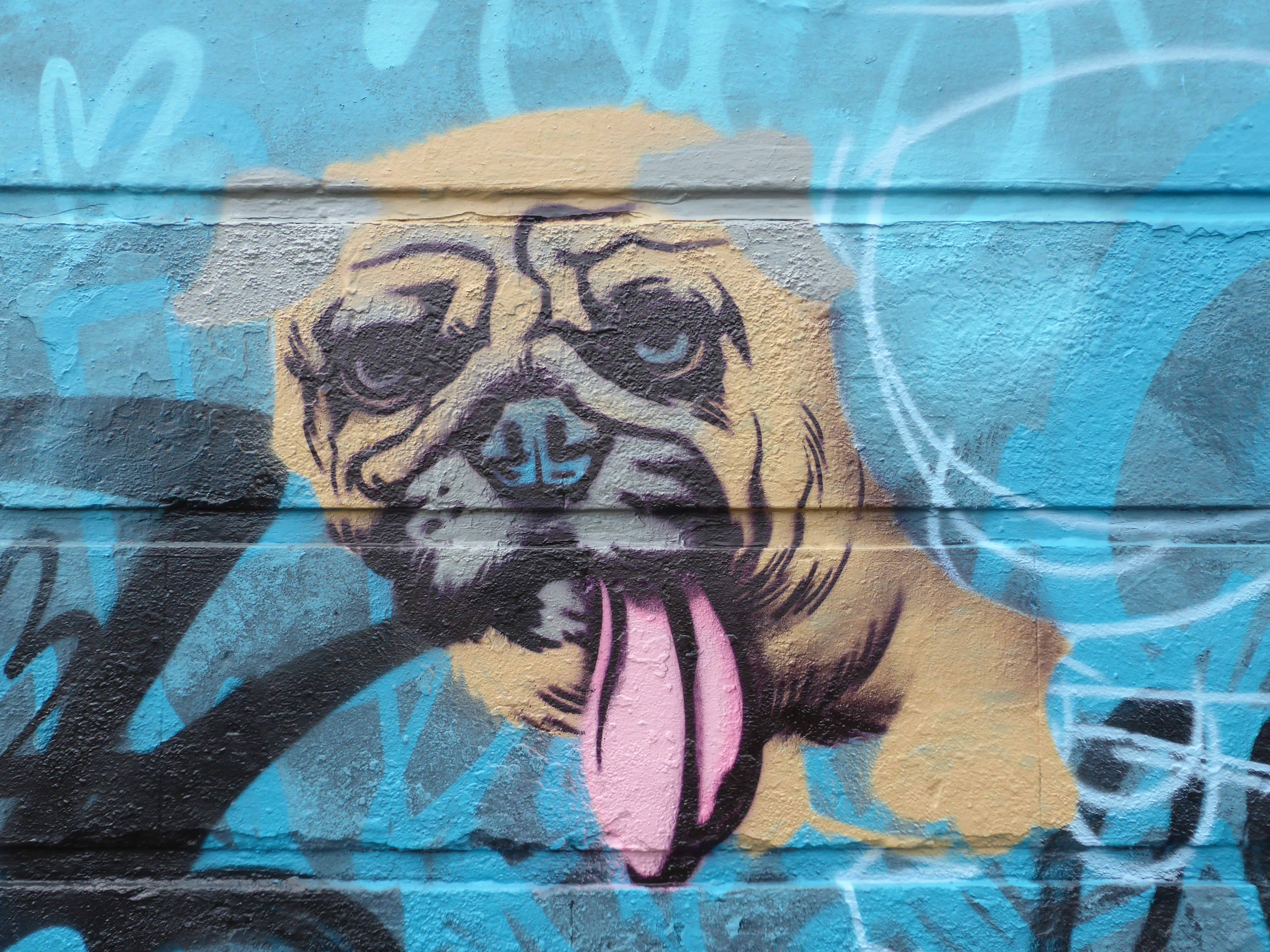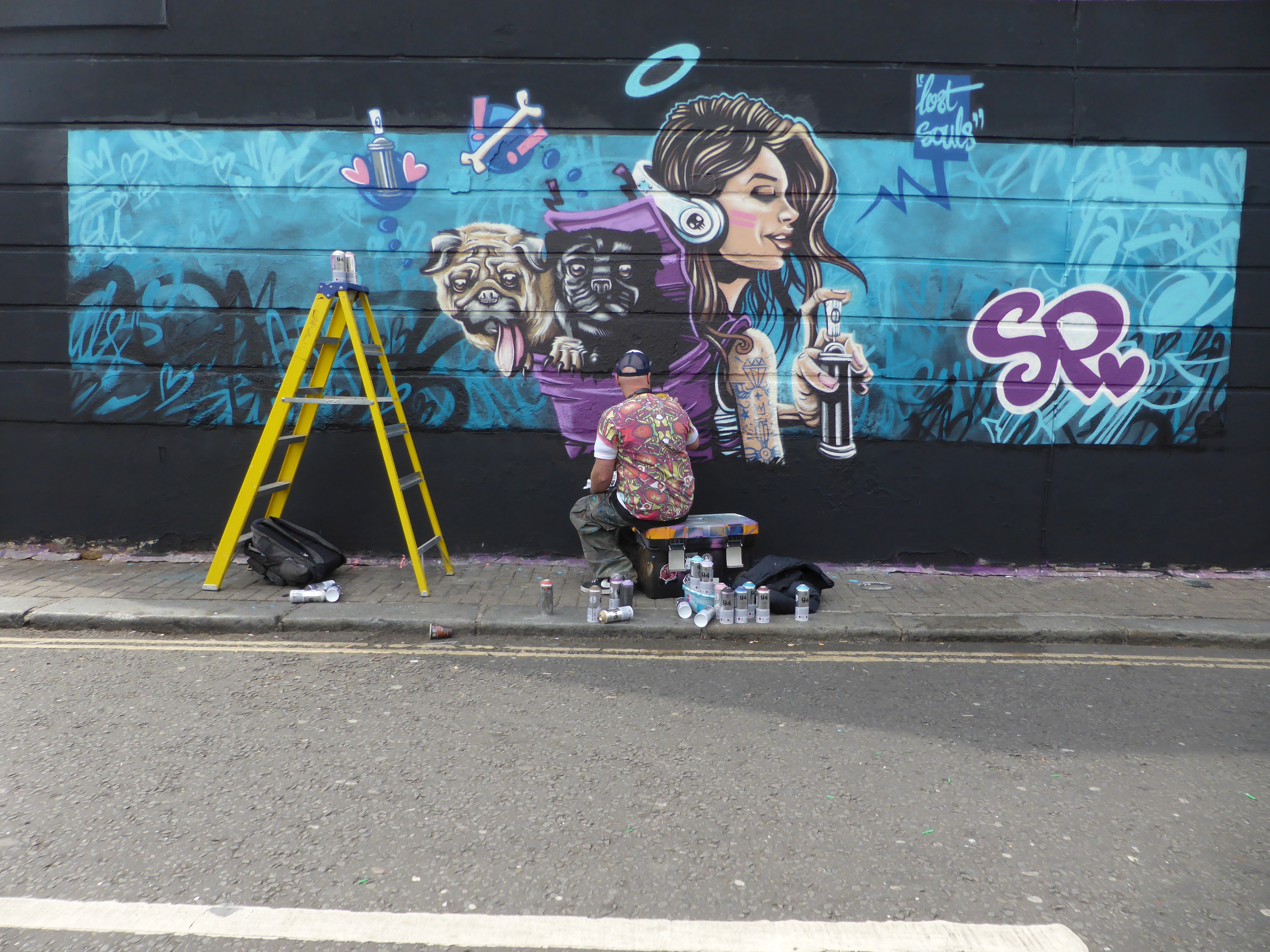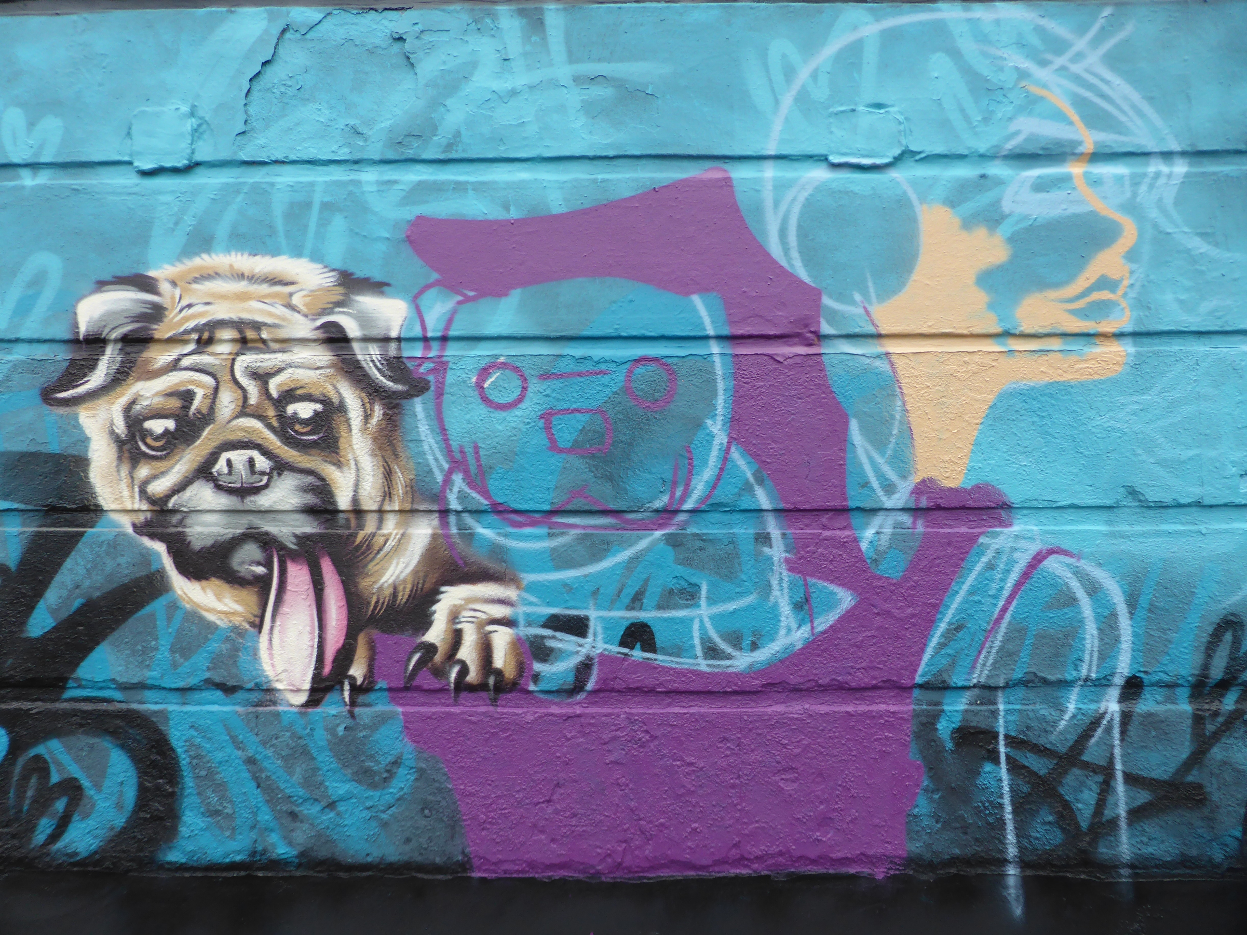 Over the course of Wednesday and Thursday this week we were fortunate enough to get the opportunity to catch Lost Souls member SPZero76 come down to London from Bristol and lay out this stunning work in Camden Town with support from The Hidden Streets Of London. This work is placed up alongside the wall of the Nemesis Tattoo parlour in Camden Town, and was inspired by Lenny the Pug, star resident of Bethnal Green. It’s fair to say he was a great choice as a basis of a work of Street Art and was also exceptionally well represented by SPZero76. The piece is great, a real delight that really started to gain positive responses from the passing public once SPZero76 decided to lay out Lenny first, after initial disappointment from the passing public at seeing the previous and much loved work go, however its more than certain that by Thursday as the piece took shape and was completed SpZero76 assuaged the doubts of the passersby. It was a pleasure to see SPZero76 lay out this great work and let us know about it, so thanks SPZero76, much appreciated and a delight also to meet the inspiration behind it all, Lenny.