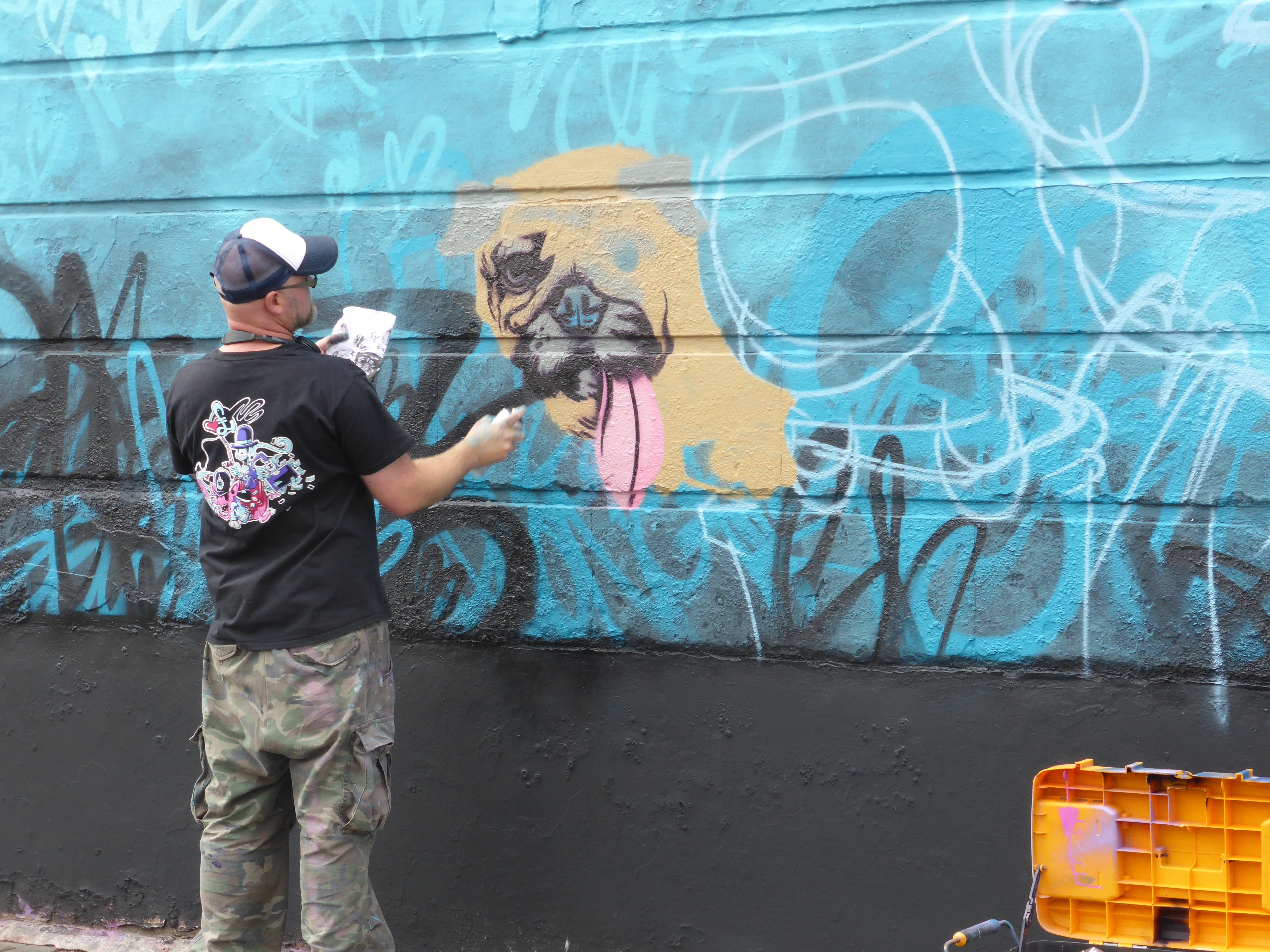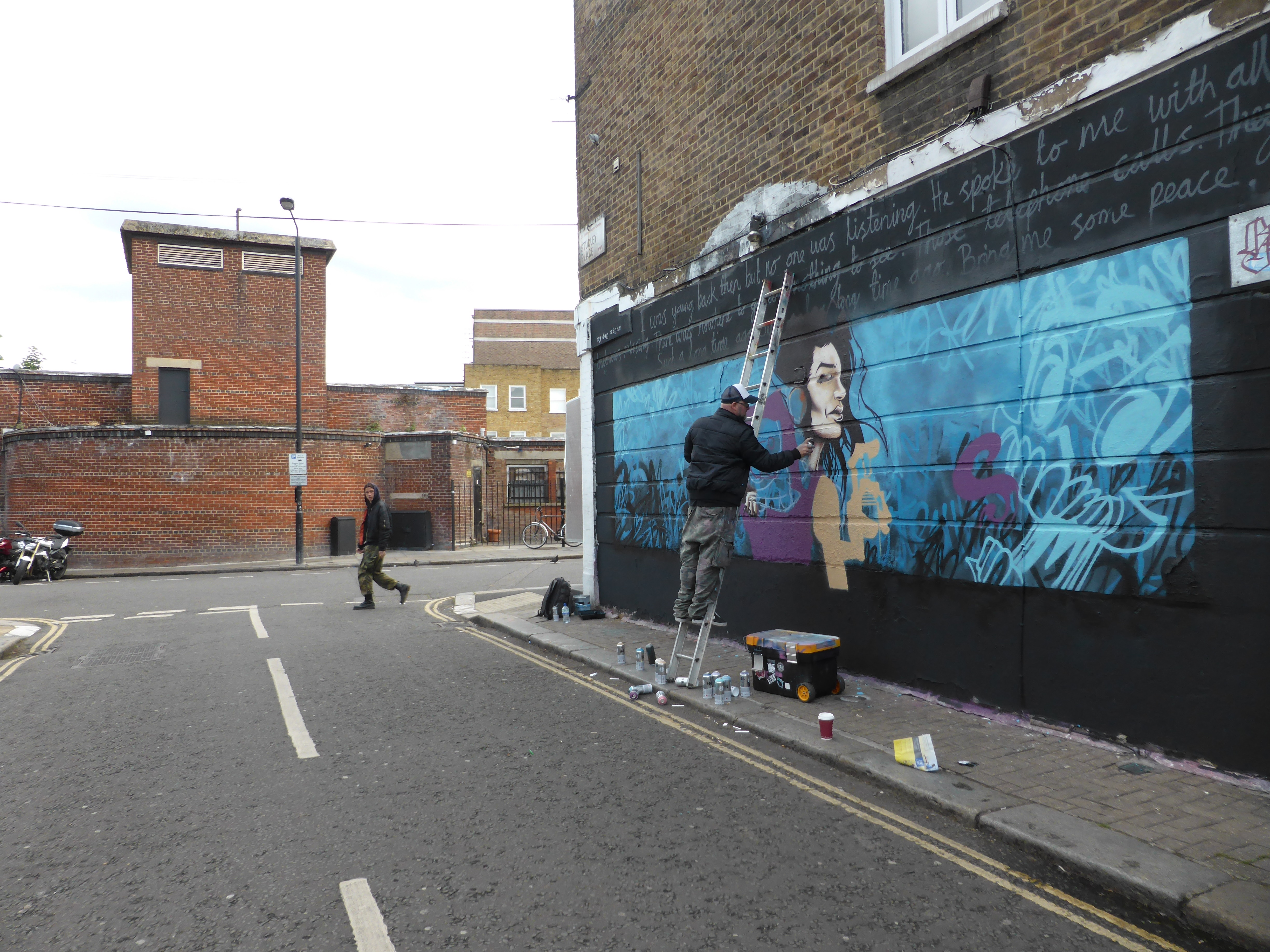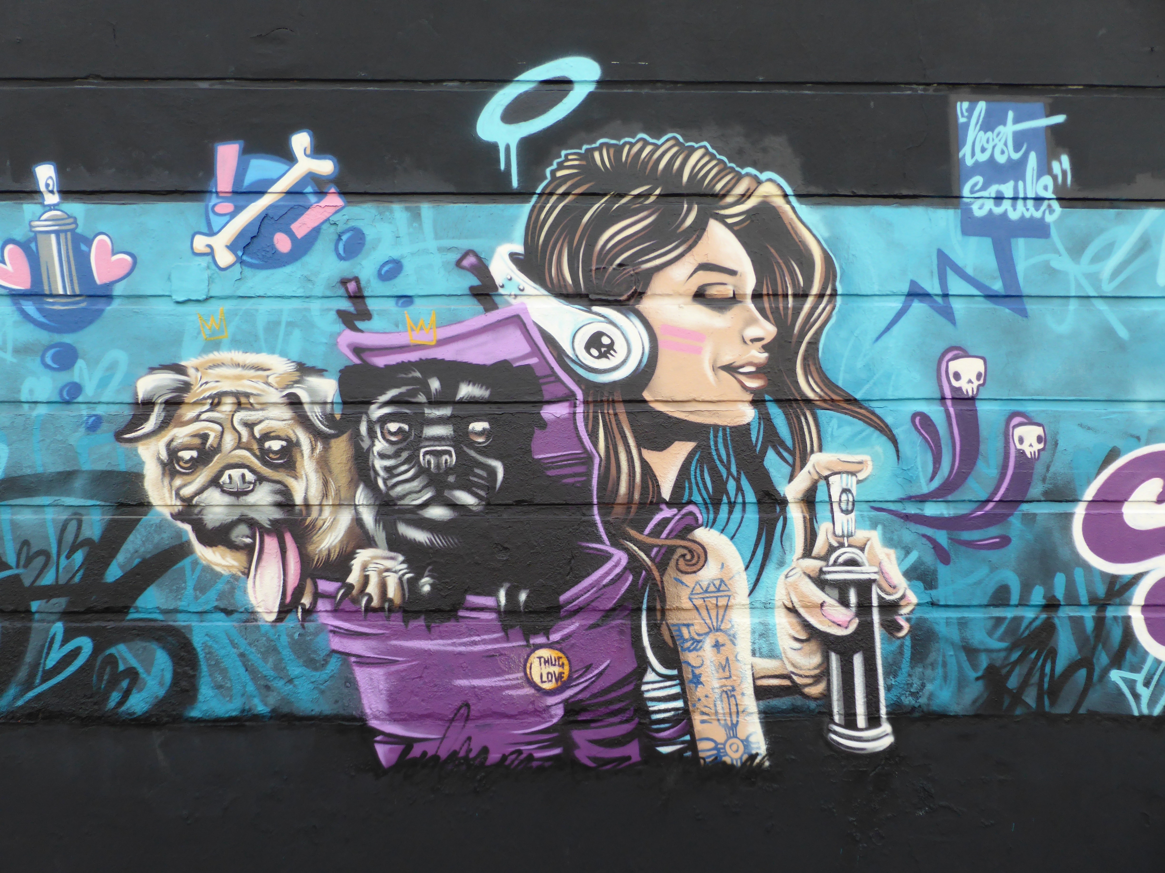 Over the course of Wednesday and Thursday this week we were fortunate enough to get the opportunity to catch Lost Souls member SPZero76 come down to London from Bristol and lay out this stunning work in Camden Town with support from The Hidden Streets Of London. This work is placed up alongside the wall of the Nemesis Tattoo parlour in Camden Town, and was inspired by Lenny the Pug, star resident of Bethnal Green. It’s fair to say he was a great choice as a basis of a work of Street Art and was also exceptionally well represented by SPZero76. The piece is great, a real delight that really started to gain positive responses from the passing public once SPZero76 decided to lay out Lenny first, after initial disappointment from the passing public at seeing the previous and much loved work go, however its more than certain that by Thursday as the piece took shape and was completed SpZero76 assuaged the doubts of the passersby. It was a pleasure to see SPZero76 lay out this great work and let us know about it, so thanks SPZero76, much appreciated and a delight also to meet the inspiration behind it all, Lenny.