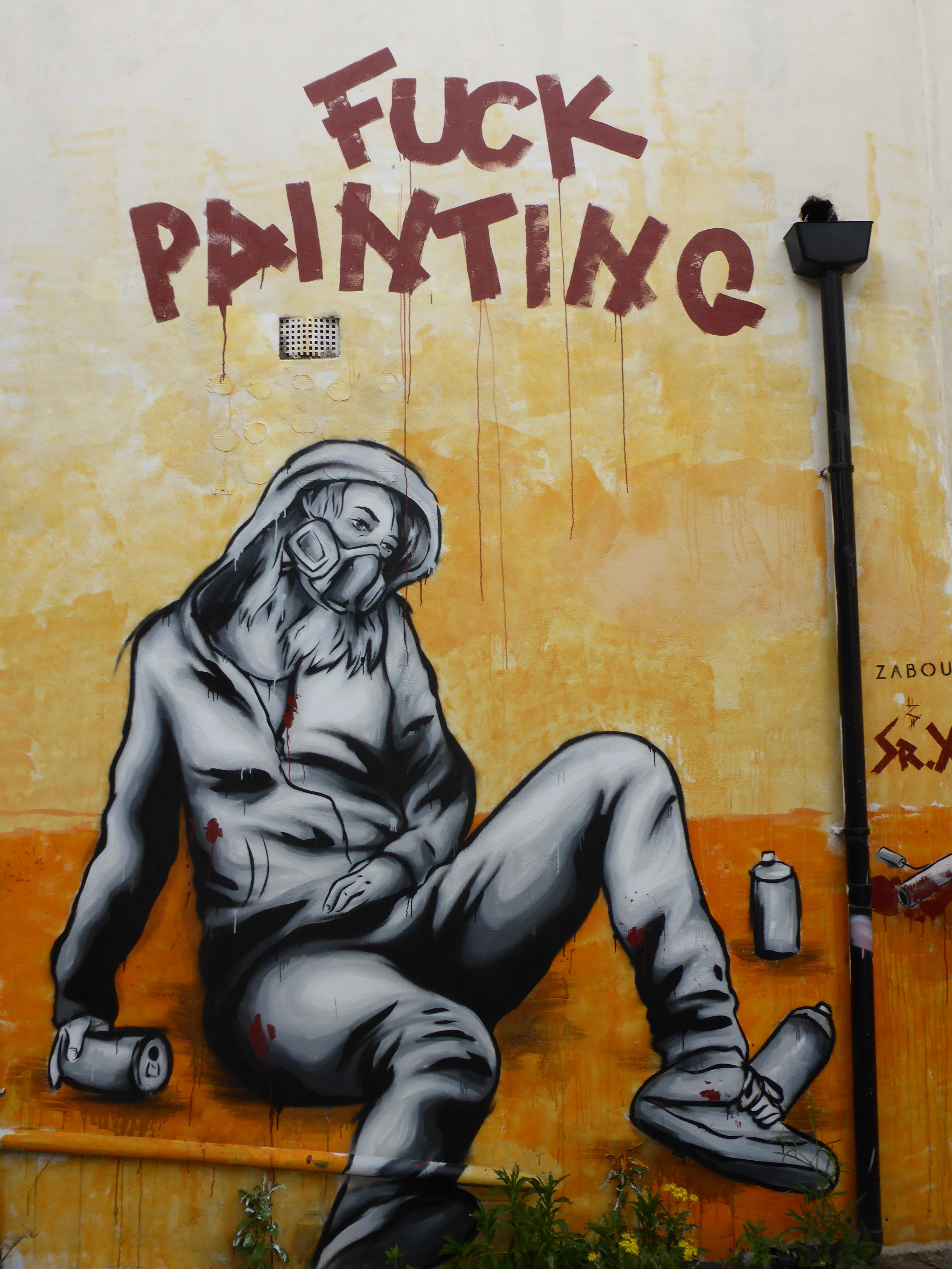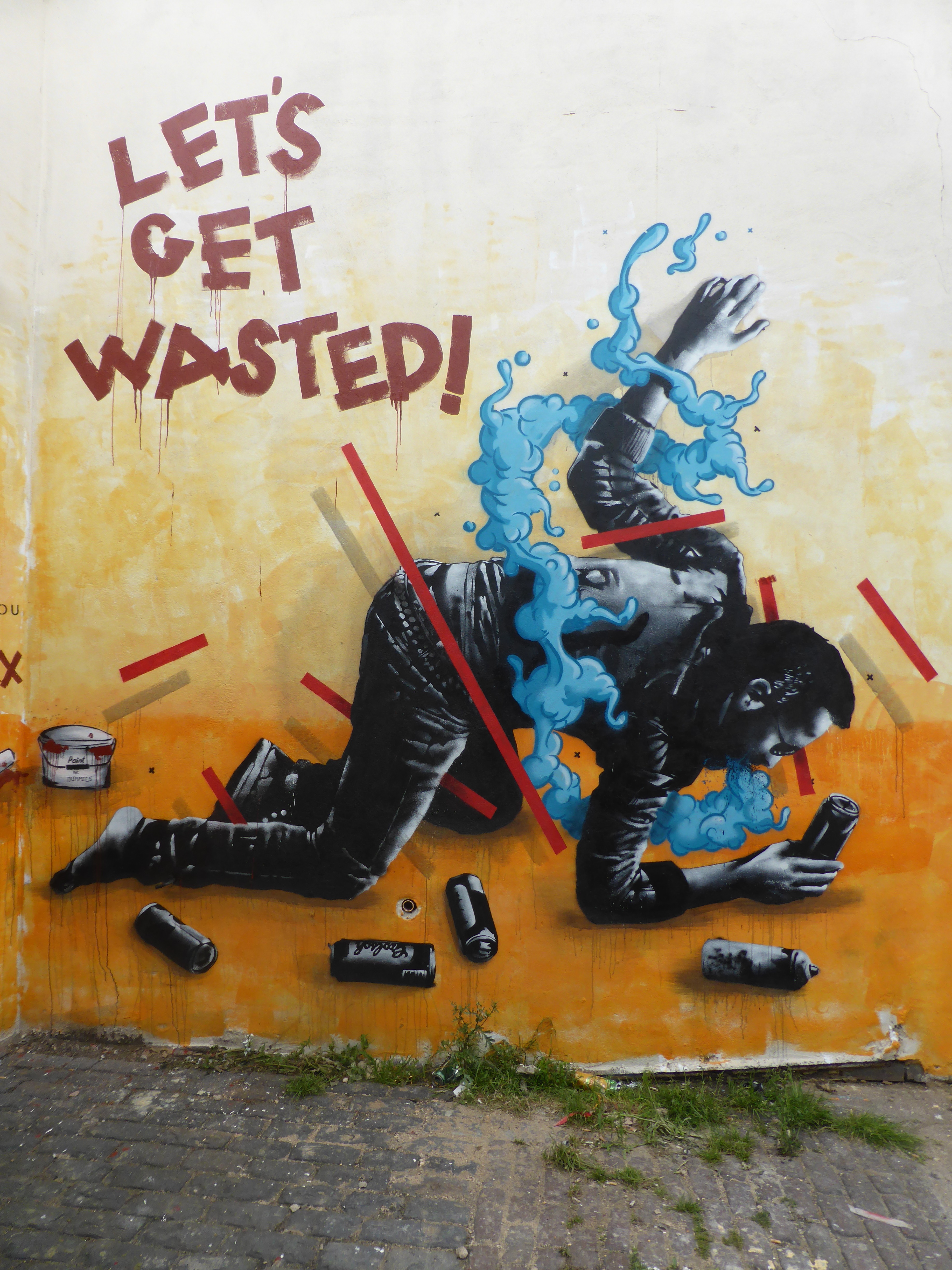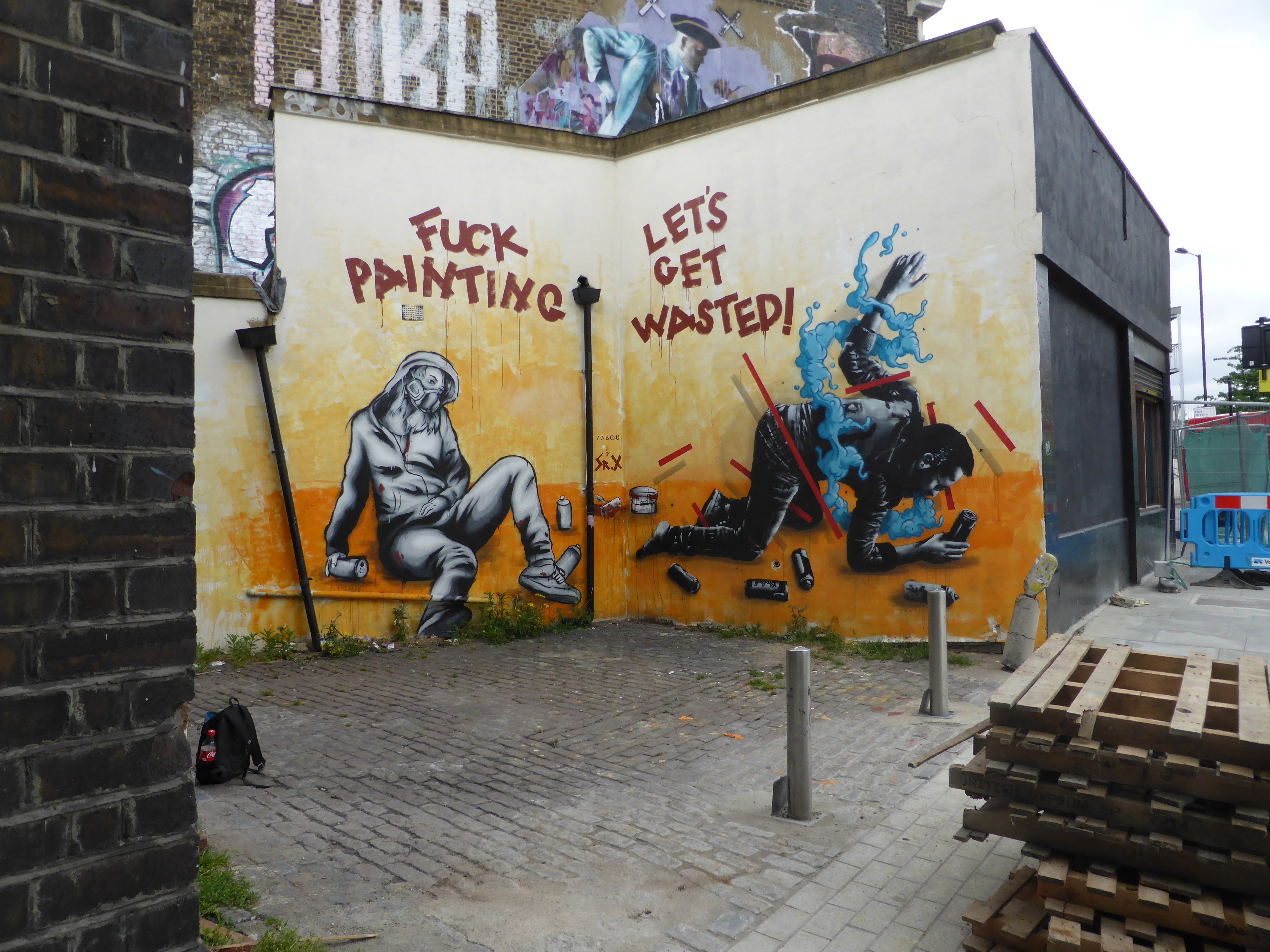 Several days back in Cambridge Heath, stencil based artists Zabou & Senor X hit out this superb collaboration, which is apparently based on a true story, along near the canal. This isn’t the first time this duo have collaborated and we don’t doubt it won’t be the last, the duo both work with a predominantly black and white scale for stencil based works, that very much makes for a good pairing for a collaboration. The work here, entitled “Fuck Painting, Let’s Get Wasted” has a rather cheeky, and perhaps little to true to life, basis, but it certainly brings a smile to the face upon viewing, and its fair to say that most people can relate with the message of this delightful work.