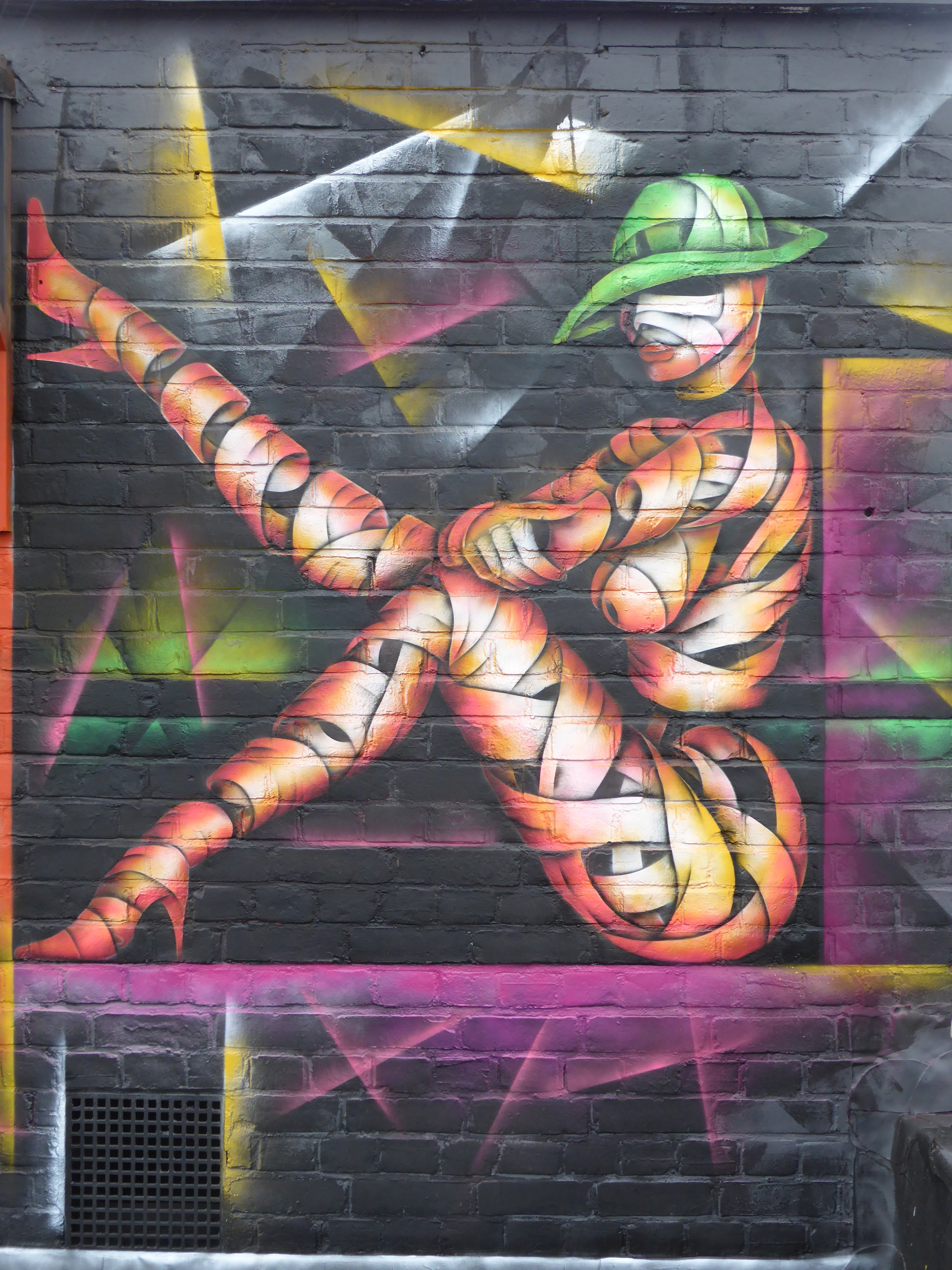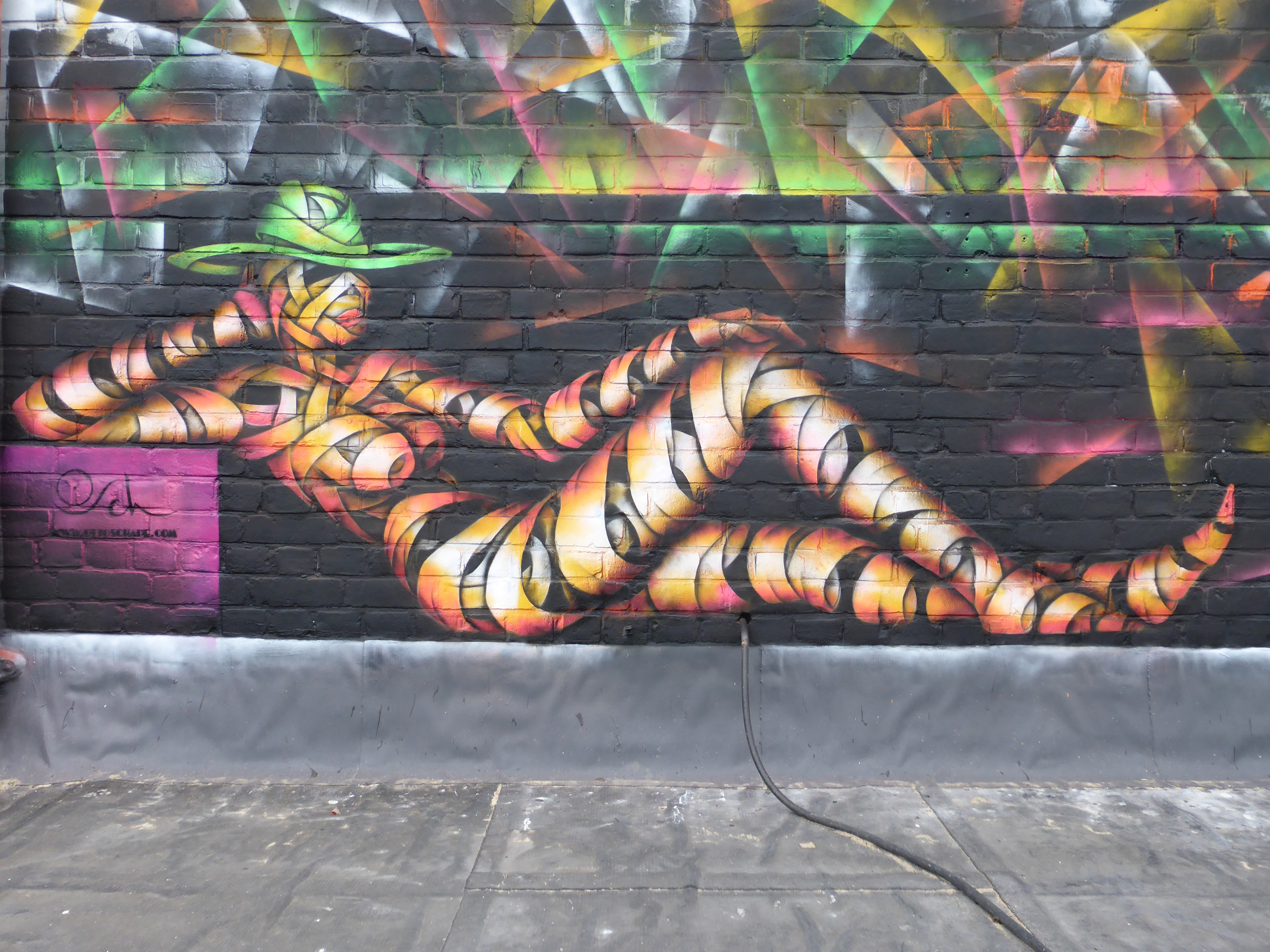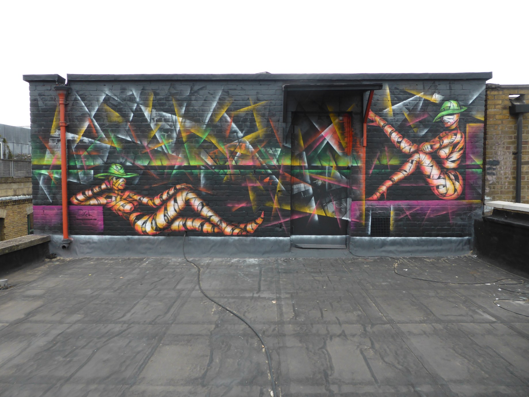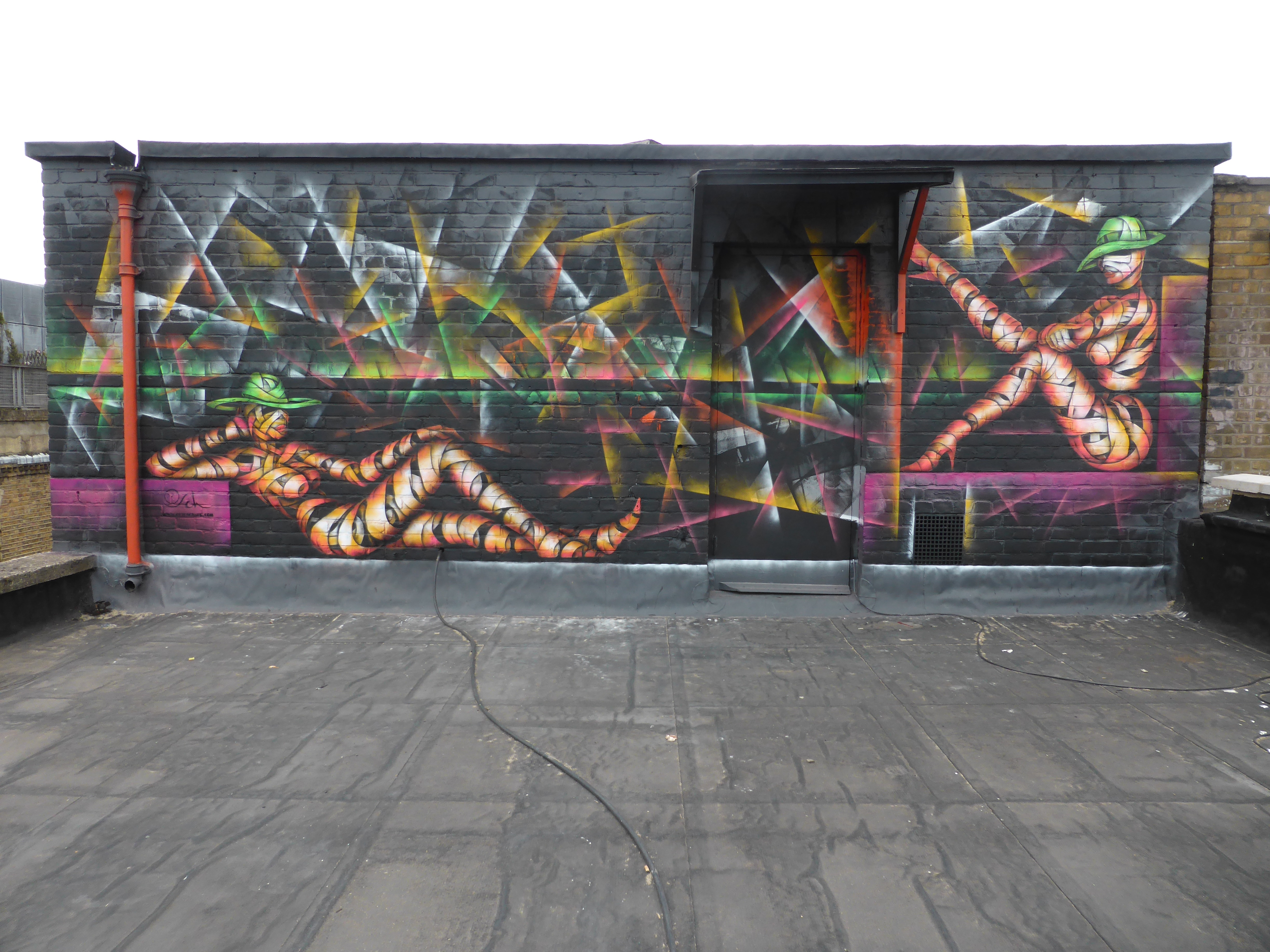 The Jealous Gallery has a new piece on their roof’s feature wall as a part of the ongoing Jealous Rooftop Mural Project. This time the work is from Otto Schade, an artist whose work is very well known and can currently be spied in various locations around the East End. The work is entitled ‘The Sexy Ones‘ and was created using a mixture of stencil and spray paint techniques, making for an interesting background to his feature stencil based characters. I was fortunate enough to be let up on the roof again by the kind staff of the Jealous Gallery and capture this piece to share with you all.