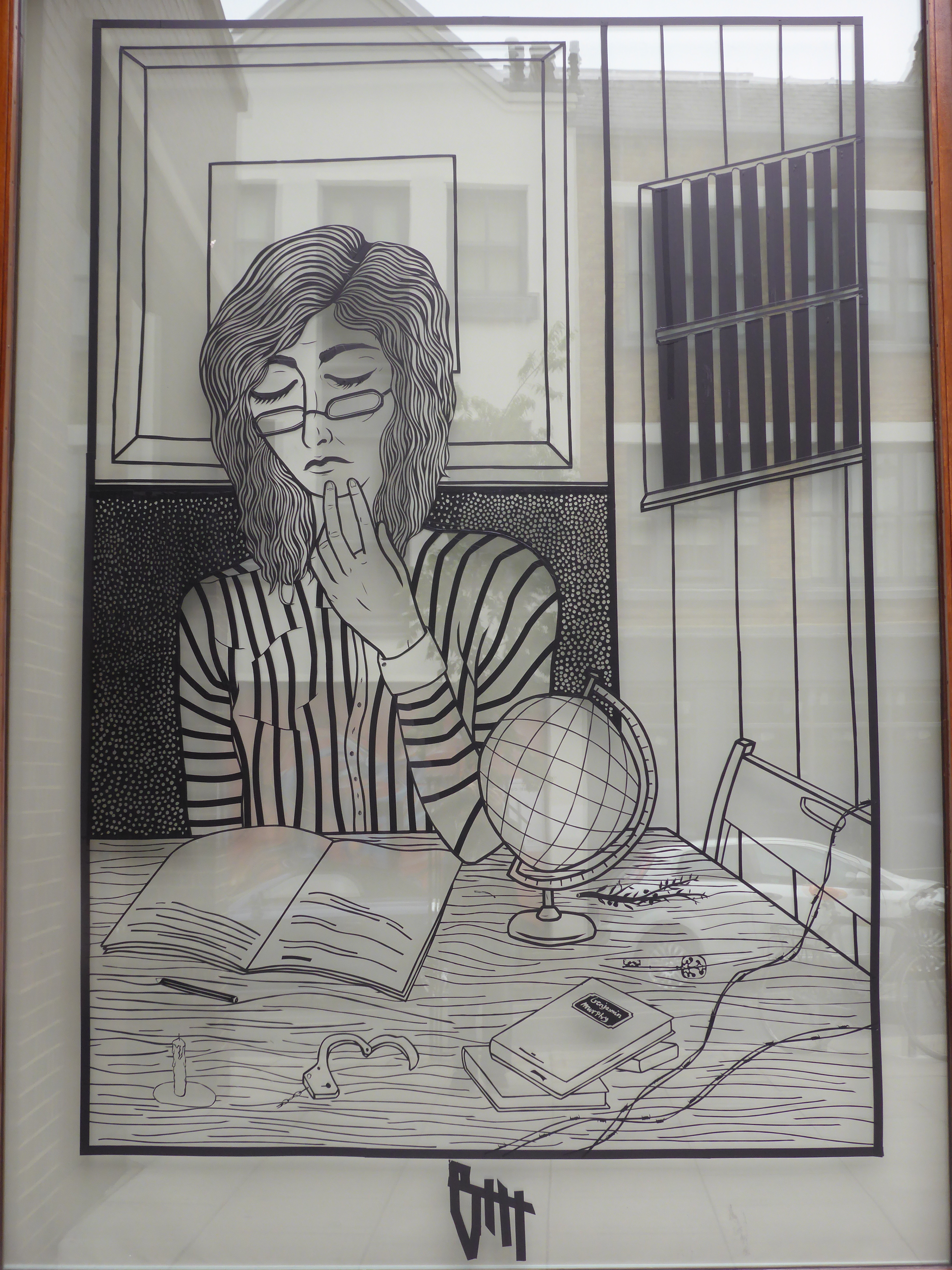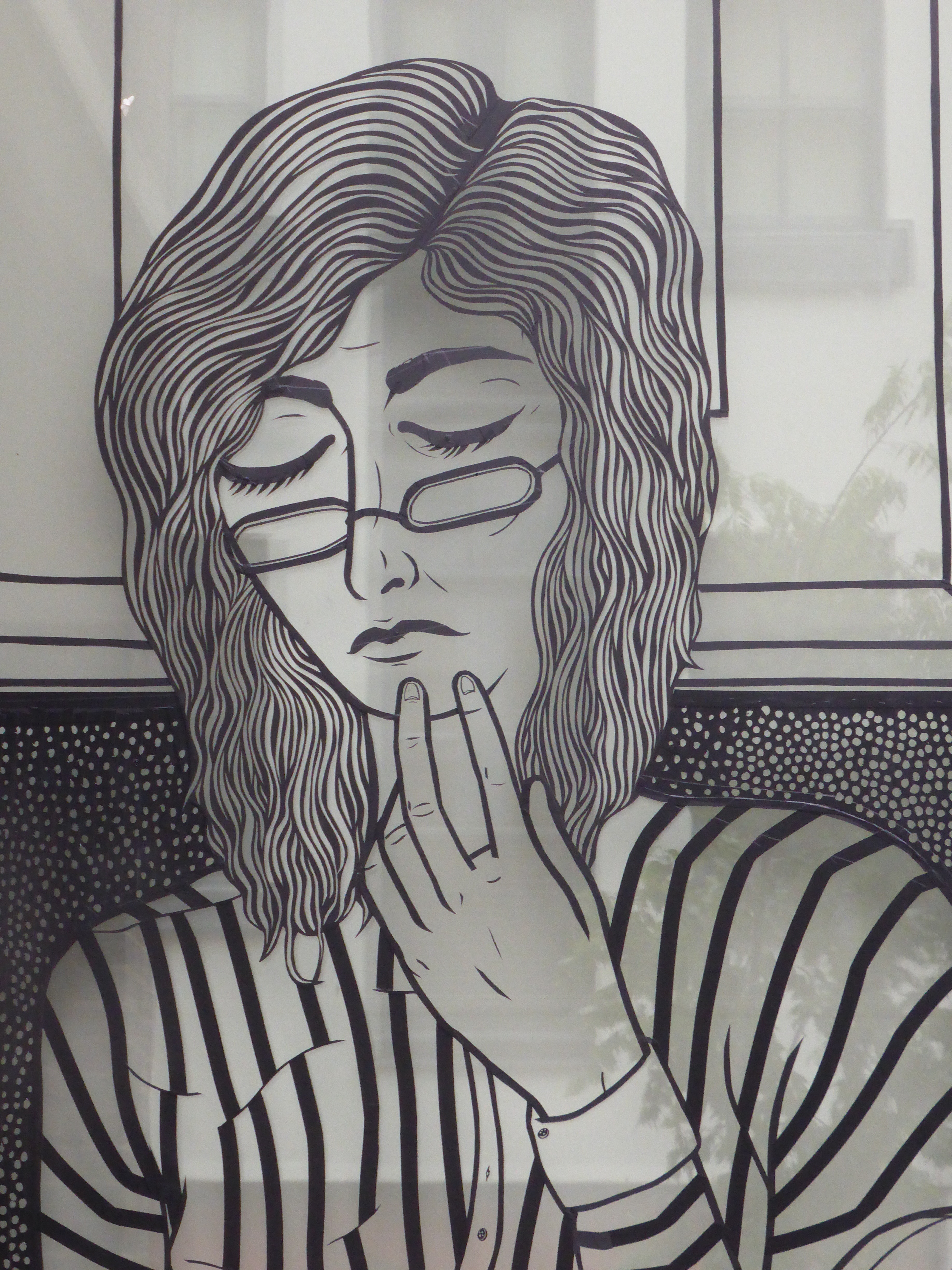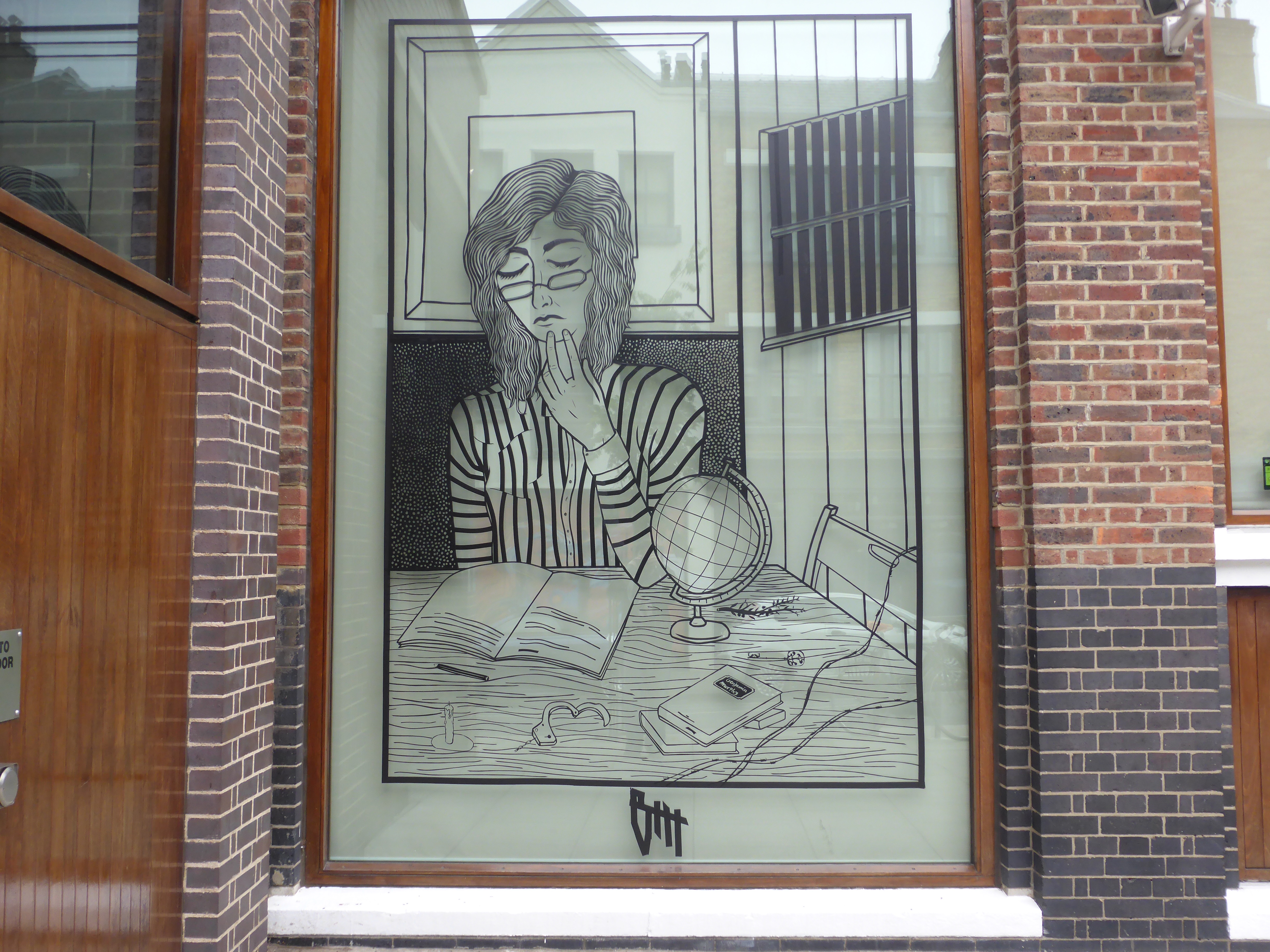 Last week over Wednesday and Thursday artist Benjamin Murphy laid out this stunning piece of Street Art in his own trademark style. Benjamin Murphy uses black original tape to create his very much original artworks, and often places his works on window panes, as is the case here, to create the maximum impact for his work to stand out. With a bachelor of arts degree, Murphy often exhibits themes from classic literature and poetry in his work. Depictions of Innocence, obscenity, beauty and despair are all frequent occurring themes in his portrayals.