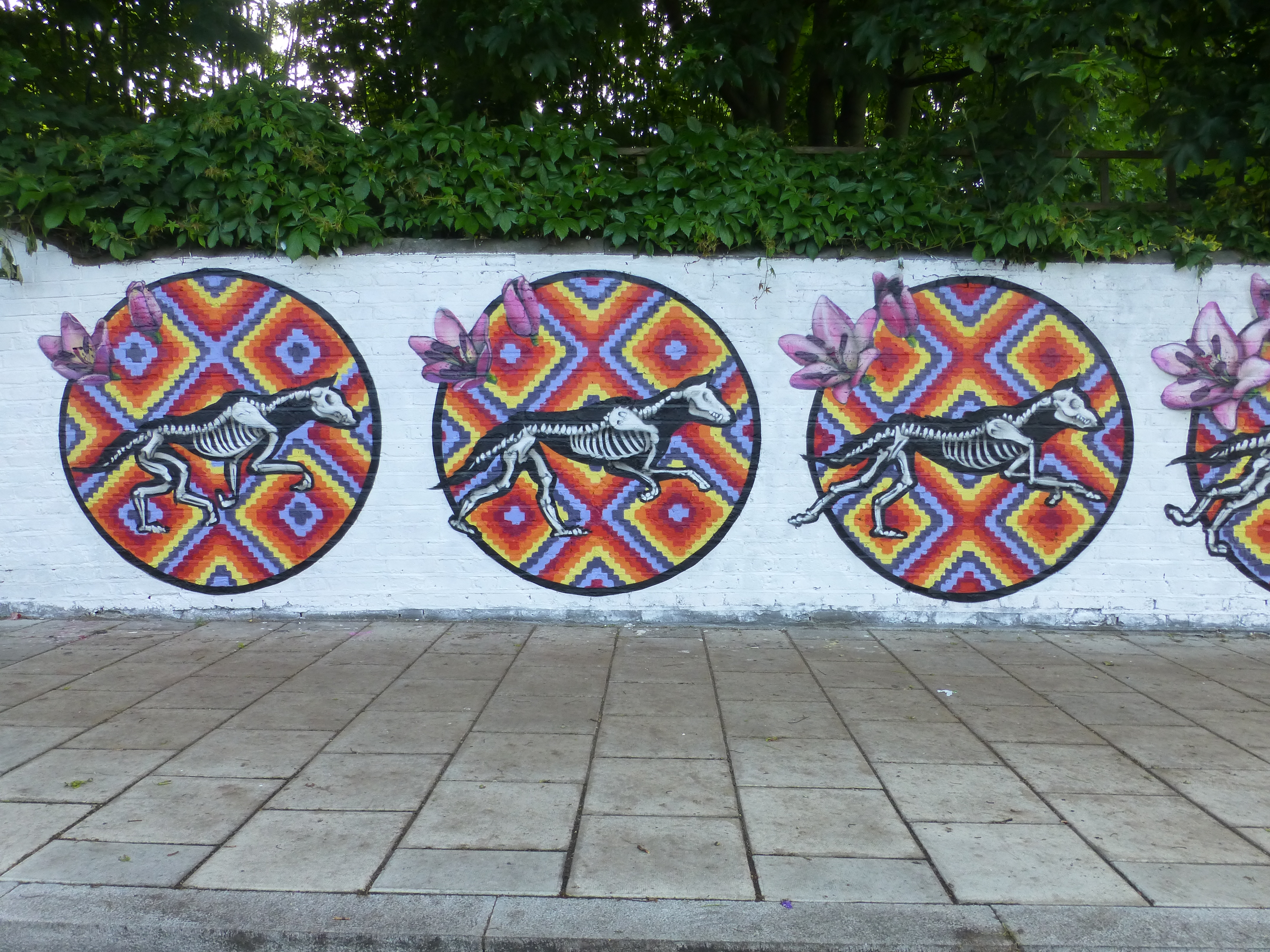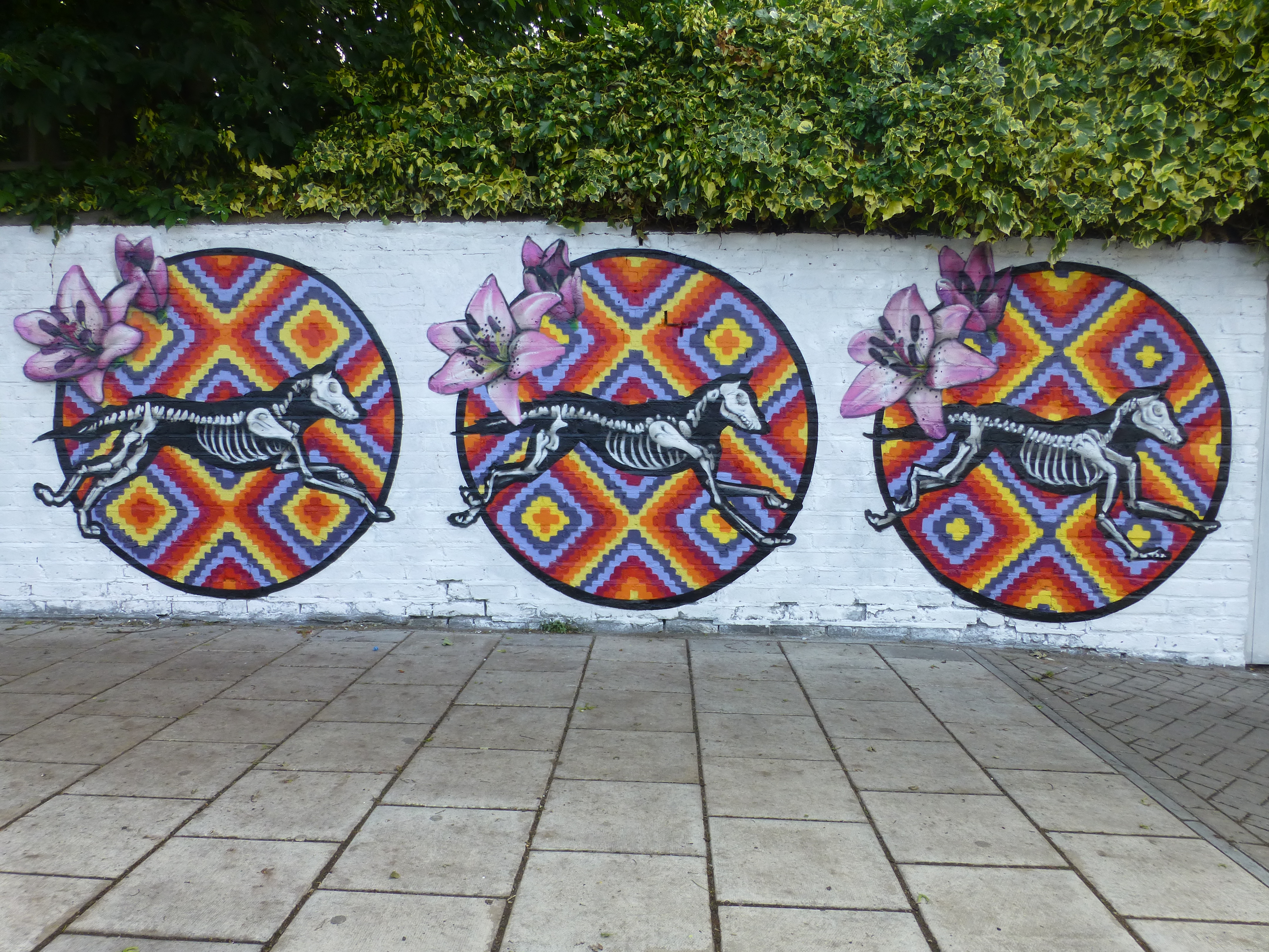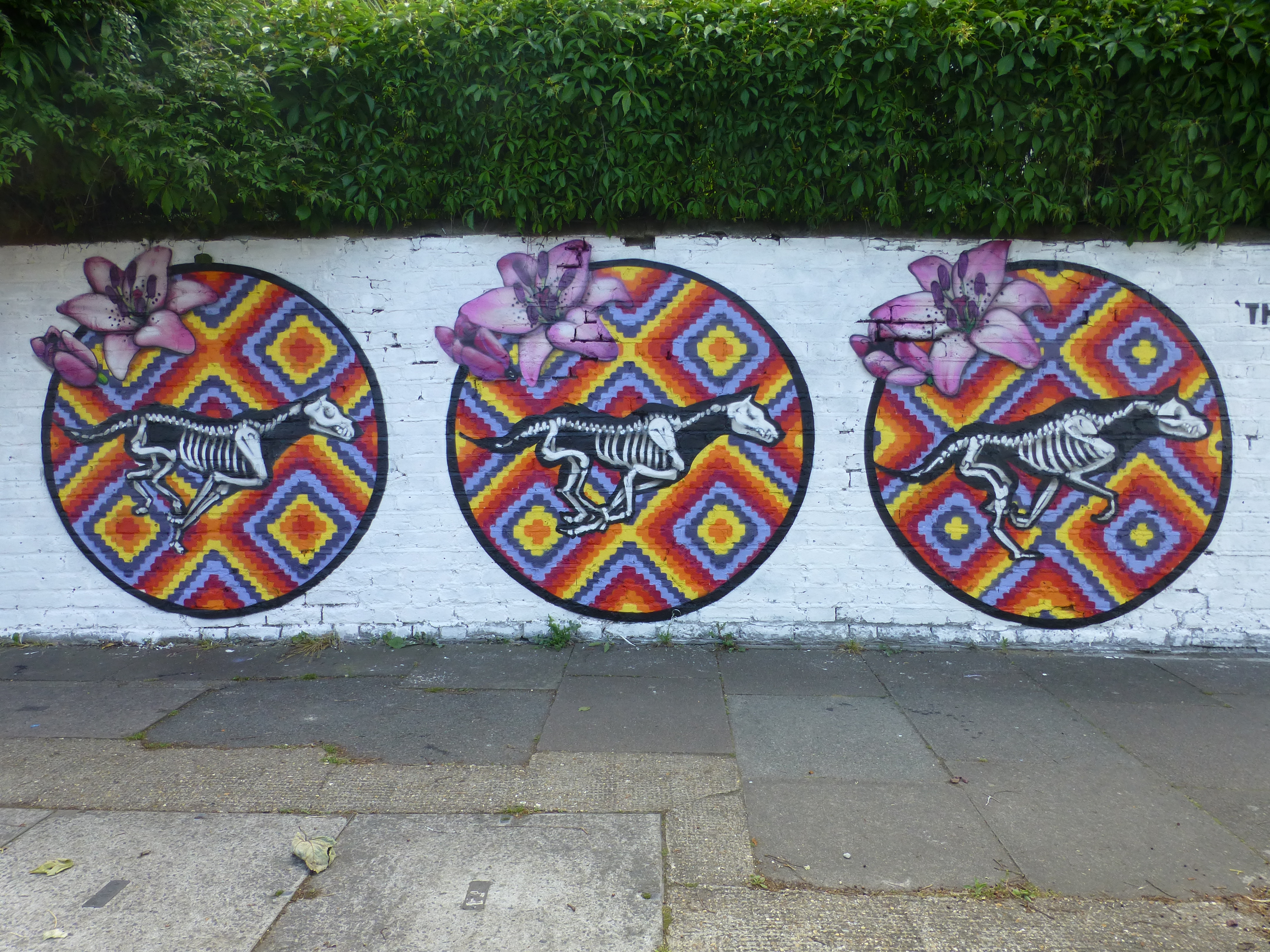 Over the course of a week now UK Street Artist INSA has been exceptionally busy on Avignon Road as part of the Brockely Street Art Festival. INSA who represents an exceptionally tech-savvy approach to art which he dubs Gif-iti. INSA likes to paint on walls, take a photo, repaint and so on until he can make the art move in .gif form, creating surreal and wonderful pieces like no other, truely a product of the digital age we live in. It’s easy to see why INSA spent so long at work on this piece entitled ‘The End Is Only The Beginning’ in Brockley, it is very intricate and large scale, and sets to depict a skeletal hound running to a psychedelic background.
