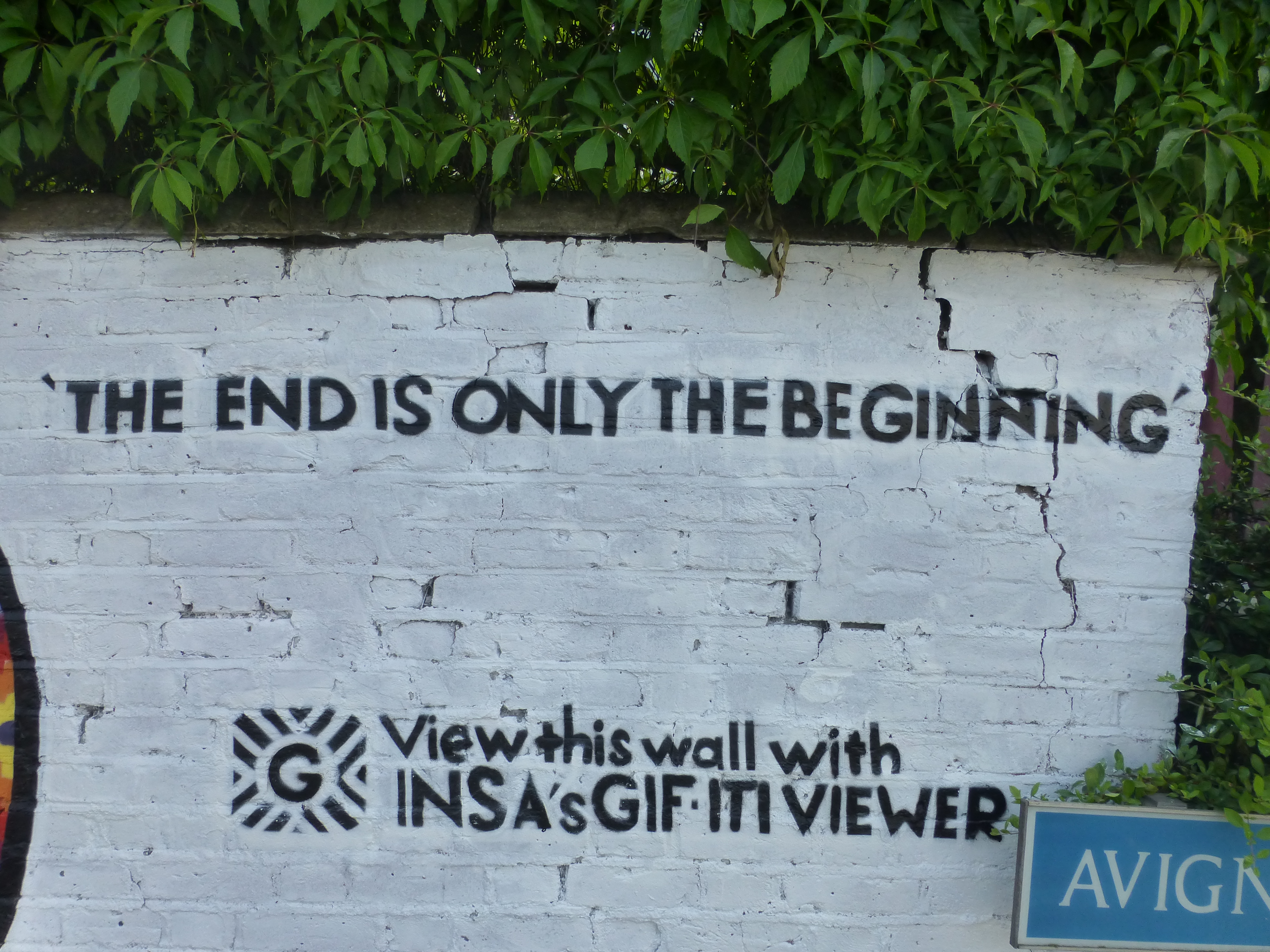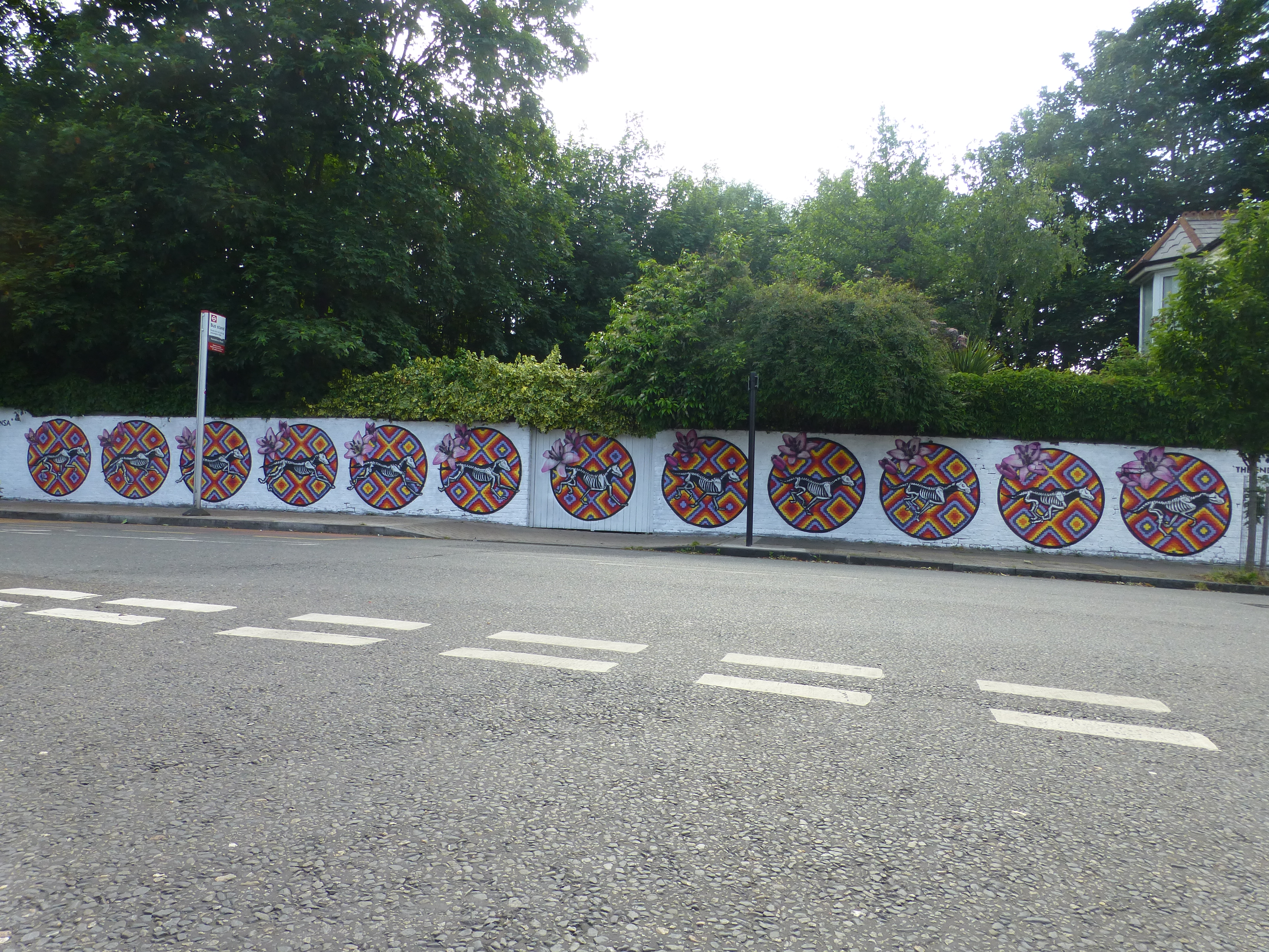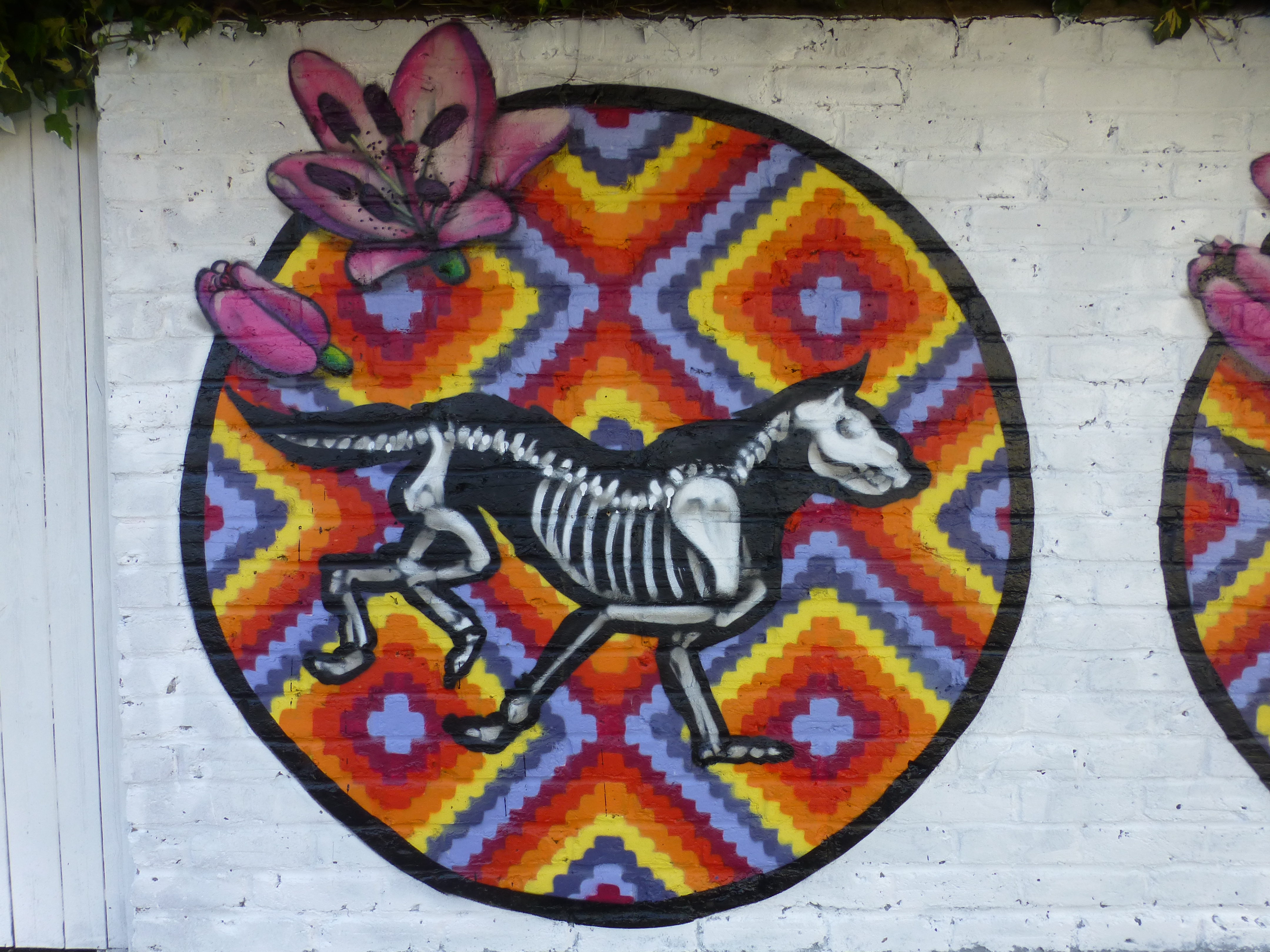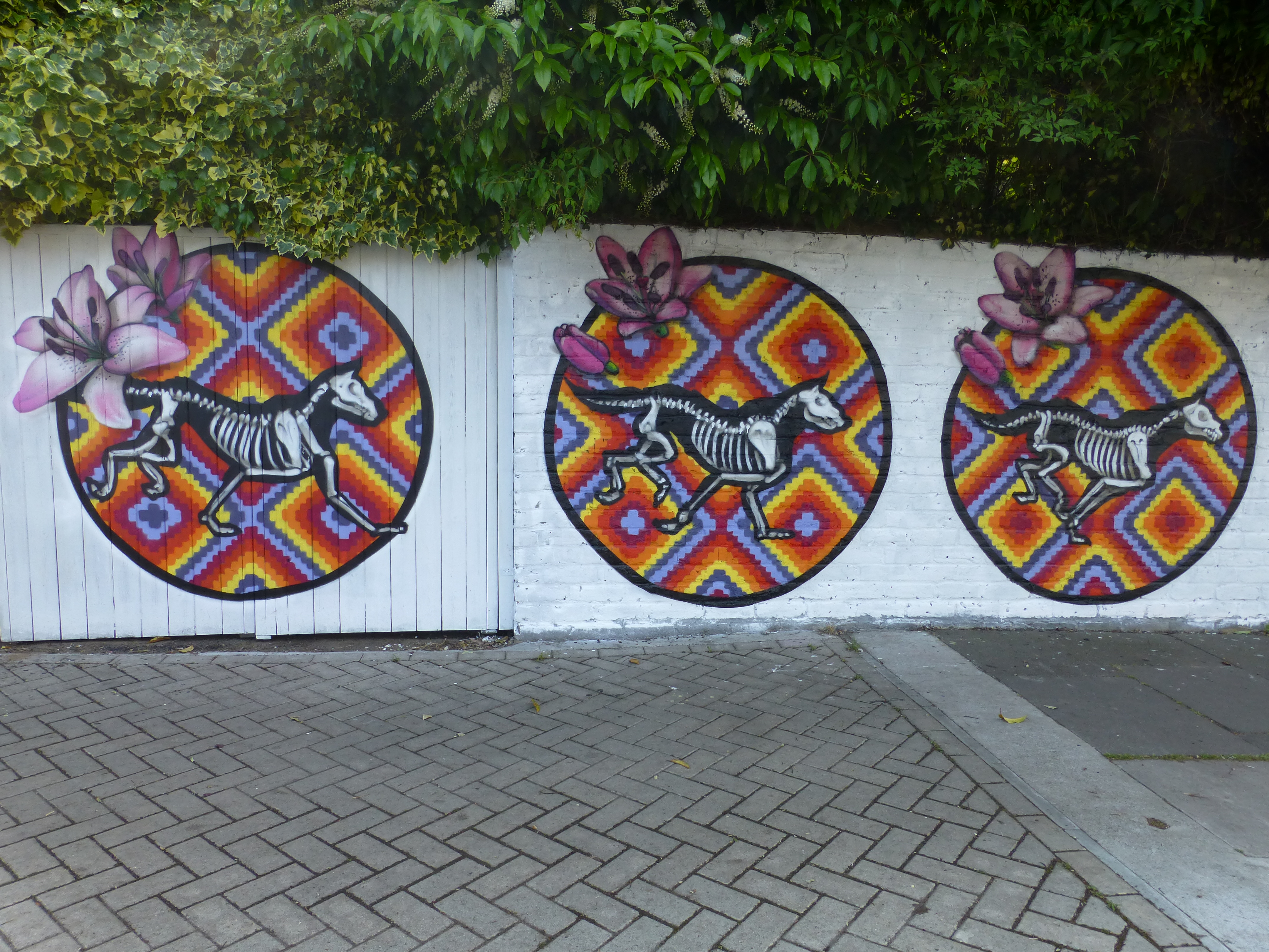 Over the course of a week now UK Street Artist INSA has been exceptionally busy on Avignon Road as part of the Brockely Street Art Festival. INSA who represents an exceptionally tech-savvy approach to art which he dubs Gif-iti. INSA likes to paint on walls, take a photo, repaint and so on until he can make the art move in .gif form, creating surreal and wonderful pieces like no other, truely a product of the digital age we live in. It’s easy to see why INSA spent so long at work on this piece entitled ‘The End Is Only The Beginning’ in Brockley, it is very intricate and large scale, and sets to depict a skeletal hound running to a psychedelic background.