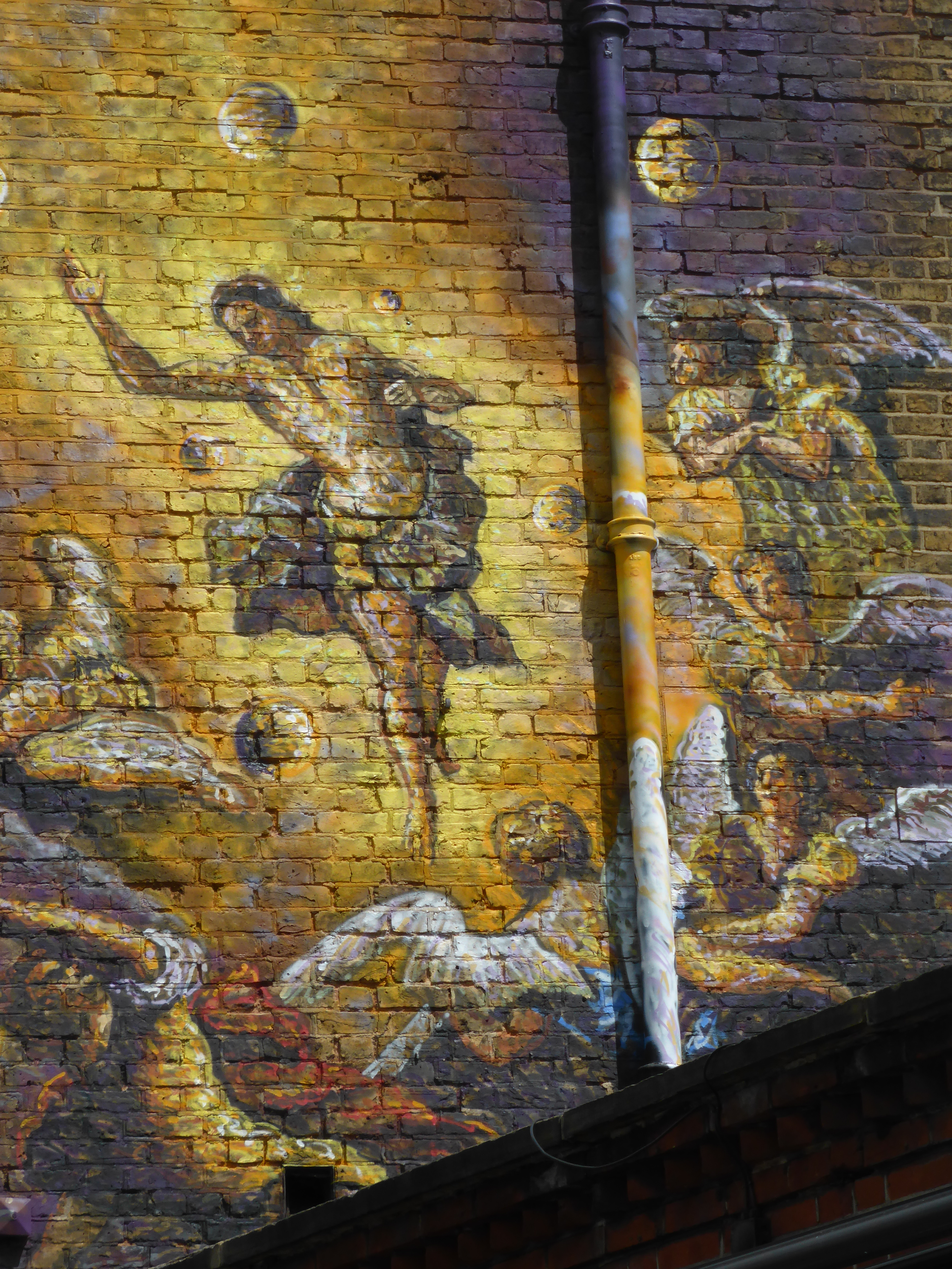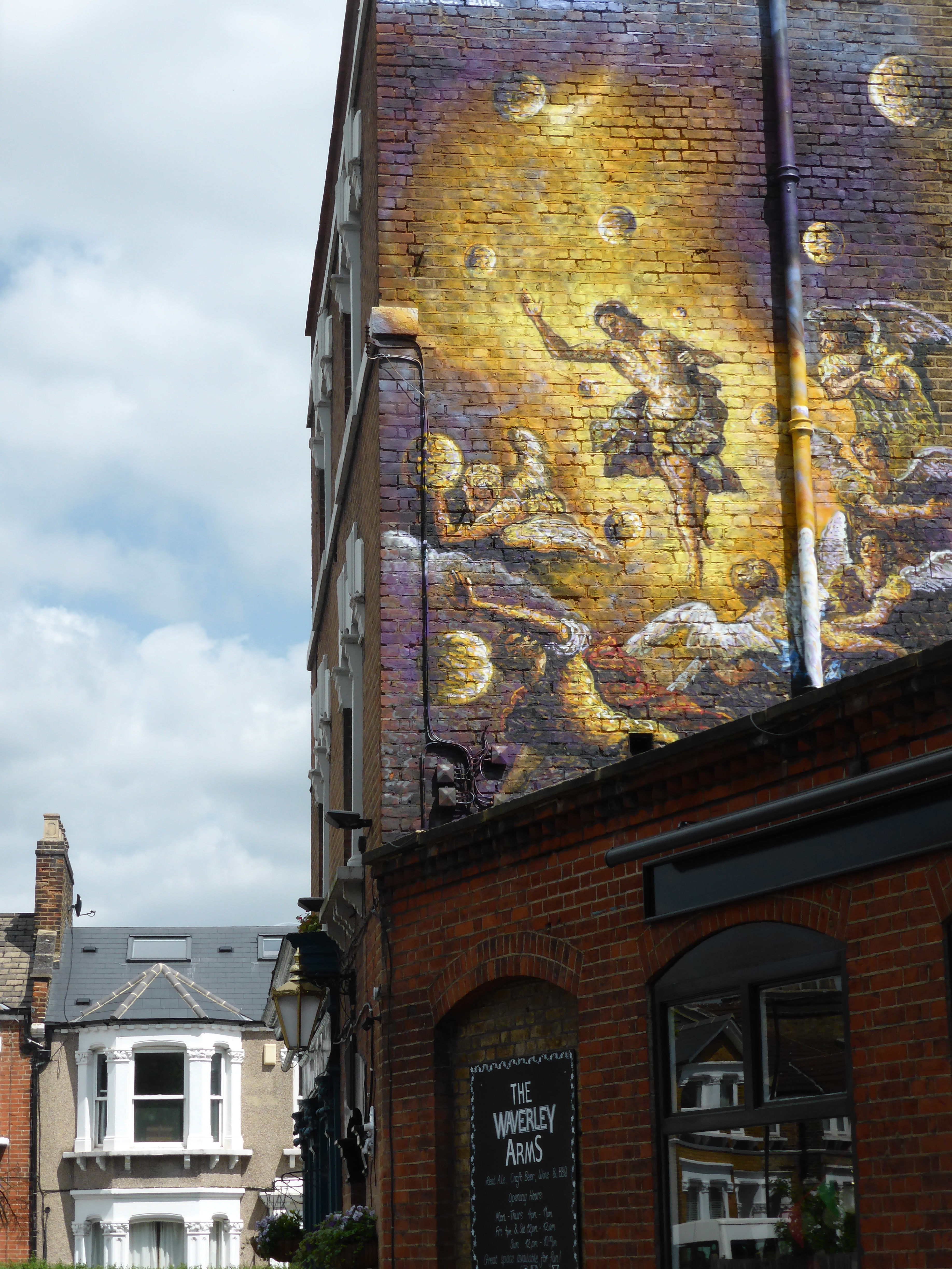 Jimmy C has been quite active over the last month or so and his most recent work has been placed up in Dulwich as a part of the continuing Baroque The Streets Project, in association with the Dulwich Picture Gallery. For this project the pieces placed up are all set to take inspiration from a painting hanging in the Dulwich Picture Gallery. This piece by Jimmy C was inspired by Sebastiano Ricci’s ‘The Fall of the Rebel Angels’, which currently resides in the Dulwich Picture Gallery. This piece makes for a differant and interesting subject matter. Presented in a beautiful colour palette, that one would perhaps to see in a cathedral, this work on the premises of the Waverley Arms is a beautiful piece of art and a superb addition to the ongoing Baroque The Streets Project.