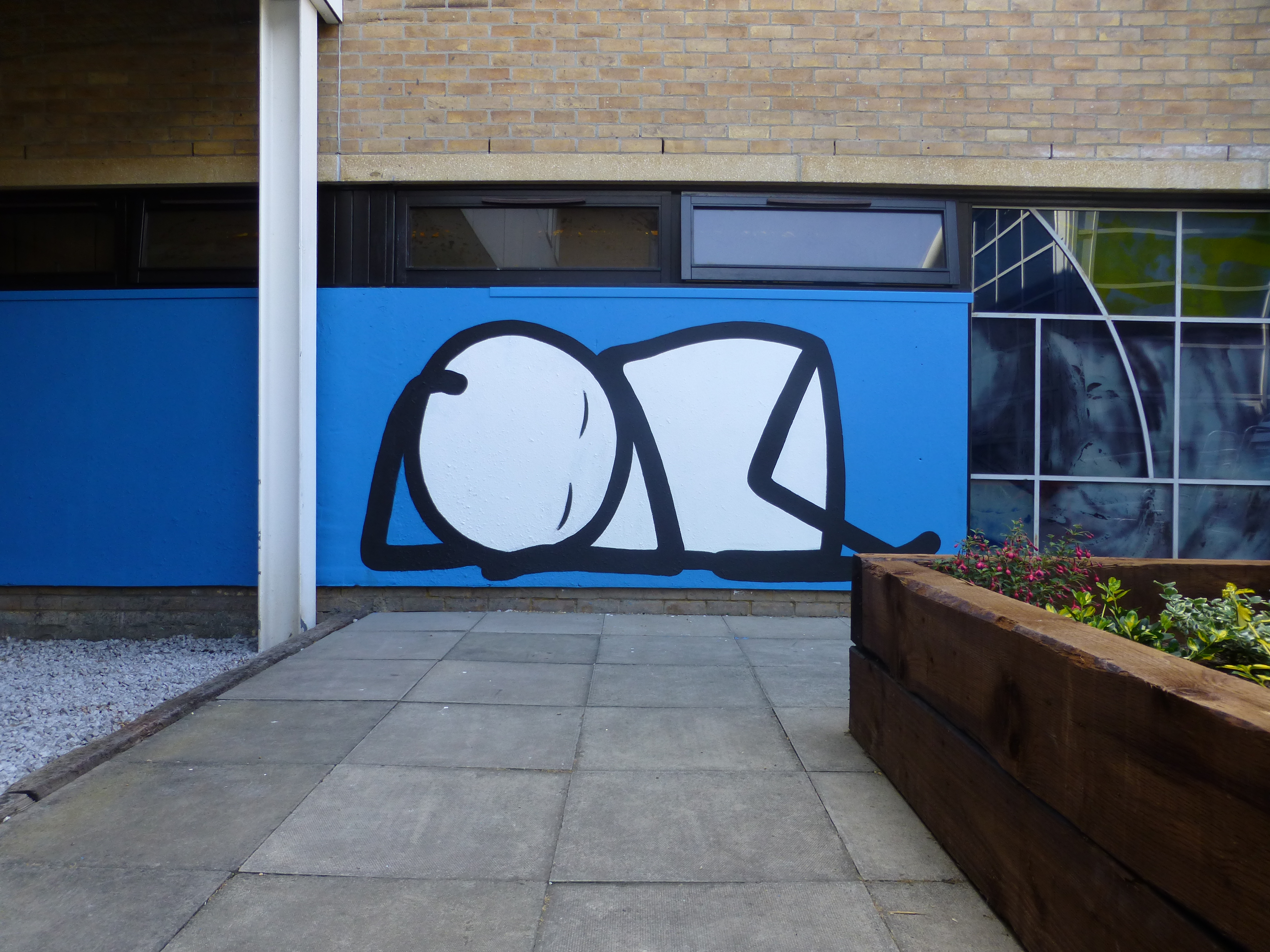 Over the course of Friday and Saturday globally acclaimed Street Artist Stik laid out a fresh piece for Homerton Hospital, depicting one of his trademark stick figure characters. The work features Stik’s character laying peacefully on its side and is located in a little courtyard behind the main hospital reception. As is often the case it is impressive as to how much meaning, depth and emotion Stik can generate in such an essentially minimalist formatting. What is also noticeable upon seeing such fresh work from is how clean the lines are and how smooth the texture of the piece is, it’s as if the piece has been computer generated and explains as to why Stik spends so much time on his work, when one would assume it must take him no time at all.