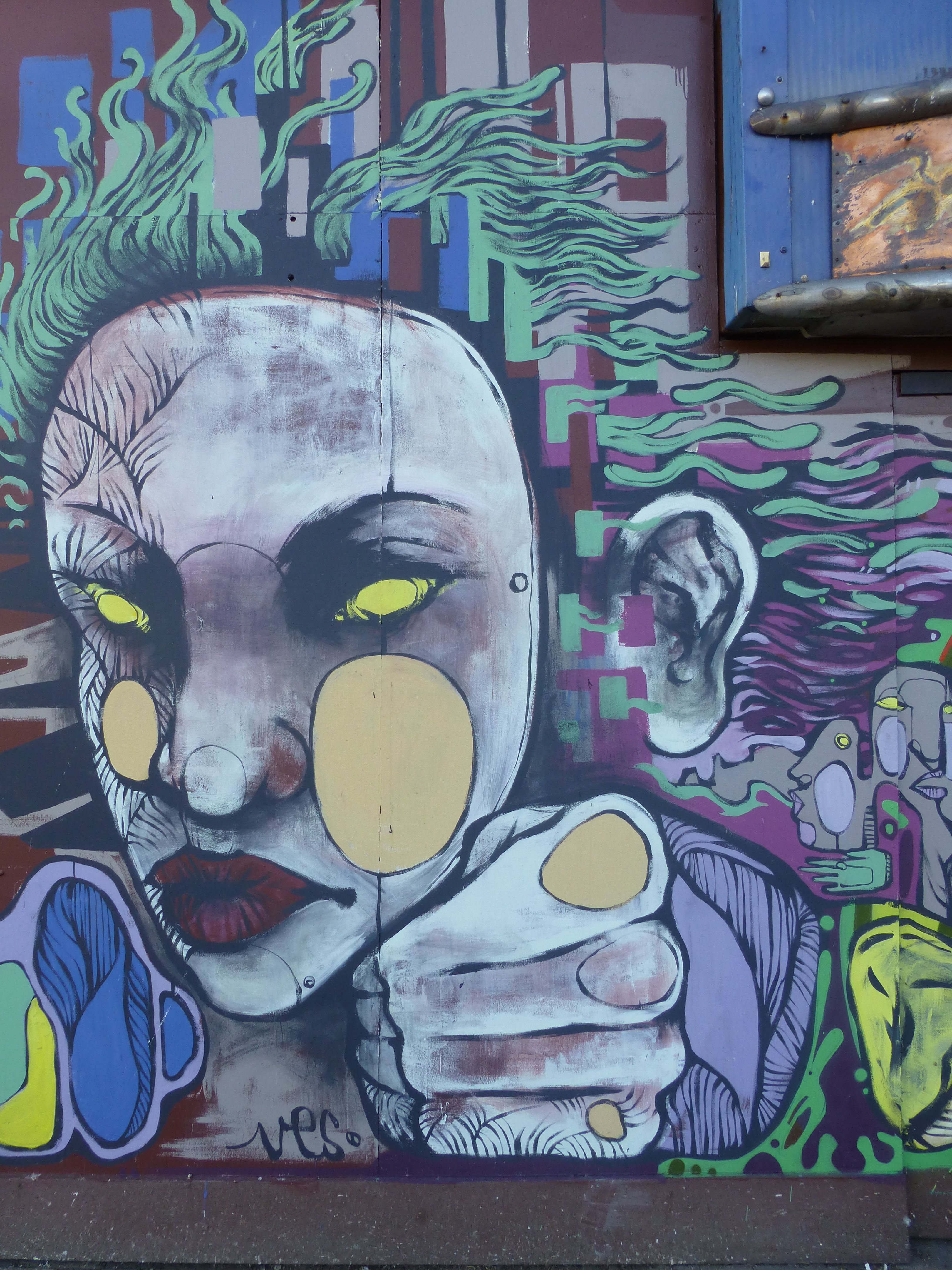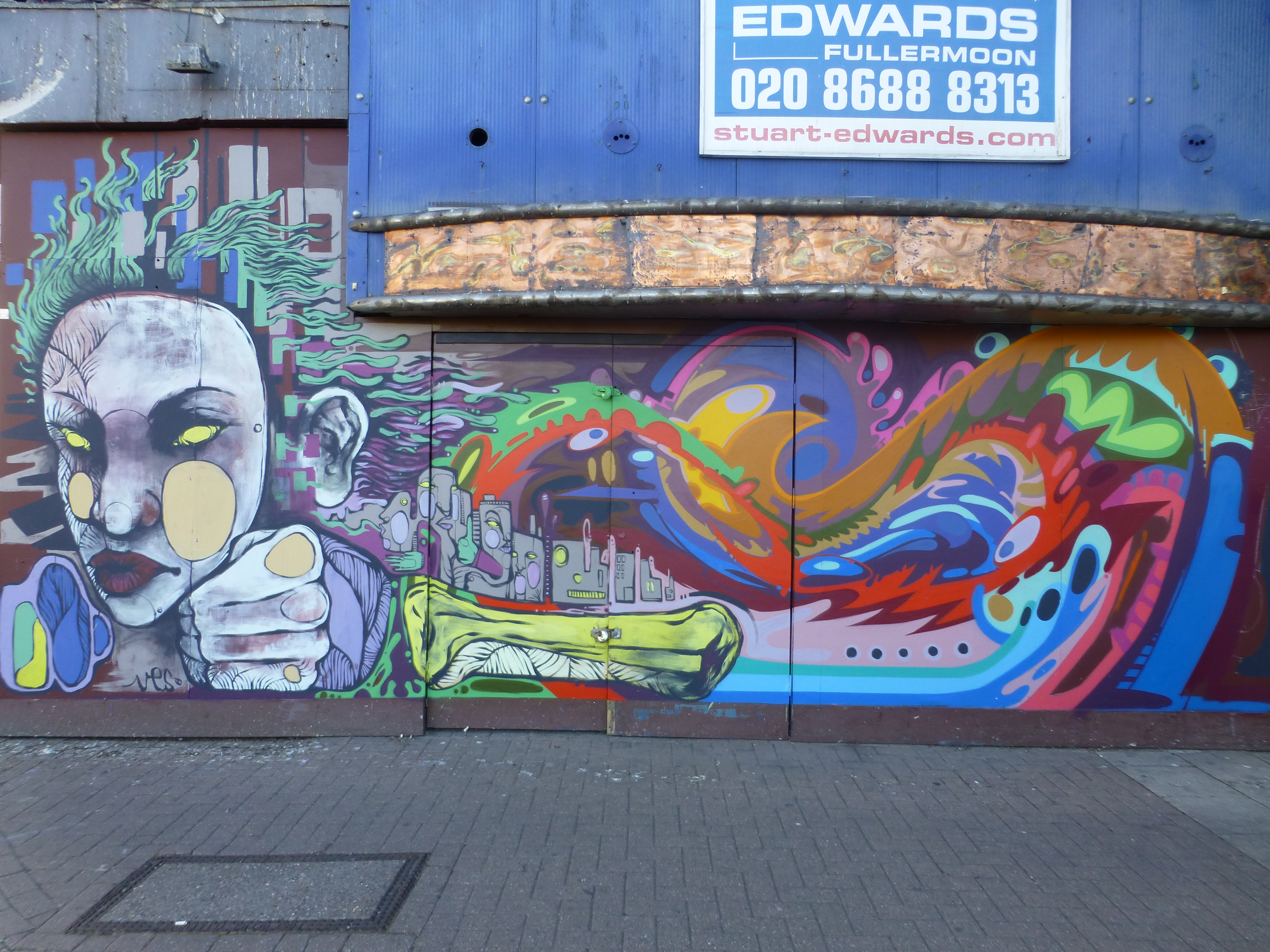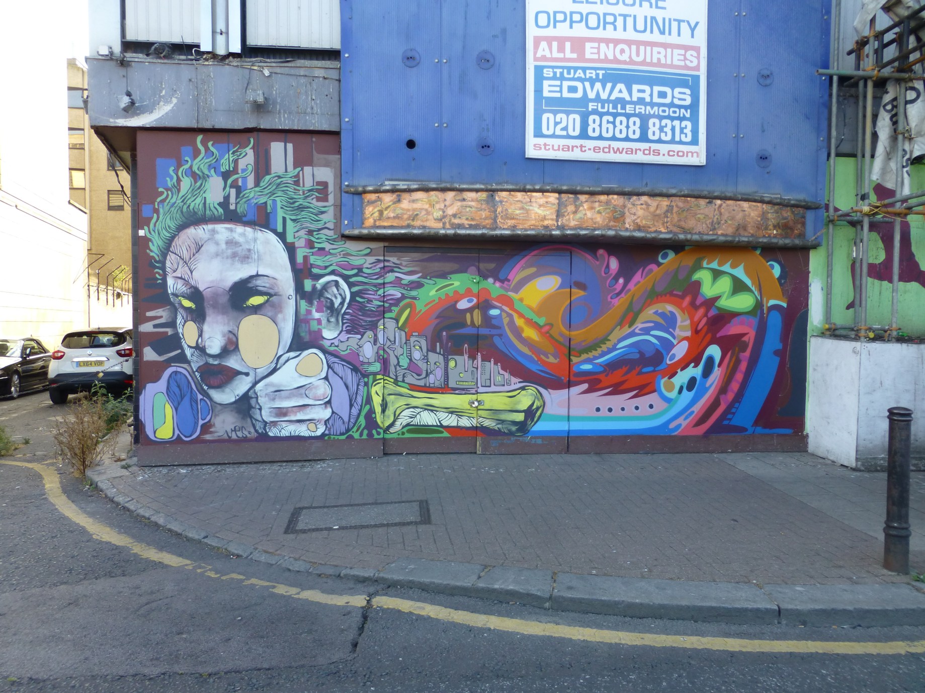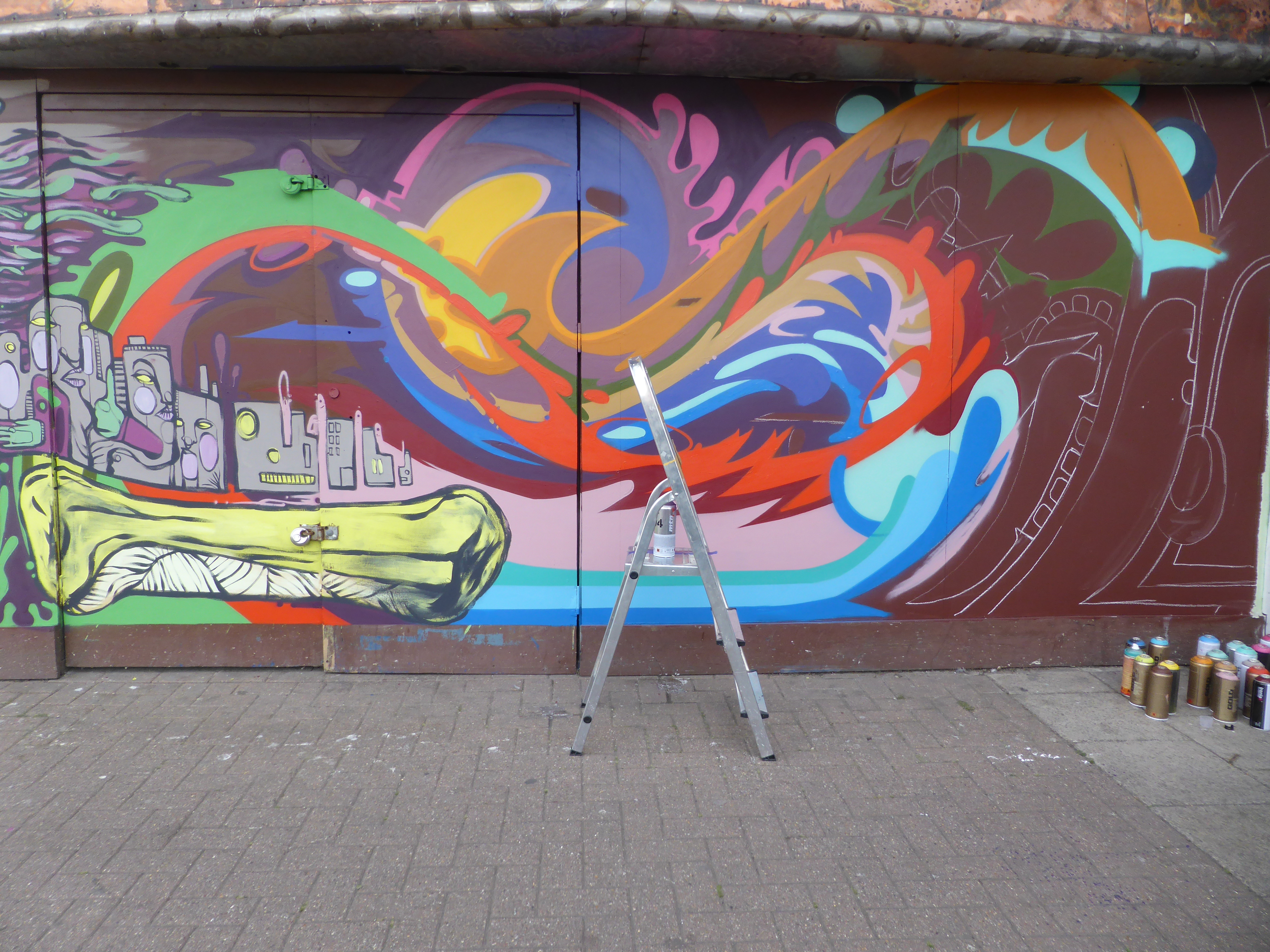 A couple of weeks back in Croydon’s Arts Quarter a delightful collaboration was placed up by Morgazmik & Vesna Parchet, both members of the Mine Sweeper Collective. The piece makes for an colourful and interesting collaboration with a lot going on and incorporating two rather diverse styles. Morgazmik working to his distinctive organic and fluid abstract based design accompanied by Vesna Parchet’s Kabuki inspired character work, making for an all round cohesive pairing. We were fortunate enough to catch Morgazmik working on this impressive piece and its great to see his further involvement in the Street Art that has been placed up in Croydon thus far this year, with this making for the fourth work he has been involved in creating in the Arts Quarter.