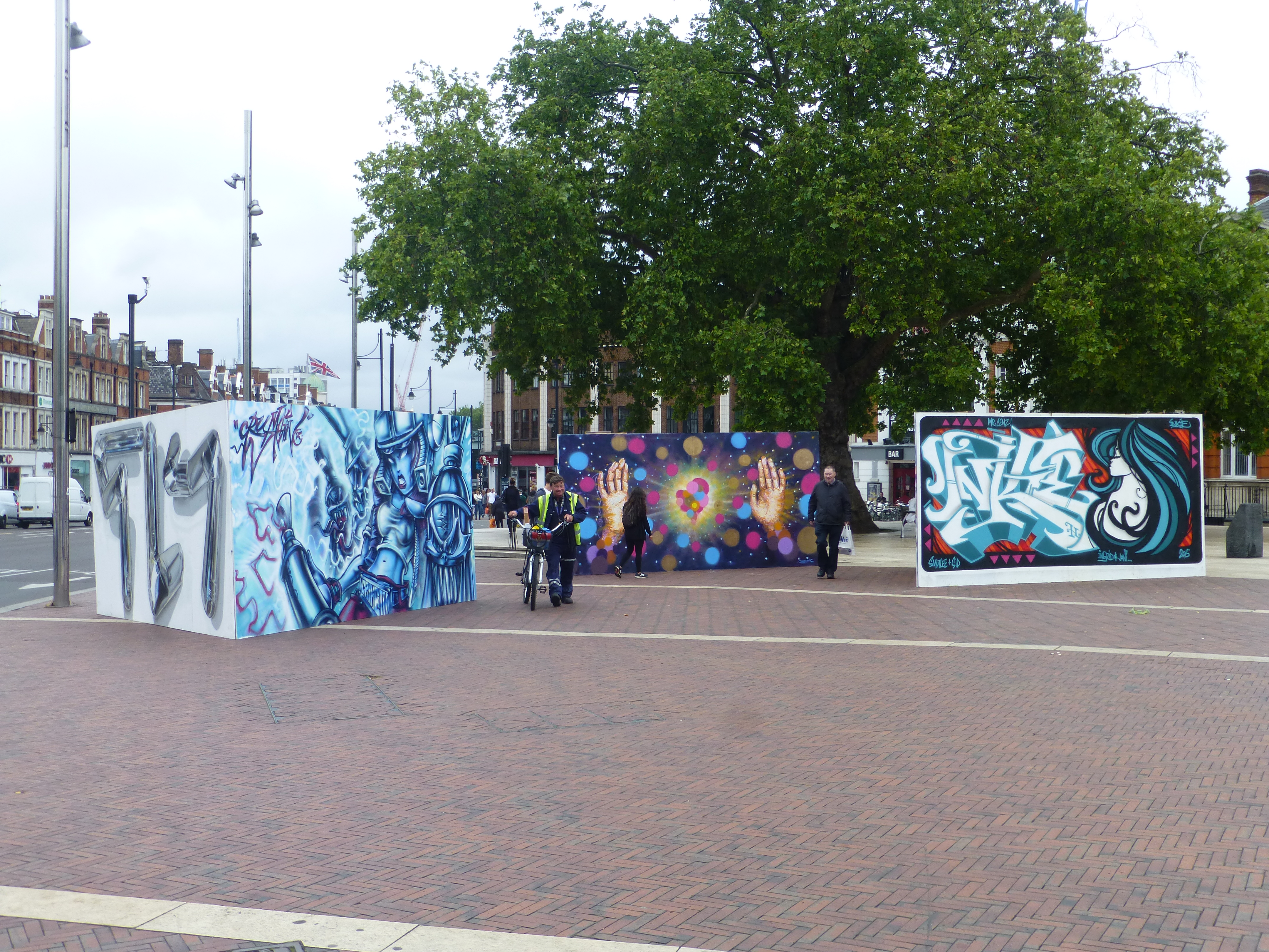 Works from Fanakapan, Crymein, Jimmy C & Inkie currently on display in Windrush Square.