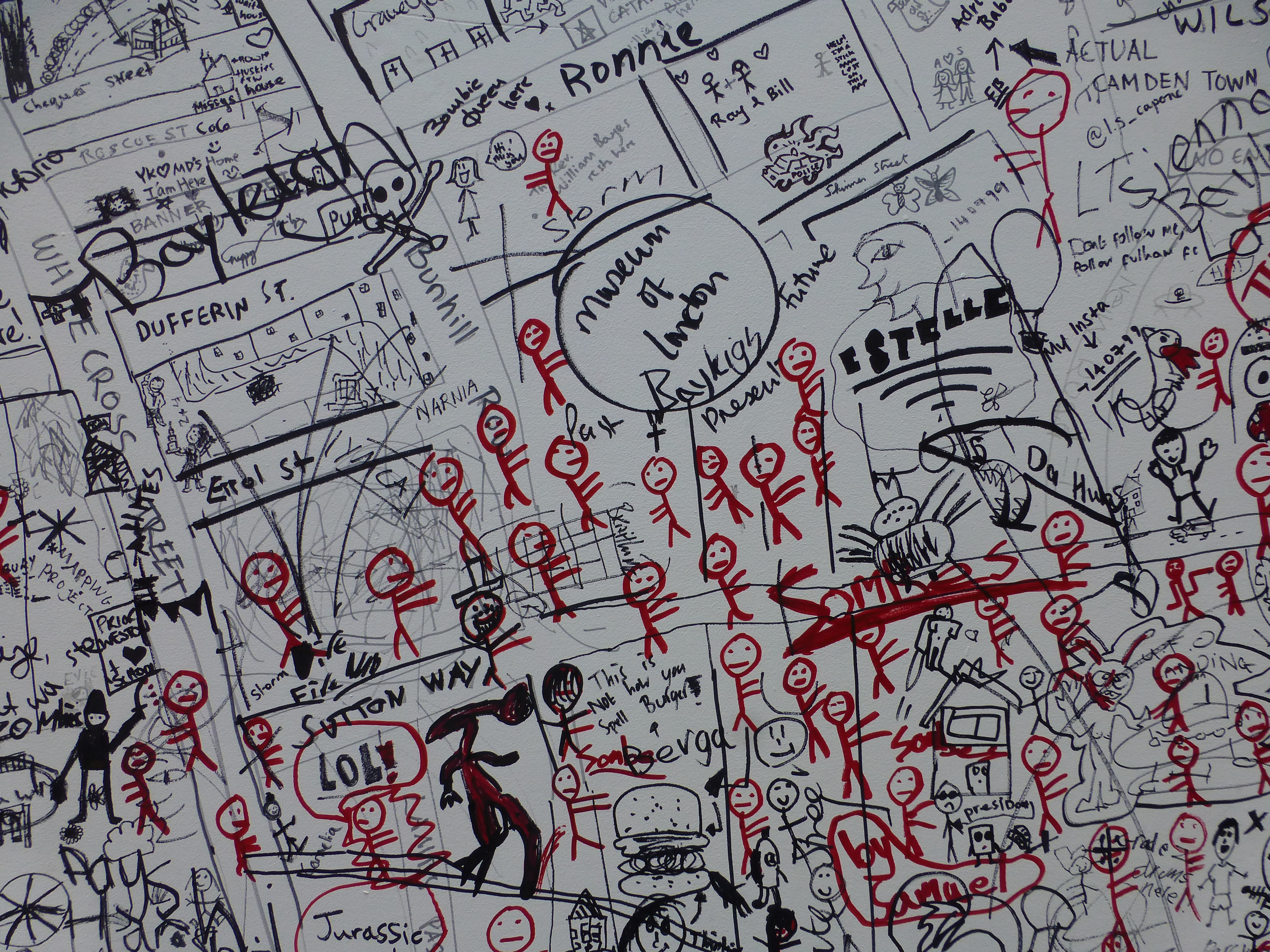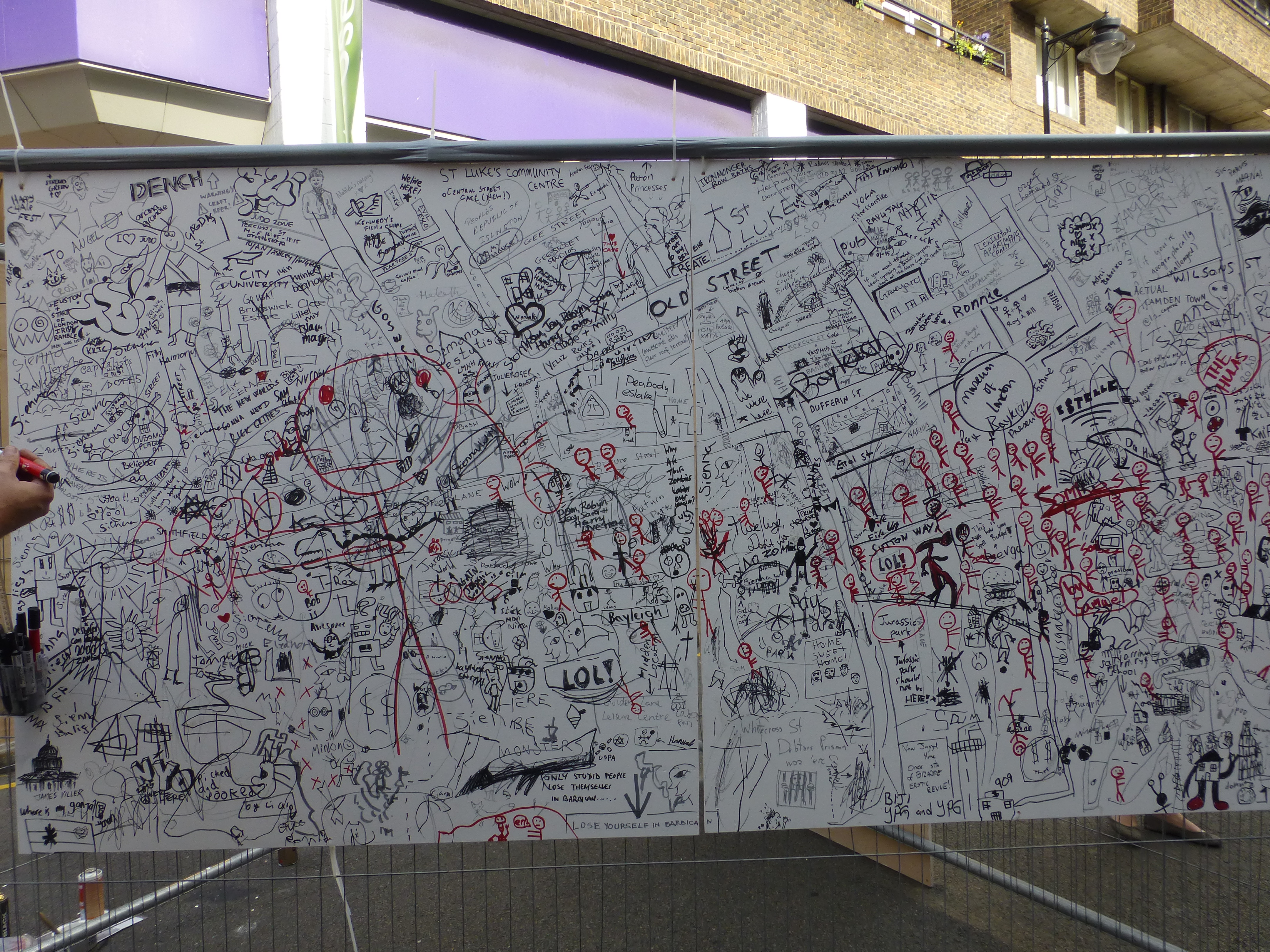 This great piece, a map of the immediate area, was initiated by Cornelia Marland and then was open to any passing member of the public to contribute too.