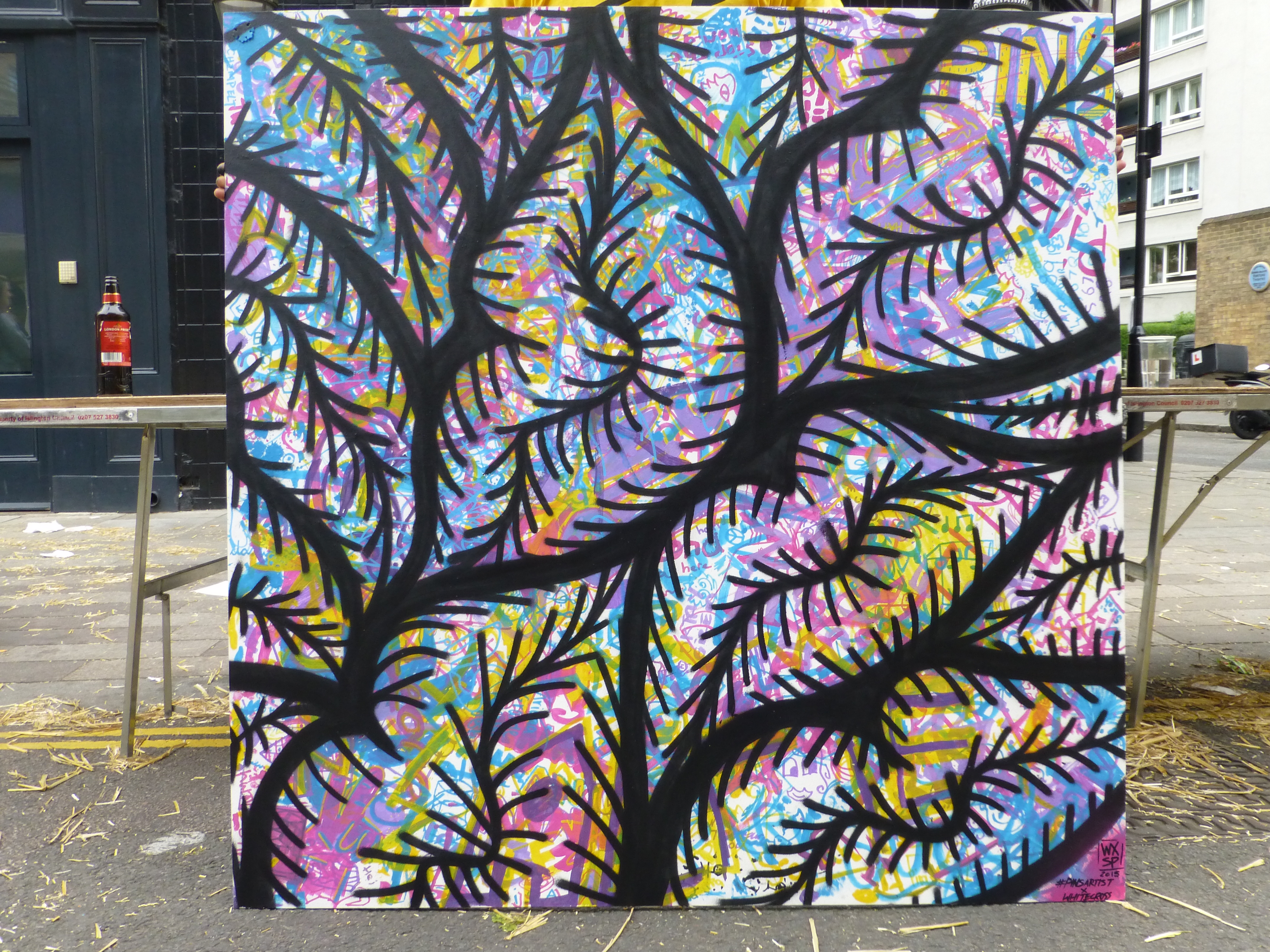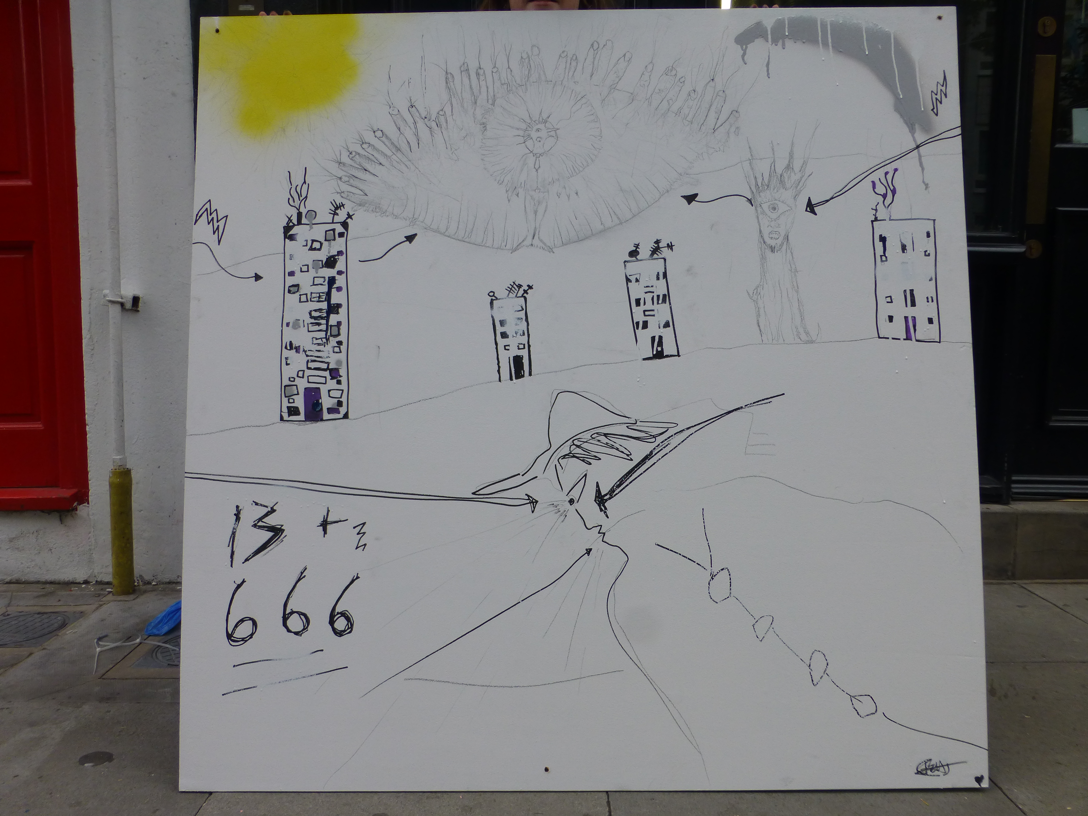 Work by PINS x Whitecross, with various participants drawing on the board in PINS trademark colours of yellow, blue and purple before PINS added his distinctive ‘Lipweed’ in black.