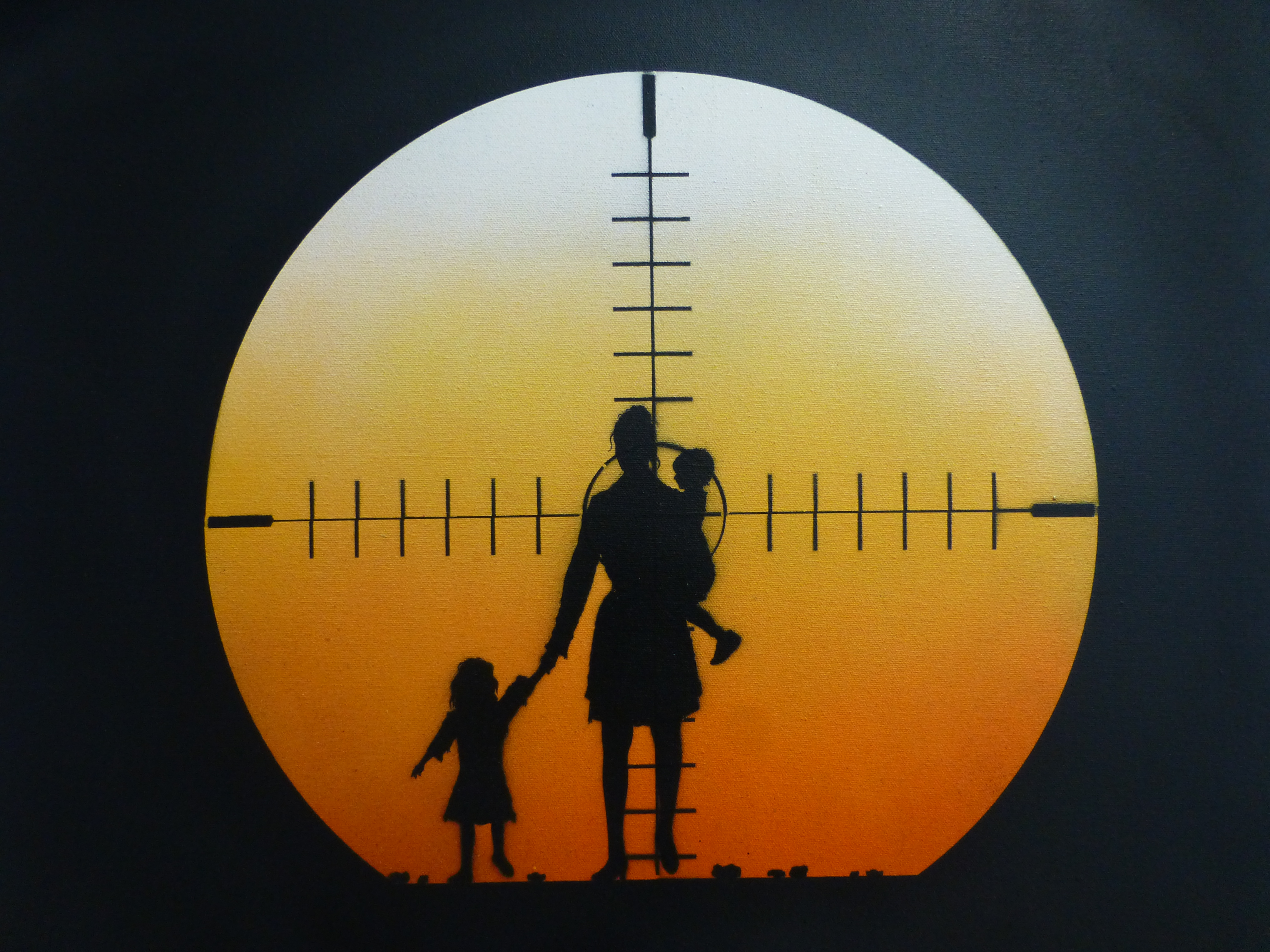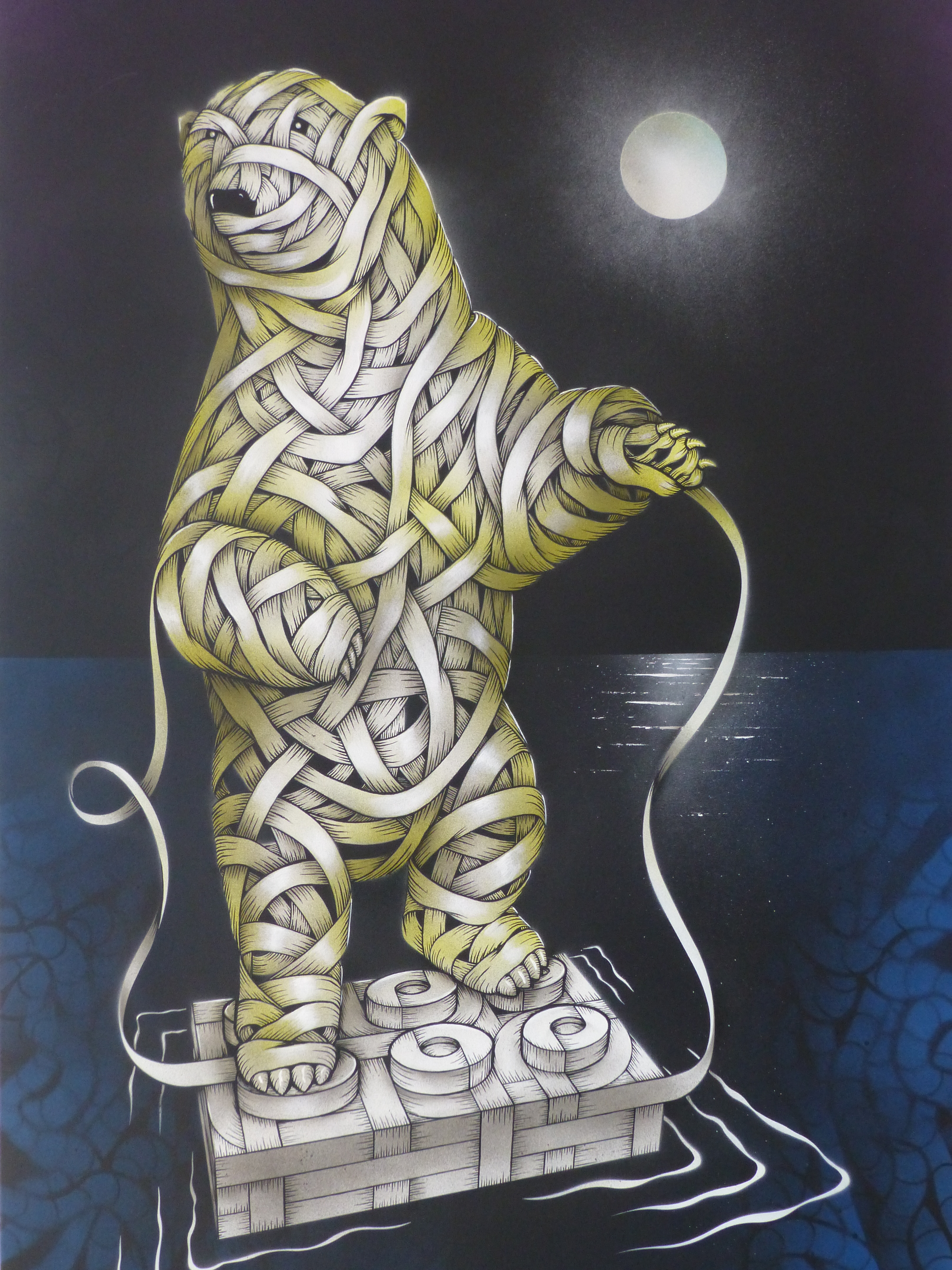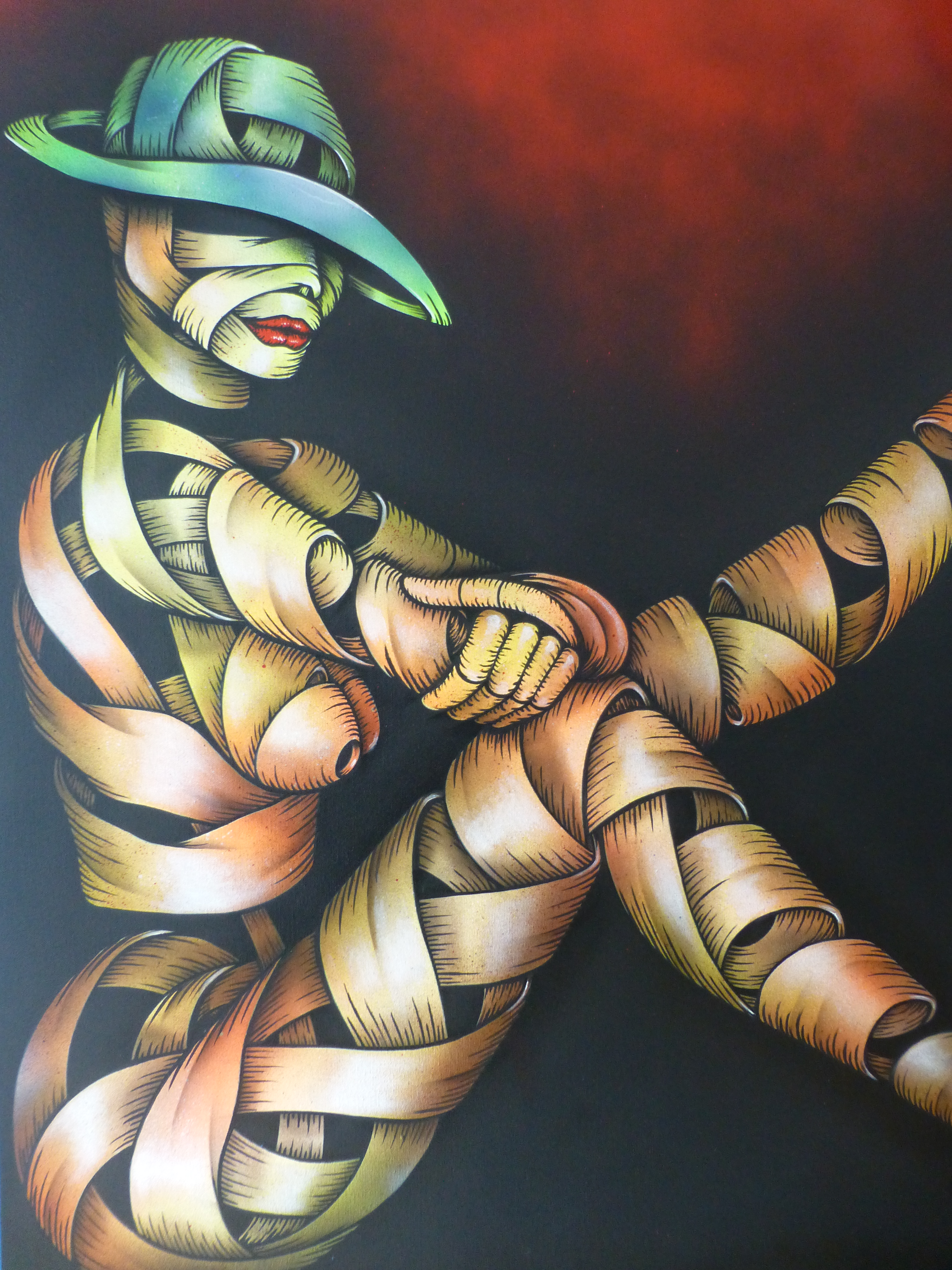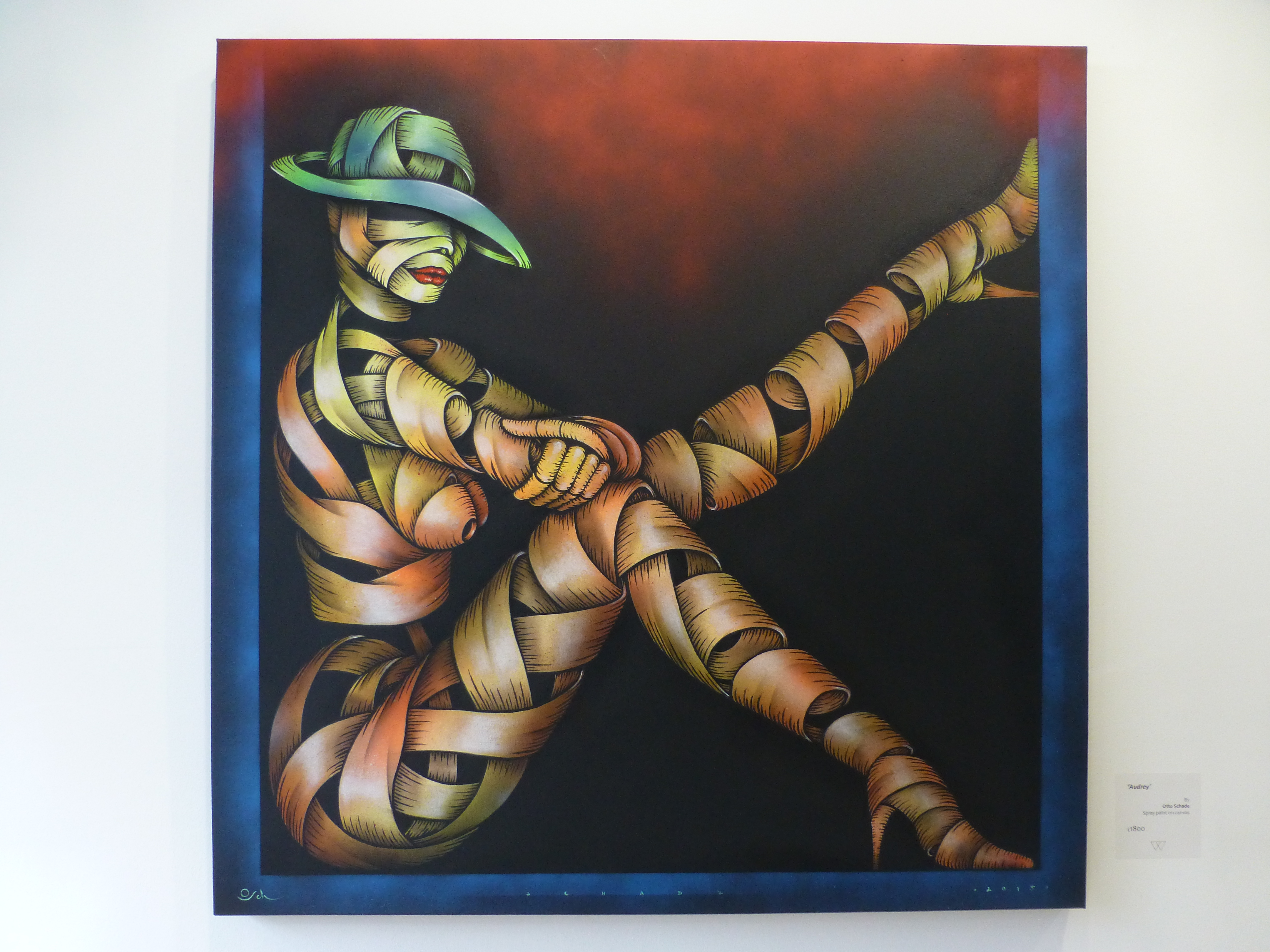 Otto’s painting styles range from the abstract and surreal to the stark and brutal. Working predominantly with oil paint, and incorporating practices such as collage, illustration and stencil. The themes behind his compositions read in a personal, metaphorical sense with a sharp, ironic touch. Otto has long been a major star on the London street art scene and it is easy to see why with his works offering a combination of the creative and fun with his ‘ribbon’ effect style creations which offer so much depth and intricacy to look at and lose yourself in, and offer a glimpse at his former career as an architect, countered by his stark and incredibly powerful silhouette pieces, which really do just stop you in your tracks and provide something to think about.