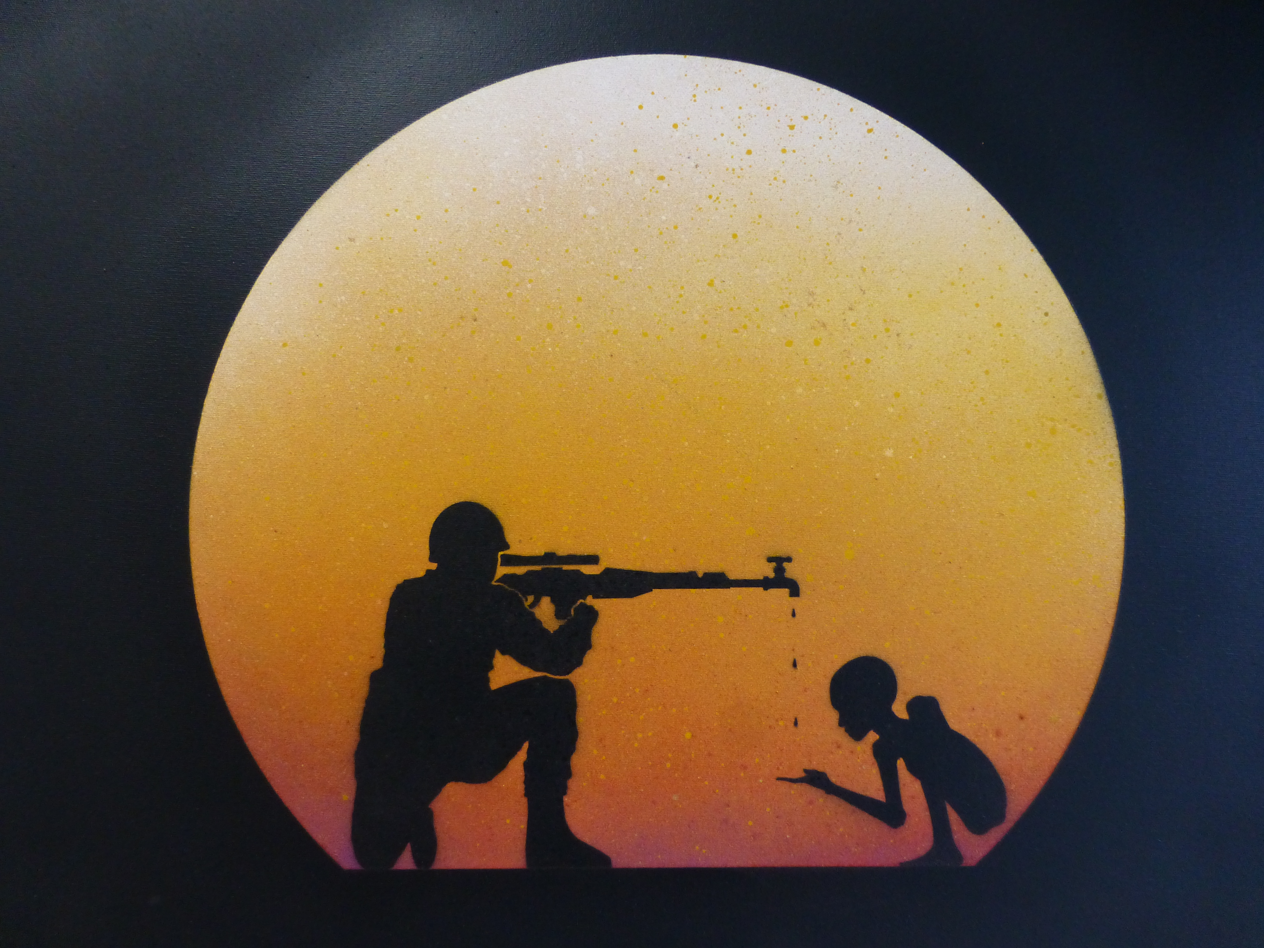 This exhibition draws upon an even mix of these two styles which are both instantly recognizable as being the work of Osch and many of these pieces have been placed up around London, and elsewhere, in the past, some very recently. If you are in the area head along for an exhibition which features some fourteen works, all stencil pieces presented on canvas and you won’t be disappointed. Highlights for us were predominantly in the first half of the show which showcases the more intricate ‘ribbon’ based creations and include the surreal and despair ridden ‘Man Knit Pollution’ along with the intricate and beautiful ‘Tiger Butterfly’ piece. Of the silhouette based works the two favourite works for us here at London Calling were ‘The Sniper’ and ‘Say It With Flowers’. The show runs until August 23rd, and the Gallery is open from Monday to Saturday, if you are in London over the next few weeks head along for a great exhibition of Otto Schade’s works.