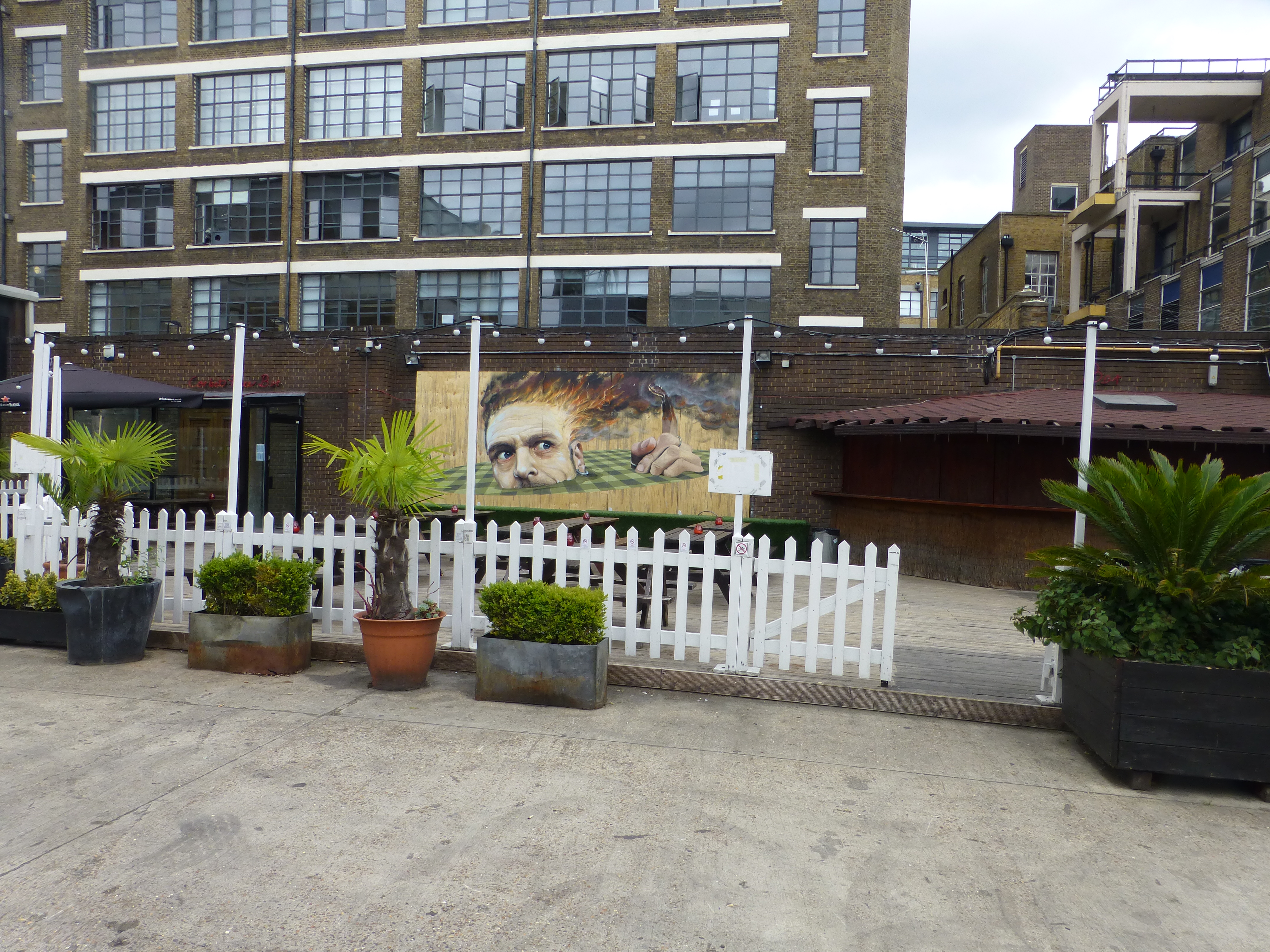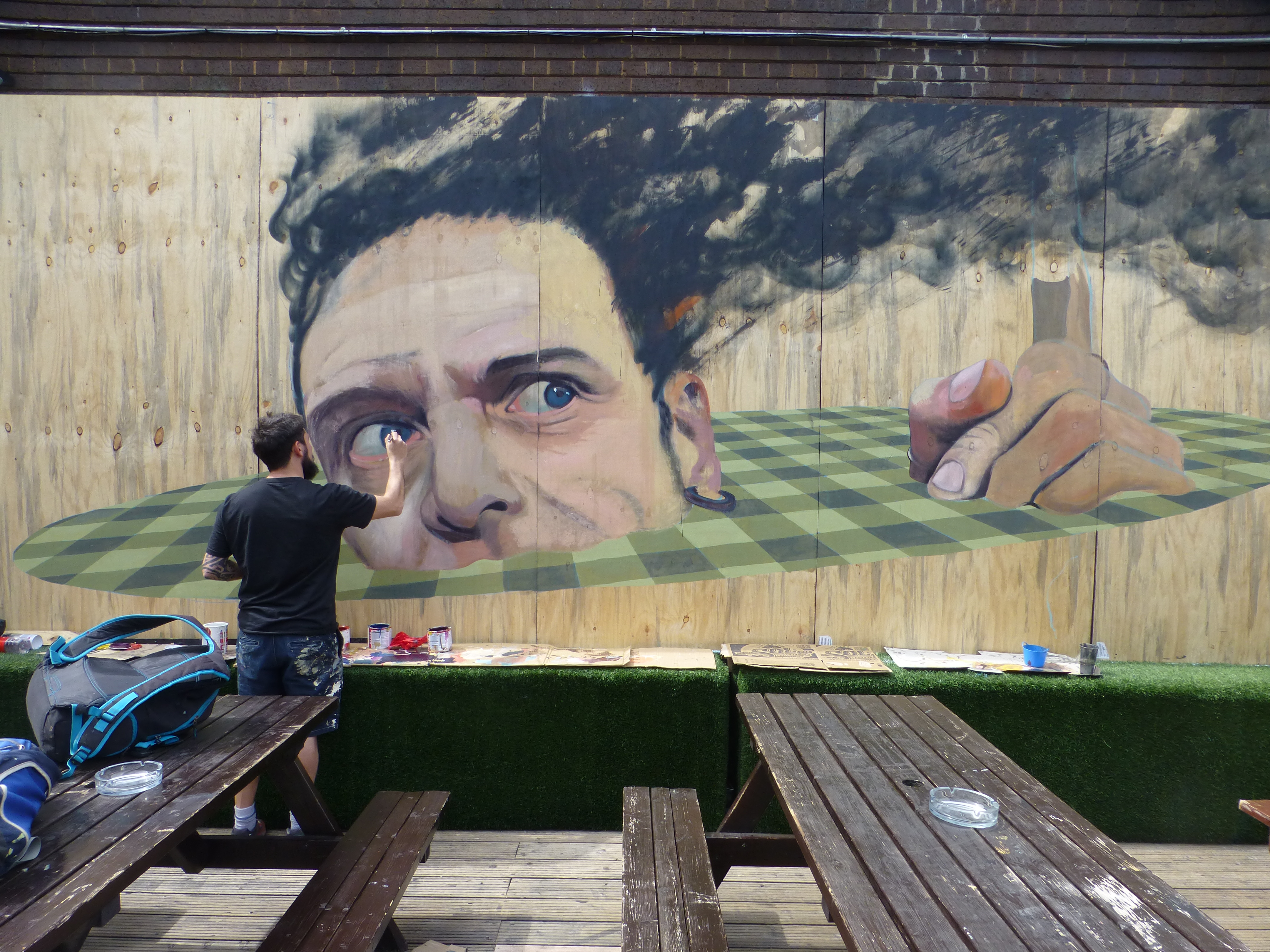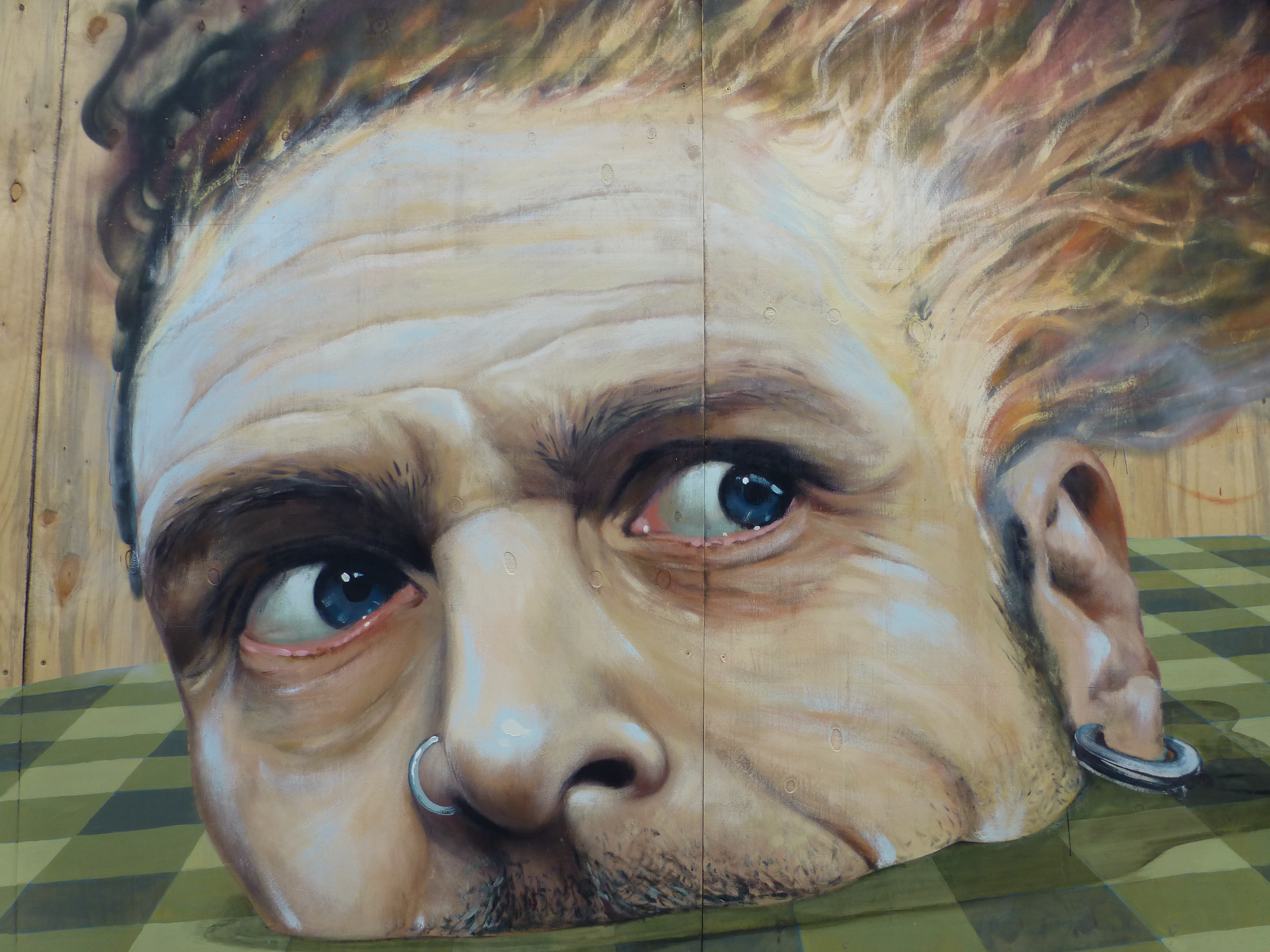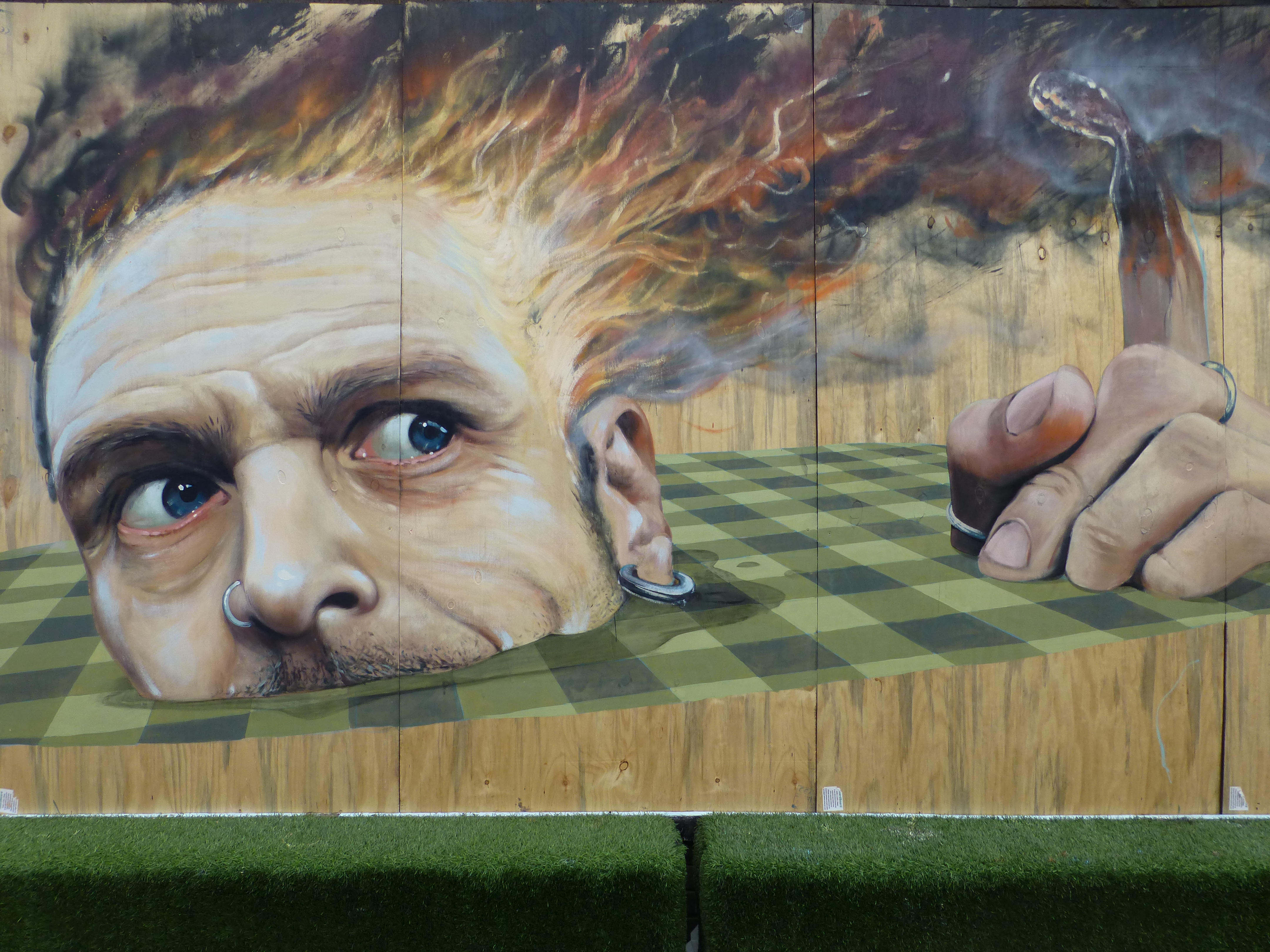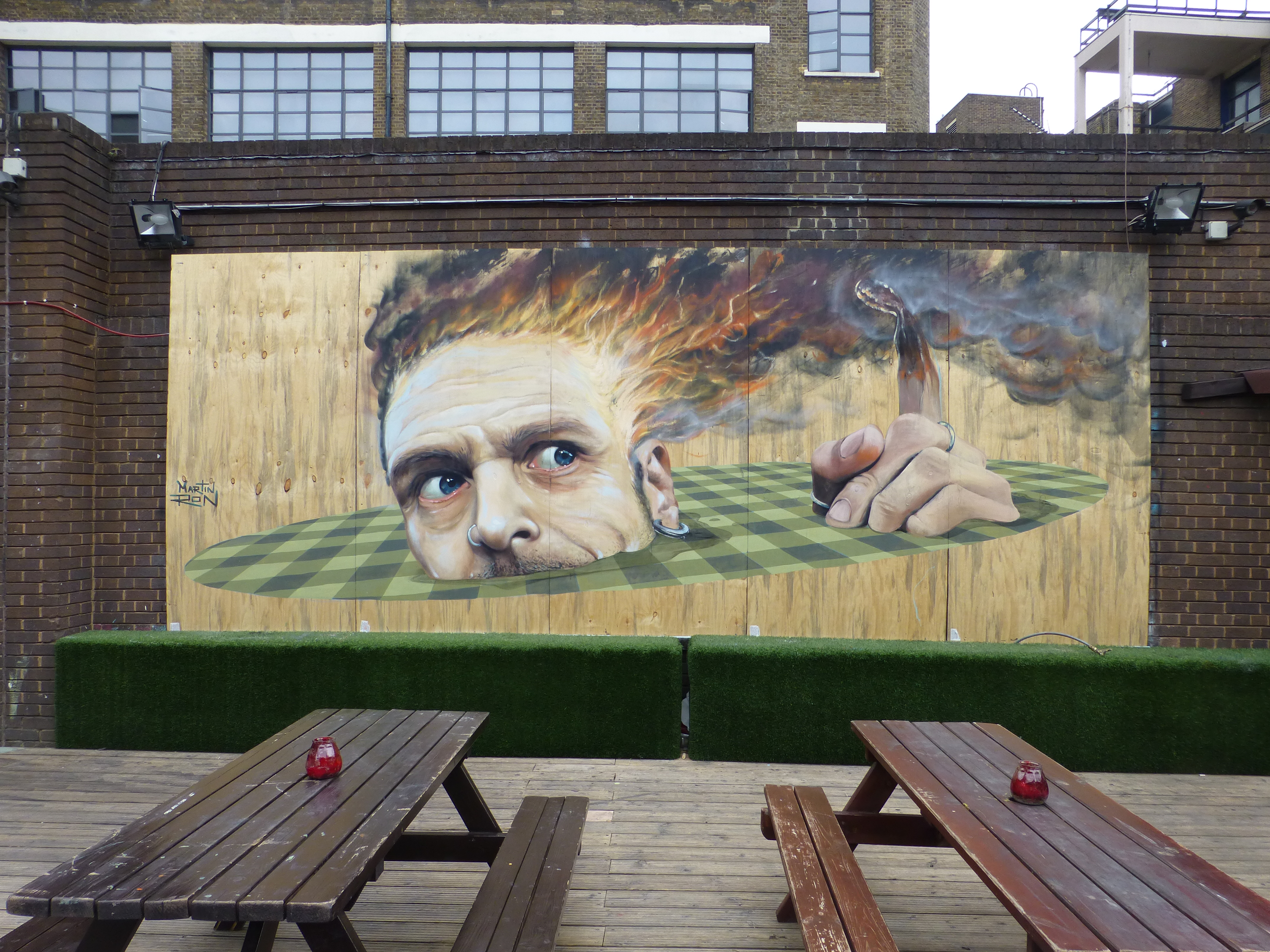 The piece depicts a mans head set in a circular checkerboard pattern, which is a recurring style in Martin Ron’s works, and additionally in this case really adds to the 3D effect in the piece. The top of the mans head is in flames, which relates to a common theme in his murals, depicting the relationship between humans and the systems which control our lives, portraying a loss of reality through over complication in trying to rule the world around us. In this piece the dominant mail figure appears to have overloaded and burst into flames, having succumbed to the pressure of these elements.