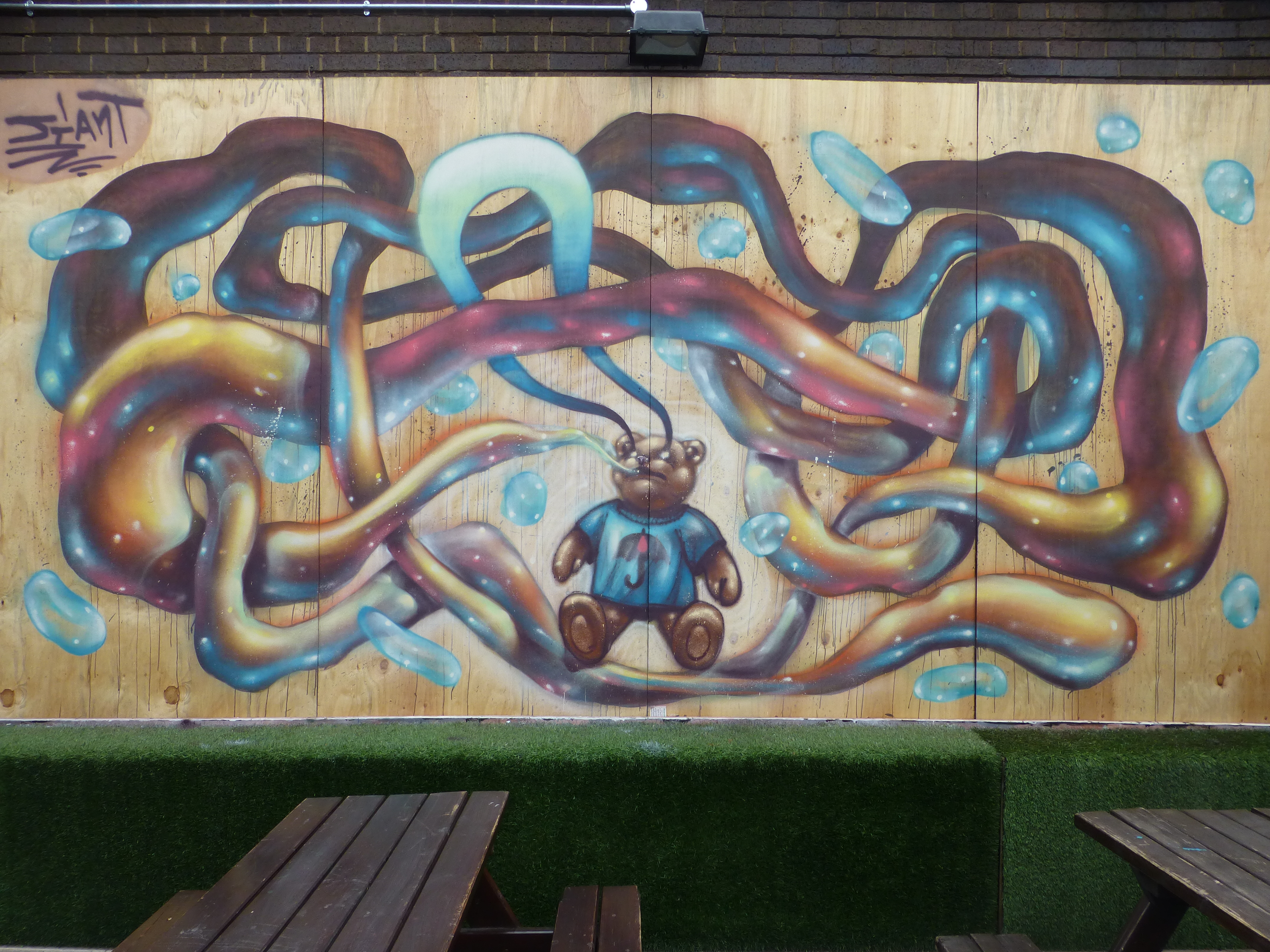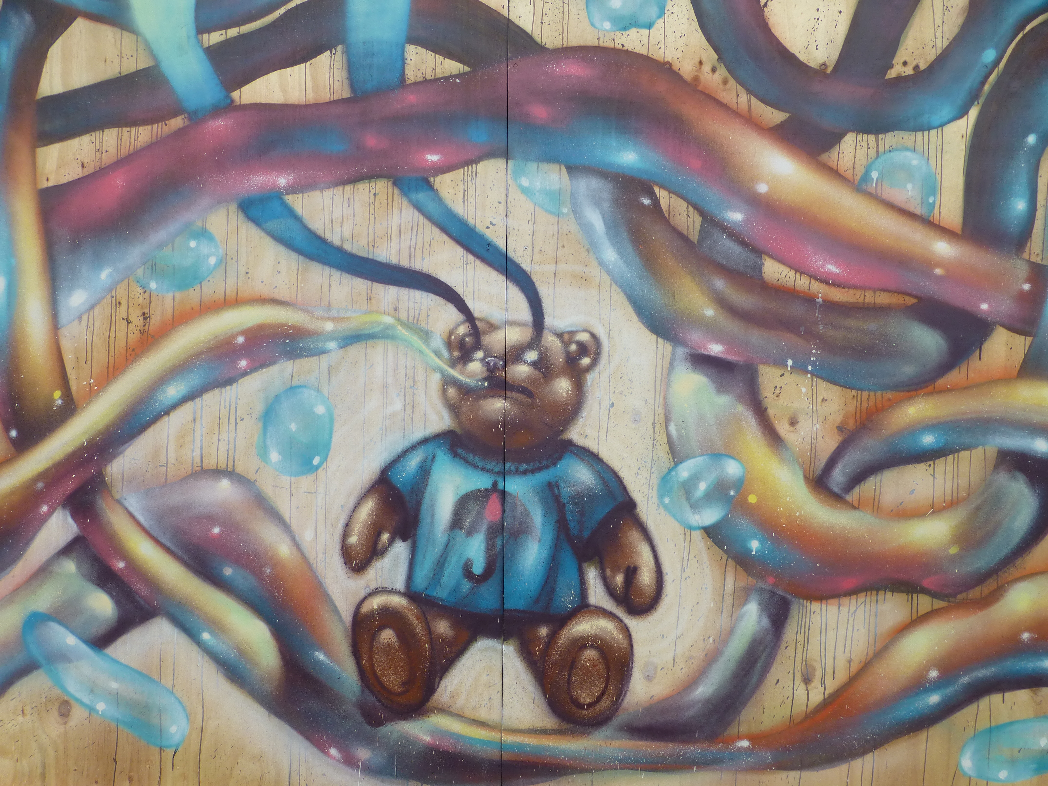 Animals and fantasy driven landscapes are a common theme in Jiant’s works and this piece takes on that basis. Presenting a surreal depiction of a teddy bear which appears to be at the centre of the universe, being powered and simultaneously powering the cosmic energy in its world, with water being the primary element, portrayed through the water droplets and countered by the umbrella design on the bears t-shirt. The piece really generates a sense of eternal energy through the warm hues and the all-round dream like tone and is a pleasure to gaze upon.
