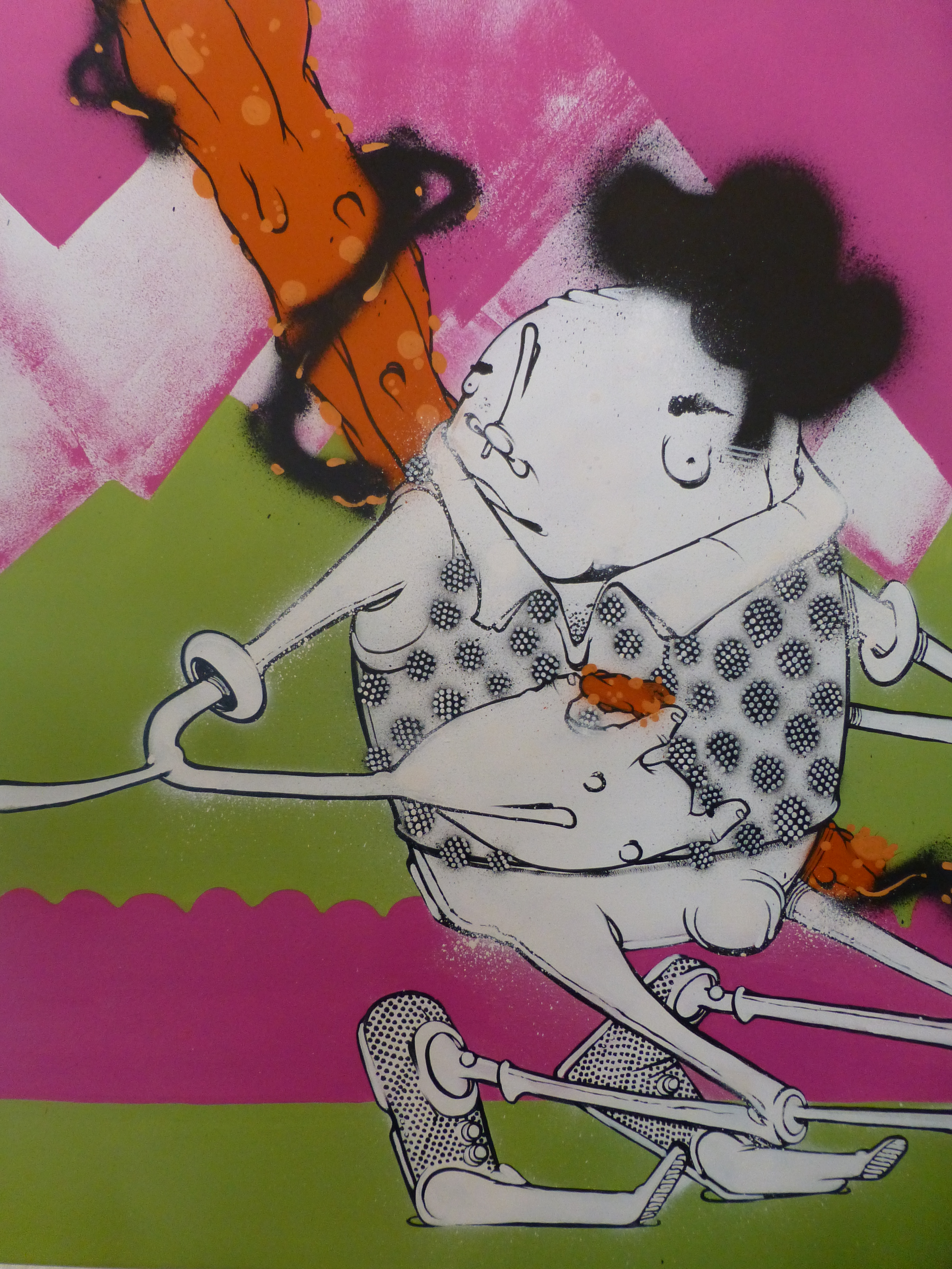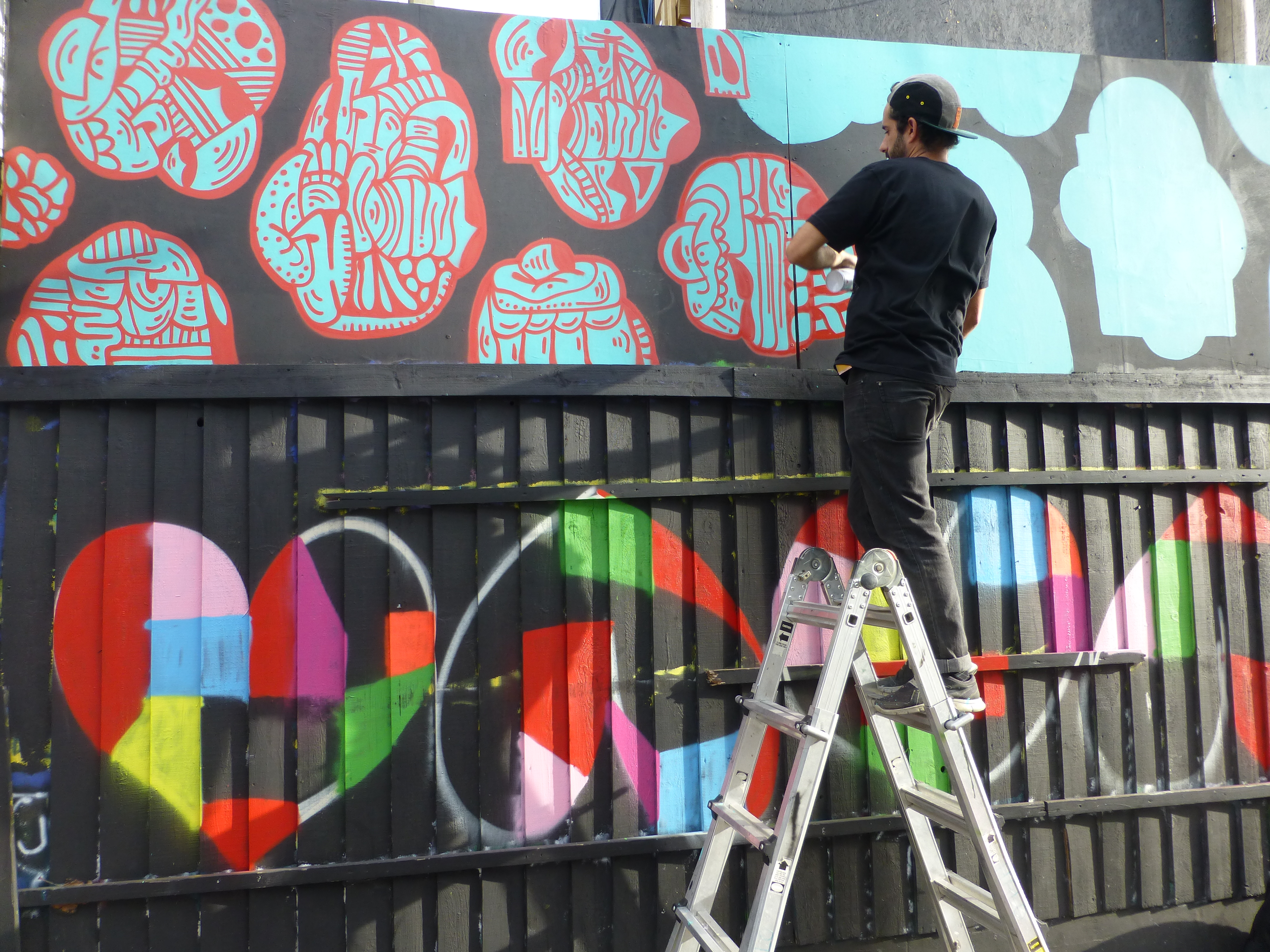 Onio became a Graffiti Writer at the age of thirteen, working with a style of abstract drawings and images made from mixed spray techniques along with water base paint. His abstract and colourful works are set to depict the urban chaos he has witnessed in his native Brazil.