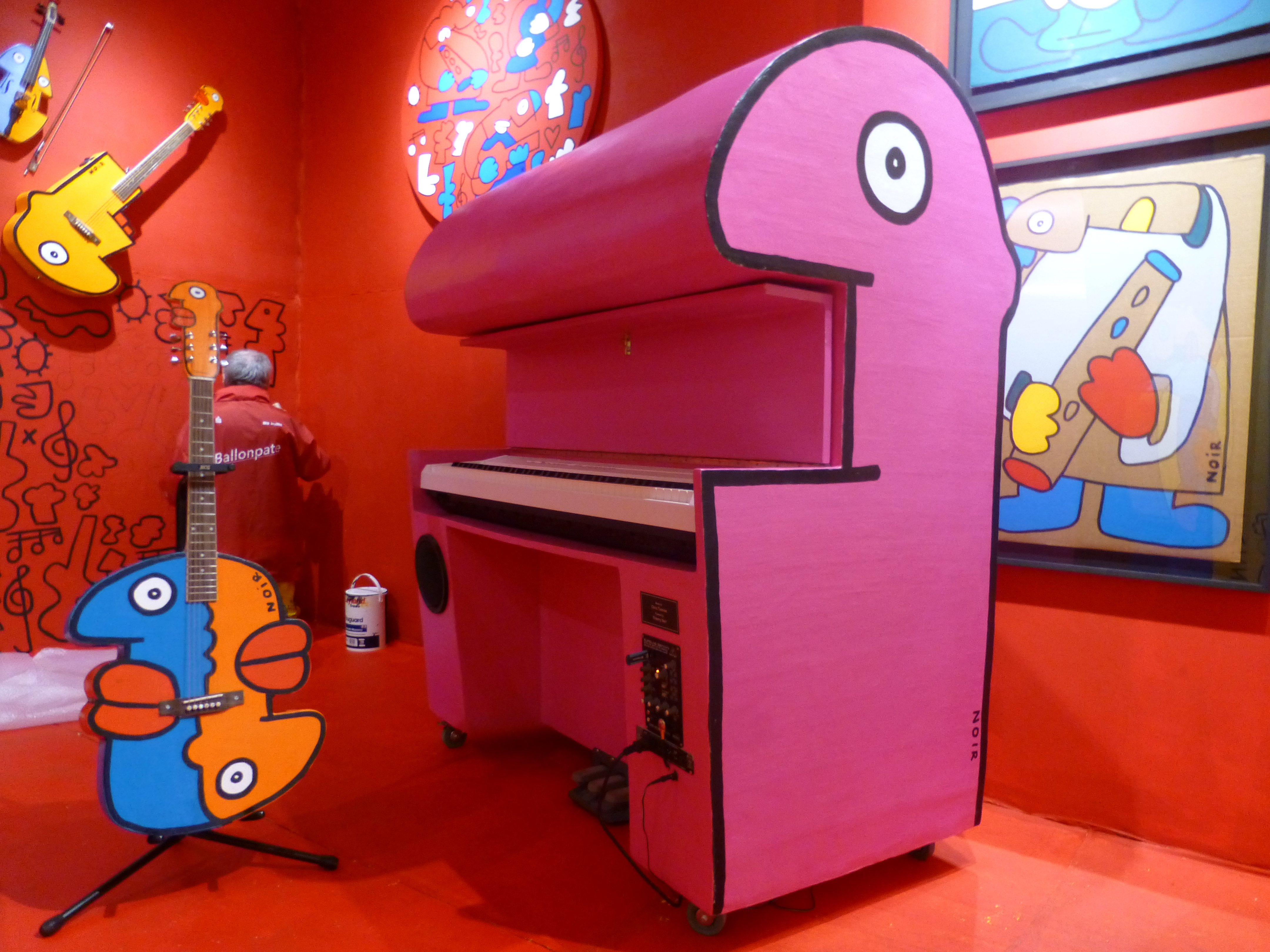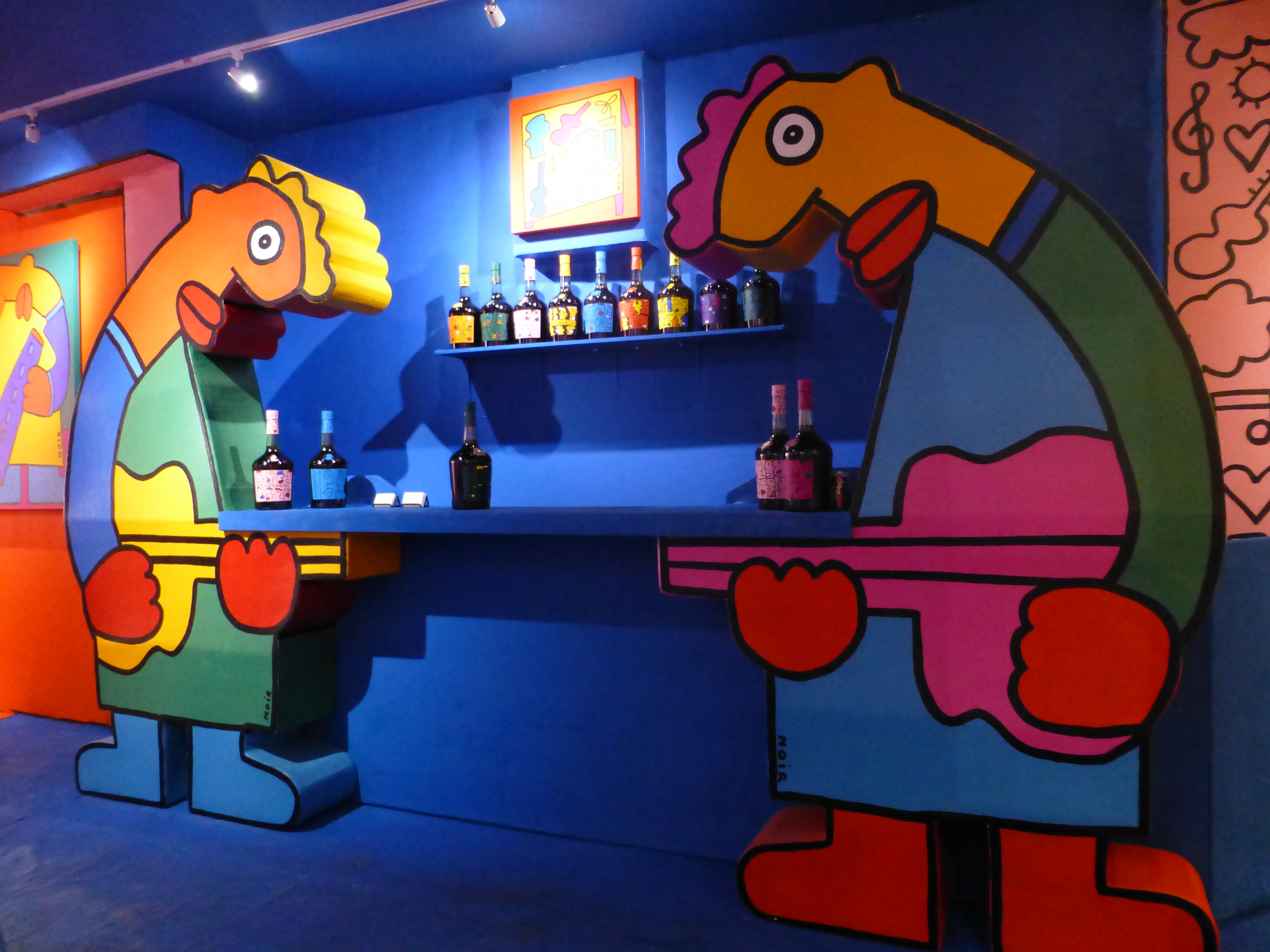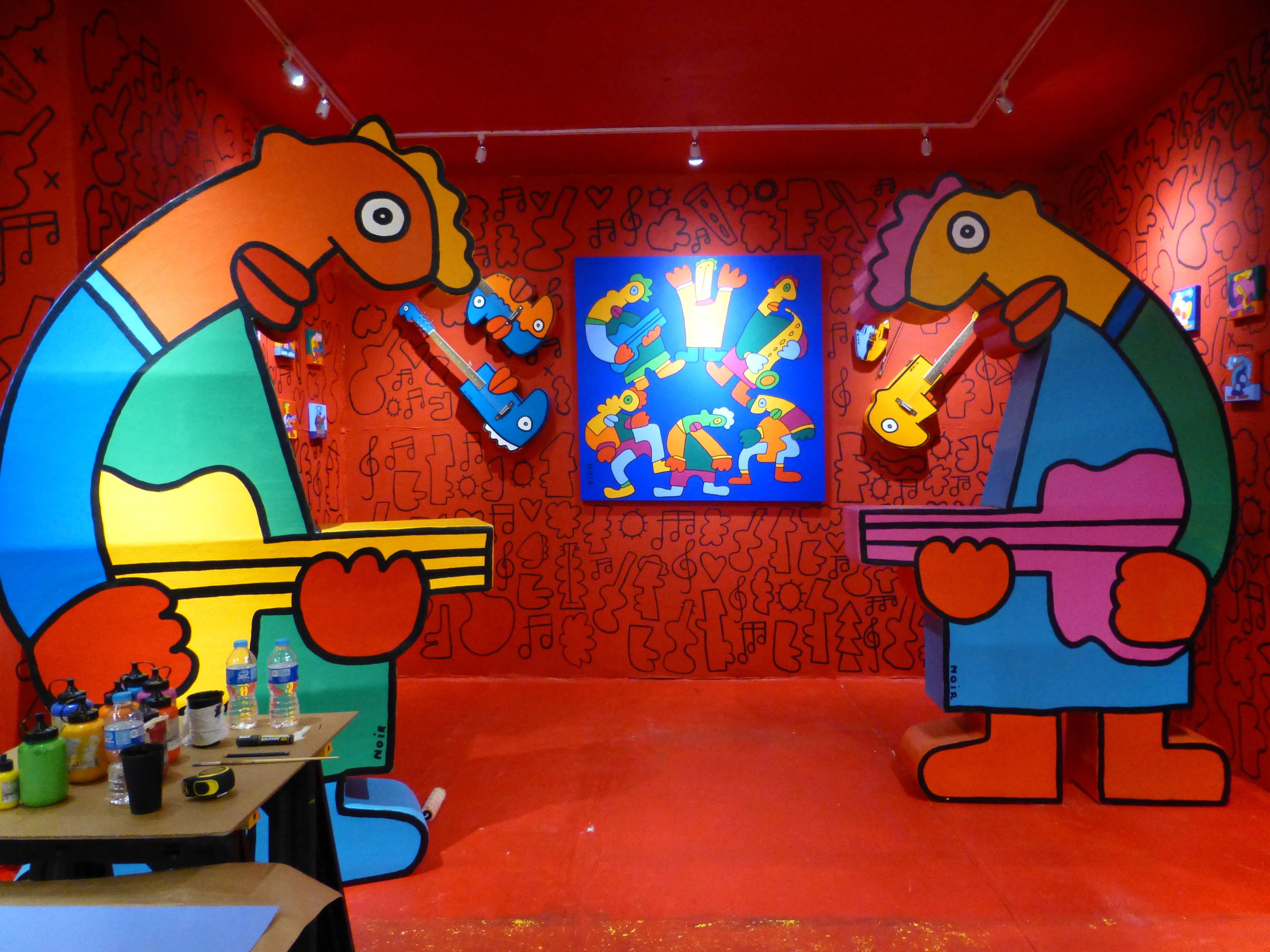 For the exhibition Thierry Noir has taken over all the available space in the Howard Griffin Gallery to generate an fully rounded experience with his bright and dominating installation. The works confront you everywhere you turn, reminiscent of Thierry’s Noirs output in Berlin in the 1980’s. Accompanying the many paintings produced by Noir for the show there are also a selection of accompanying large scale sculpture pieces produced in collaboration with Chris Tsonias, who works with discarded materials such as paper and fabric and reworks them into his sculpture works. Which in this case helps add a 3D quality to the all-round sensory experience of the exhibition.