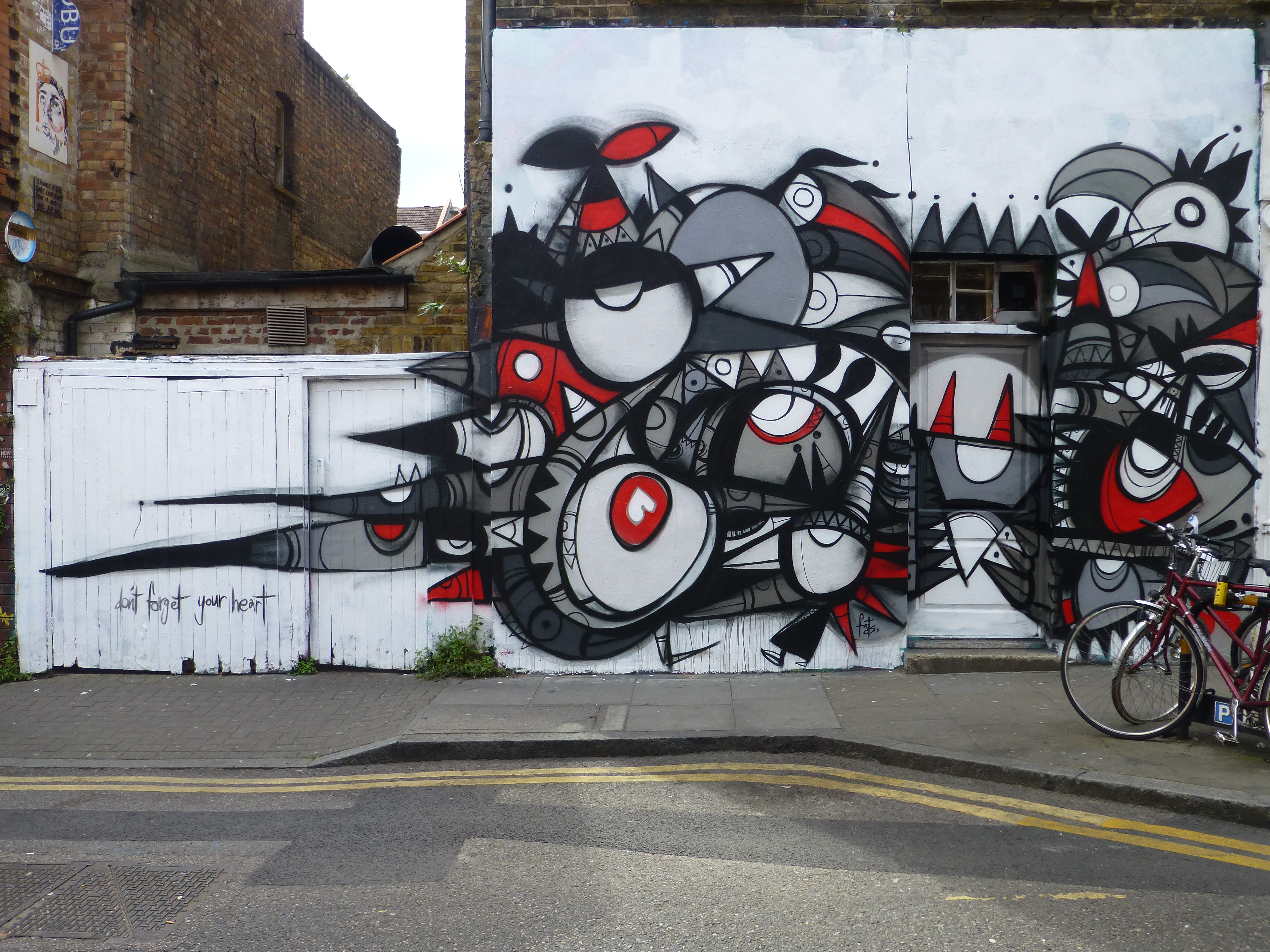 We are playing catch up here, but we really wanted to share this delighful work, which was placed up three works ago. Following her appearance at The Whitecross Street Party, Arabian Street Artist Fathima Mohiuddin, aka Fats, hit up this delightful piece, entitled ‘Don’t Forget Your Heart’, in Hanbury Street. The work was placed up predominantly over a series of three midnight sessions. Born and raised in Dubai, Fathima is of Indian origin and works from Canada. Her distinctive work is defined by her bold and intricate black line works, often accompanied by grey and red. Her work is influenced by her very own cultural ambiguity, infused with ideas on social dynamics and interactions in the city, making for her subtle abstract pieces through which Black dominates speaking for her views on the beauty of darkness. The piece was painted as a part of the Breaking Cover project for this years Shubbak Festival, London’s premier festival dedicated to Arab culture.