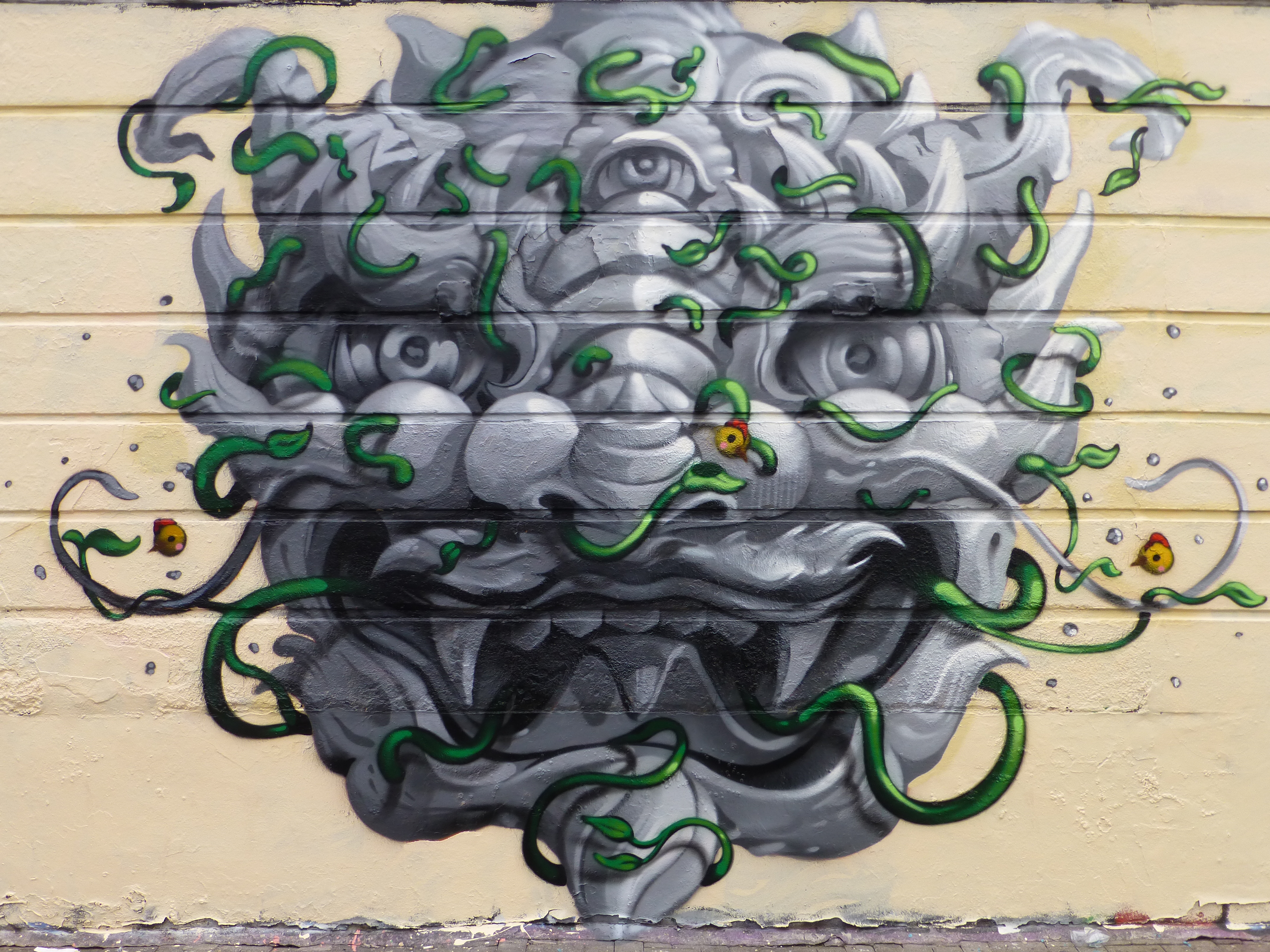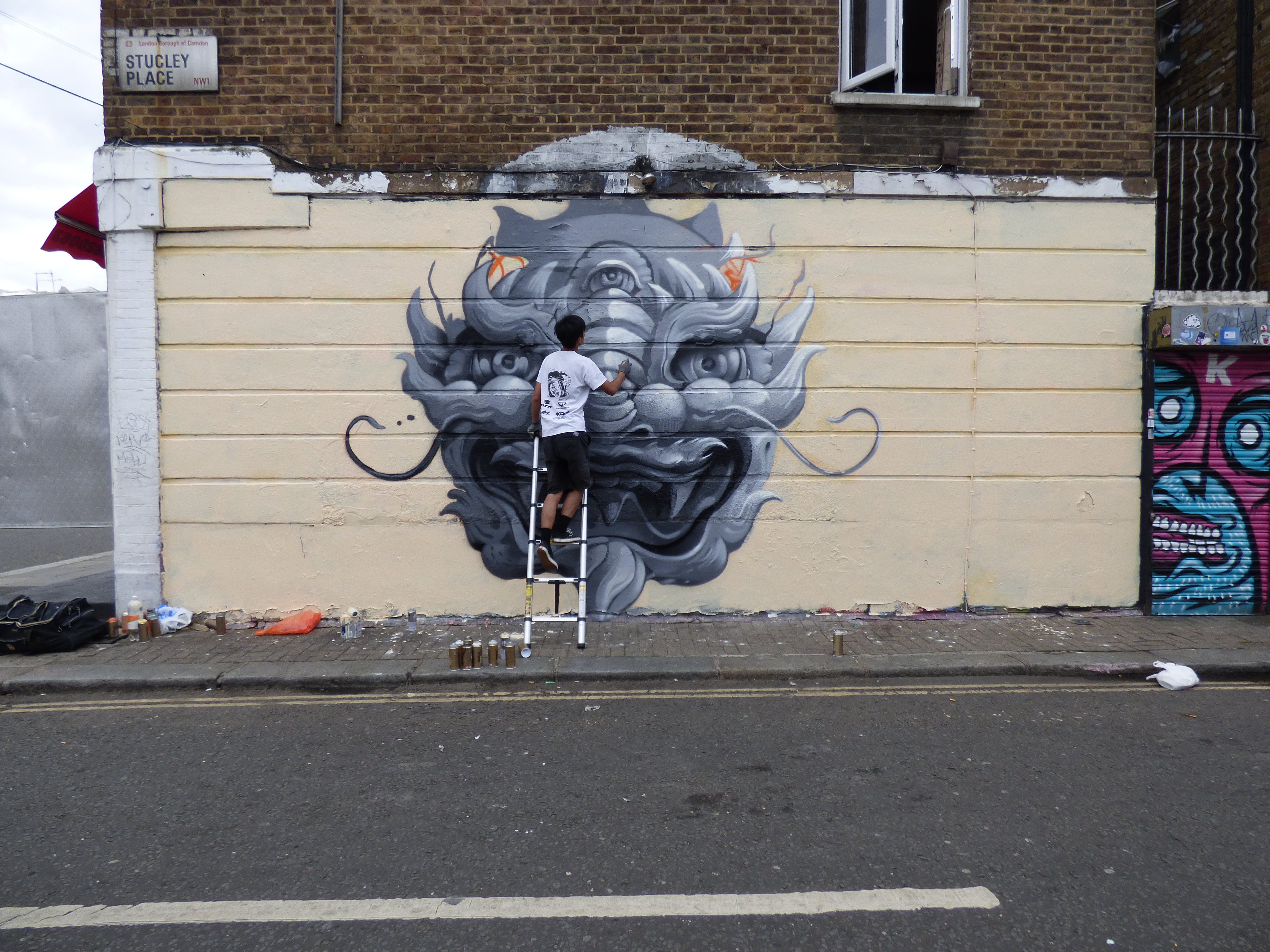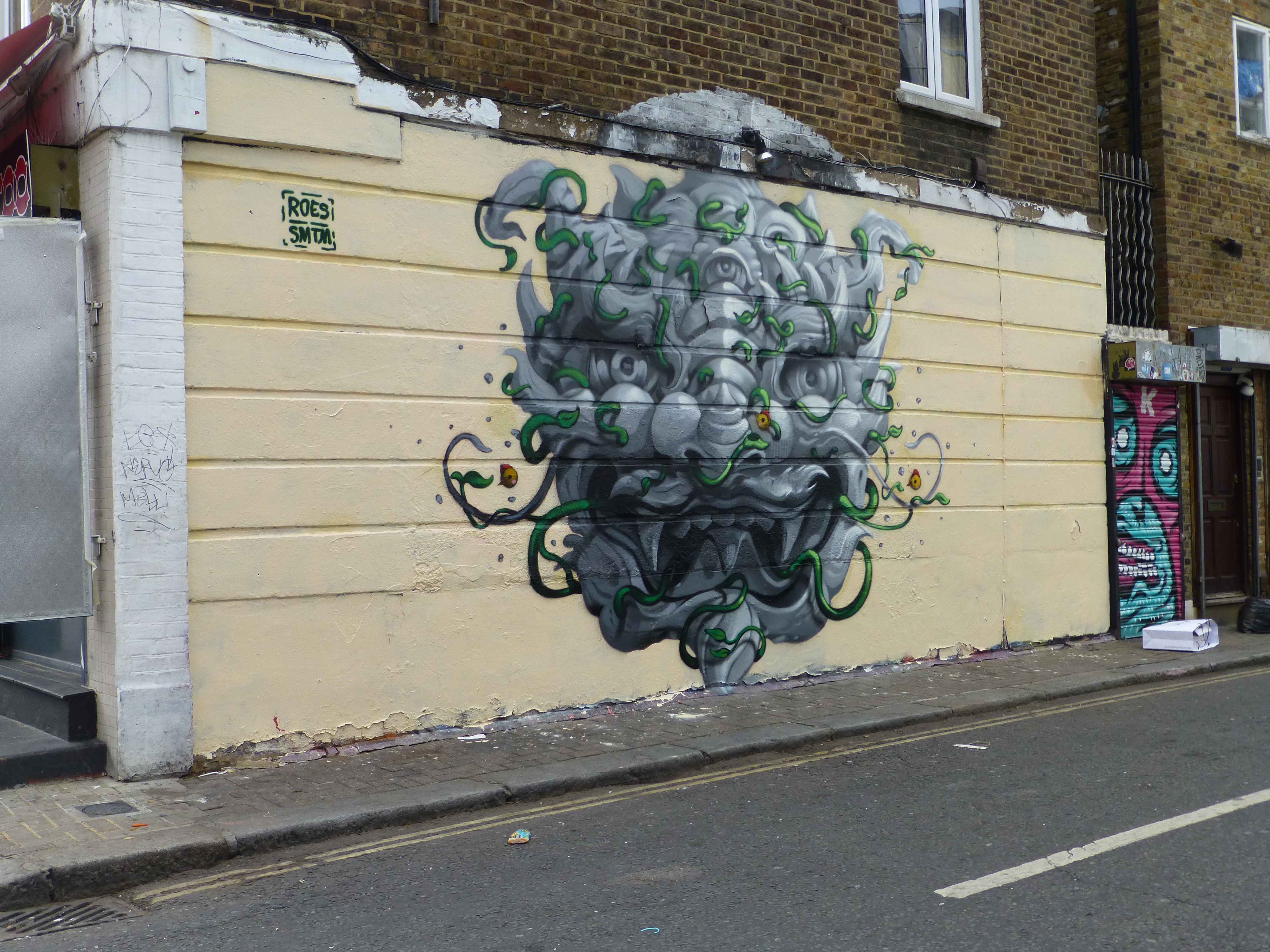 Yesterday in Camden Town Street Artist Roes, from Hong Kong, laid out his first work on his most recent visit to London. The work which was organized by The Hidden Streets Of London and Monoprixx, adorns the wall of Nemesis Tattoos in Stucley Place and features a very apt subject, drawing parallels to a style very prominent and long established in tattoo culture. The piece features a rather striking grey-scale portrait of a Chinese Dragon character embraced by interwoven vibrant green vines. In Chinese culture the Dragon is a symbol of strength, power and good luck and here makes for a welcoming addition to Camden Town’s superb Street Art scene. This piece is most interesting for demonstrating a change of direction in Roes’ subjects, when last year he focused primarily on more surreal character based subjects, of which one is still to be seen on the corner of Old Street and Rivington Street (shared below).