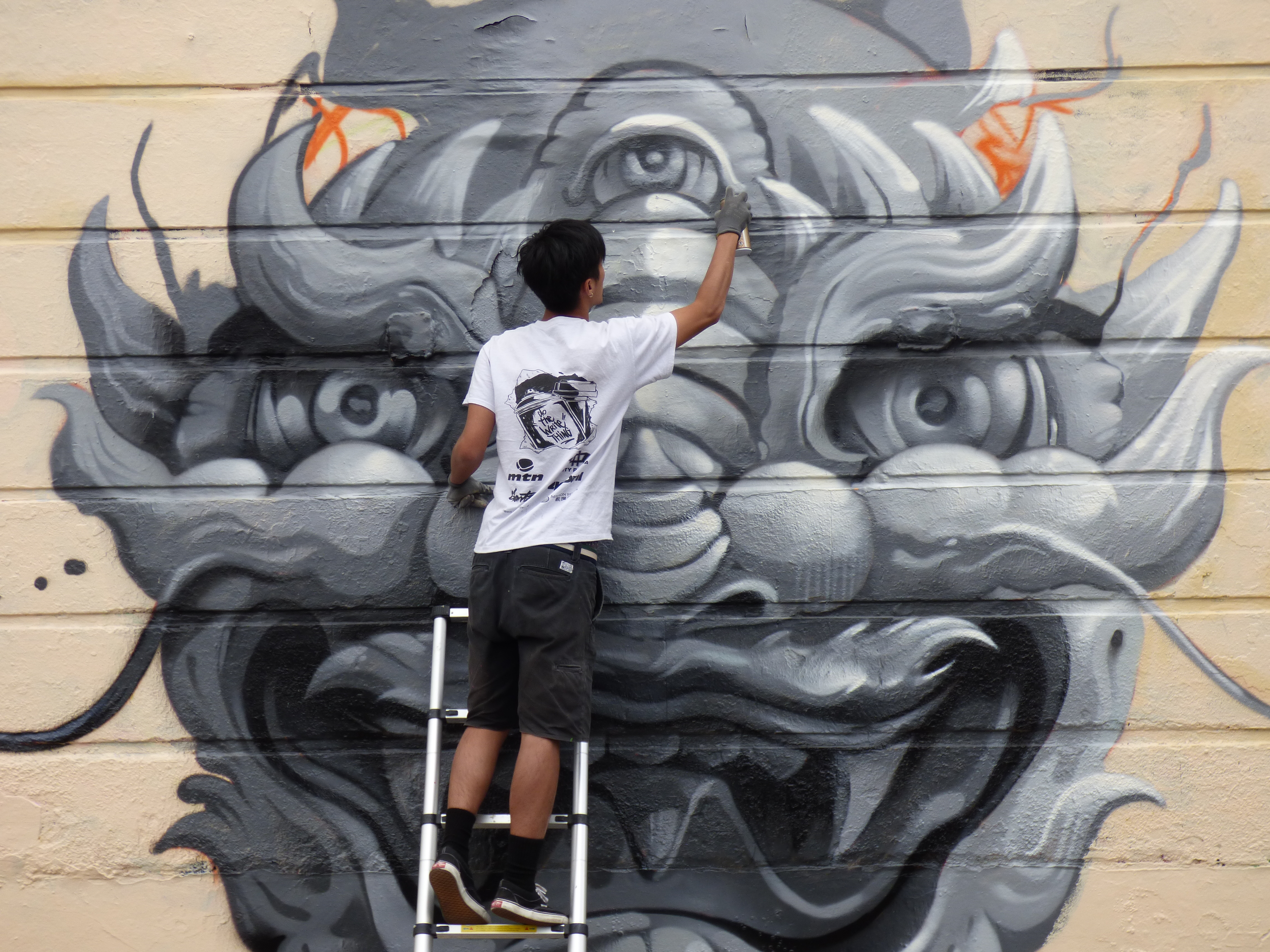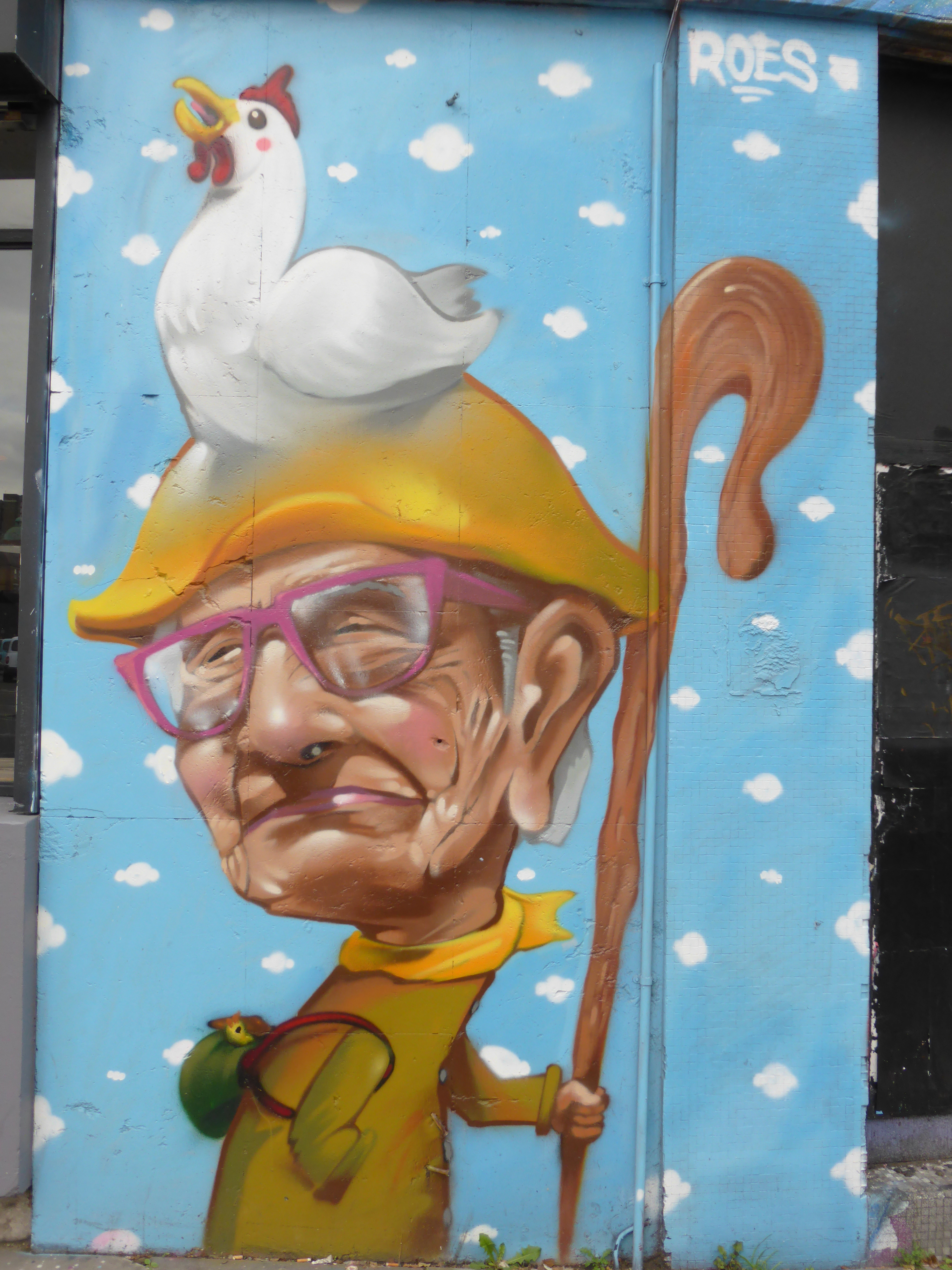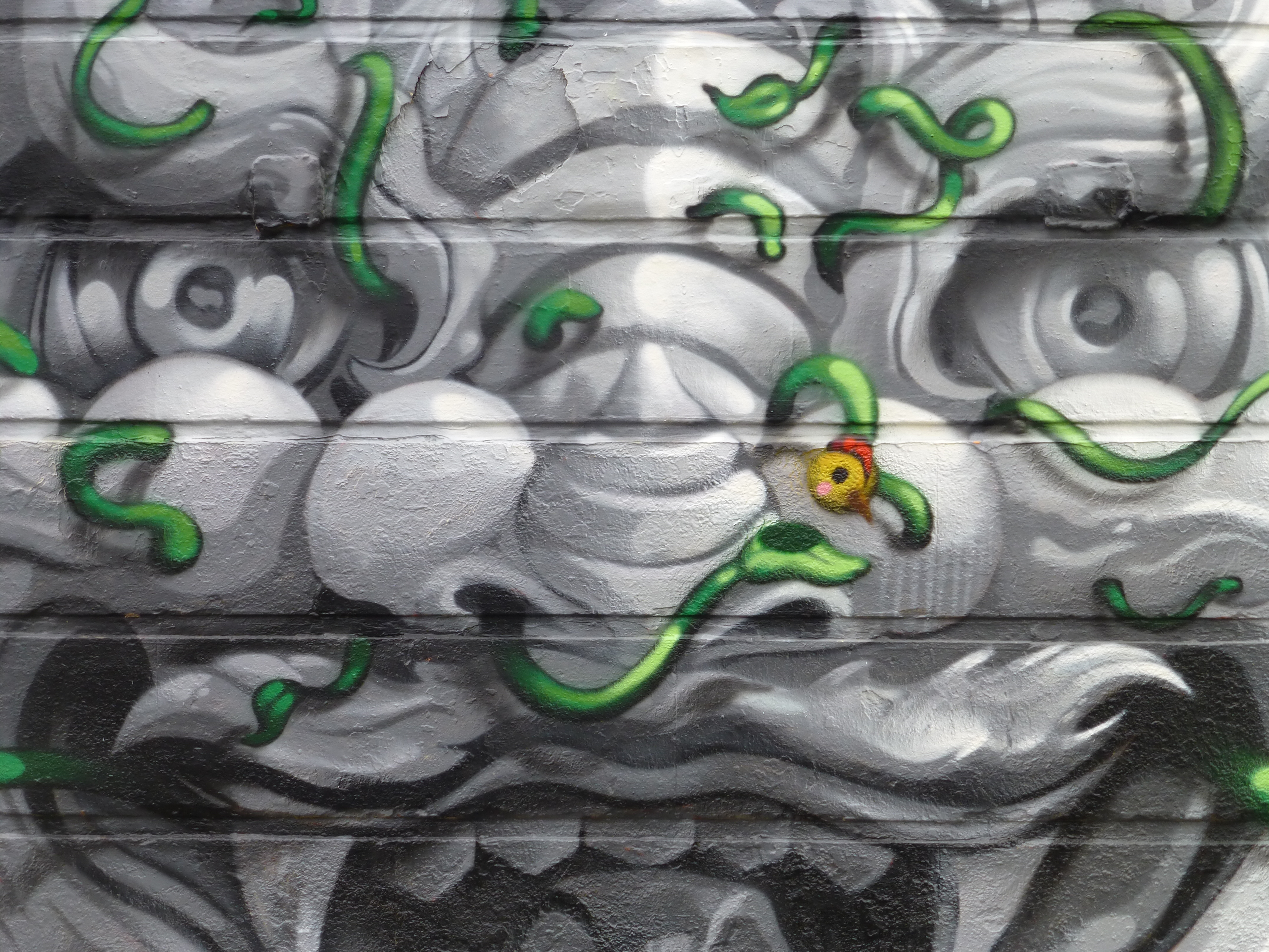 Yesterday in Camden Town Street Artist Roes, from Hong Kong, laid out his first work on his most recent visit to London. The work which was organized by The Hidden Streets Of London and Monoprixx, adorns the wall of Nemesis Tattoos in Stucley Place and features a very apt subject, drawing parallels to a style very prominent and long established in tattoo culture. The piece features a rather striking grey-scale portrait of a Chinese Dragon character embraced by interwoven vibrant green vines. In Chinese culture the Dragon is a symbol of strength, power and good luck and here makes for a welcoming addition to Camden Town’s superb Street Art scene. This piece is most interesting for demonstrating a change of direction in Roes’ subjects, when last year he focused primarily on more surreal character based subjects, of which one is still to be seen on the corner of Old Street and Rivington Street (shared below).