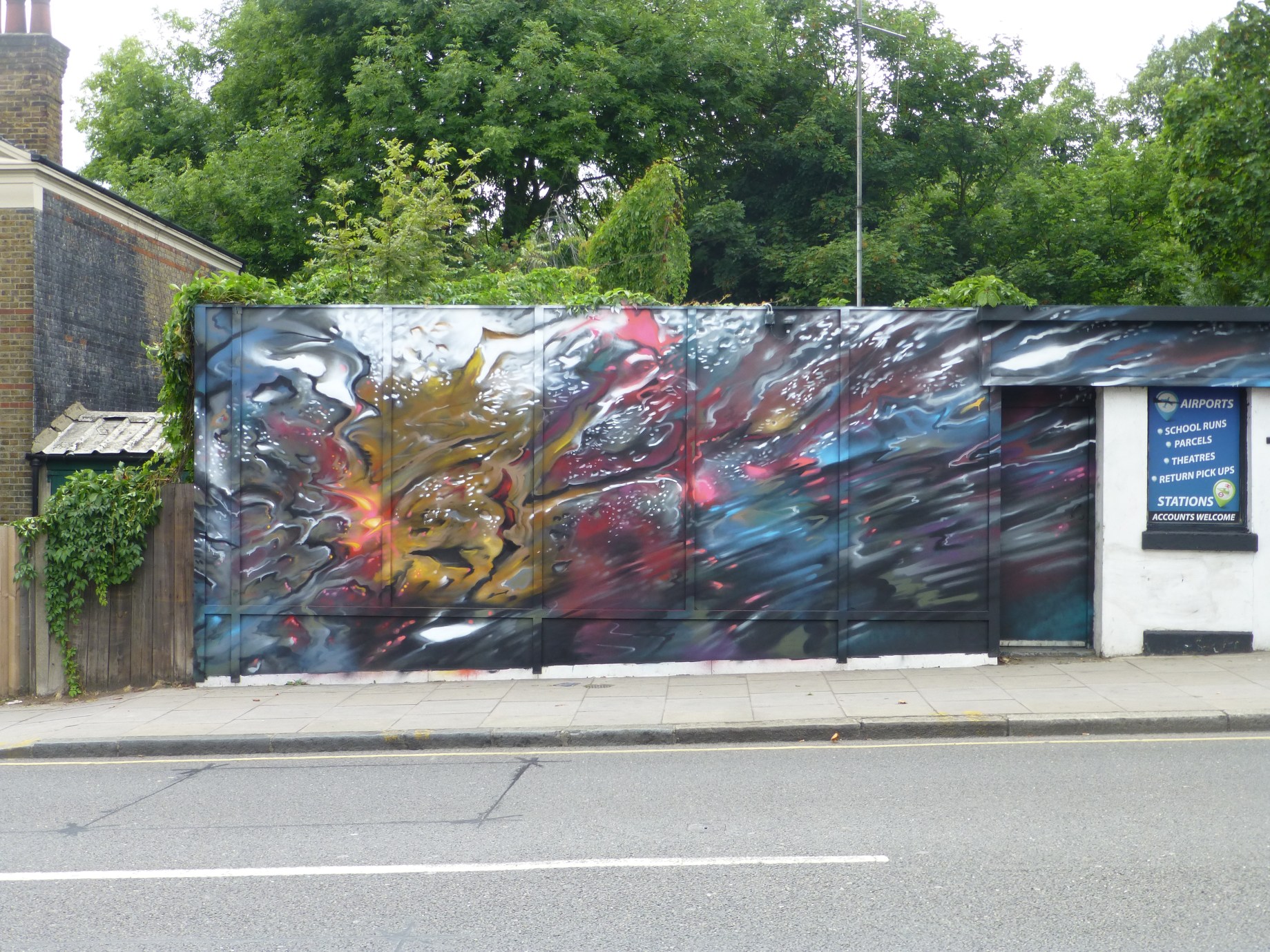On Saturday Dan Kitchener was at work in Tufnell Park, Islington, on his latest work entitled ‘Hyperspeed’, replacing a work Dank placed up in the same spot some four months ago (covered here). The piece which can be found along Junction Road is superb and most interesting for featuring a new twist on Dank’s formiddable ‘Liquid Lights’ style by offering up on this occasion a daytime depiction. The work is certainly intricate and as always with his works, absorbing, a real pleasure to see and interesting to see a glimpse of the new directions this Street Artist may travel yet.