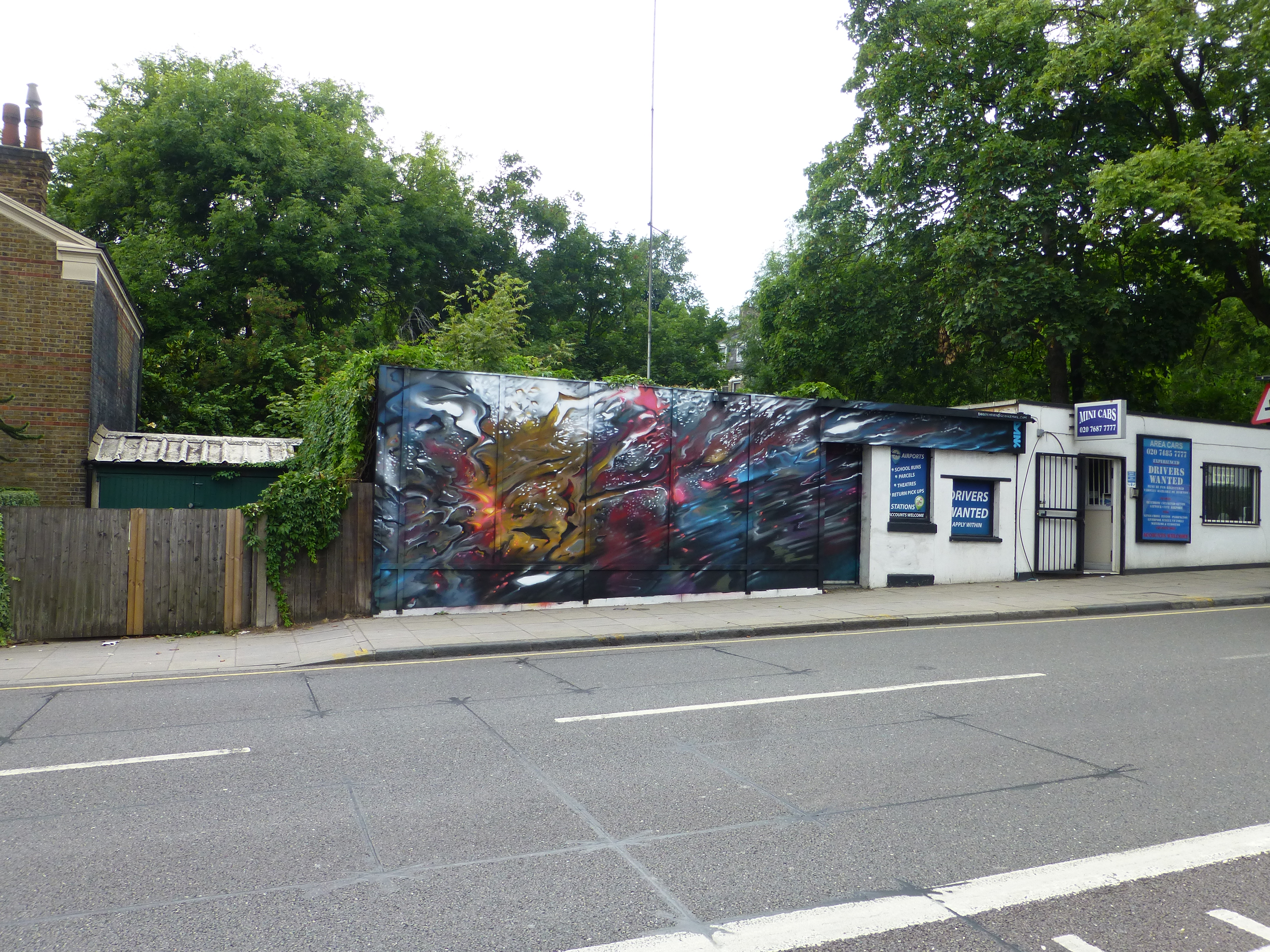 On Saturday Dan Kitchener was at work in Tufnell Park, Islington, on his latest work entitled ‘Hyperspeed’, replacing a work Dank placed up in the same spot some four months ago (covered here). The piece which can be found along Junction Road is superb and most interesting for featuring a new twist on Dank’s formiddable ‘Liquid Lights’ style by offering up on this occasion a daytime depiction. The work is certainly intricate and as always with his works, absorbing, a real pleasure to see and interesting to see a glimpse of the new directions this Street Artist may travel yet.