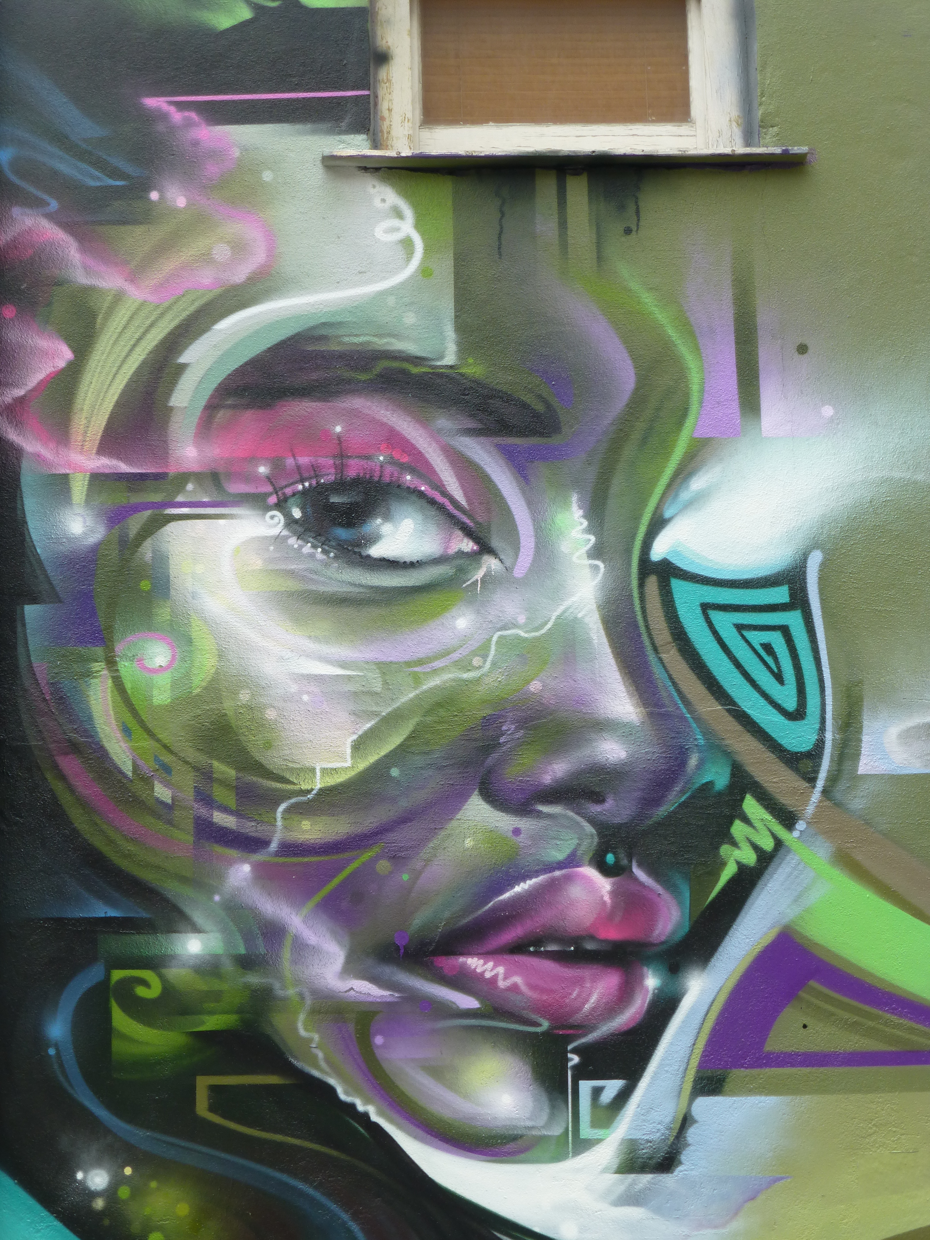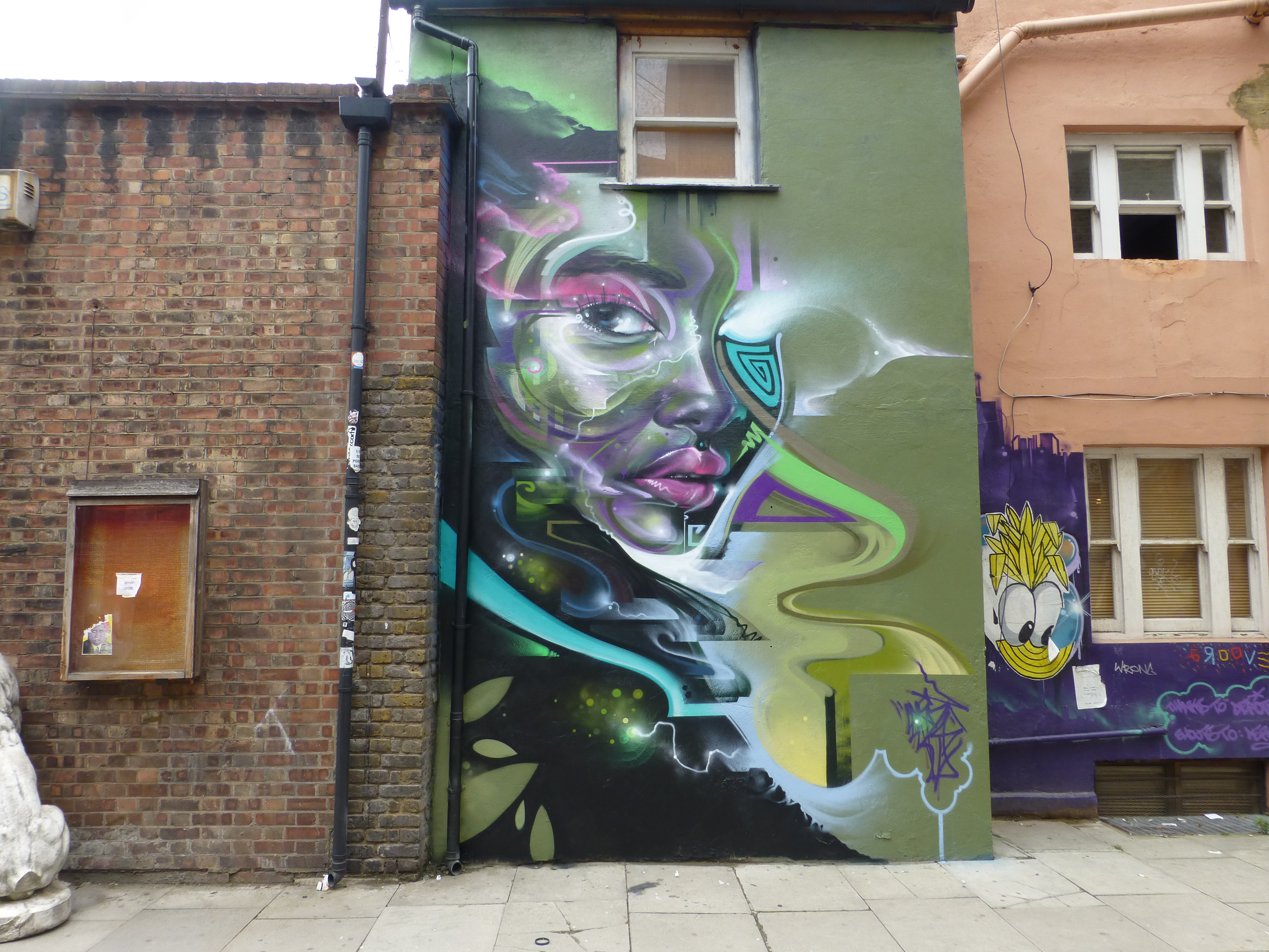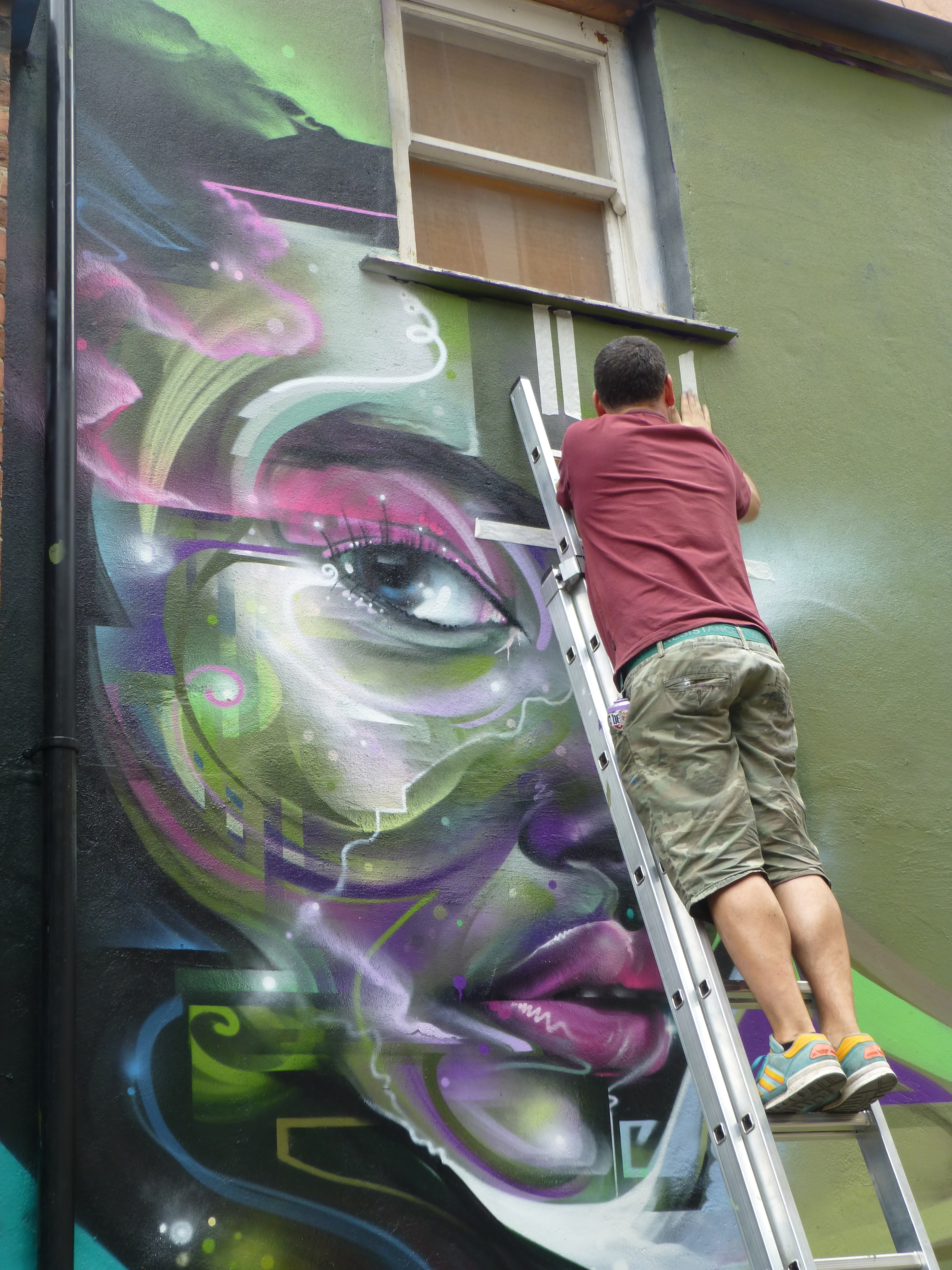 Yesterday in Shoreditch Mr Cenz was at work laying out, what is now his fourth piece in this same spot in Whitby Street. It’s been a year since Mr Cenz altered this piece (the previous wall is shown below) and he decided it was time for a freshen up, reversing the colour presence in the process, from a purple driven theme aided by green, to a green focused work complimented by purple. You can also see how Mr Cenz’s characters have developed in the last year, taking on a more translucent and celestial presence in their depiction.