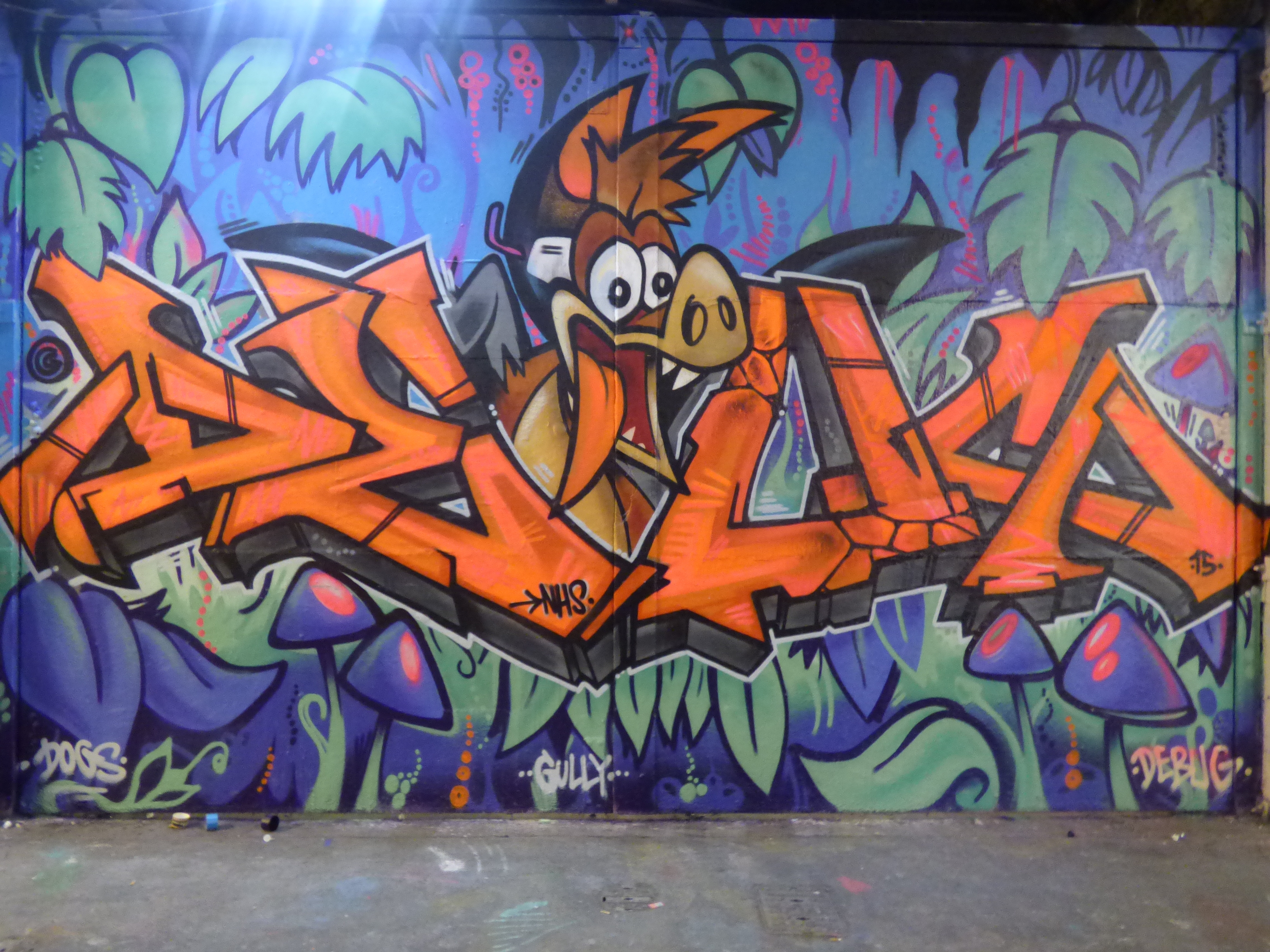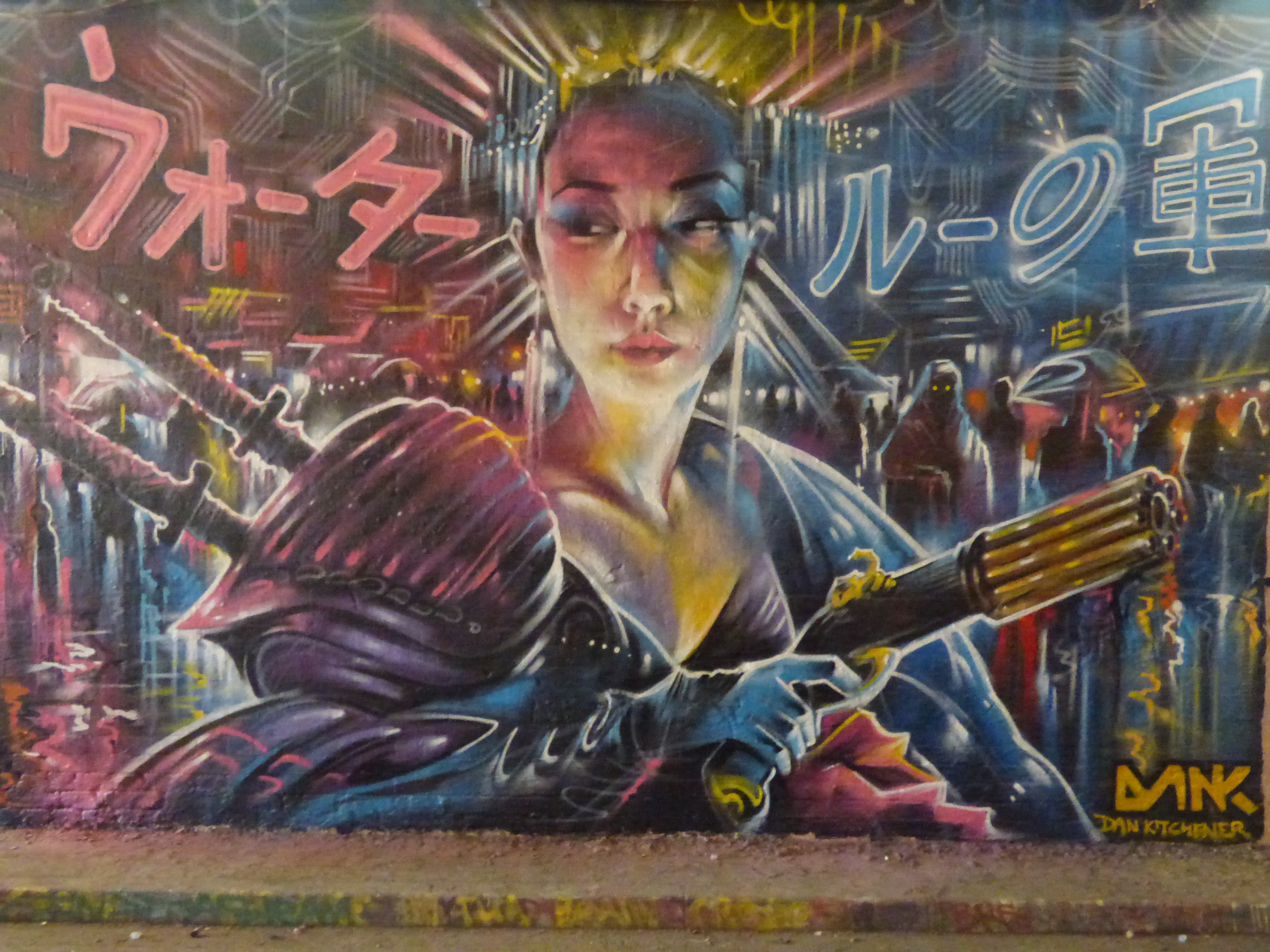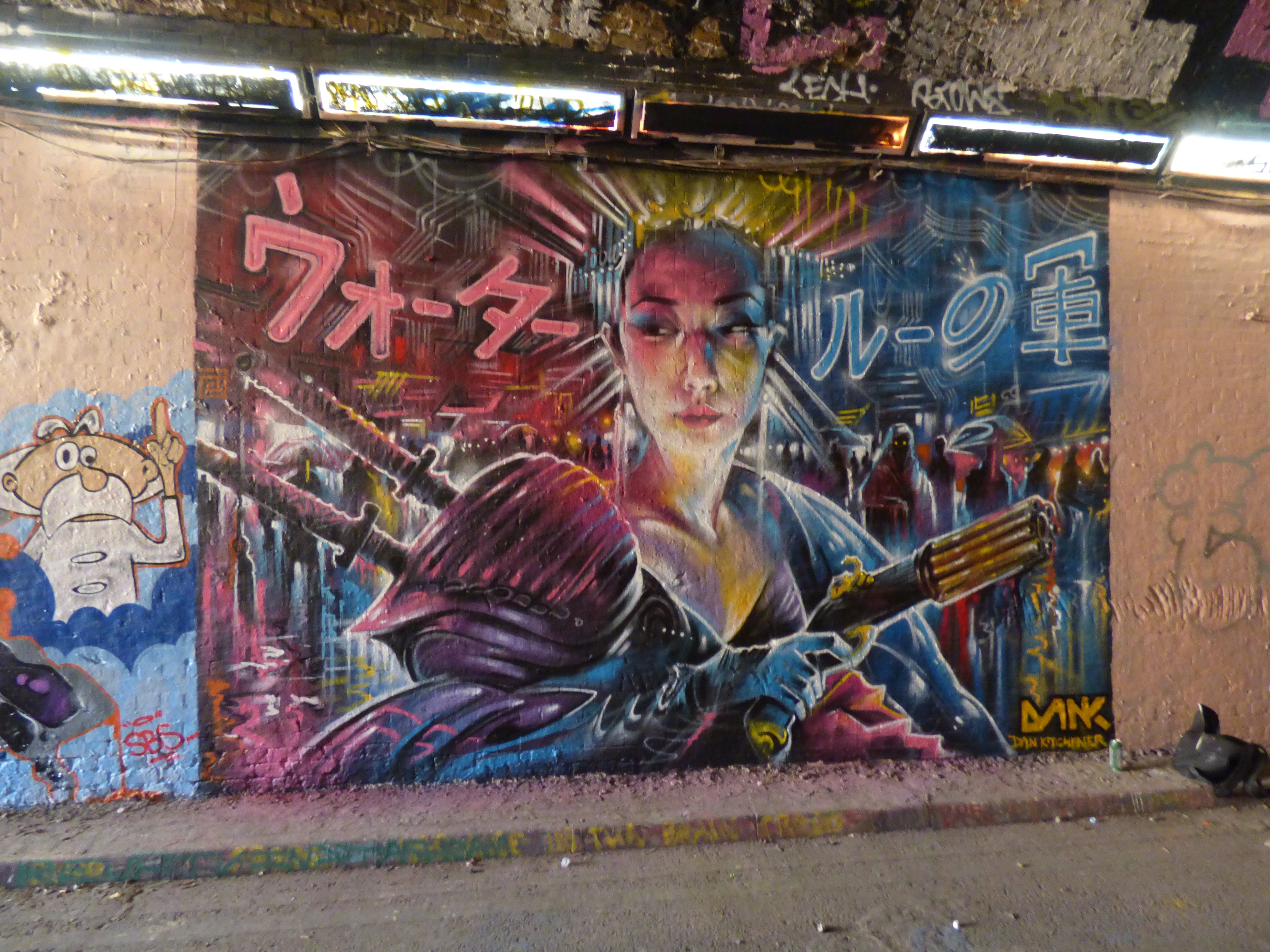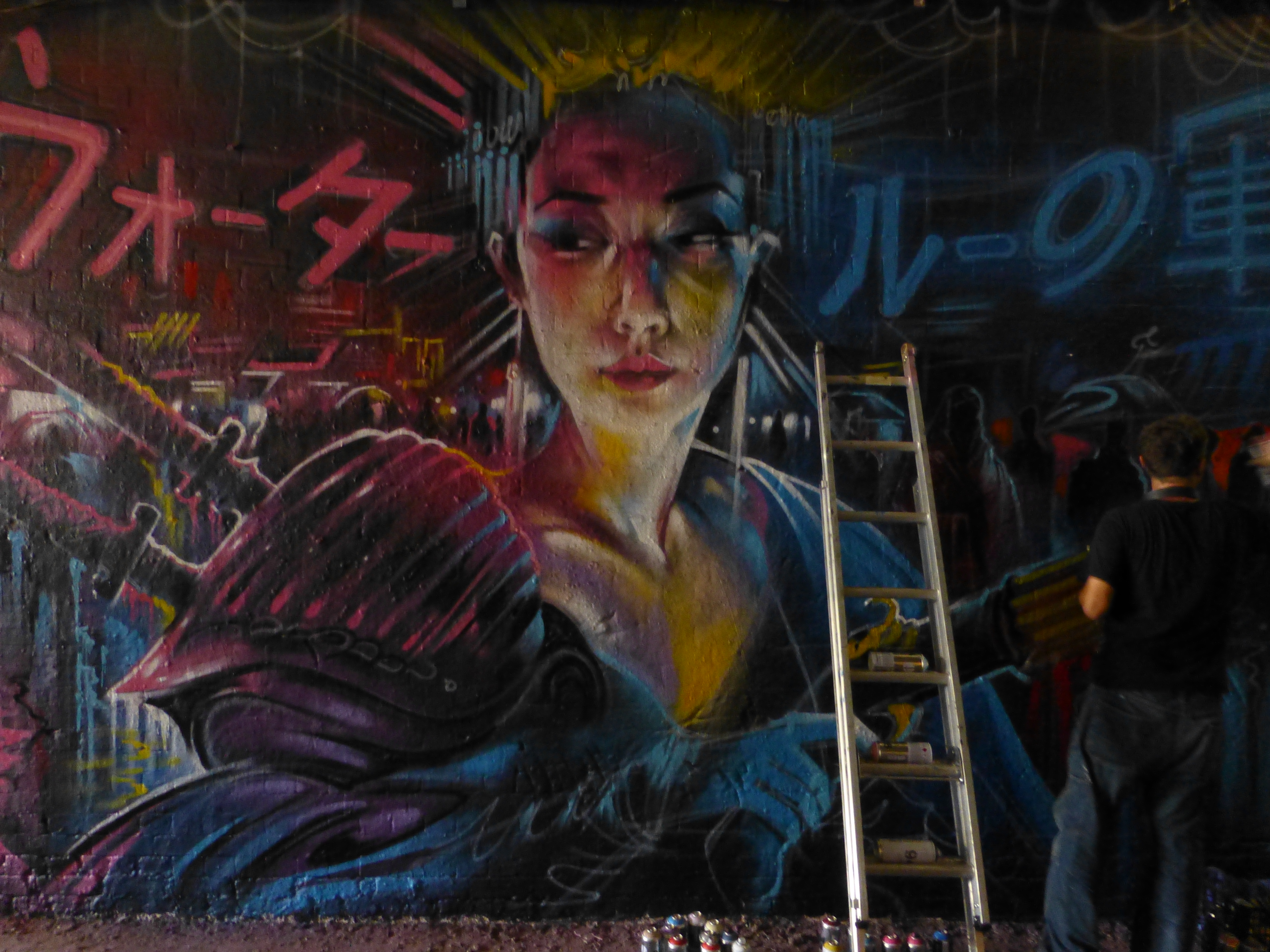Standout work by Dan Kitchener, laying out the highlight of the event for us, admittedly somewhat further removed from the graffiti focus of the event, but just outstanding, hitting up the largest piece of the event, with superb character work and the Japanese text reads ‘Battle of Watterloo’, a very nice touch and certainly the only artist to offer Japanese letters on the day.