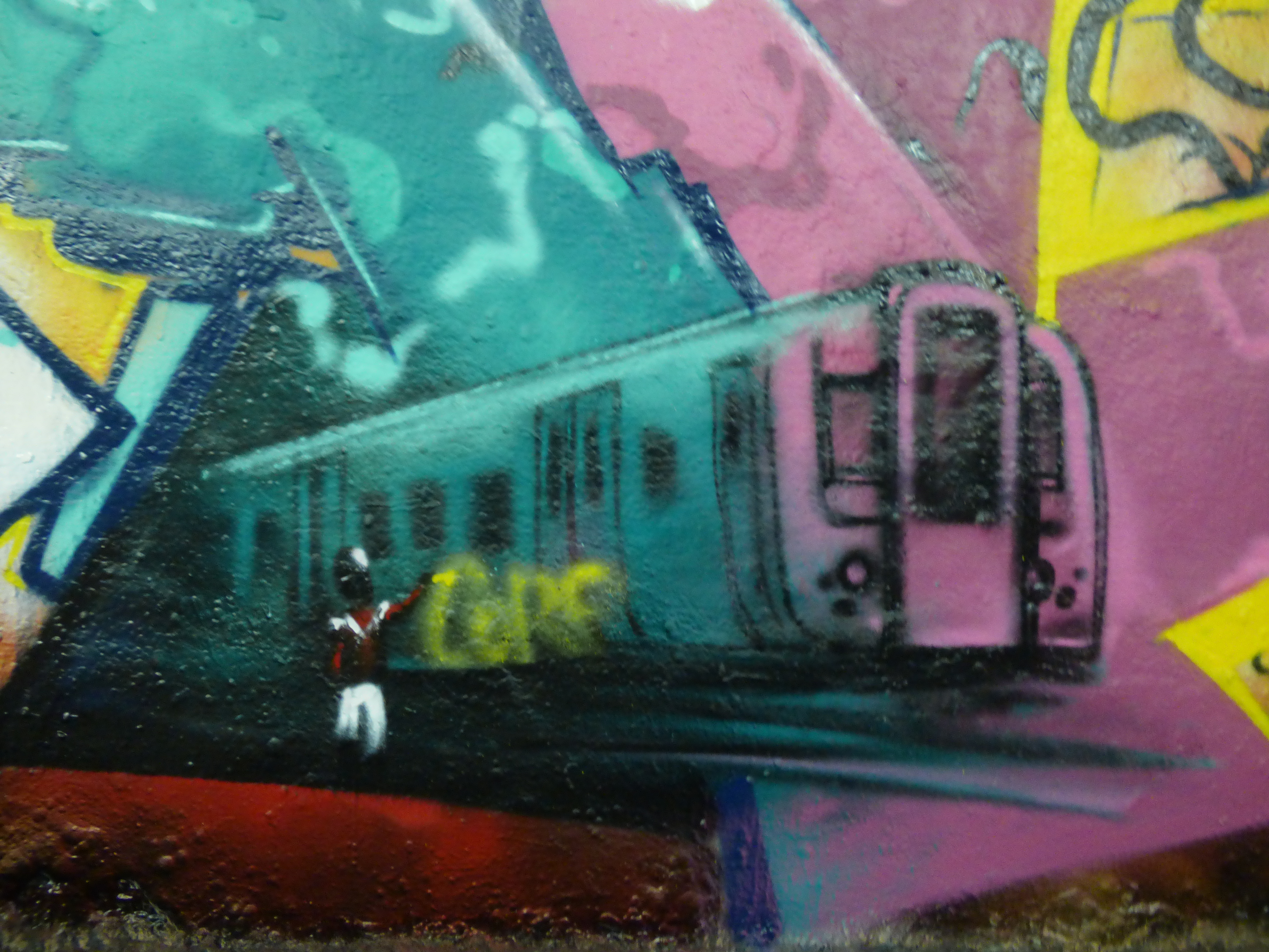 Detail of work by Core246, depicting a British soldier tagging a train.