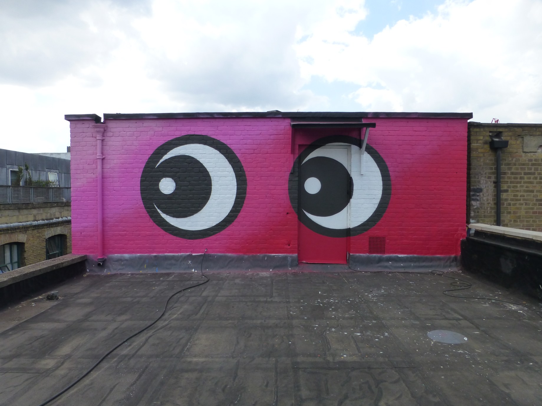 The Jealous Gallery has a new piece on their roof’s feature wall as a part of the ongoing Jealous Rooftop Mural Project. This time the work is from the Jealous Gallery’s very own Studio Manager Adam Bridgland, whose work is fundamentally inspired by a uniquely British sense of sentimentality and draws influence from such sources as children’s colouring books, paint by number kits and old public transport posters. Permeating Bridgland’s works are an underlying sense of loss and nostalgia that inhabits our memories. with his works often tinged with a feeling of time having passed too soon, better days gone by or that our memories our gradually fading. It is with such a view that his latest work has been constructed with a pair of larger-than-life cartoon eyes gazing upon the numerous redevelopments occurring around the City of London/Shoreditch area, with parts of London’s old East End swallowed up in the process, this artwork plays witness to these events. Yet again I was fortunate enough to be let up on the roof again by the kind staff of the Jealous Gallery and capture this piece to share with you all.