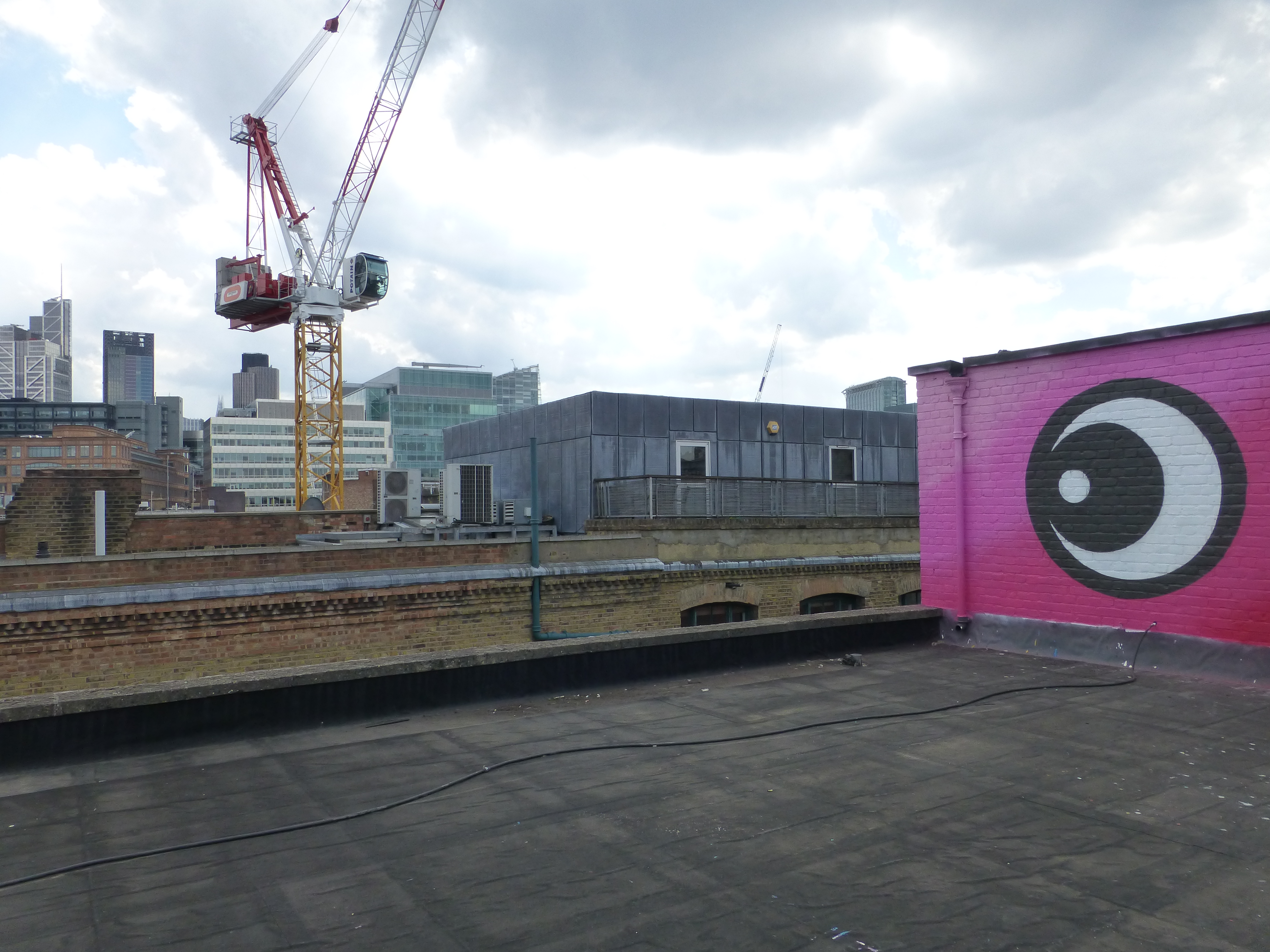 The Jealous Gallery has a new piece on their roof’s feature wall as a part of the ongoing Jealous Rooftop Mural Project. This time the work is from the Jealous Gallery’s very own Studio Manager Adam Bridgland, whose work is fundamentally inspired by a uniquely British sense of sentimentality and draws influence from such sources as children’s colouring books, paint by number kits and old public transport posters. Permeating Bridgland’s works are an underlying sense of loss and nostalgia that inhabits our memories. with his works often tinged with a feeling of time having passed too soon, better days gone by or that our memories our gradually fading. It is with such a view that his latest work has been constructed with a pair of larger-than-life cartoon eyes gazing upon the numerous redevelopments occurring around the City of London/Shoreditch area, with parts of London’s old East End swallowed up in the process, this artwork plays witness to these events. Yet again I was fortunate enough to be let up on the roof again by the kind staff of the Jealous Gallery and capture this piece to share with you all.