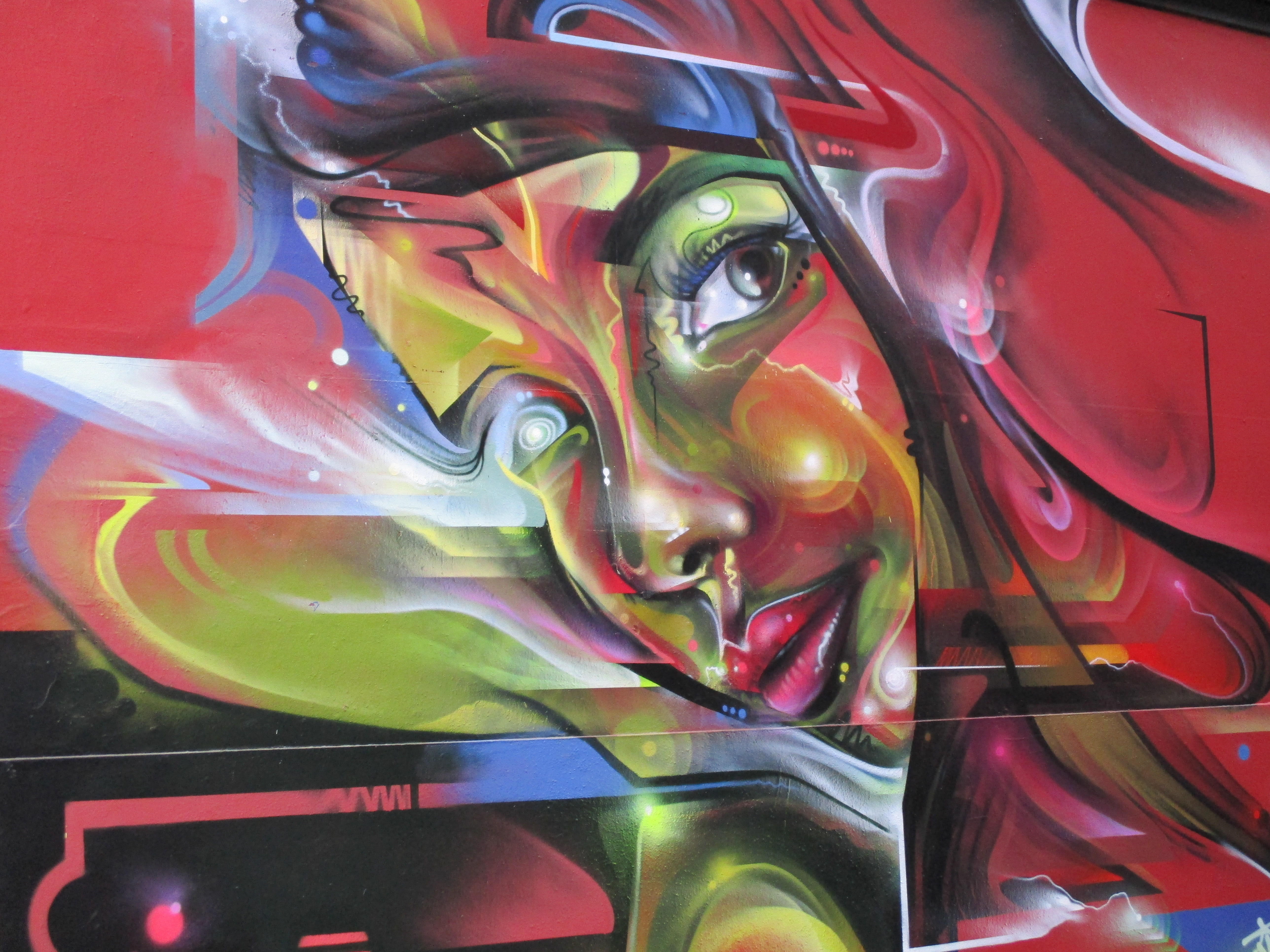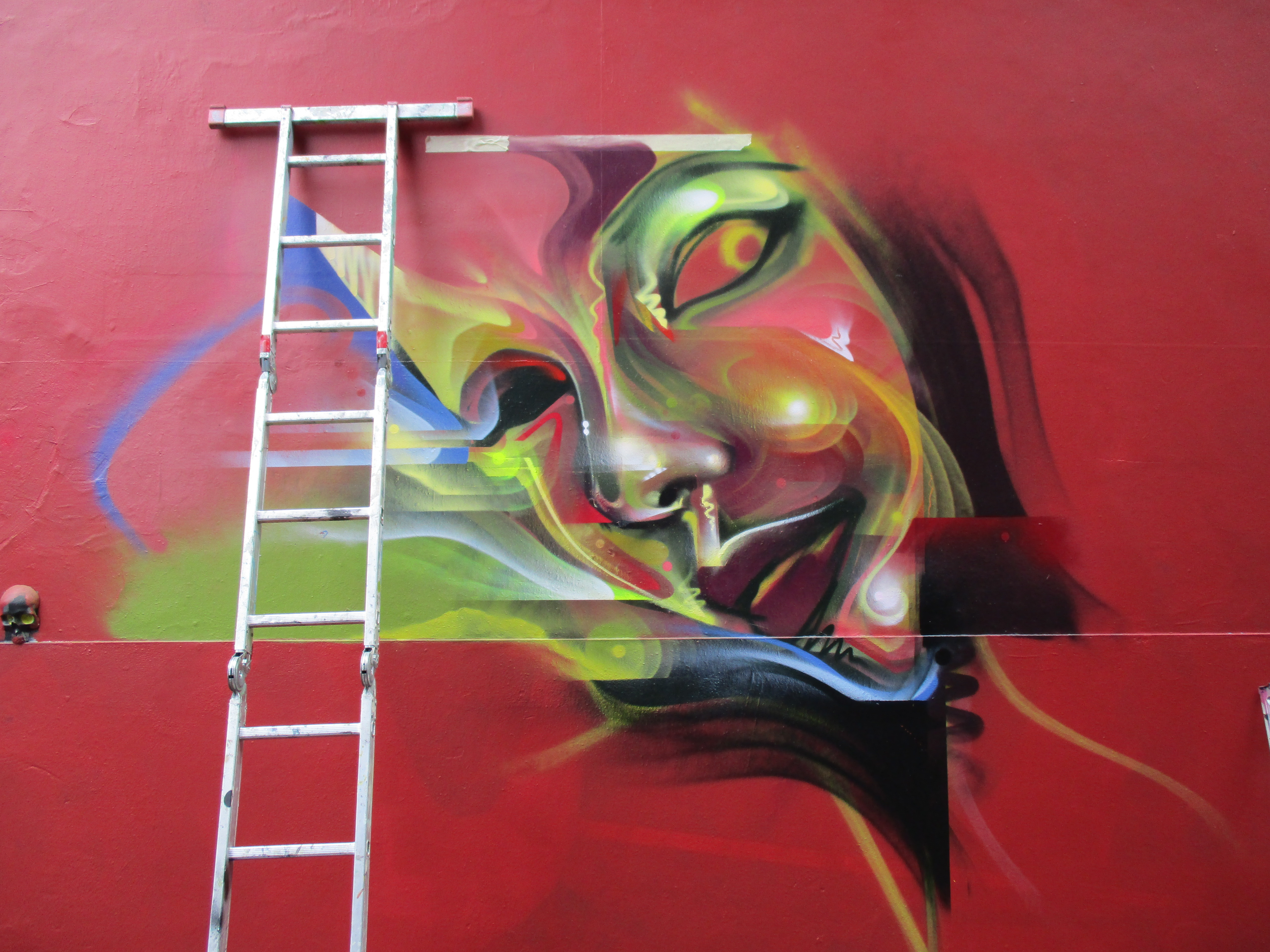 Over Thursday and Friday this week Mr Cenz was in Camden Town in order to lay out his freshest work just off of Camden High Street, put up with support from The Real Art of Street Art. Set to a strong red background Mr Cenz laid out another of his distinctive female portraits imbued with his characteristic sci-fi and cosmic tones, built up with a multitude of colours and shades. Representing an artist at the forefront of the Graffiti/Street Art boundaries, Mr Cenz is an artist who can’t really be categorized by such definitions and continues to evolve as an artist from his letter based works, to these magnificent portraits. It’s always a pleasure to see fresh work from Mr Cenz, all the more so to see how is works just seem to get better and better as time goes by.