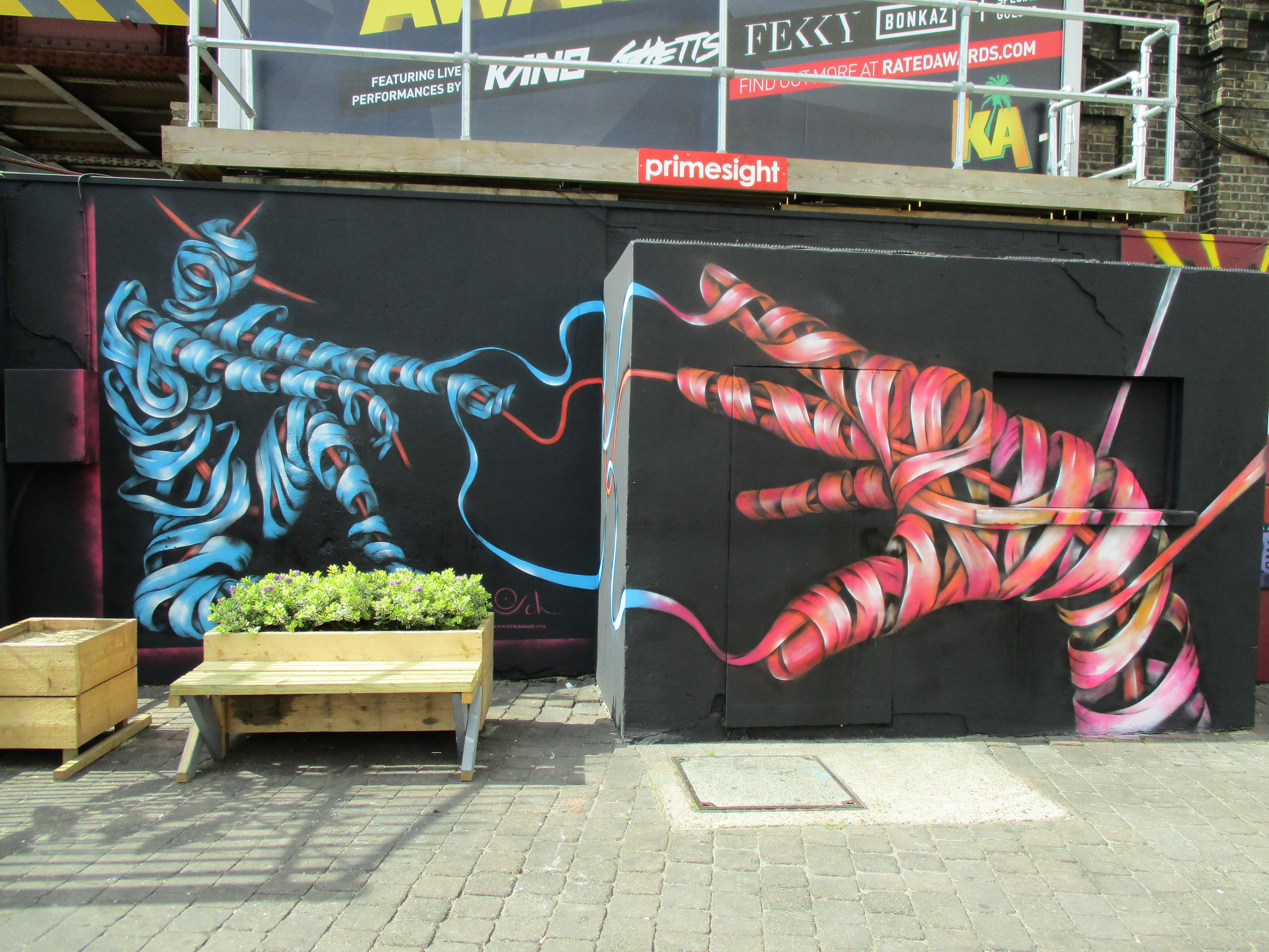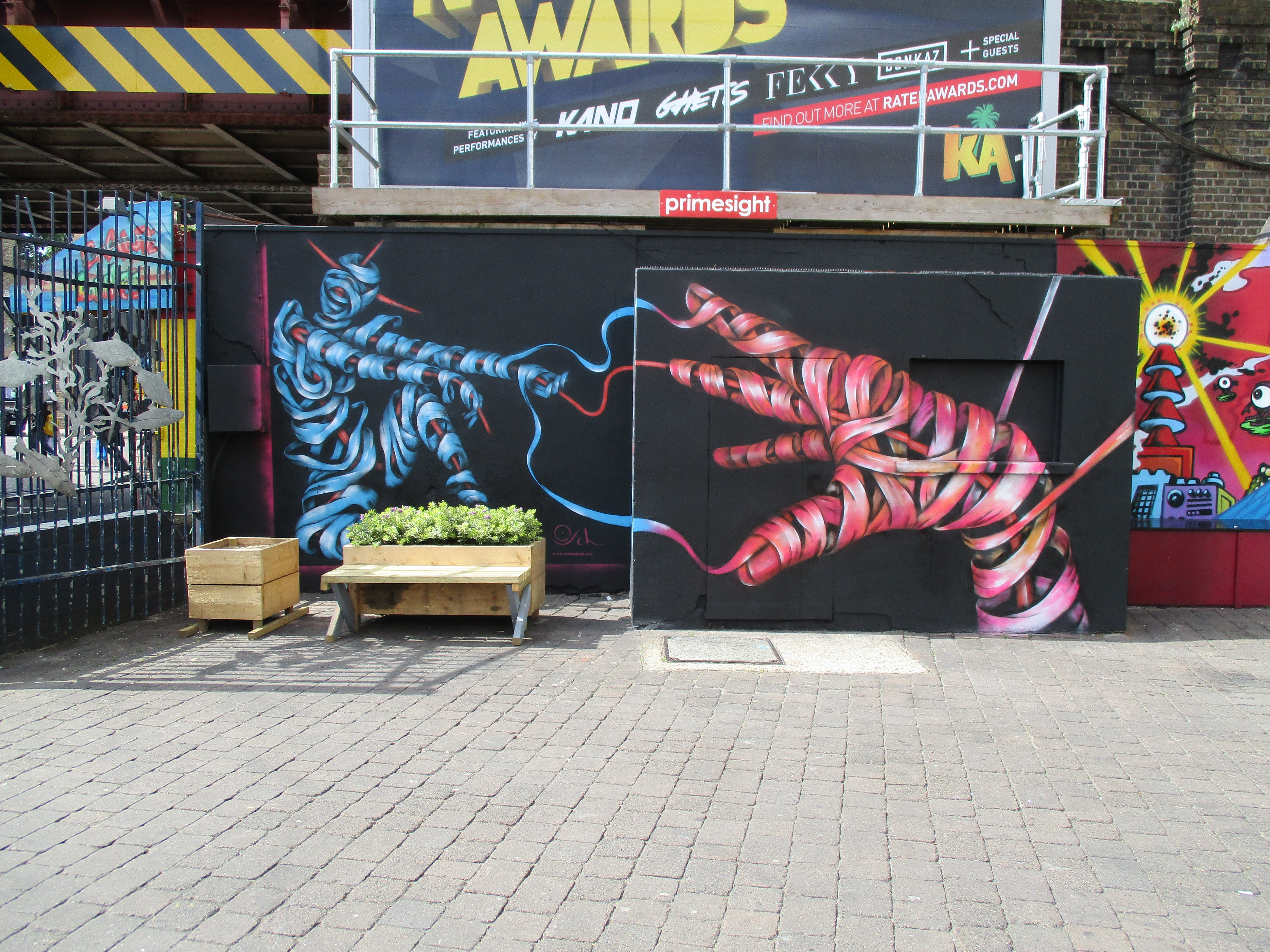 Last week Chilean born, but London based, Street Artist Otto Schade laid out his freshest stencil work in Brixton Village. The piece is in his characteristic and intricate ribbon styling and features his Mummy character being enthralled and simultaneously powered by the large-scale hand, whose presence runs through the very being of the first character. Its always a pleasure to spy some of Otto Schades work, and one can’t claim he isn’t a particularly active Street Artist, so at least we rarely have to wait to long to see something fresh from Osch on London’s streets.