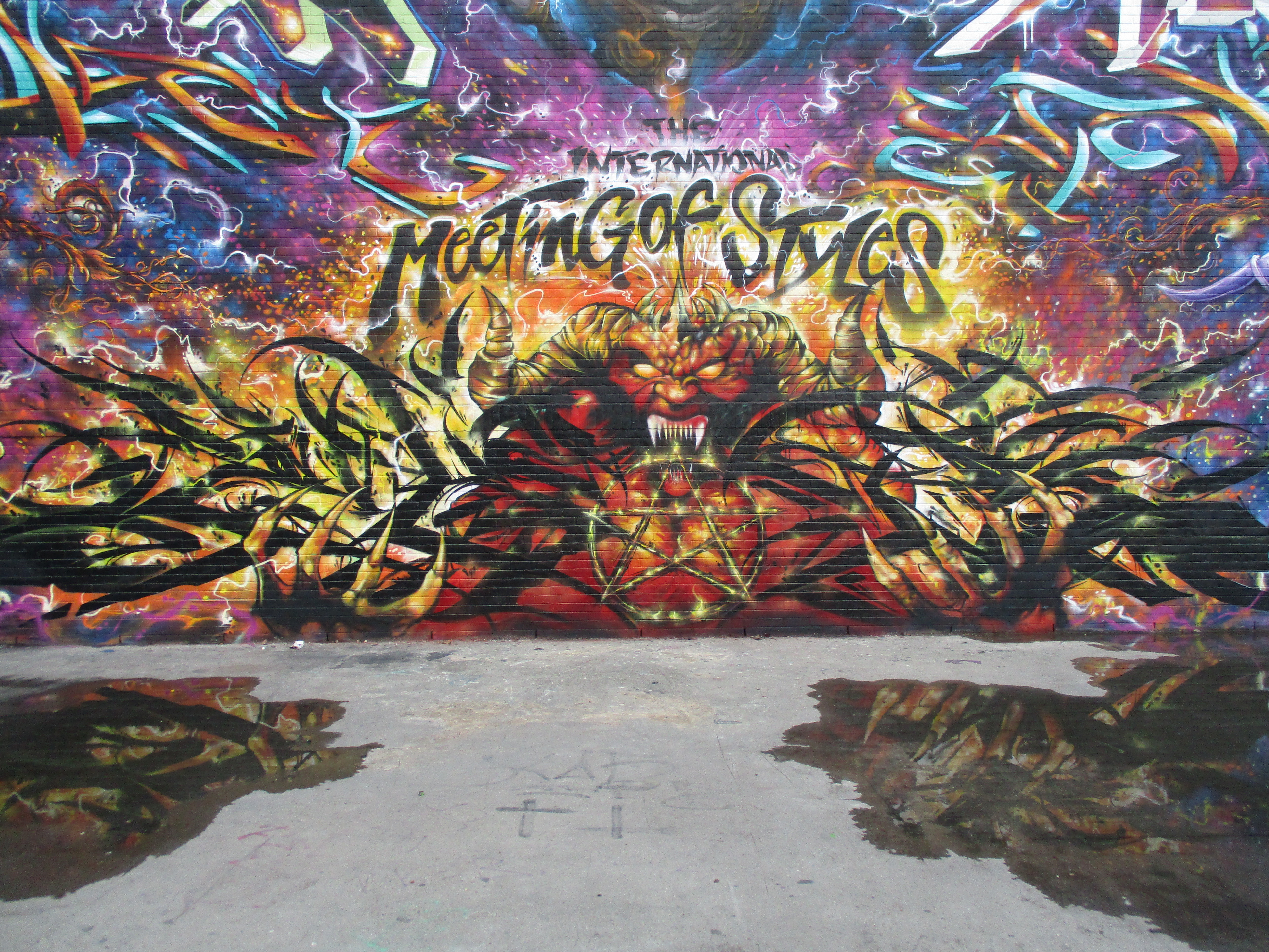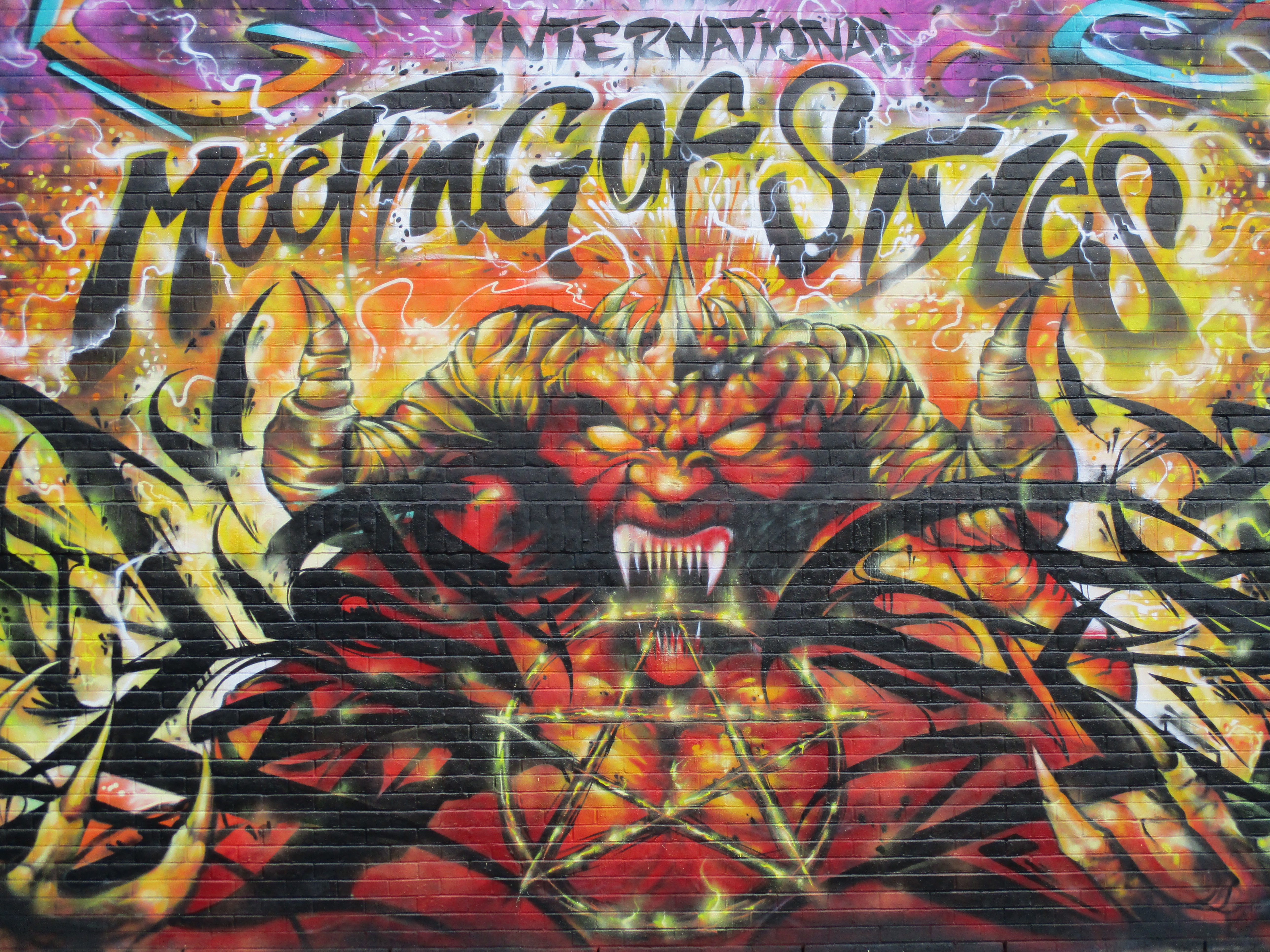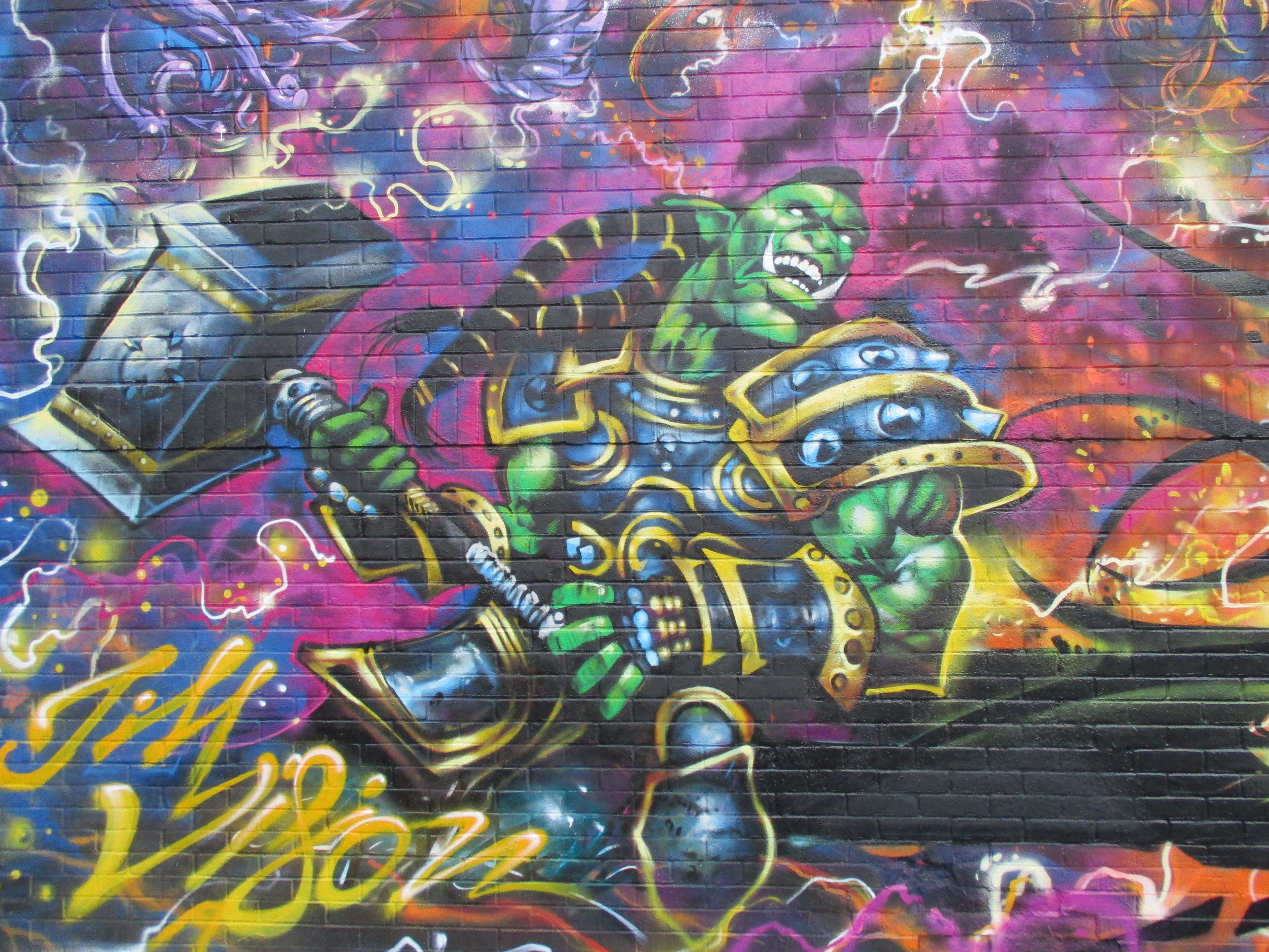 At the beginning of last week Street Artist Jim Vision set to transforming the feature wall of the Nomadic Community Gardens, following its’s recent restyling at Meeting Of Styles some six weeks back. Reworking the entire bottom half of wall, replacing the graffiti that was present with his distinct fantasy driven subjects and intricate backgrounds. At the centre of the fresh work is a Demon surrounded by Hell;s fire and whom is flanked either side by a ‘hero’ themed character set to combat the Demon. On the left the character takes on more of a more mythological fantasy direction, whilst on the right the character adopts a more sci-fi basis, both set amid a cosmic backdrop. The new additions certainly brighten up the wall, and enthuse it with a sense of story that is so prevalent in Jim Vision’s delightful works.