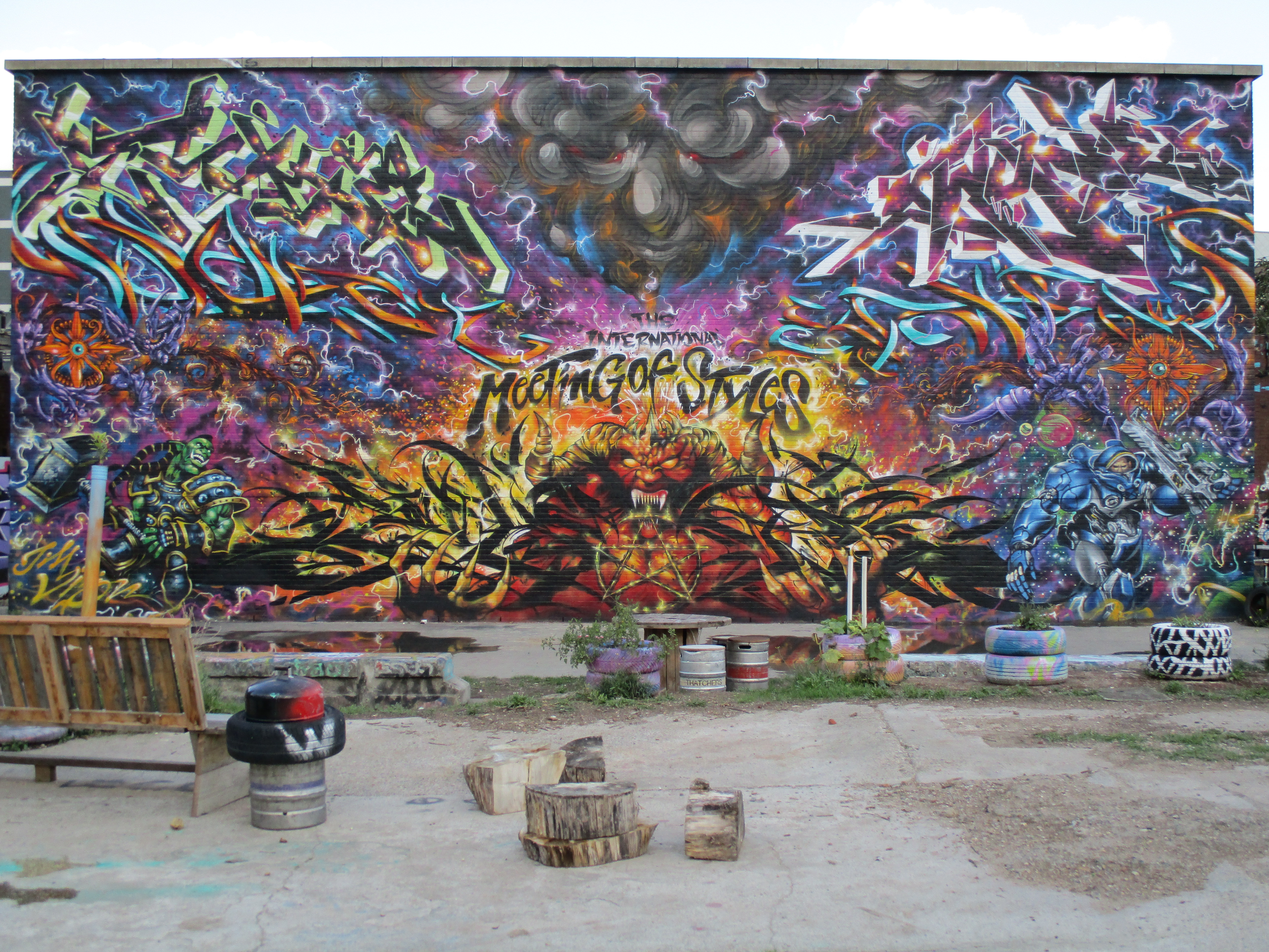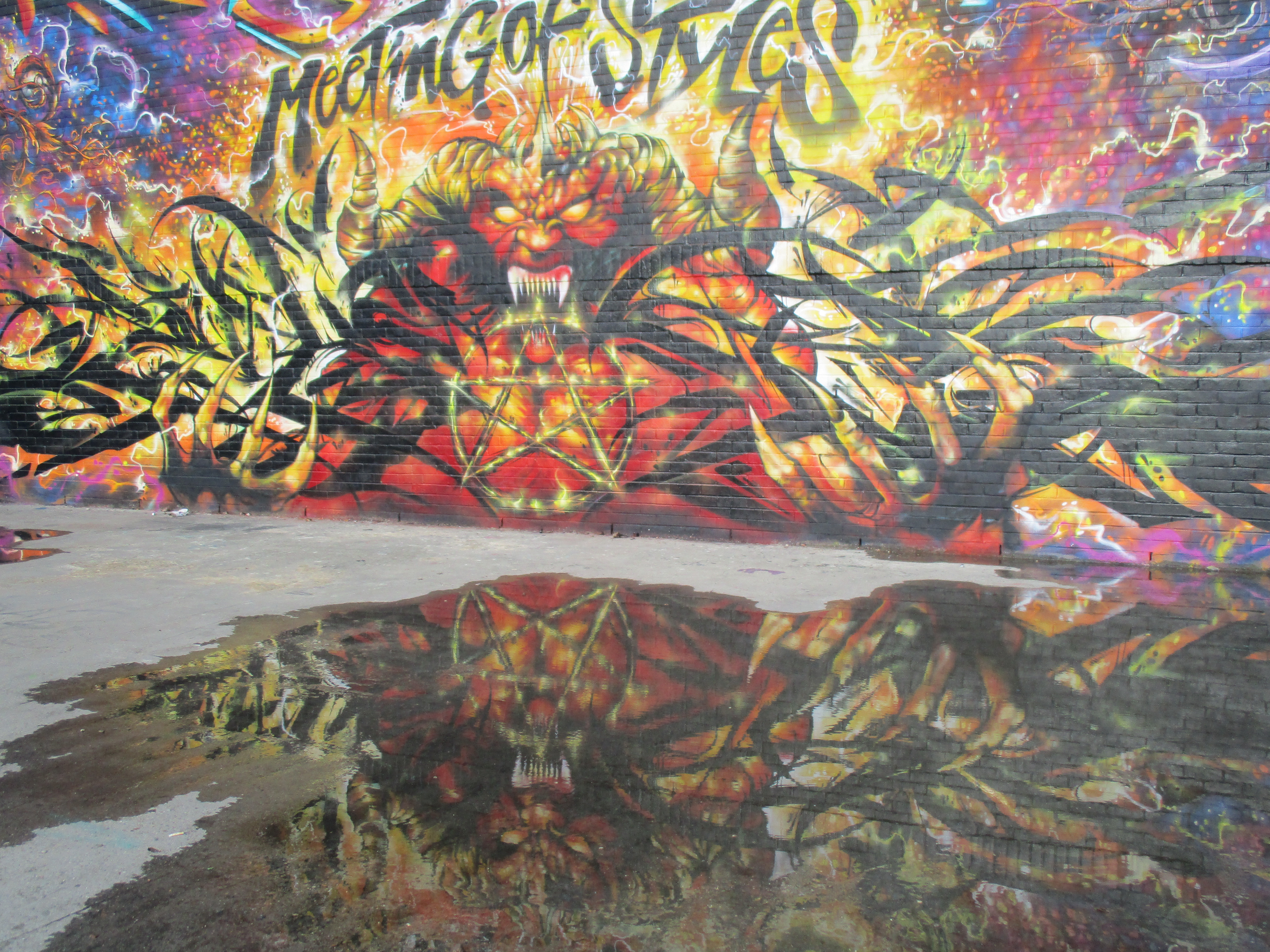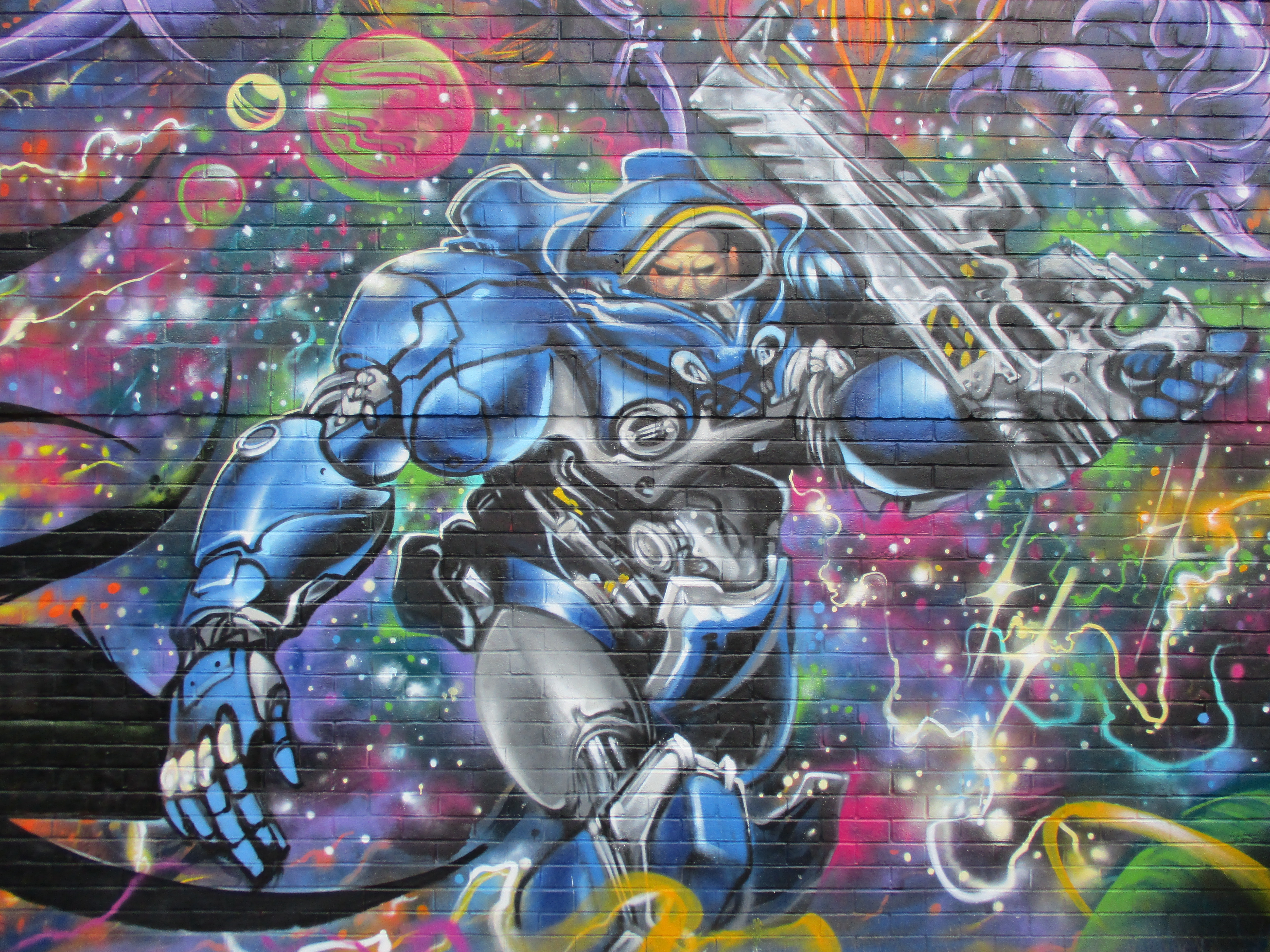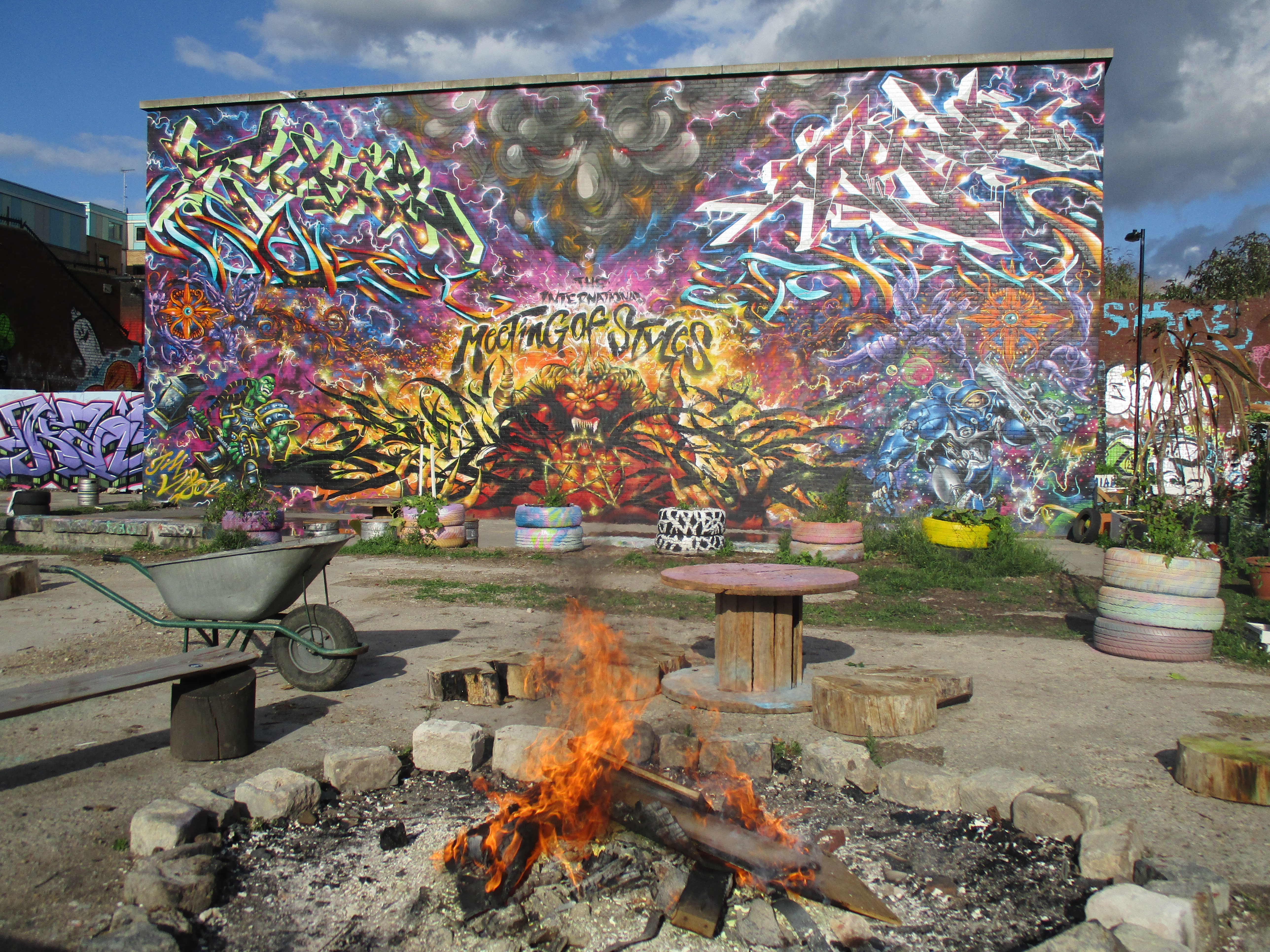 At the beginning of last week Street Artist Jim Vision set to transforming the feature wall of the Nomadic Community Gardens, following its’s recent restyling at Meeting Of Styles some six weeks back. Reworking the entire bottom half of wall, replacing the graffiti that was present with his distinct fantasy driven subjects and intricate backgrounds. At the centre of the fresh work is a Demon surrounded by Hell;s fire and whom is flanked either side by a ‘hero’ themed character set to combat the Demon. On the left the character takes on more of a more mythological fantasy direction, whilst on the right the character adopts a more sci-fi basis, both set amid a cosmic backdrop. The new additions certainly brighten up the wall, and enthuse it with a sense of story that is so prevalent in Jim Vision’s delightful works.