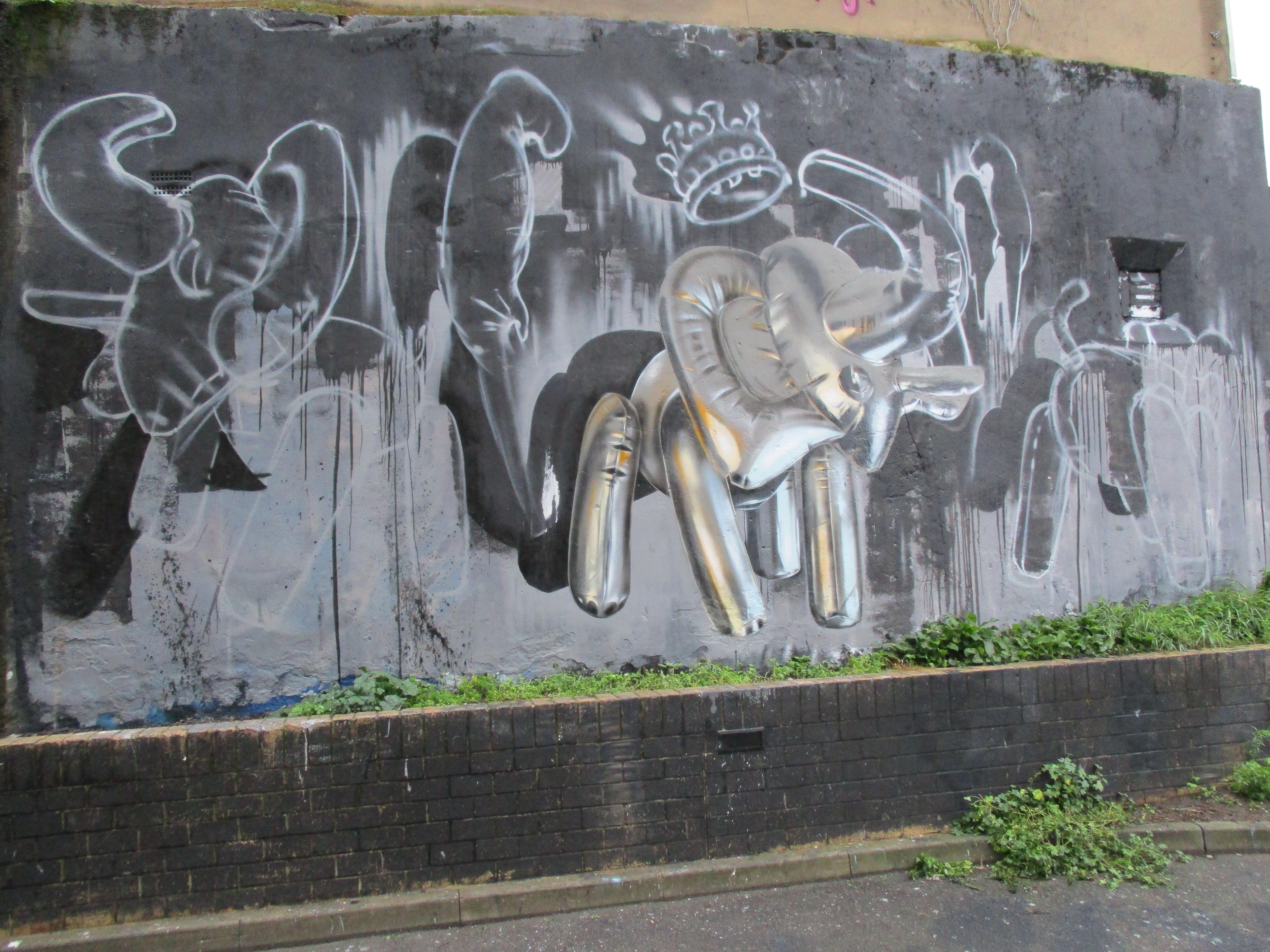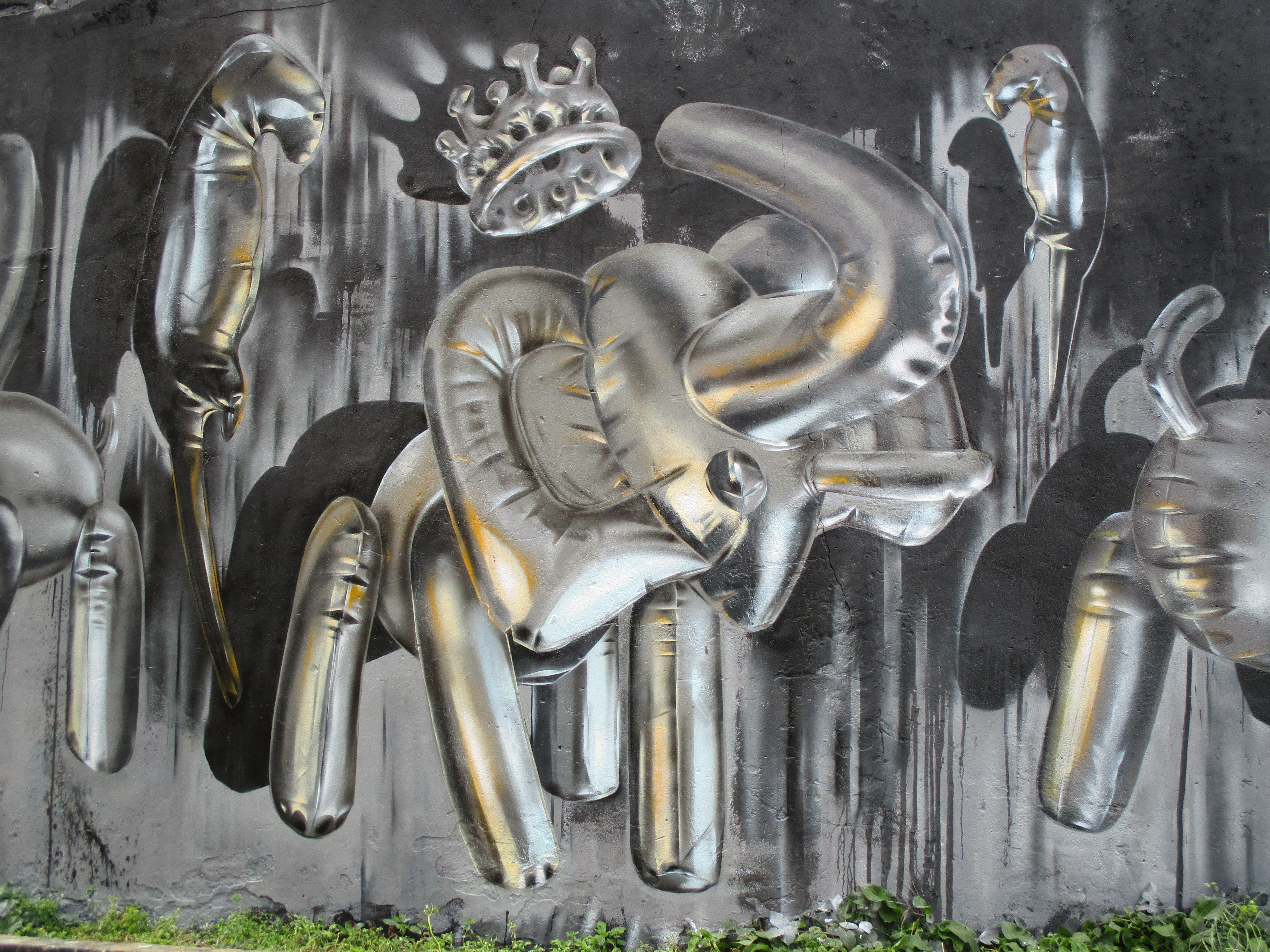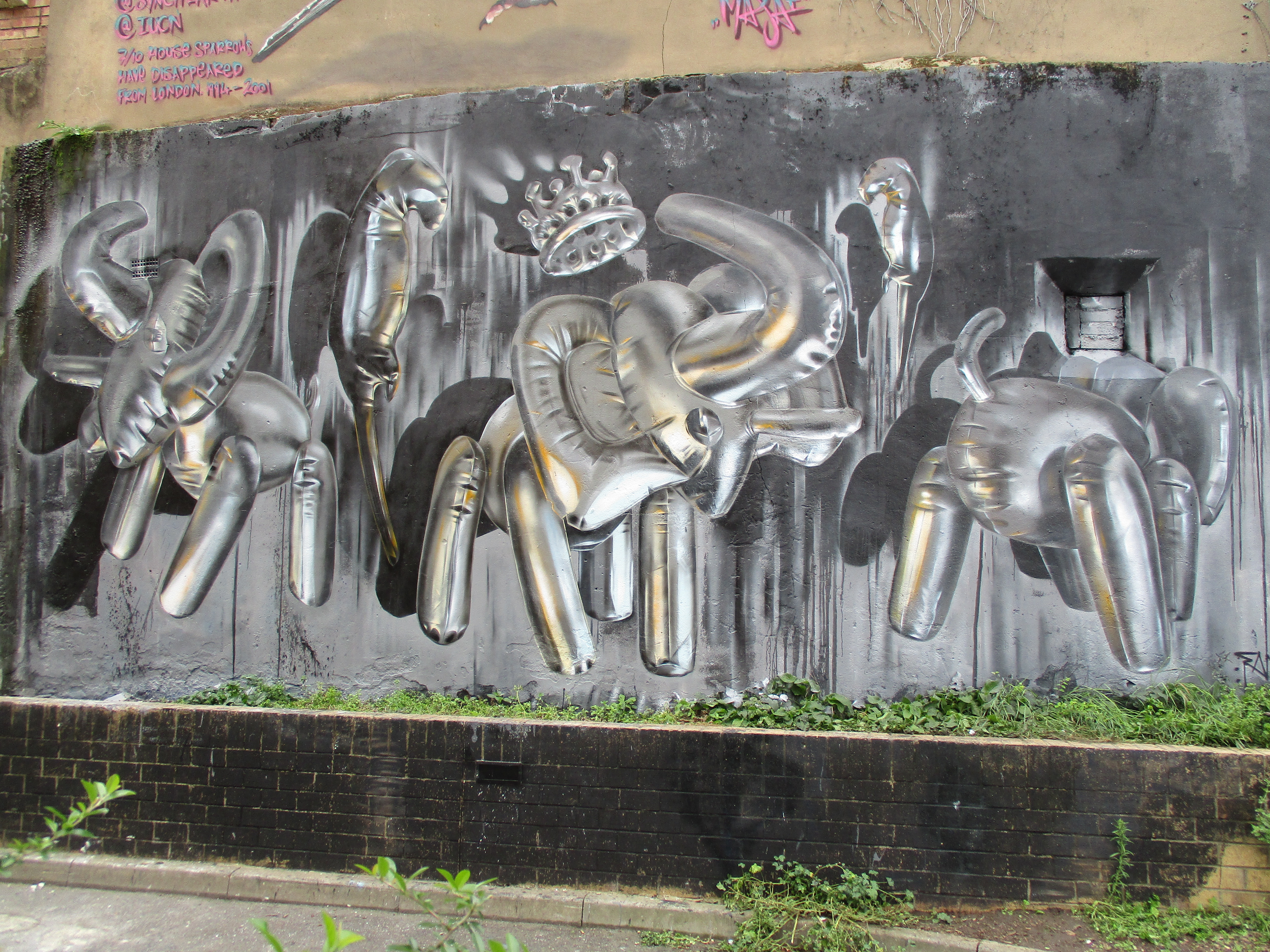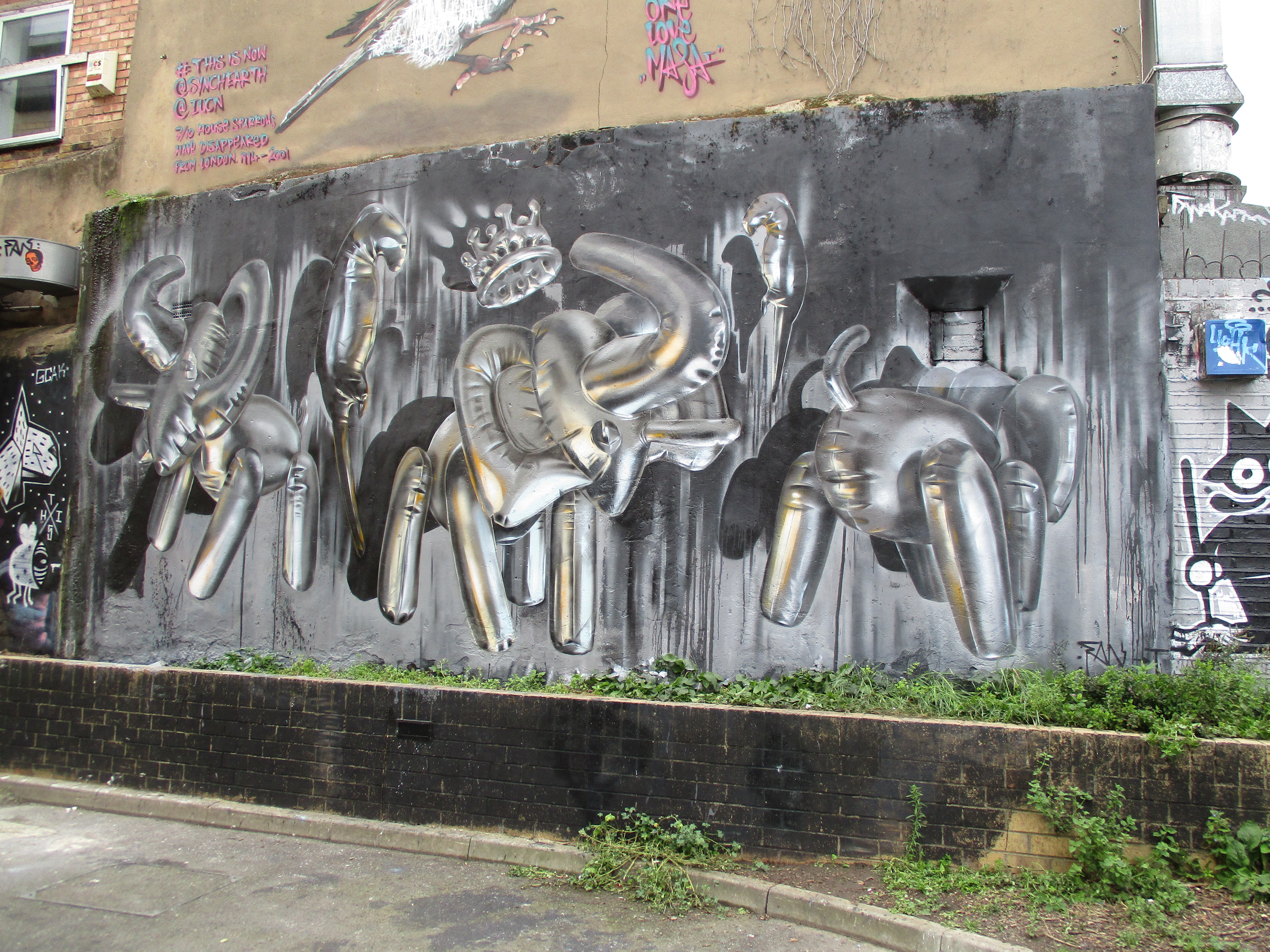 Further advancing his change of direction, moving into a more monochrome approach to his helium balloon creations over the last six or so months, the fun work depicts a trio of elephants, all in different stances and facing different directions, offering the maximum opportunity to demonstrate his superb use of shadow and reflective light highlights to make the work just pop of the wall. The elephants are accompanied by a floating crown in the centre along with the addition of two superb helium balloon parrots.