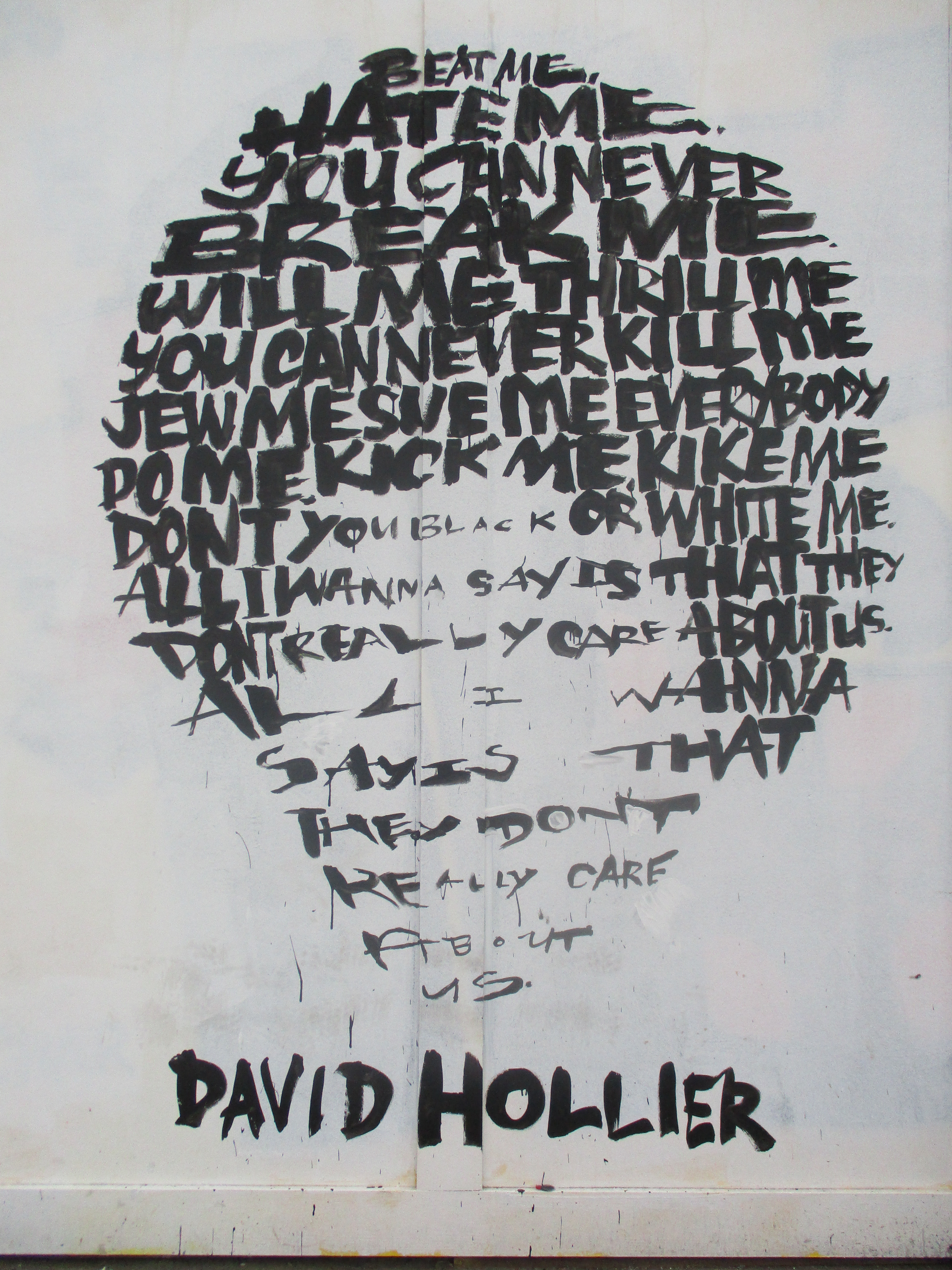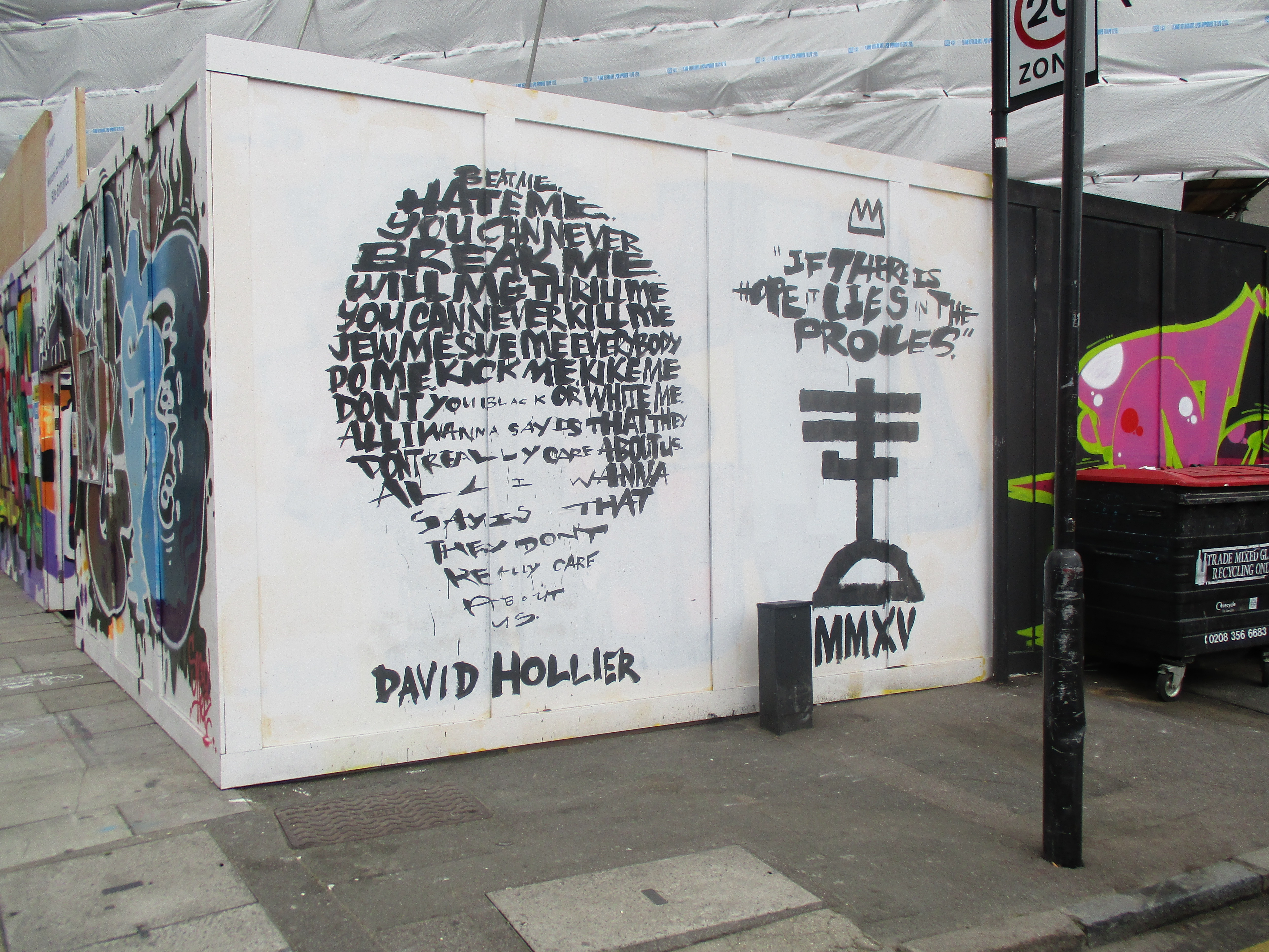 This work placed up in Shoreditch, just of Great Eastern Street, Shoreditch, and features an image of Michael Jackson, composed from the lyrics to ‘They Don’t Really Care About Us’.
