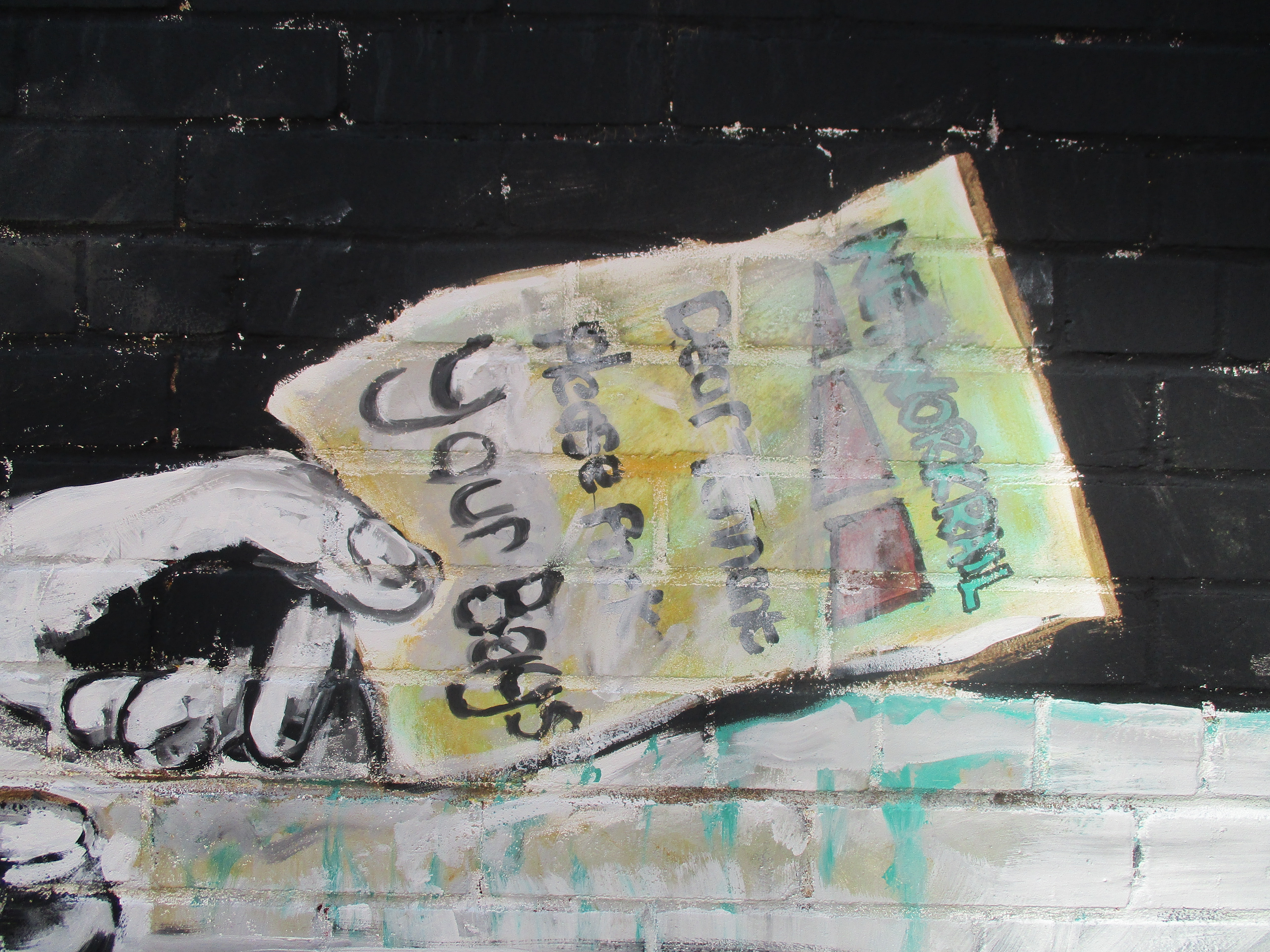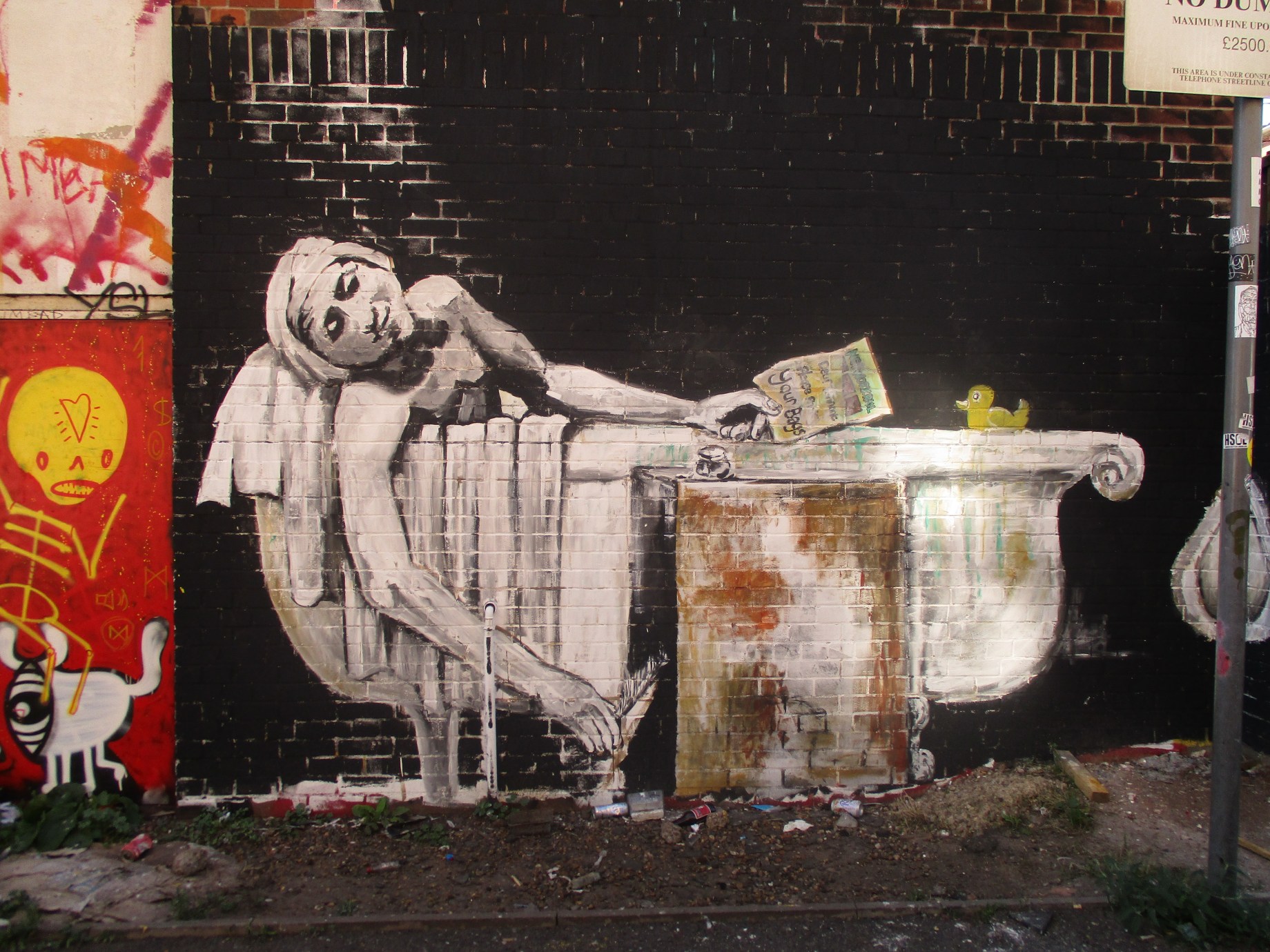 We are not entirely sure when this was placed up, however on our latest venture down Bethnal Green we were delighted to see this wonderful piece, and all the more so to discover the story behind it. The piece is a spoof of the famous painting The Death of Marat by Jacques-Louis David, which depicts the murdered French Revolutionary leader Jean-Paul Marat. In this work the note held in the subjects hand in the original piece is substituted with a notice from Network Rail exclaiming ‘Dear Tenants, Please Pack Your Bags’, a detail which is in reference to the very real fact that due to planned redevelopment works in this immediate area the current business residing along the arches will be evicted in the process of further gentrification of the East End.
