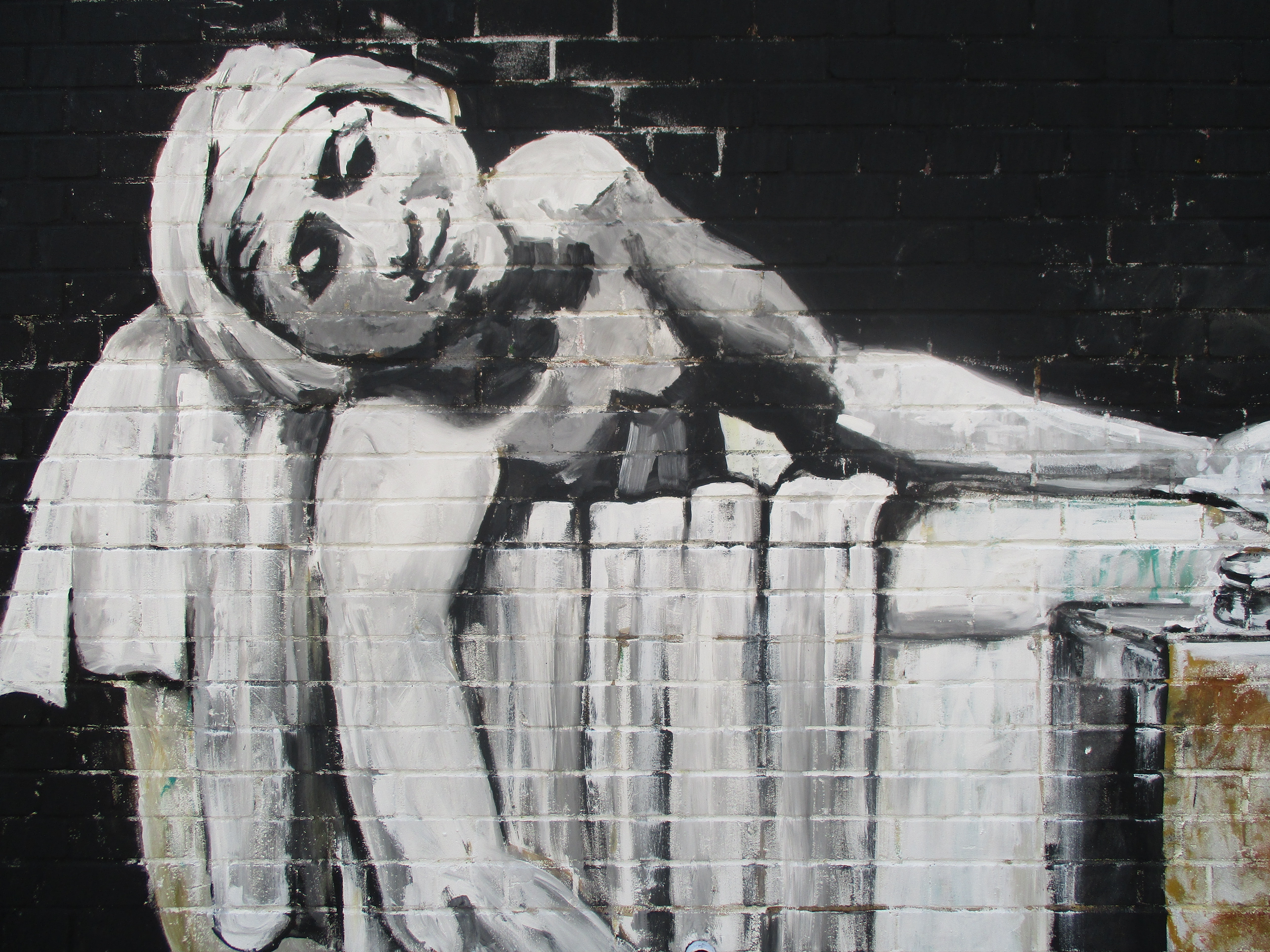 The piece was painted by Adam and a friend (this is all we know of the artists), who work in the iron works opposite the piece, and having being inspired by the transformation that has occurred along this street in the last year or so, due to the diligent work of Hidden Street of London, who have added colour and creativity to the walls, decided they would like to have a go at painting a wall and in the process have crafted this delightful and topical work. This work represents the power of public and Street Art to inspire and has resulted in this duo having a go and proving pretty damn good at it, we hope they continue with such ventures. We also absolutely love the cheeky twist of the addition of a rubber duck to a classical styling.