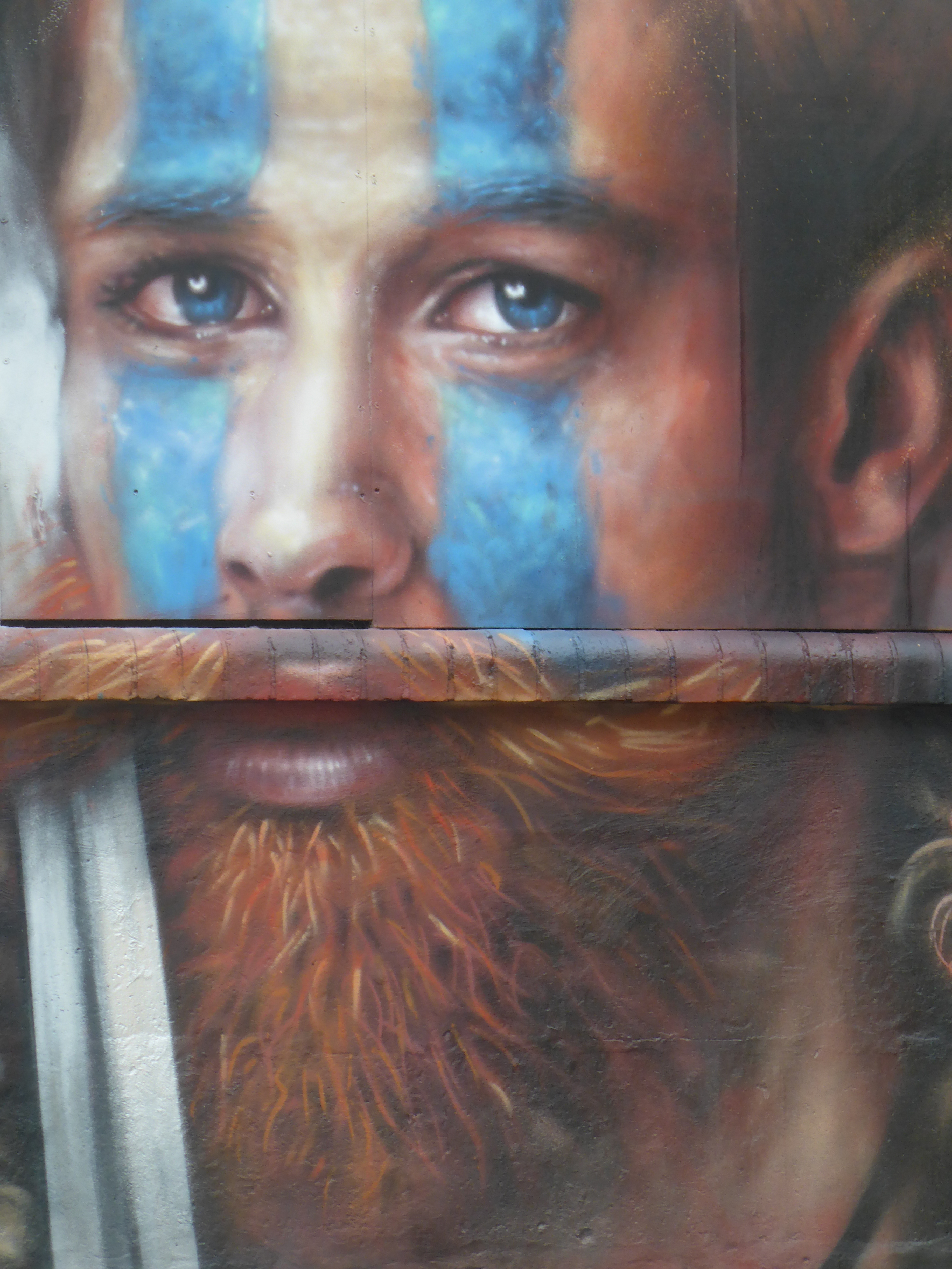 Last week in Camden town, the incredible Street Artist Dale Grimshaw spent several days at work on his latest London mural. This large-scale and tucked away work is fantastic, a real delight to gaze upon, featuring Dale Grimshaw’s signature subject style, maintaining a preference for strongly tribal subjects. In this case depicting a Scottish warrior from the middle-ages, and accompanied by a classical Ancient Greek style Lion statue bursting on to the scene alongside the warrior. The detail in both subjects is stunning, the works are fused with that air-brushed effect that makes for such exquisite images, enthused with a sense of passion and depth that is fundamentally Dale Grimshaw.