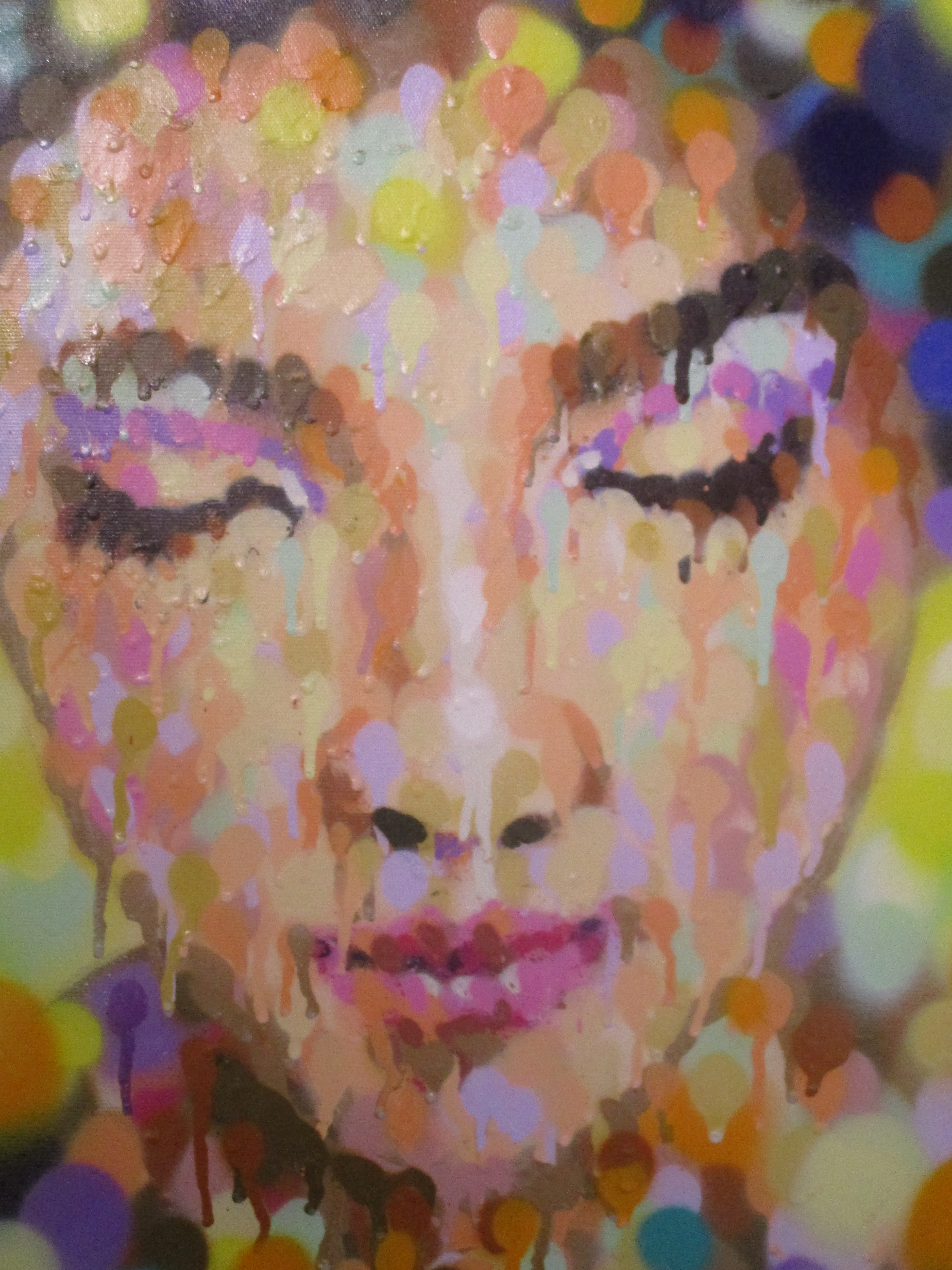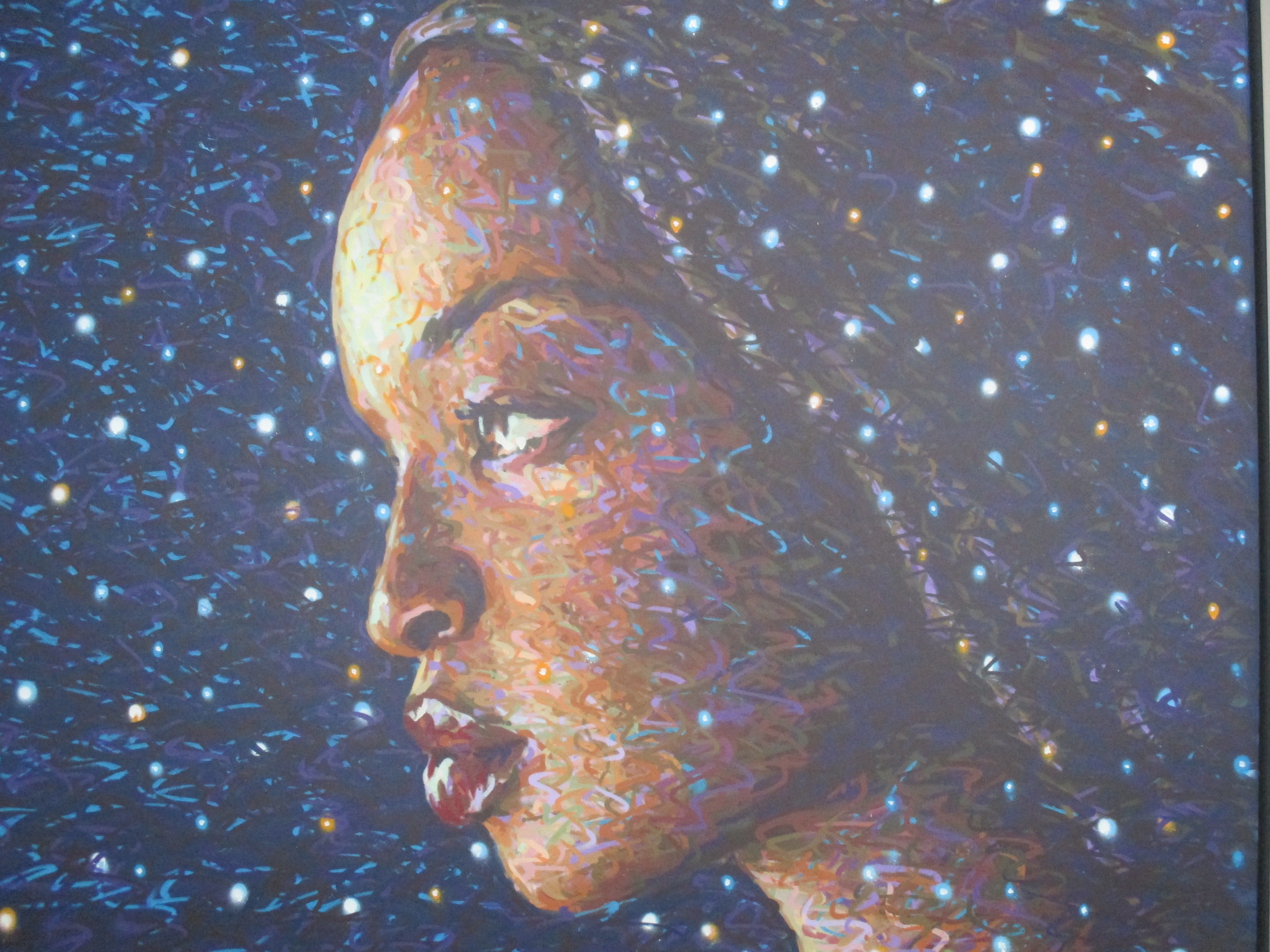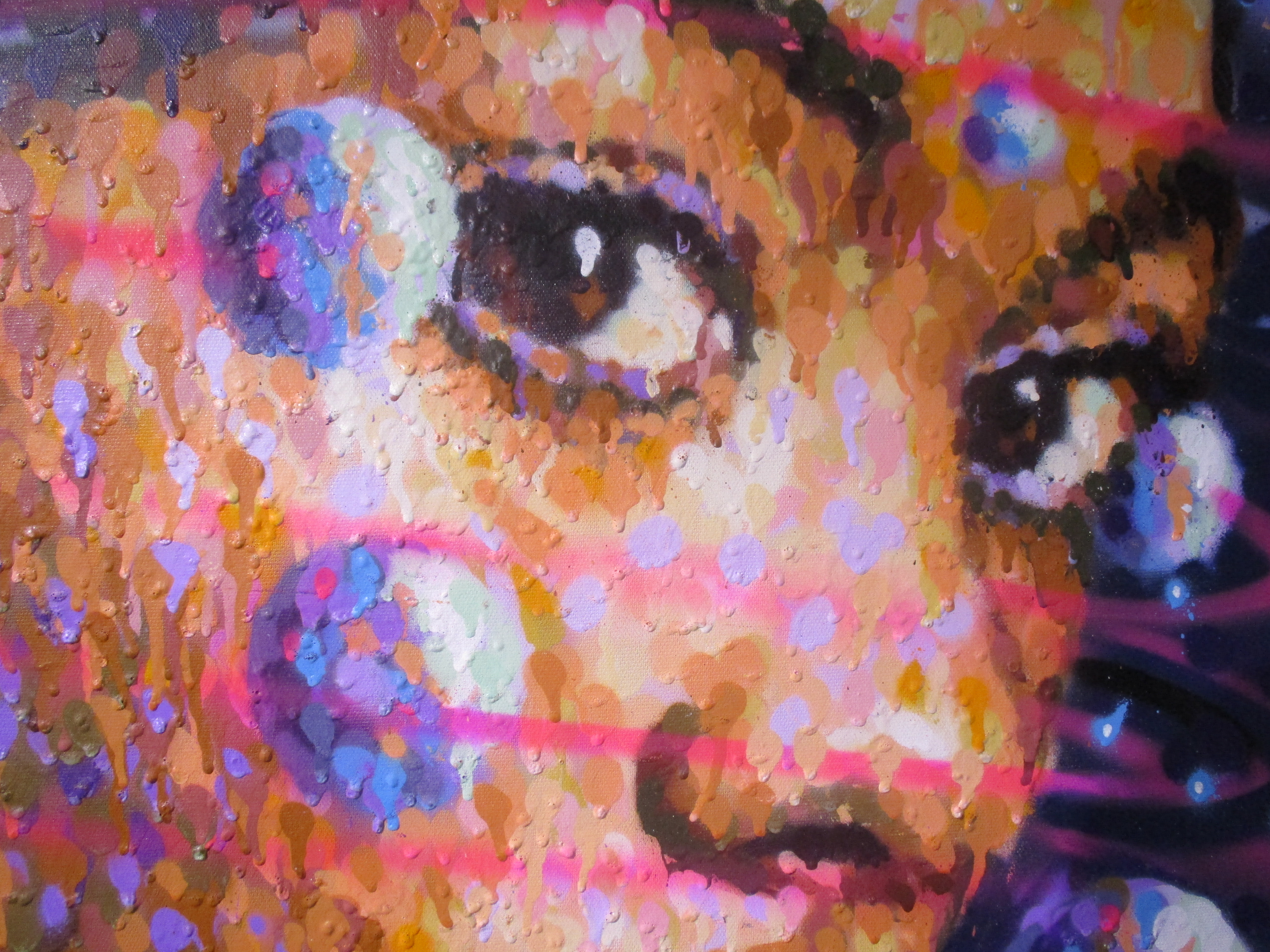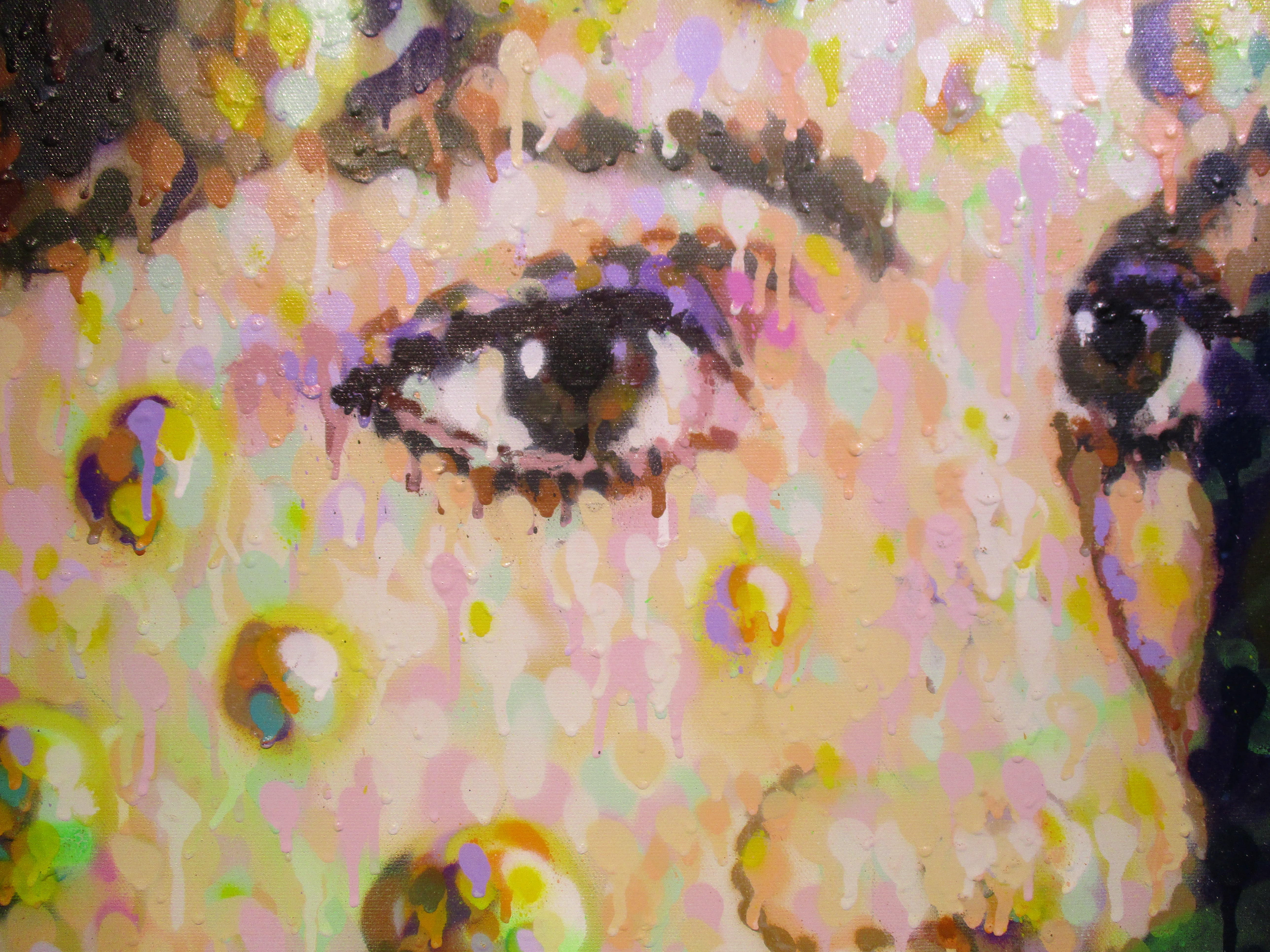 Jimmy C’s style is influenced by a combination of Pointillism and the aboriginal culture of his native Australia. He started painting on the street in the early 1990’s as a part of the then growing Australian underground graffiti movement and has since gone on to hone his distinct ‘Aerosol-Pointillism’ style. Whats interesting in this show is how all the pieces aren’t constructed entirely of his more notable and commonplace ‘dots’, several pieces are built up from a more ‘dash’ driven approach. It was also very interesting to see some sculpture work from the artist, with a piece that really adds a 3D perspective on Jimmy C’s view of the world so prevalent in his painting. Finally it was great to see the exhibition embrace modern technology, most notably in the section which offer’s visitors to the show to sit in a chair and be projected on to the adjacent wall as Jimmy C Pointillist painting, paying homage to the history of portraiture in society and offering a far more democratic approach driven by technological advancements, that in this instance allows the individual with a camera or phone to be able have their own portrait taken.
