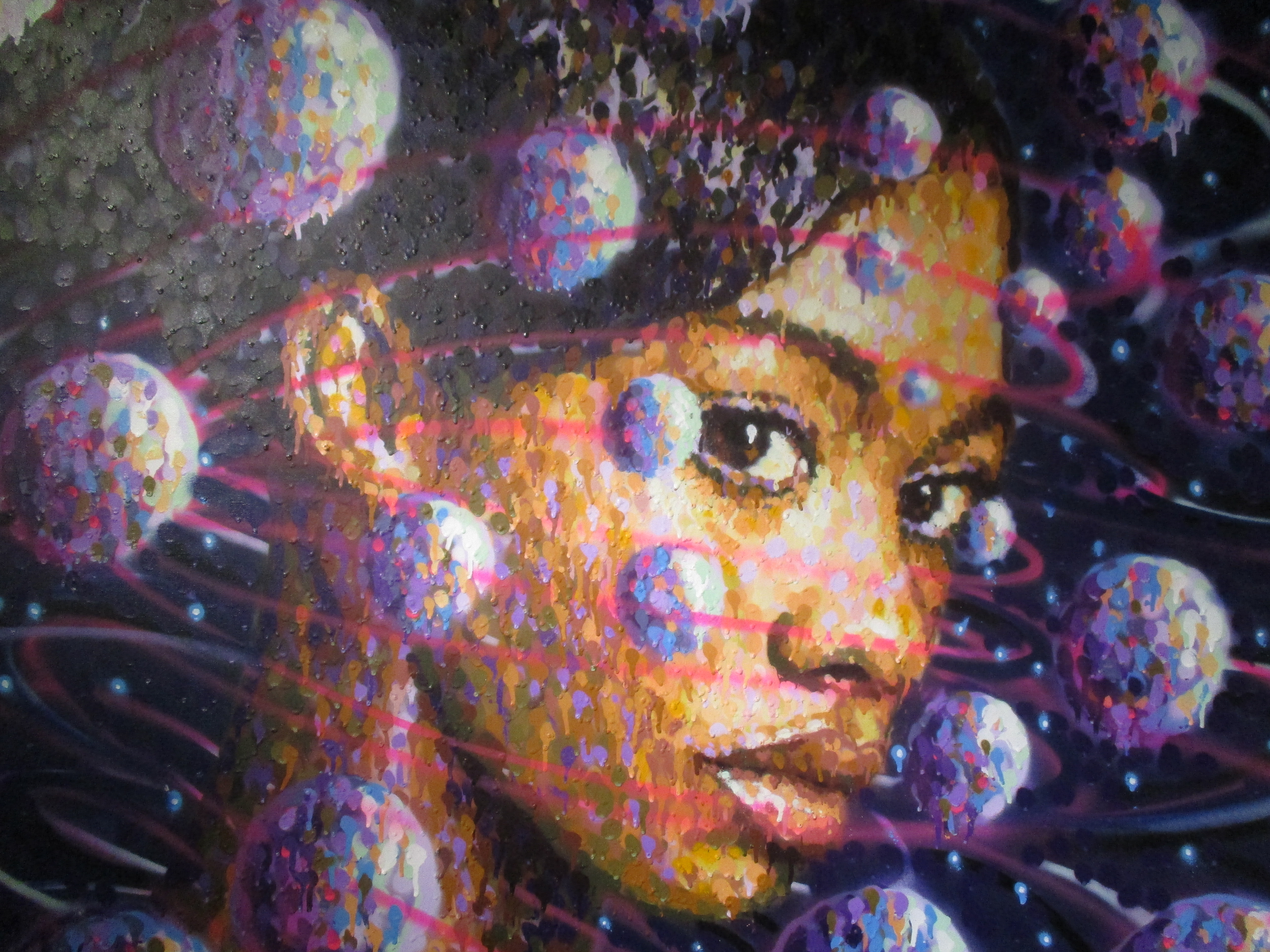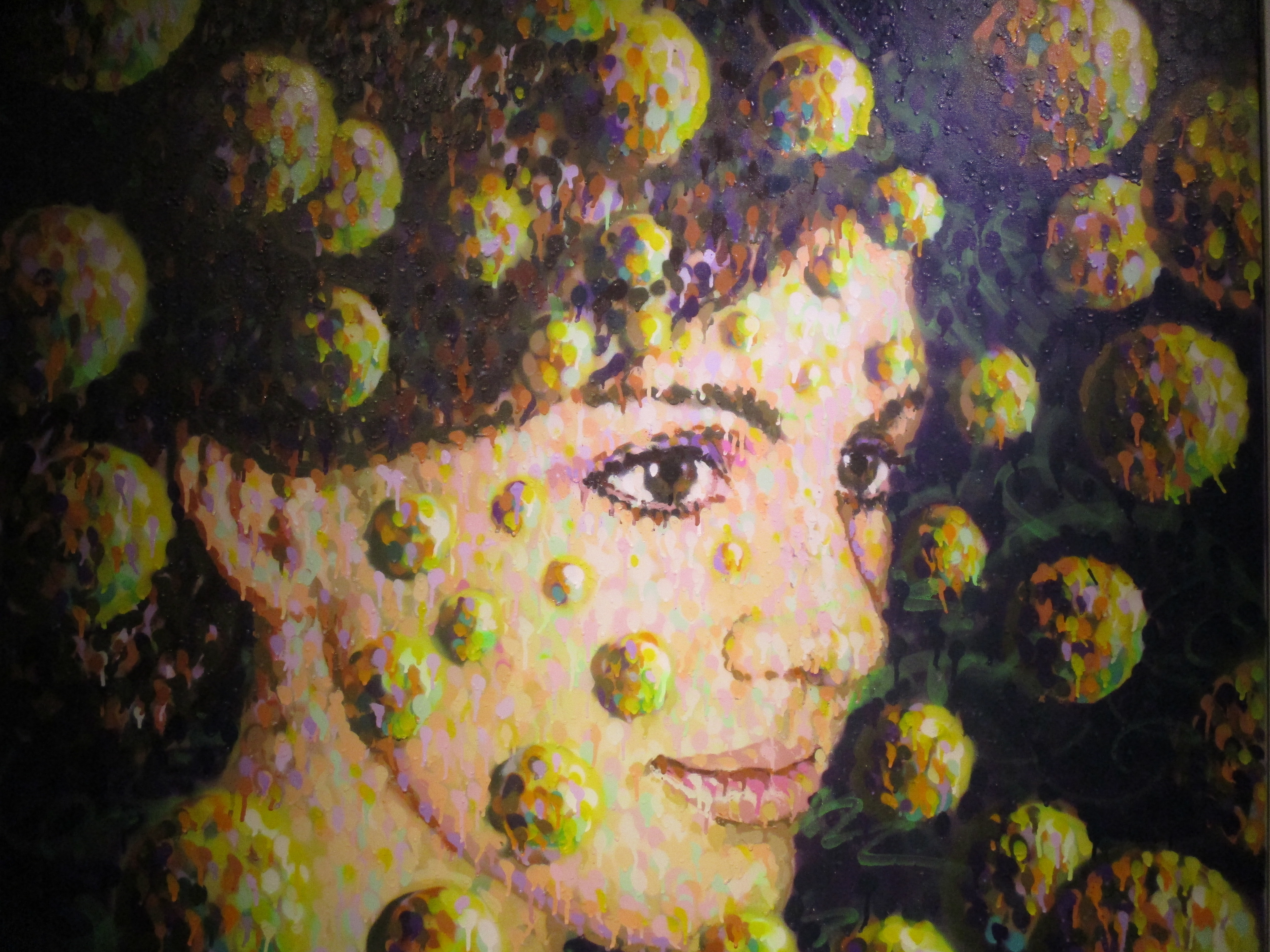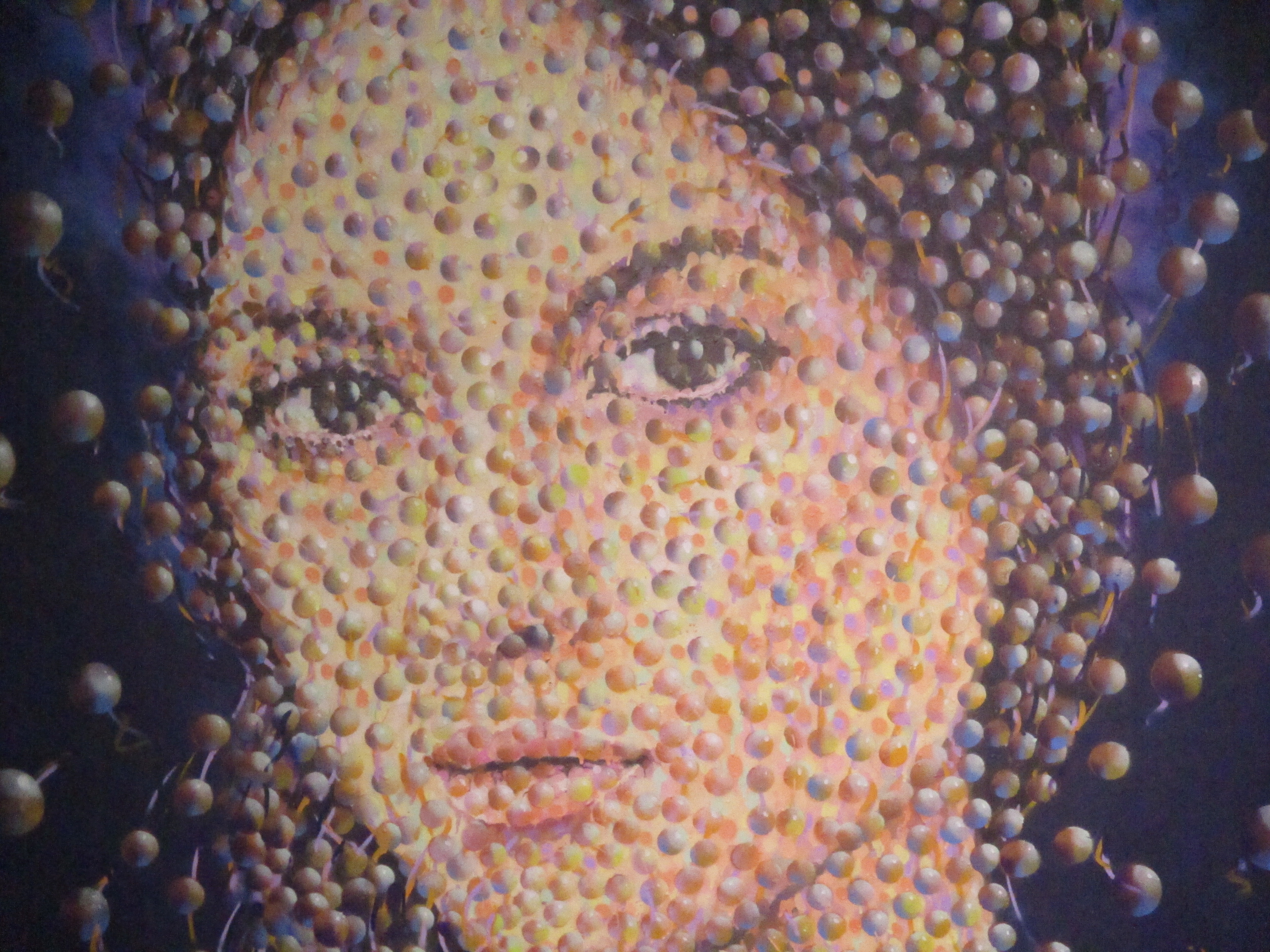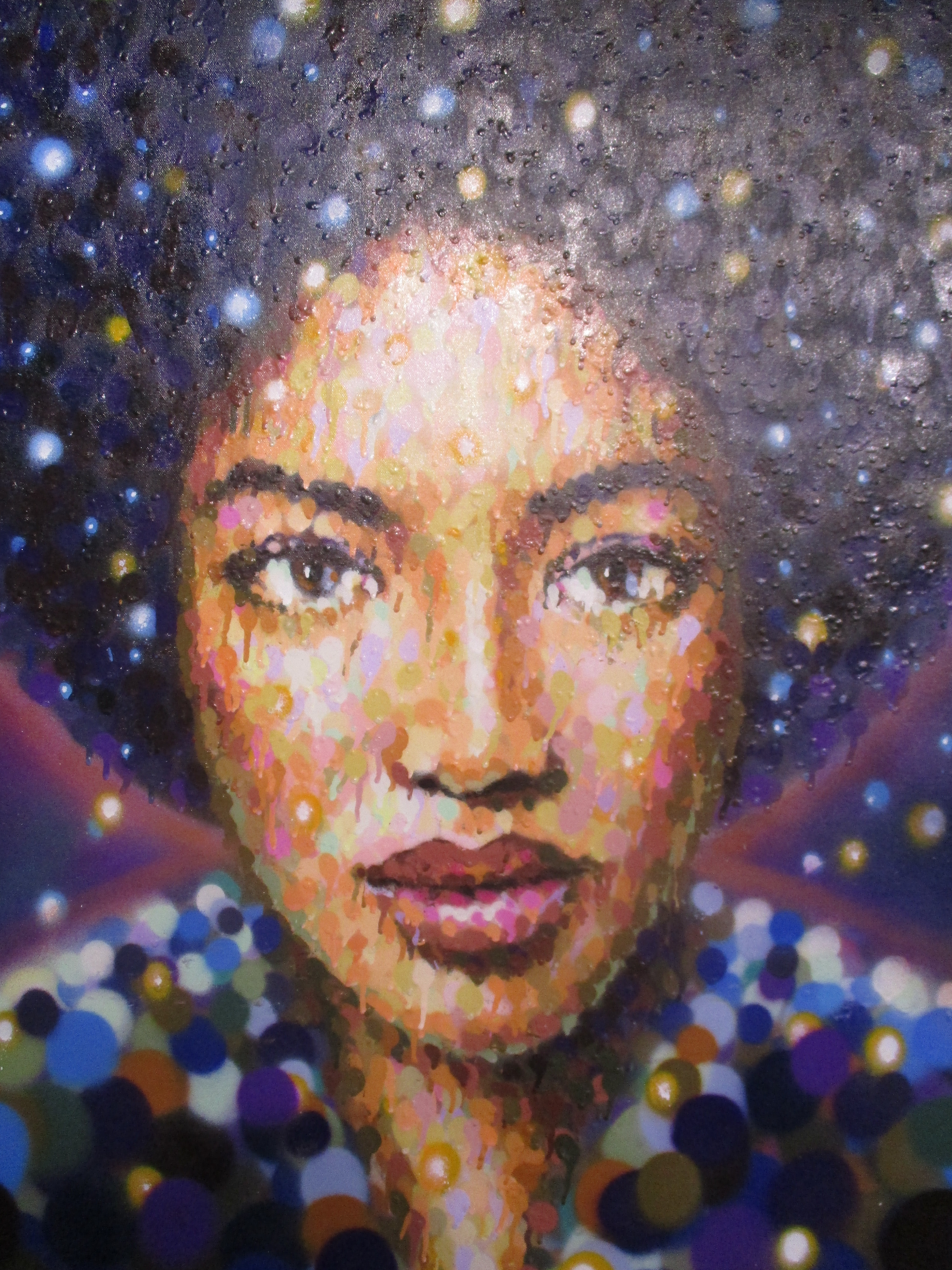 Jimmy C’s style is influenced by a combination of Pointillism and the aboriginal culture of his native Australia. He started painting on the street in the early 1990’s as a part of the then growing Australian underground graffiti movement and has since gone on to hone his distinct ‘Aerosol-Pointillism’ style. Whats interesting in this show is how all the pieces aren’t constructed entirely of his more notable and commonplace ‘dots’, several pieces are built up from a more ‘dash’ driven approach. It was also very interesting to see some sculpture work from the artist, with a piece that really adds a 3D perspective on Jimmy C’s view of the world so prevalent in his painting. Finally it was great to see the exhibition embrace modern technology, most notably in the section which offer’s visitors to the show to sit in a chair and be projected on to the adjacent wall as Jimmy C Pointillist painting, paying homage to the history of portraiture in society and offering a far more democratic approach driven by technological advancements, that in this instance allows the individual with a camera or phone to be able have their own portrait taken.