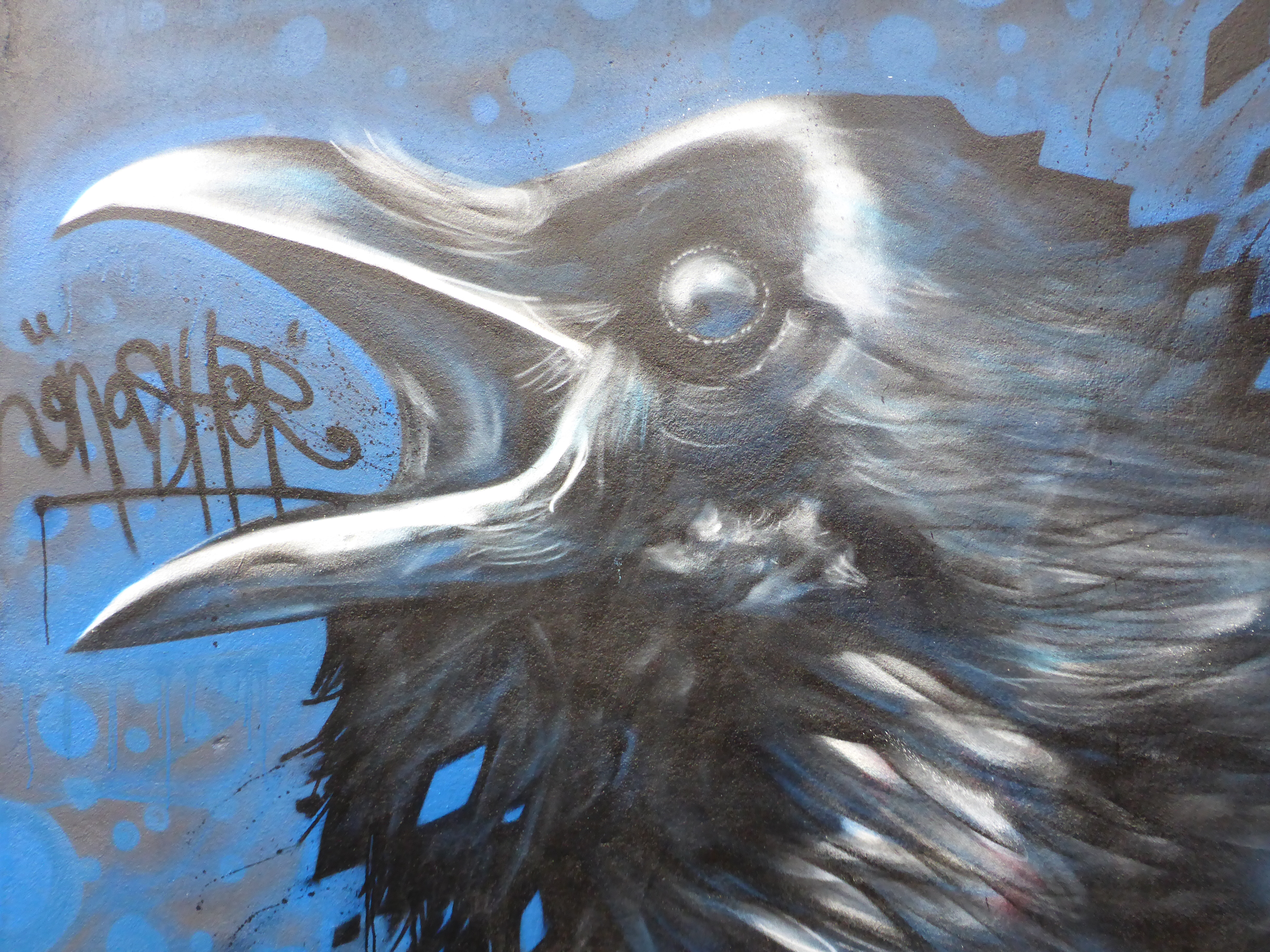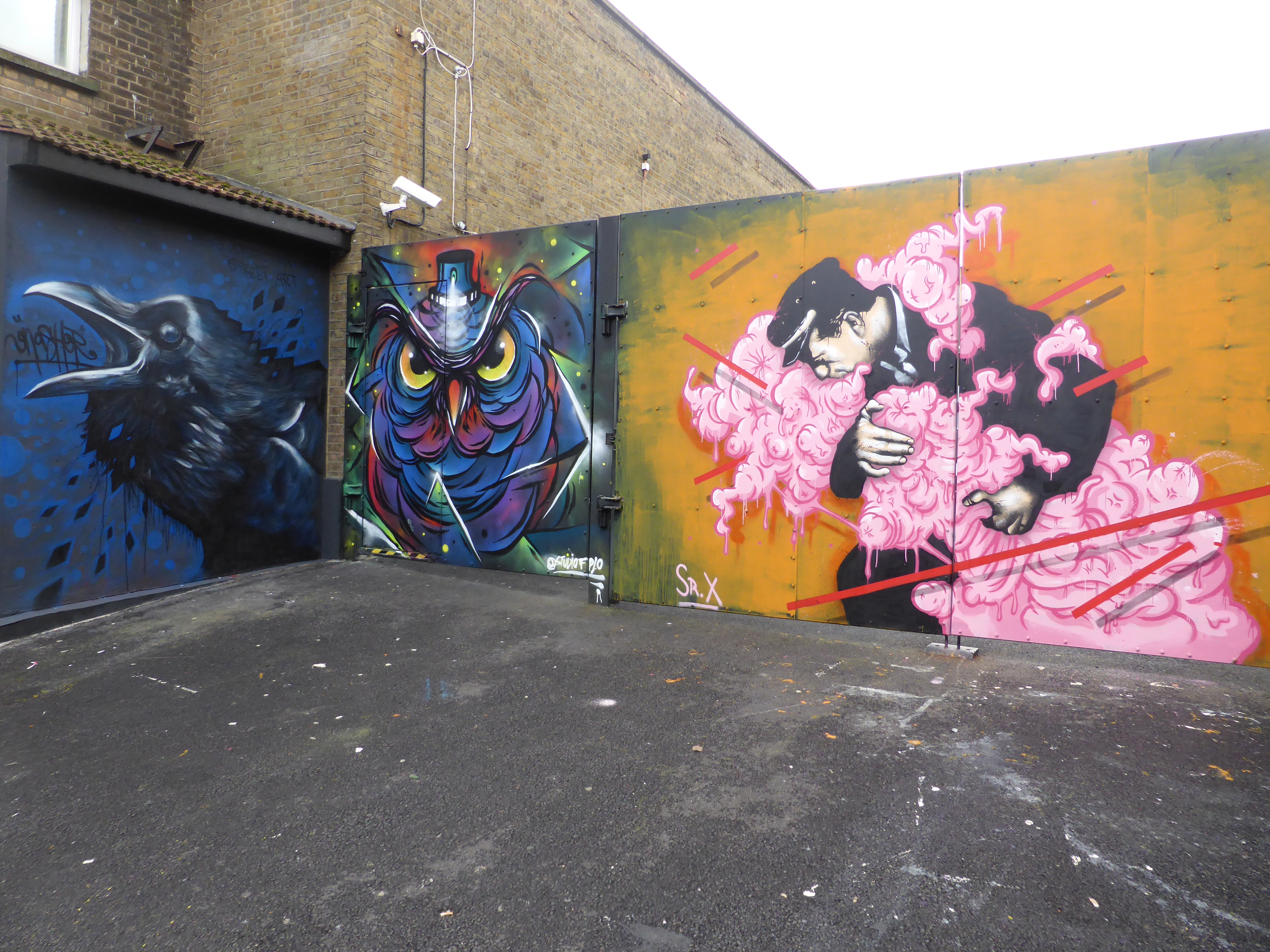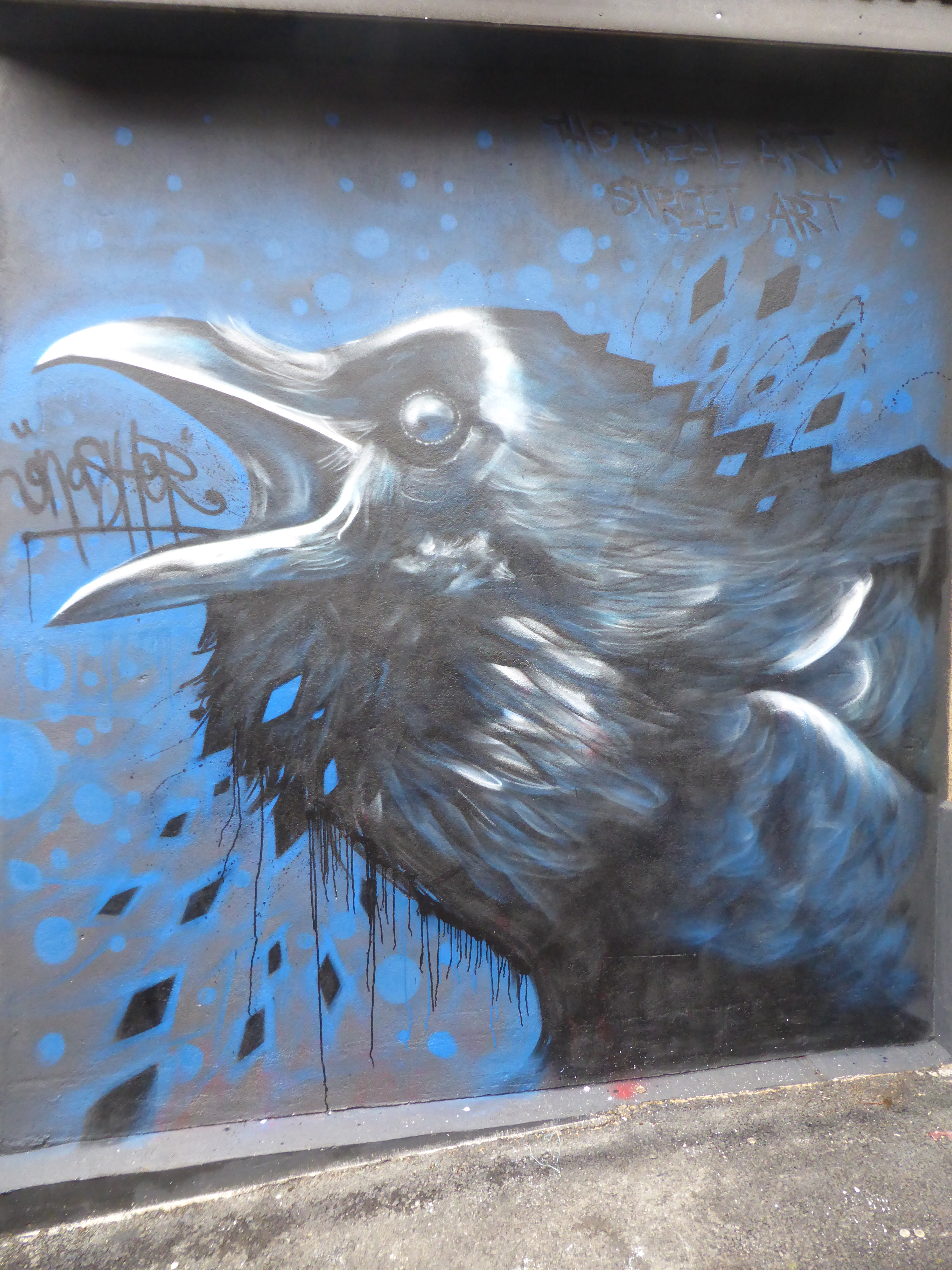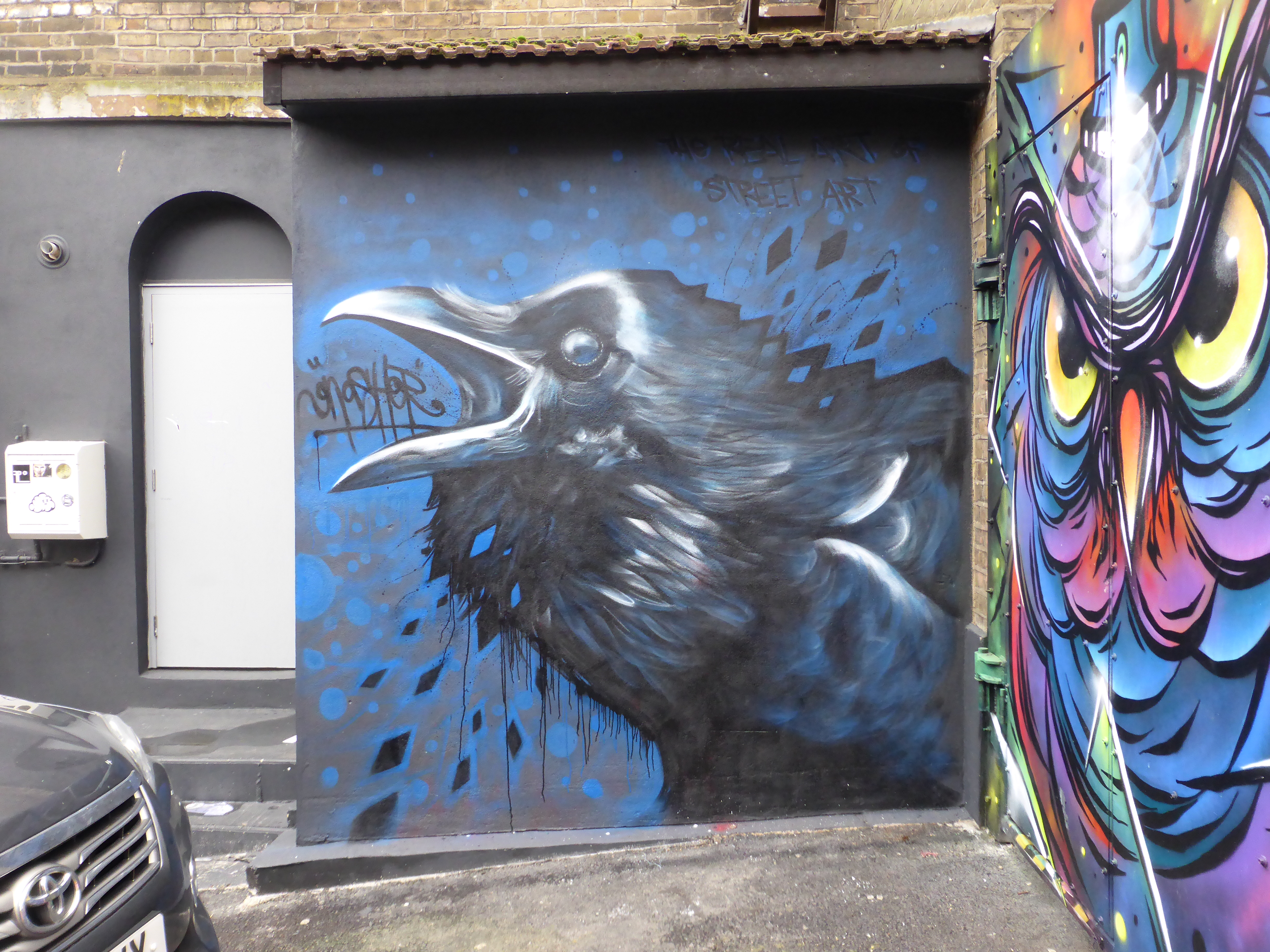 This week on Tuesday amid the rainfall befalling London, Norwich based Street Artist Gnasher was in Camden Town to lay out this small delightful piece, that sits so well alongside FPLO’s owl, and makes for Gnasher’s third work to be seen at current in Camden Town. It is always a pleasure to see that Gnasher has visited London, firstly as his works are excellent, offering exceptionally realistic depictions of his subjects and secondly for the sheer range of subjects which Gnasher is willing to paint, you really do never know what he will create next. For this piece Gnasher placed up a squawking crow that is full of life and appears to be calling out to passers-by of the car park in which it resides. So if you are in the area, keep your eyes peeled for this great work and until London next receives a visit from Gnasher, enjoy. This work was placed up with support from The Real Art of Street Art.