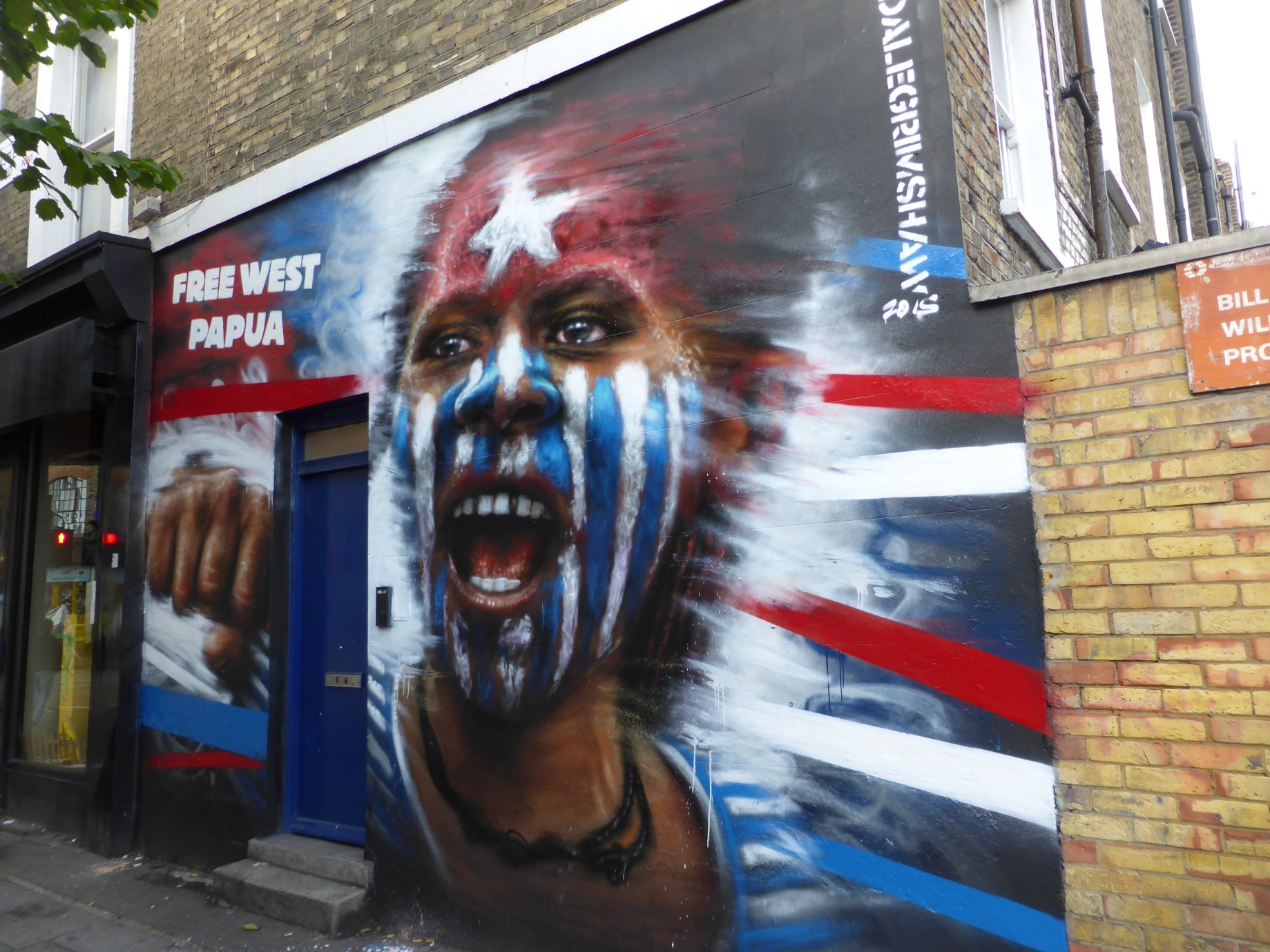 Well it was only a couple of weeks ago that we reported on the large mural placed by Dale Grimshaw in Camden Town (covered here) and since then over the last week he has placed up a second fresh work, smaller in size but every bit as impressive in stature. The work ‘Free West Papua’ is yet again a real delight to gaze upon, featuring Dale Grimshaw’s signature subject style, maintaining a preference for strongly tribal subjects. In this case depicting a portrait of Papuan tribesman with the message of the piece hit home with the accompanying fist on the left, all fused with that air-brushed effect that makes for such exquisite images, enthused with a sense of passion and depth that is just fundamentally Dale Grimshaw. This wall was put up with support from The Real Art of Street Art.
