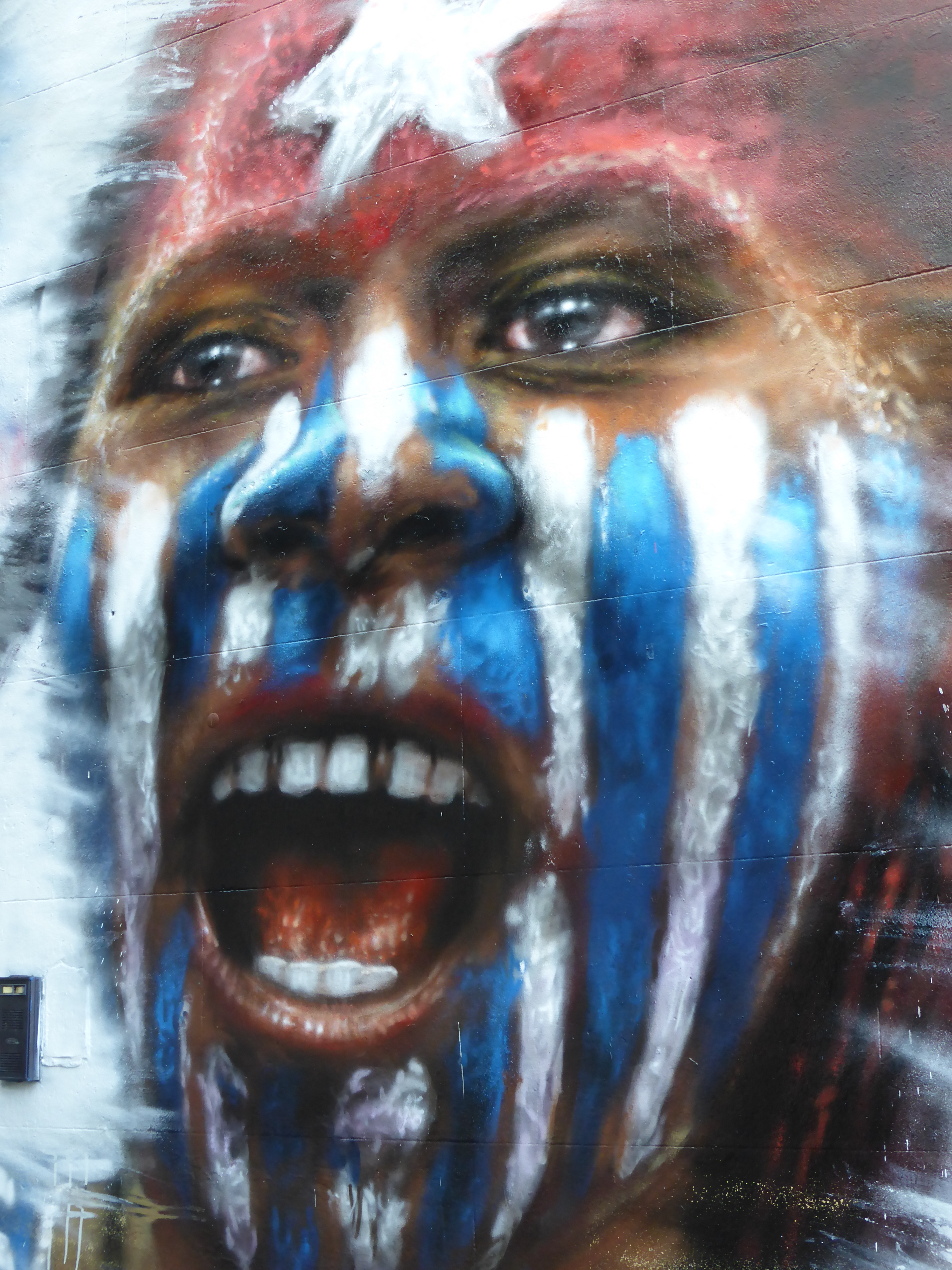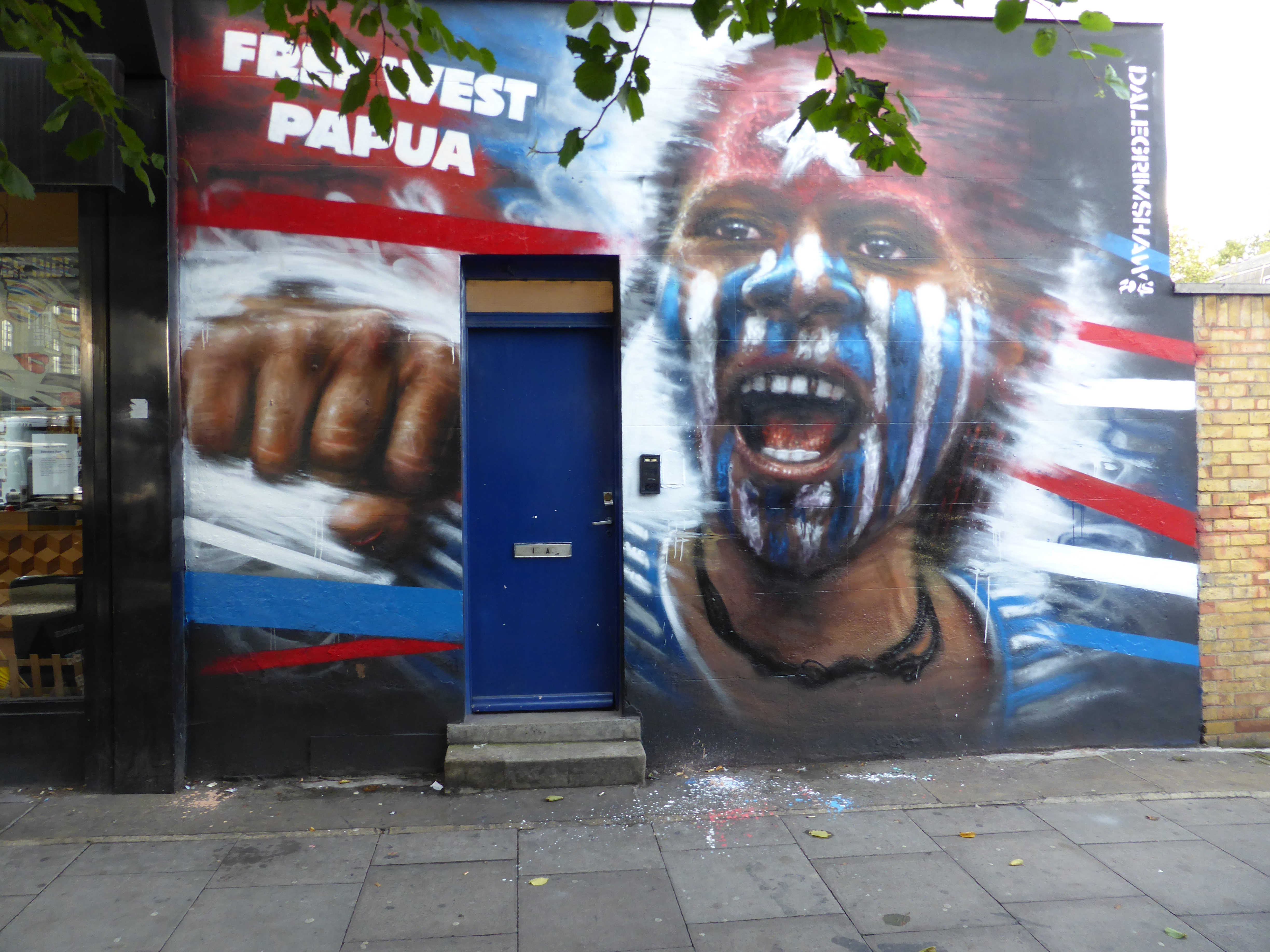 Well it was only a couple of weeks ago that we reported on the large mural placed by Dale Grimshaw in Camden Town (covered here) and since then over the last week he has placed up a second fresh work, smaller in size but every bit as impressive in stature. The work ‘Free West Papua’ is yet again a real delight to gaze upon, featuring Dale Grimshaw’s signature subject style, maintaining a preference for strongly tribal subjects. In this case depicting a portrait of Papuan tribesman with the message of the piece hit home with the accompanying fist on the left, all fused with that air-brushed effect that makes for such exquisite images, enthused with a sense of passion and depth that is just fundamentally Dale Grimshaw. This wall was put up with support from The Real Art of Street Art.
