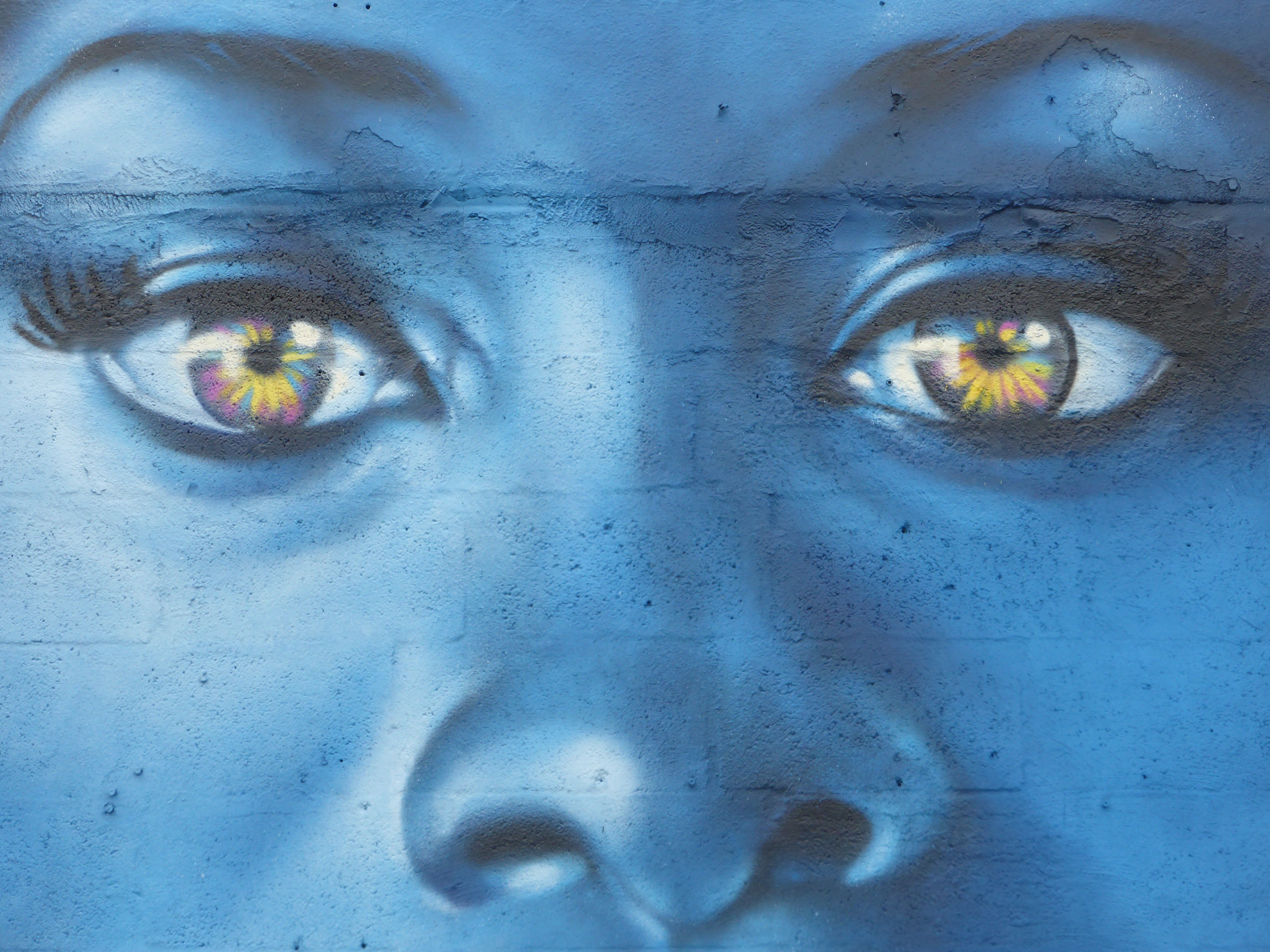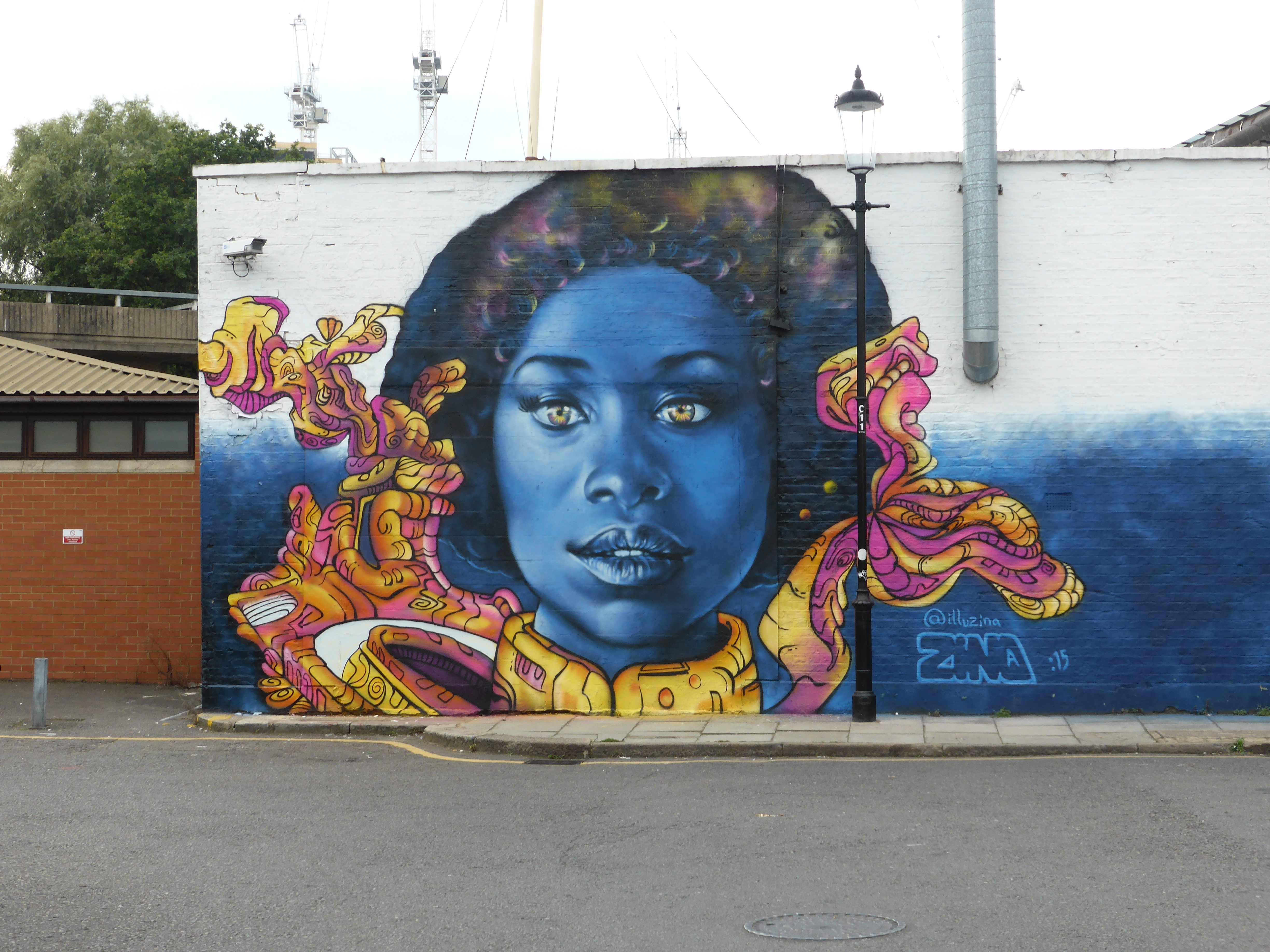 Last week in London, Street Artist Zina laid out her freshest work in W10, Shepherds Bush way, somewhat off of the beaten track for locating Street Art and adopted a fresh twist on her distinctive trademark blue-scale portraits. The work features a beautiful soulful female blue-scale portrait, with a cosmic tone about the hair and accompanied with a strikingly contrasting gold and purple collar that flows away from the neck and around the face, creating a somewhat abstract smoke enthused pattern. The bright gold and purple colours really standout alongside the deep blue hues of Zina’s work and really add a different perspective to Zina’s superb paintings. We love how the colours in the eyes when viewed up close match the brightness of the surrounding tones. It’s always a pleasure to see work from Zina and was certainly worth the effort to go out of our way to see this fresh gem, which can be found in Crowthorne Road, behind the football pitches.