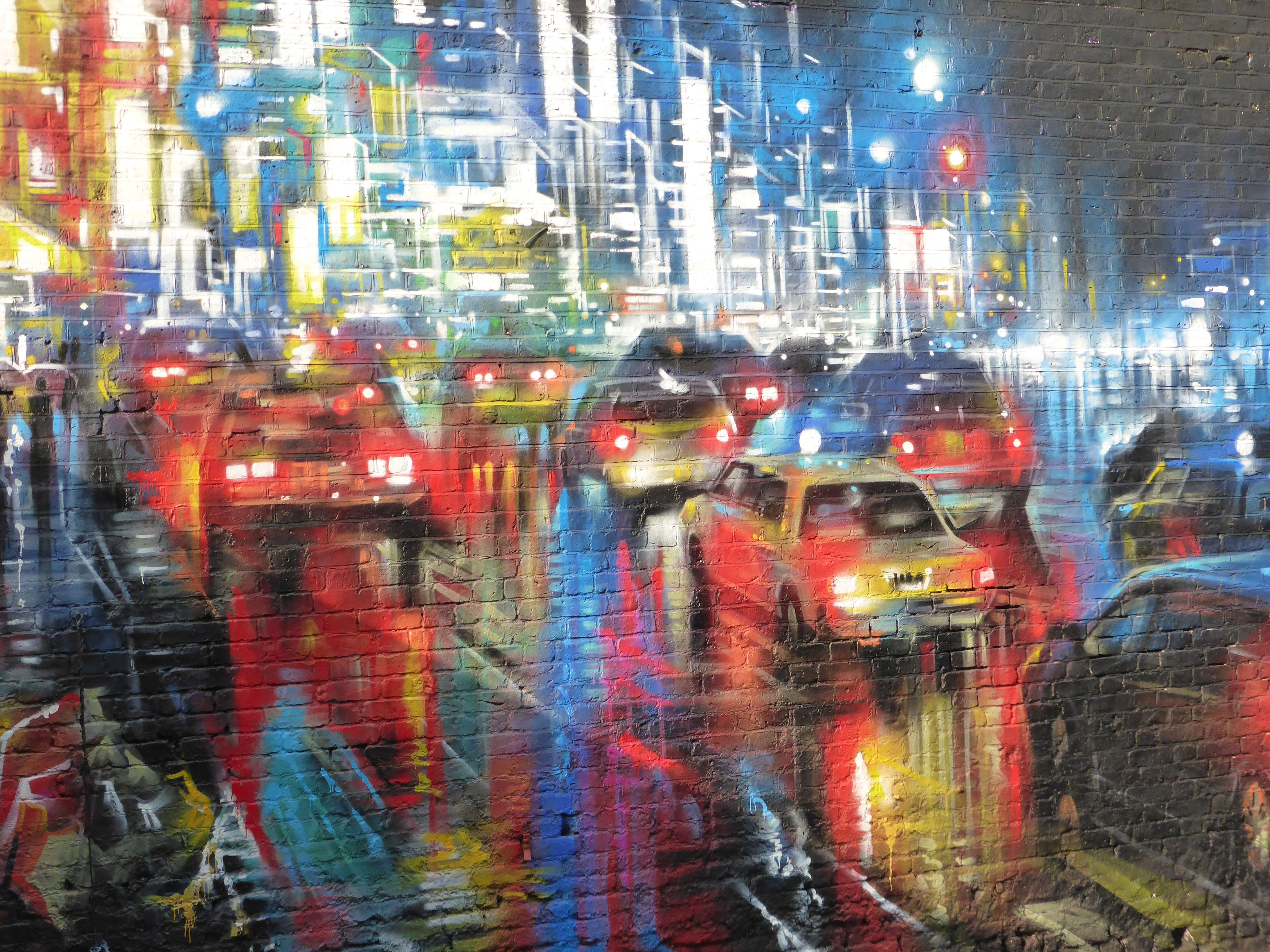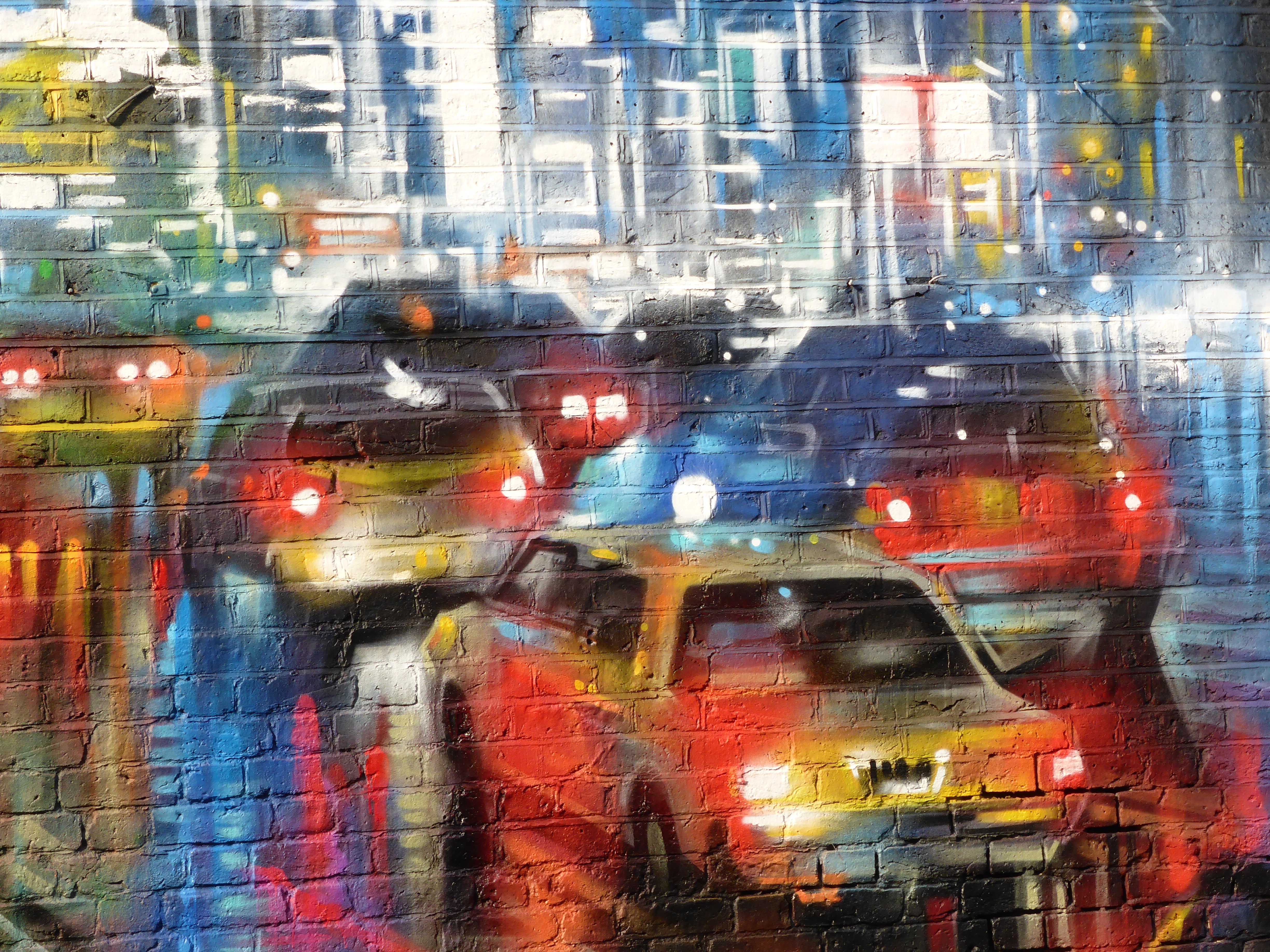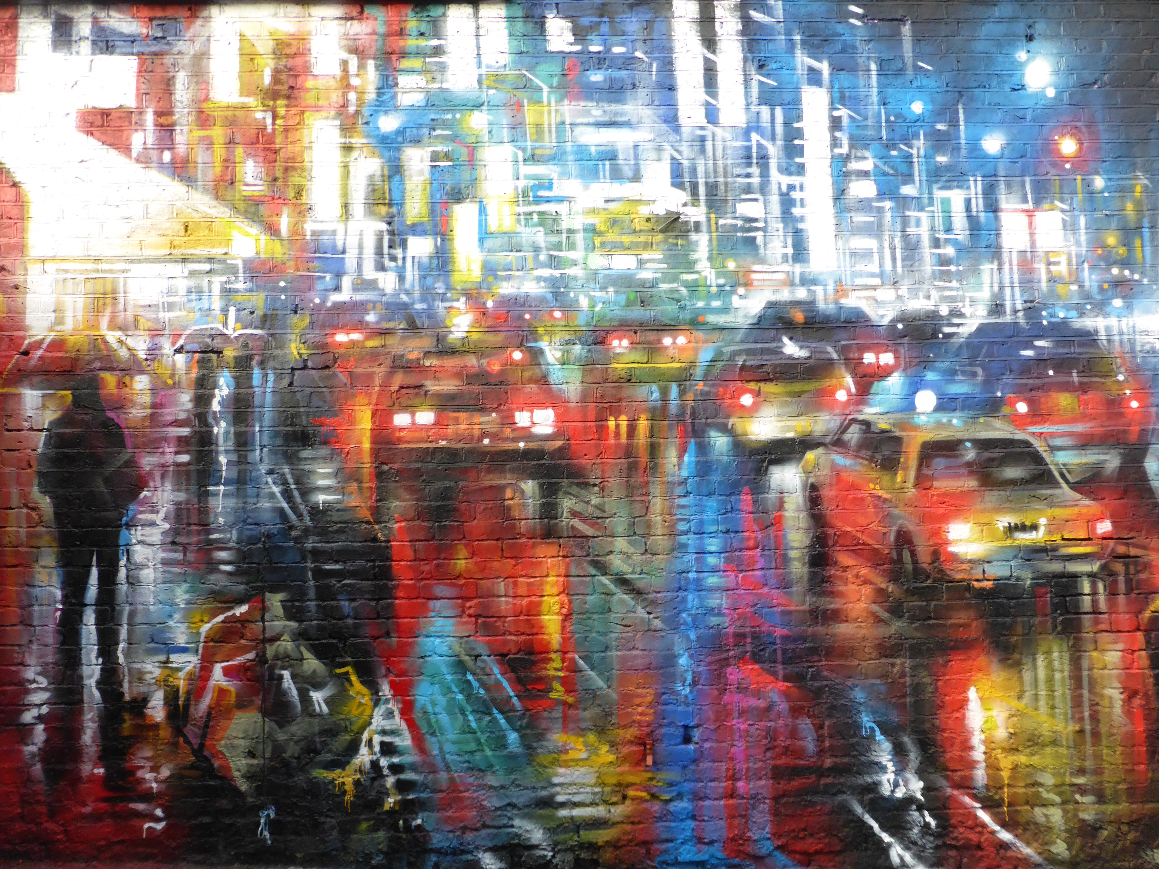 On Thursday whilst passing through Camden Town we were delighted to stumble across Dan Kitchener painting his newest London wall, just a couple of weeks after we last caught up with Dank working away in Shoreditch (covered here). Dan was having a very hard time when we caught him on Thursday with the glaring sun bisecting his work and from some angles you couldn’t even see the bright colours he was laying out through the bright glare, nevertheless he made the most of the grueling conditions and managed to leave Camden with his impressive and newest ‘Liquid Lights’ work. This piece departs from his predominant Tokyo themed scenes and offers up a work based closer to home and accordingly titled ‘London Rush’. Anyone familiar with our previous posts on Dank’s work already know how much we love and admire his incredible talent and output here at London Calling Blog and we are sure you can yet again see why. Until the next work from Dan Kitchener we will have to share with you enjoy ‘London Rush’ and if you are local head along to view this treat yourself, our images don’t do the superb work justice.