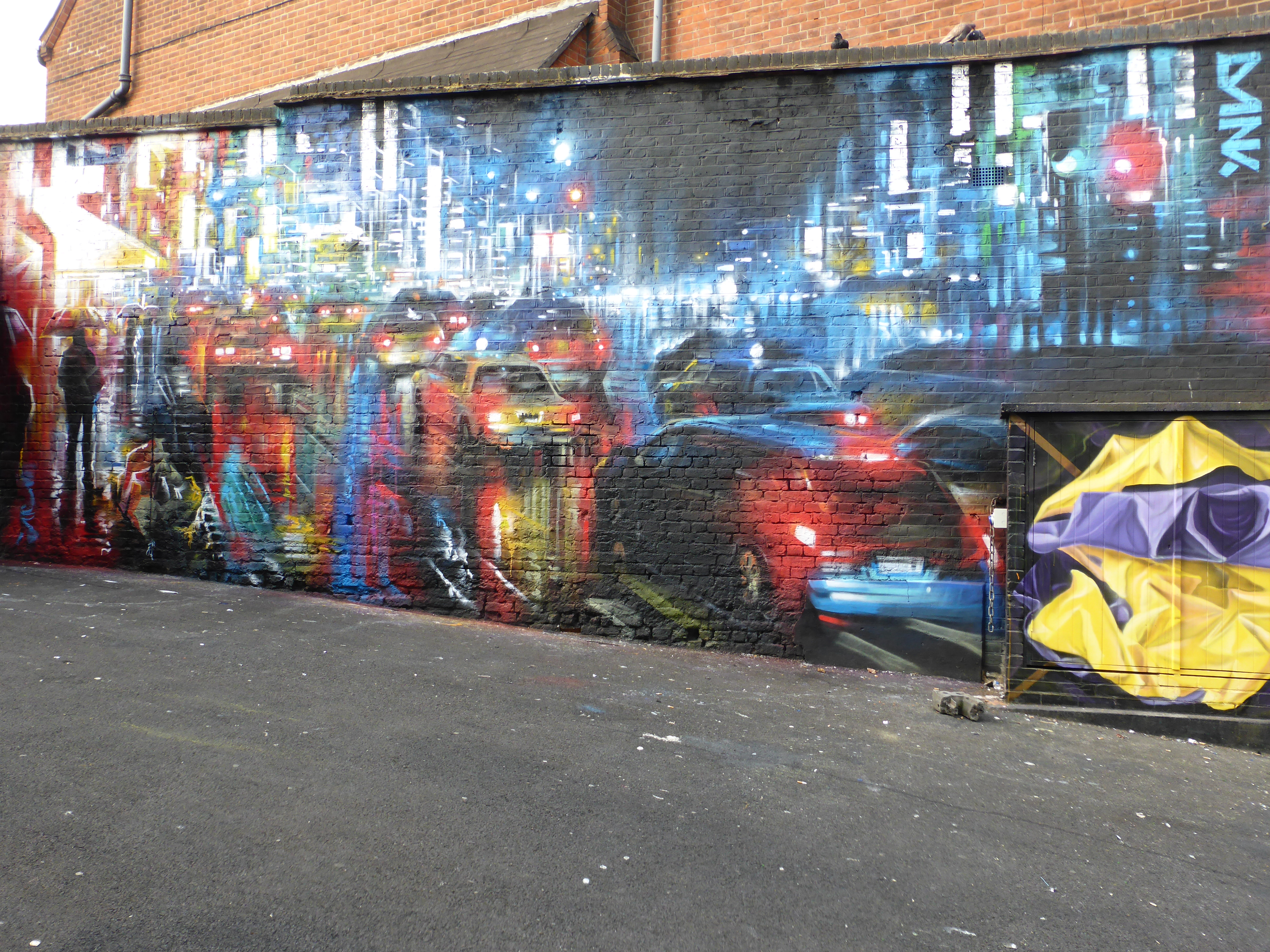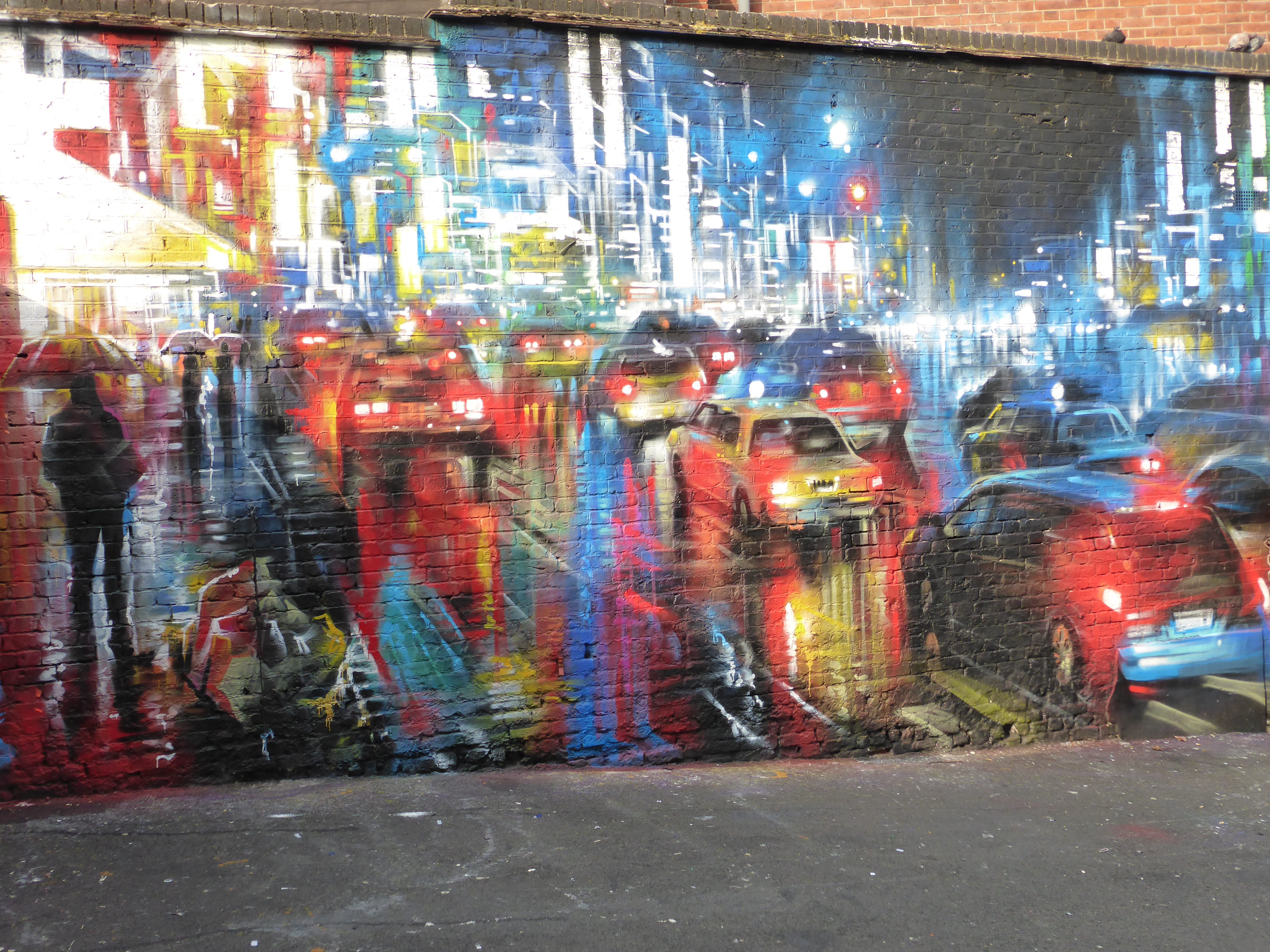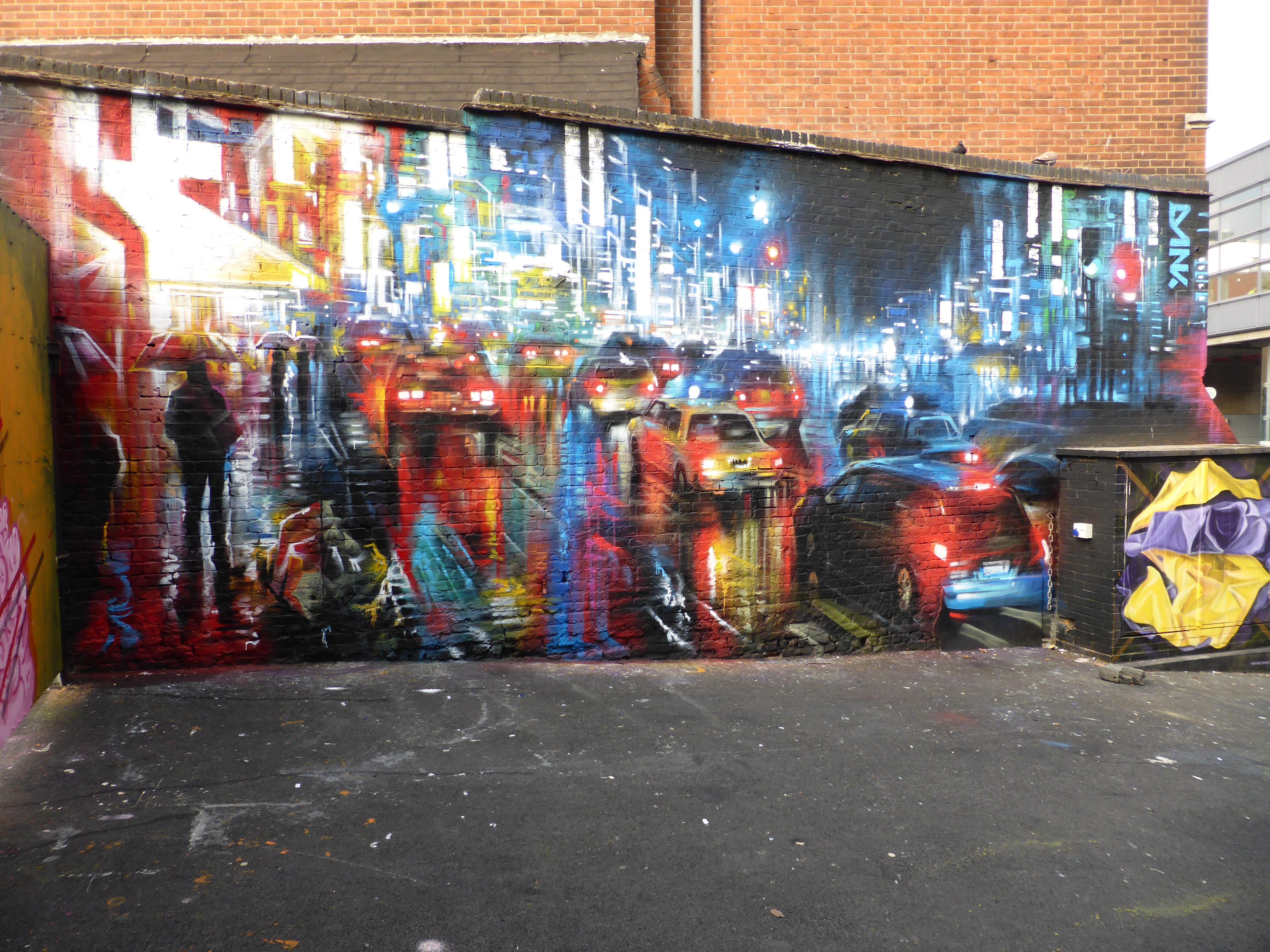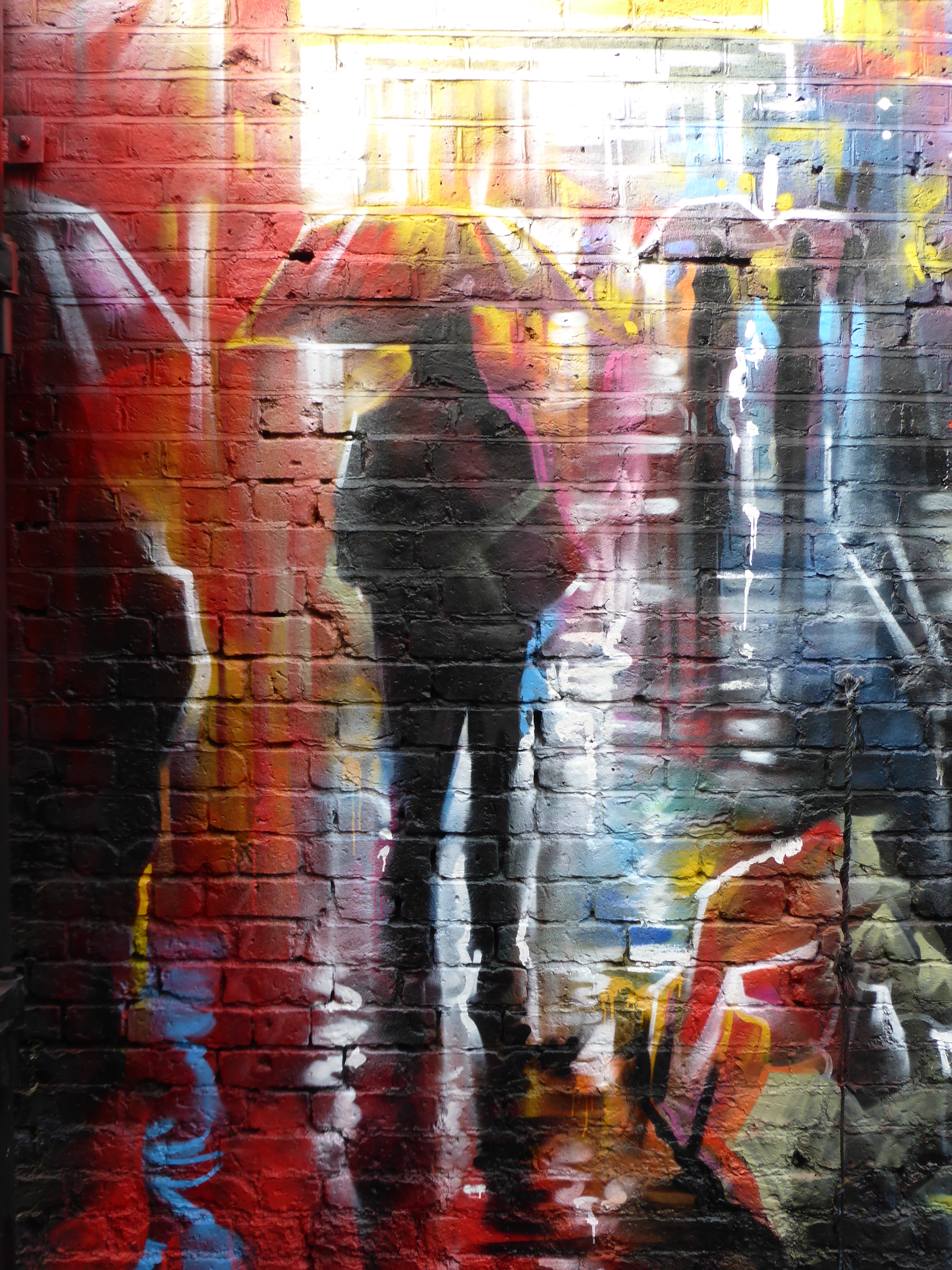 On Thursday whilst passing through Camden Town we were delighted to stumble across Dan Kitchener painting his newest London wall, just a couple of weeks after we last caught up with Dank working away in Shoreditch (covered here). Dan was having a very hard time when we caught him on Thursday with the glaring sun bisecting his work and from some angles you couldn’t even see the bright colours he was laying out through the bright glare, nevertheless he made the most of the grueling conditions and managed to leave Camden with his impressive and newest ‘Liquid Lights’ work. This piece departs from his predominant Tokyo themed scenes and offers up a work based closer to home and accordingly titled ‘London Rush’. Anyone familiar with our previous posts on Dank’s work already know how much we love and admire his incredible talent and output here at London Calling Blog and we are sure you can yet again see why. Until the next work from Dan Kitchener we will have to share with you enjoy ‘London Rush’ and if you are local head along to view this treat yourself, our images don’t do the superb work justice.