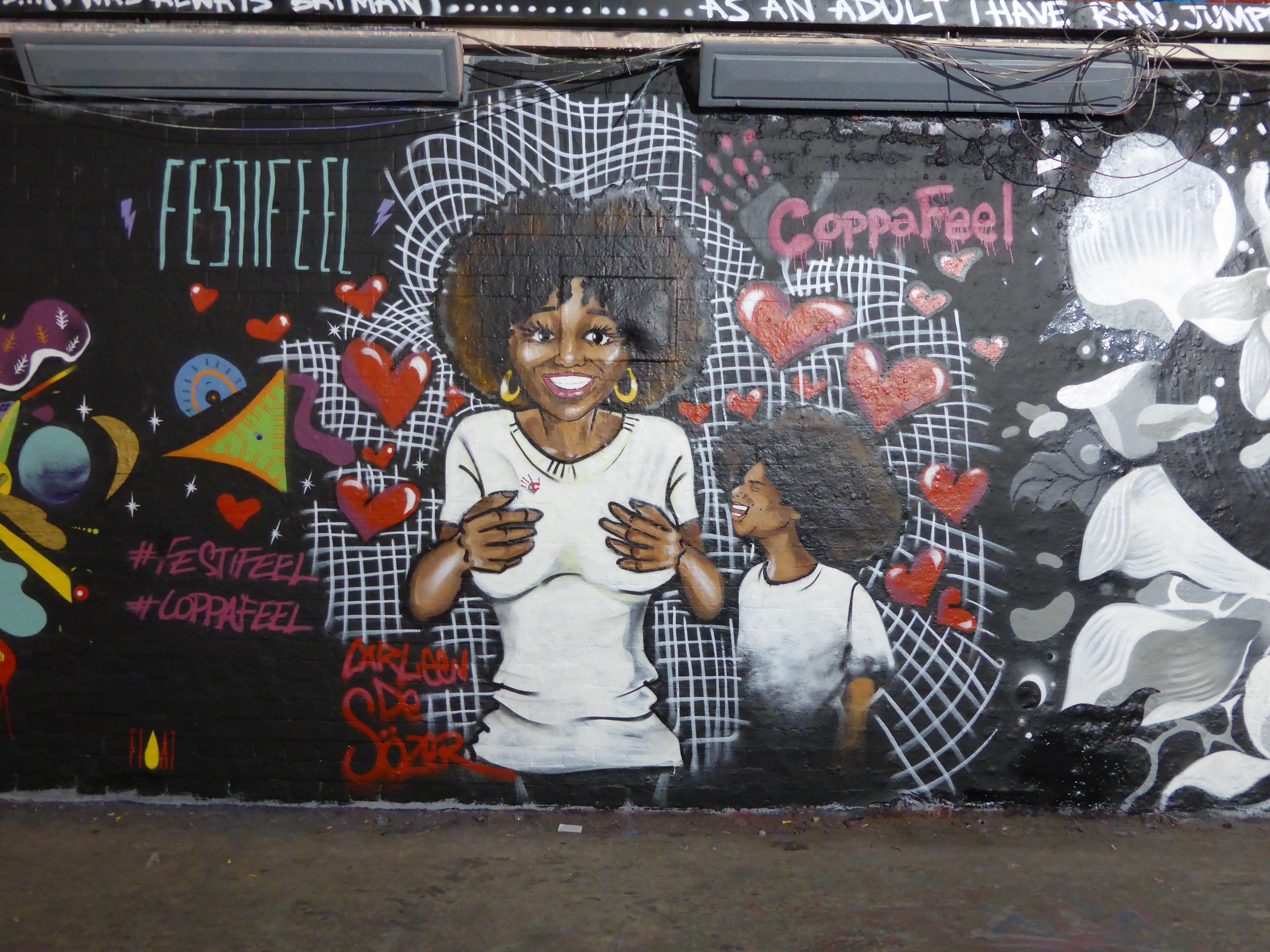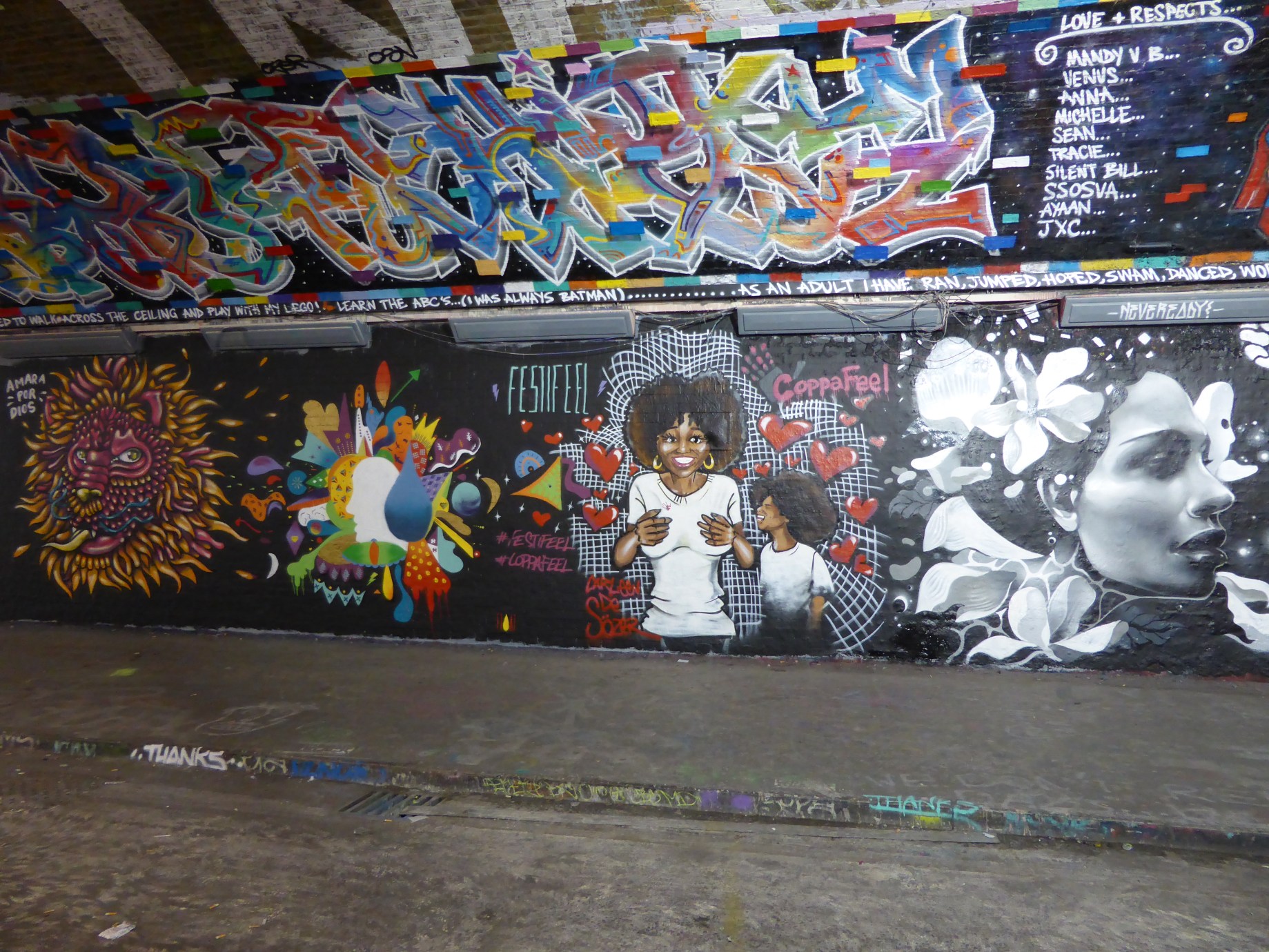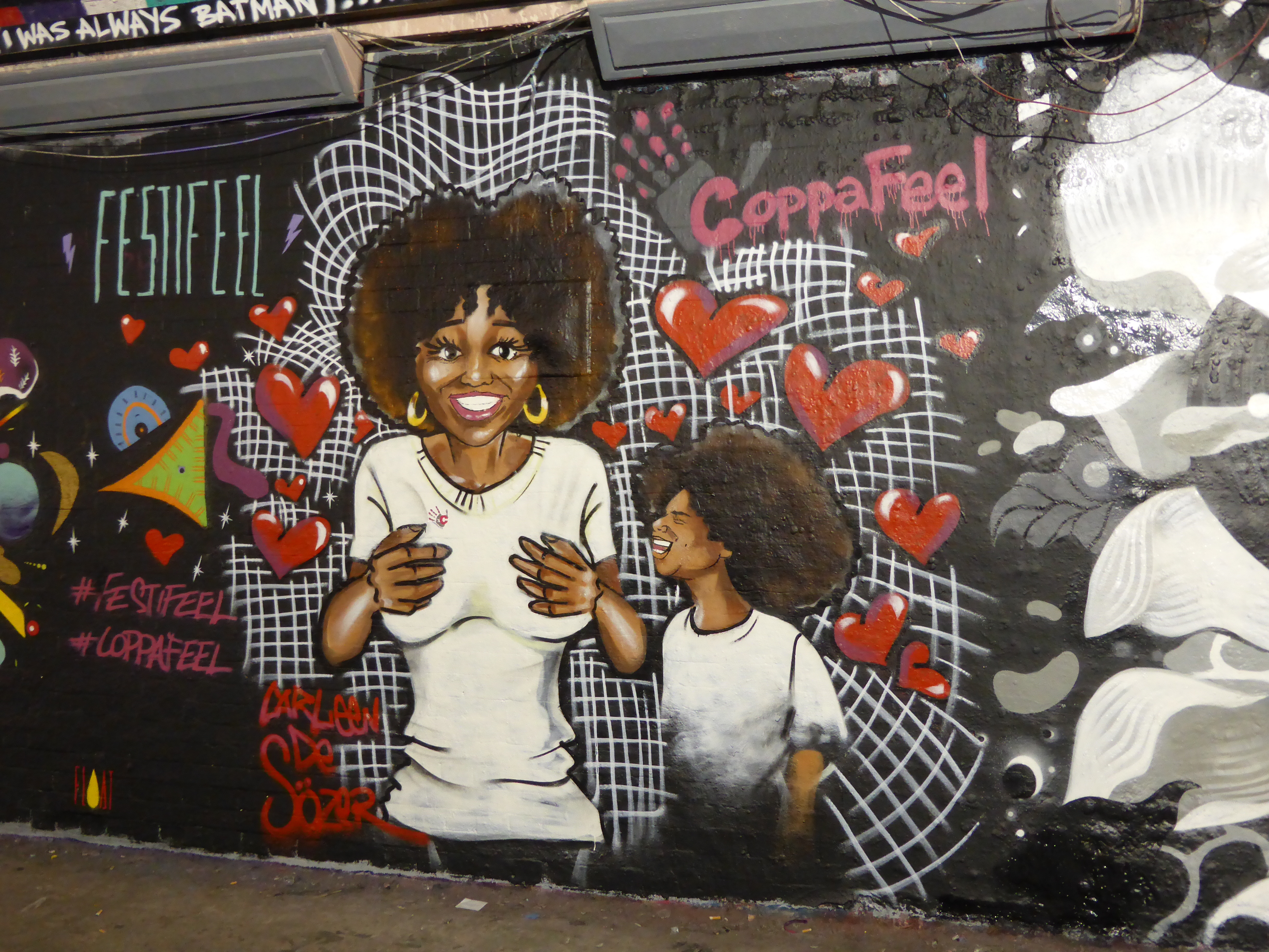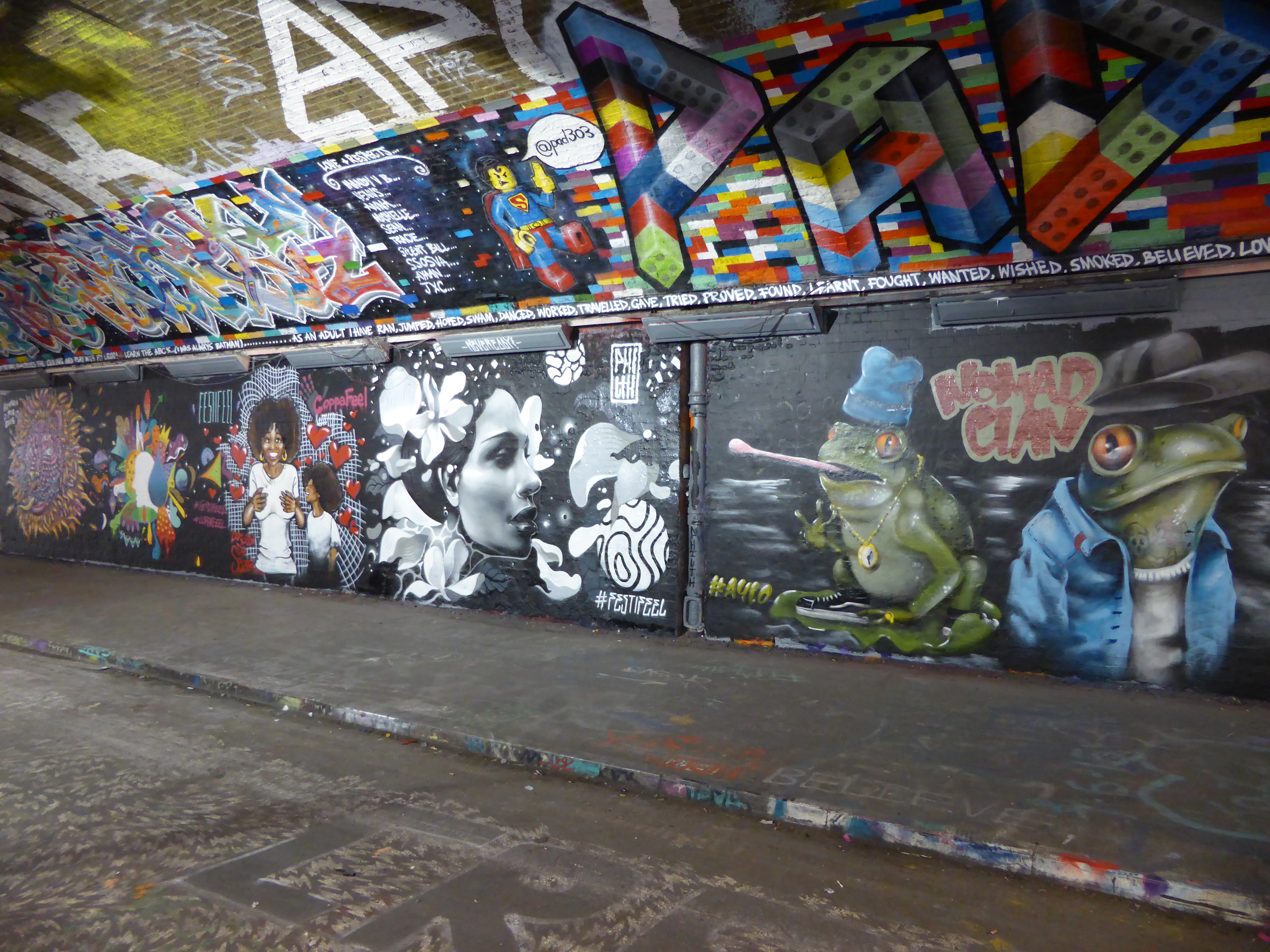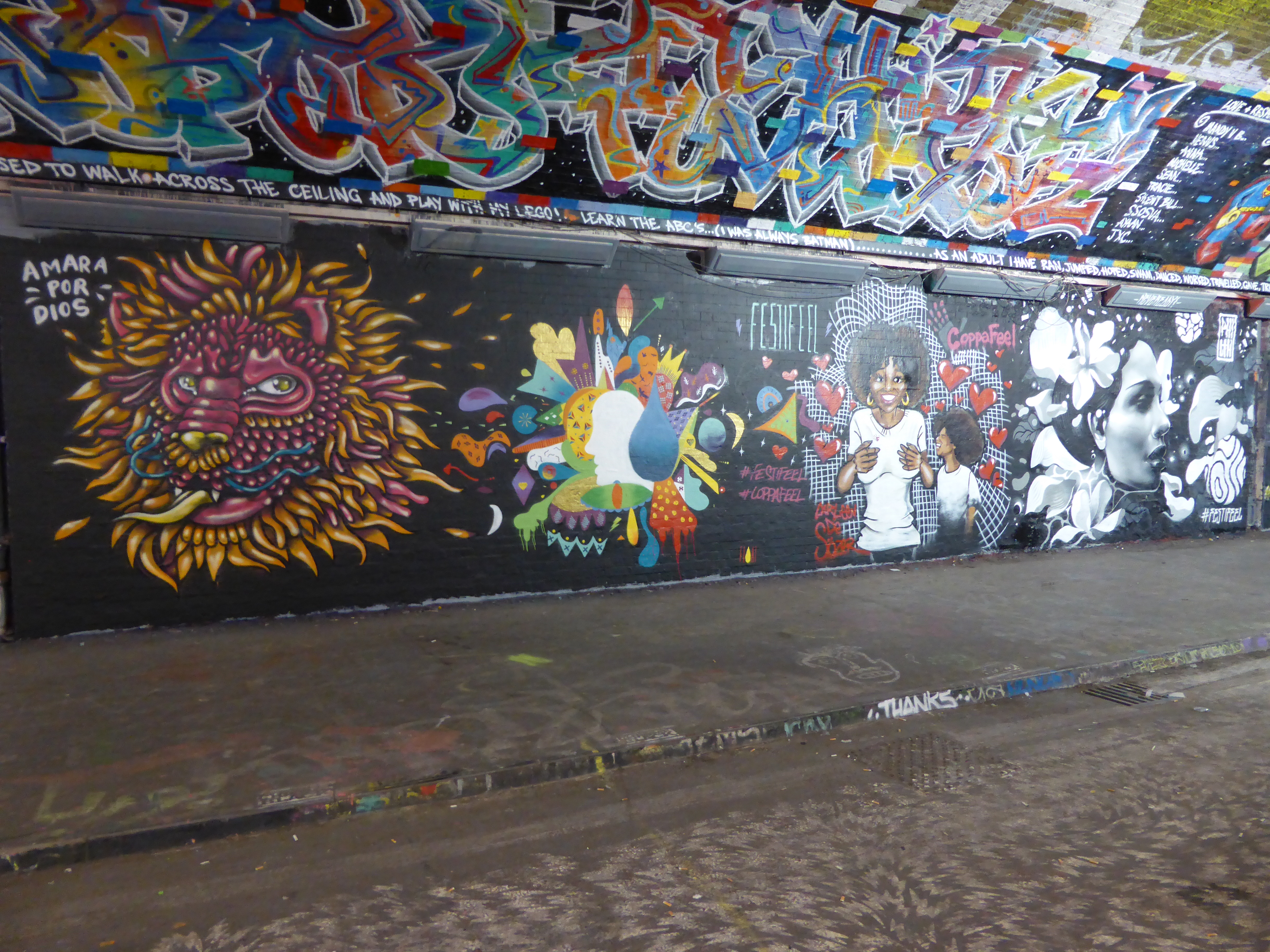 Yesterday in Leake Street, a mini-paint jam took place with six artists painting five works as part of the Festifeel event held in conjunction with the charity Coppafeel whom help promote awareness of symptoms of Breast Cancer and fortify all moves that encourage early detection. We were unaware of the live painting taking place, however we headed over first thing this morning and were lucky enough to find all five works had survived the night, so we can now share them with you now. It’s always a pleasure to see such high-calibre artworks intact in Leake Street, but all the more so when they are promoting such a worthy cause.